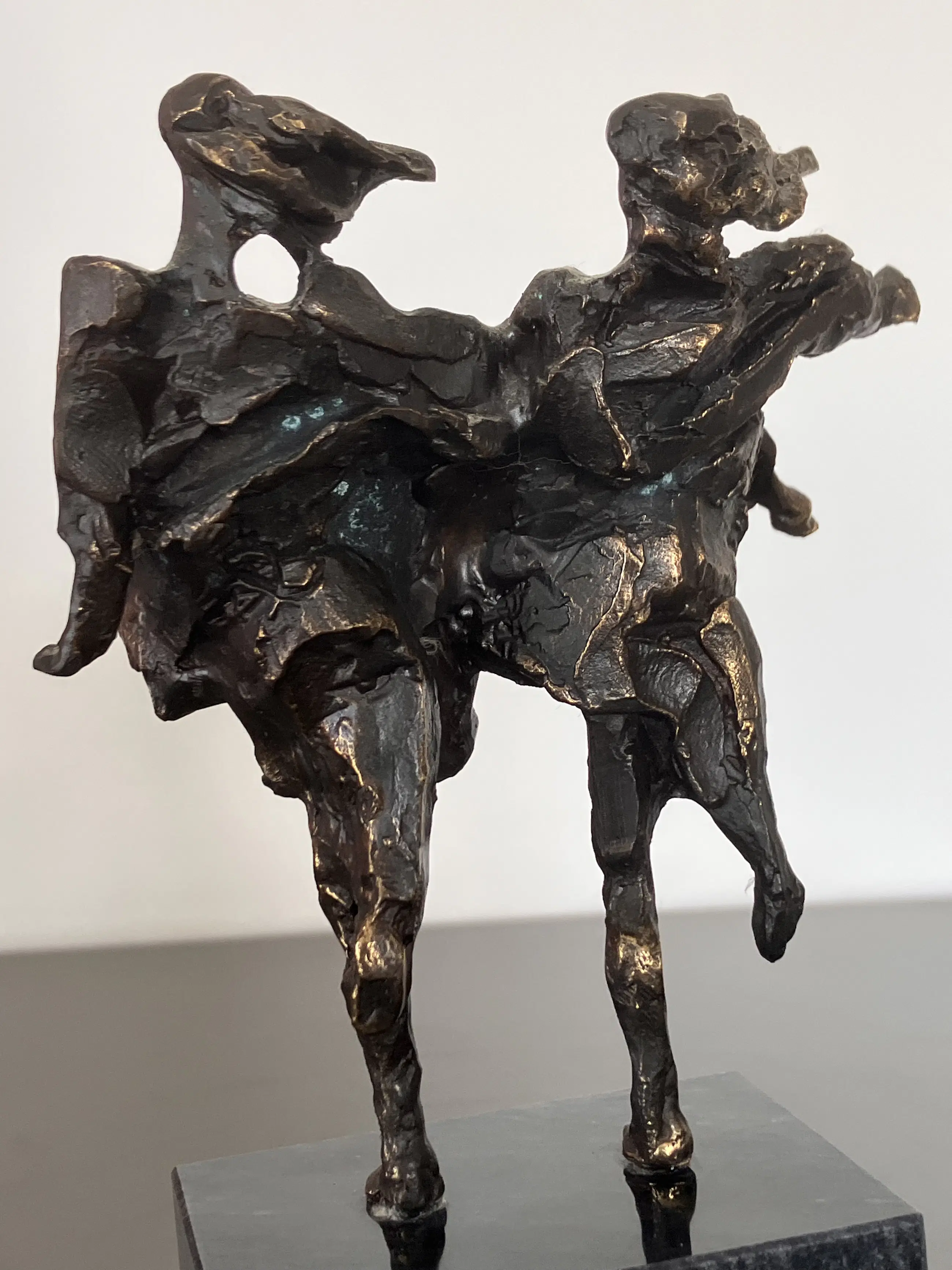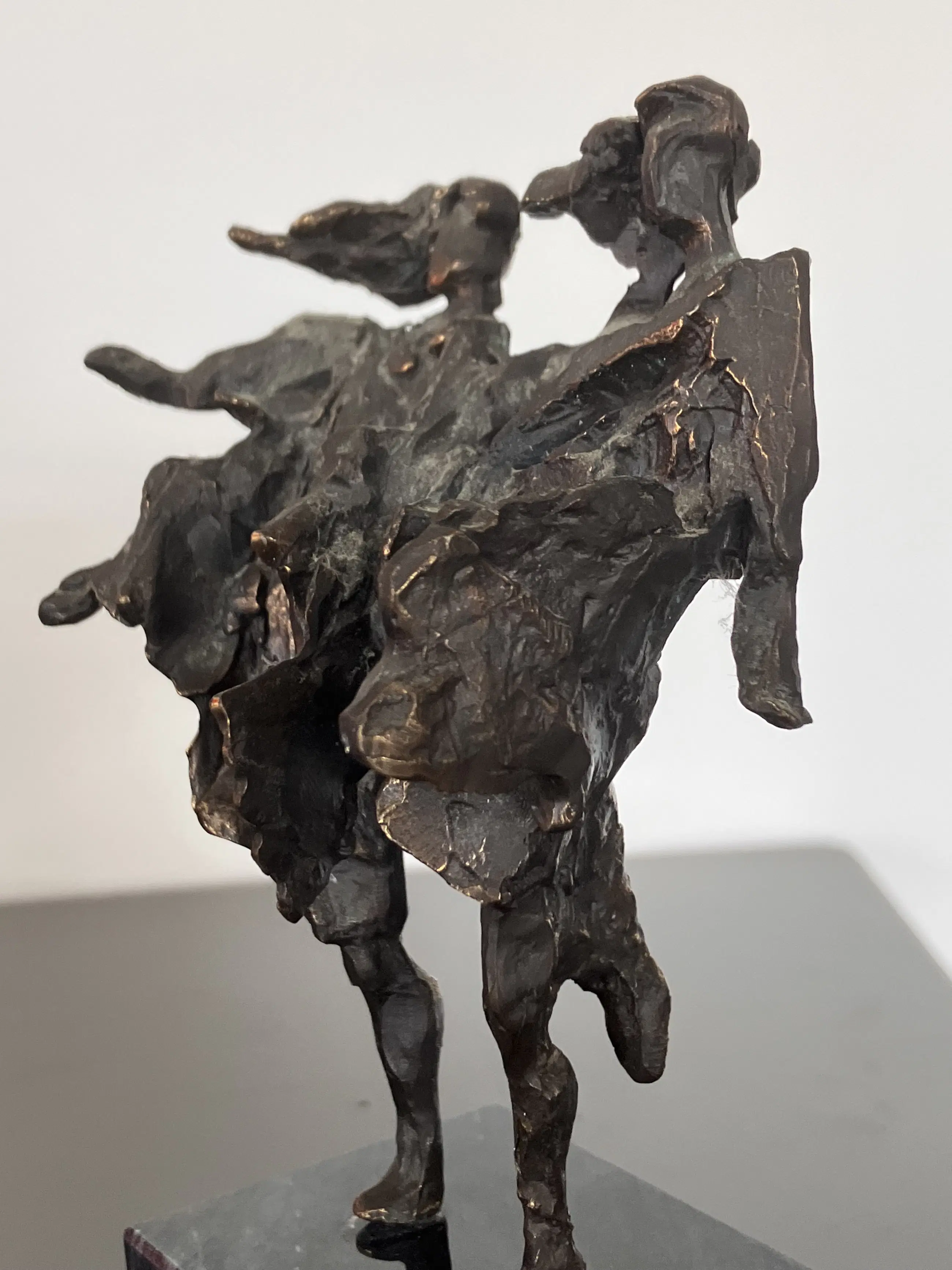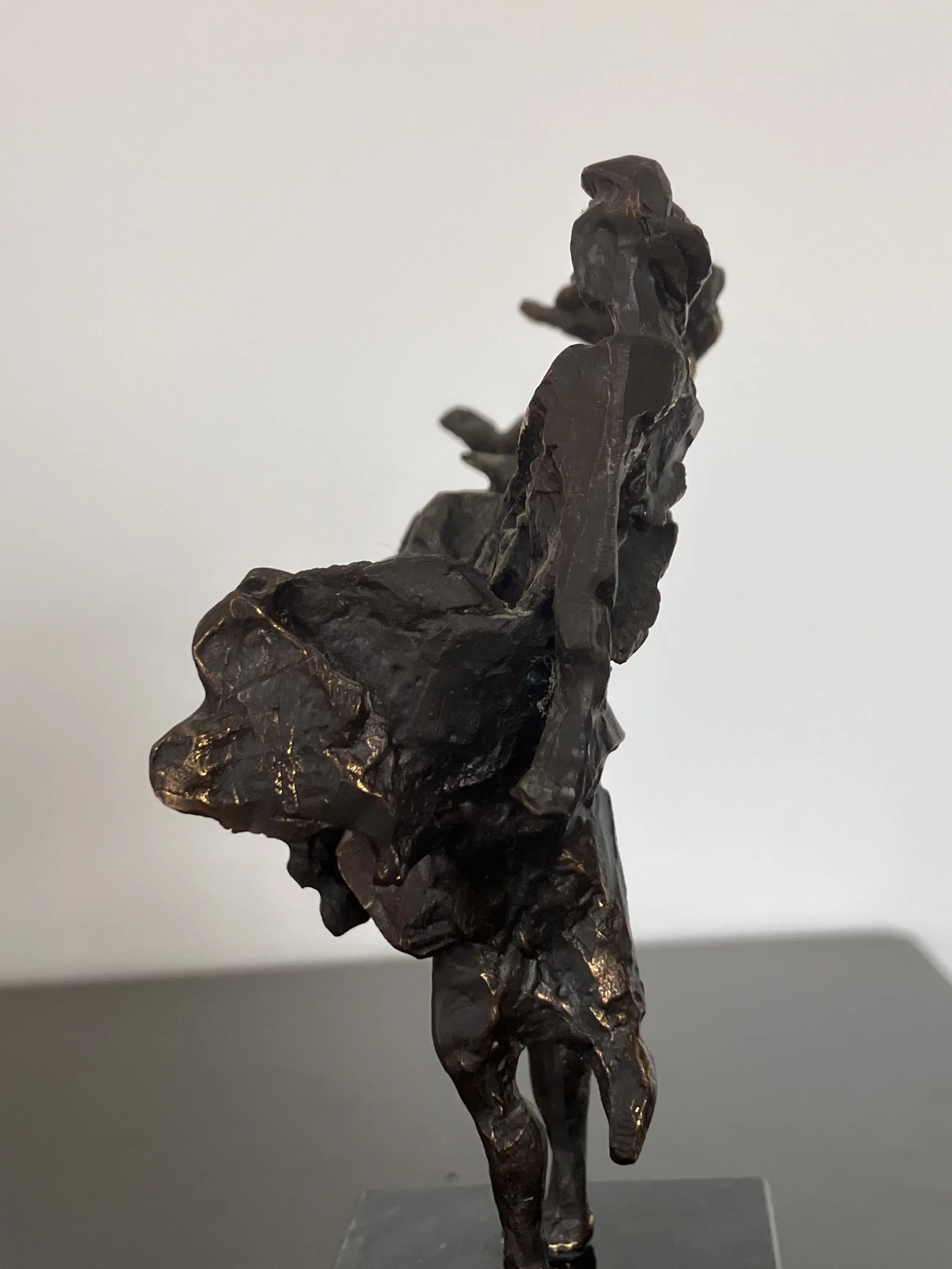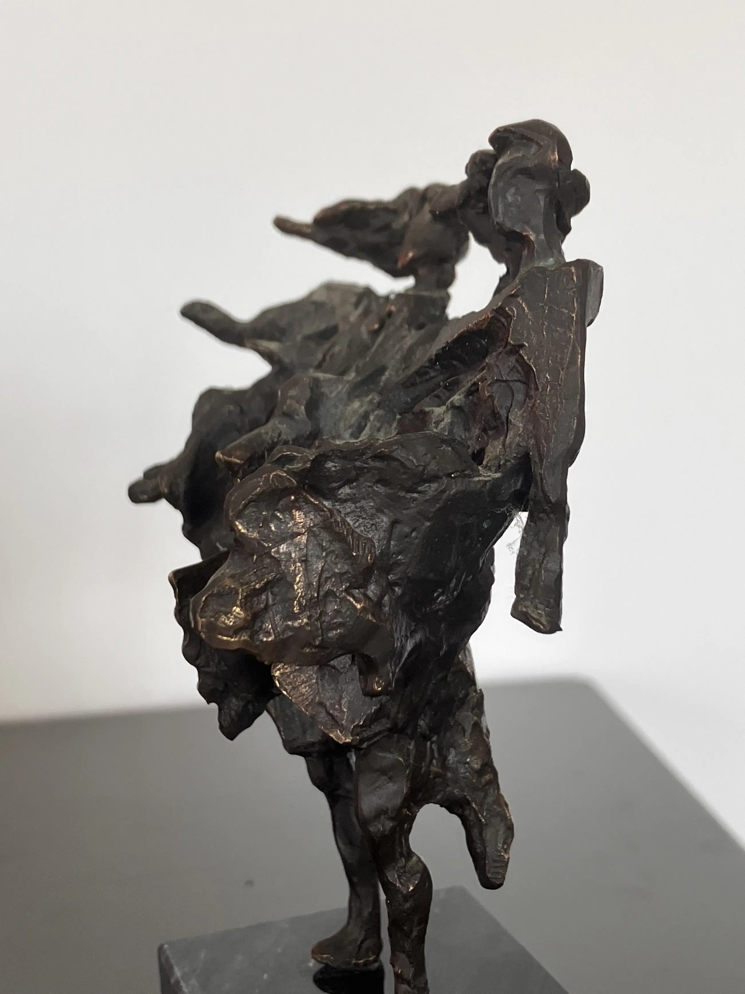 Vrolijk stappend met flinke wind. Plastisch gedetailleerd beeld op zwart natuurstenen sokkel