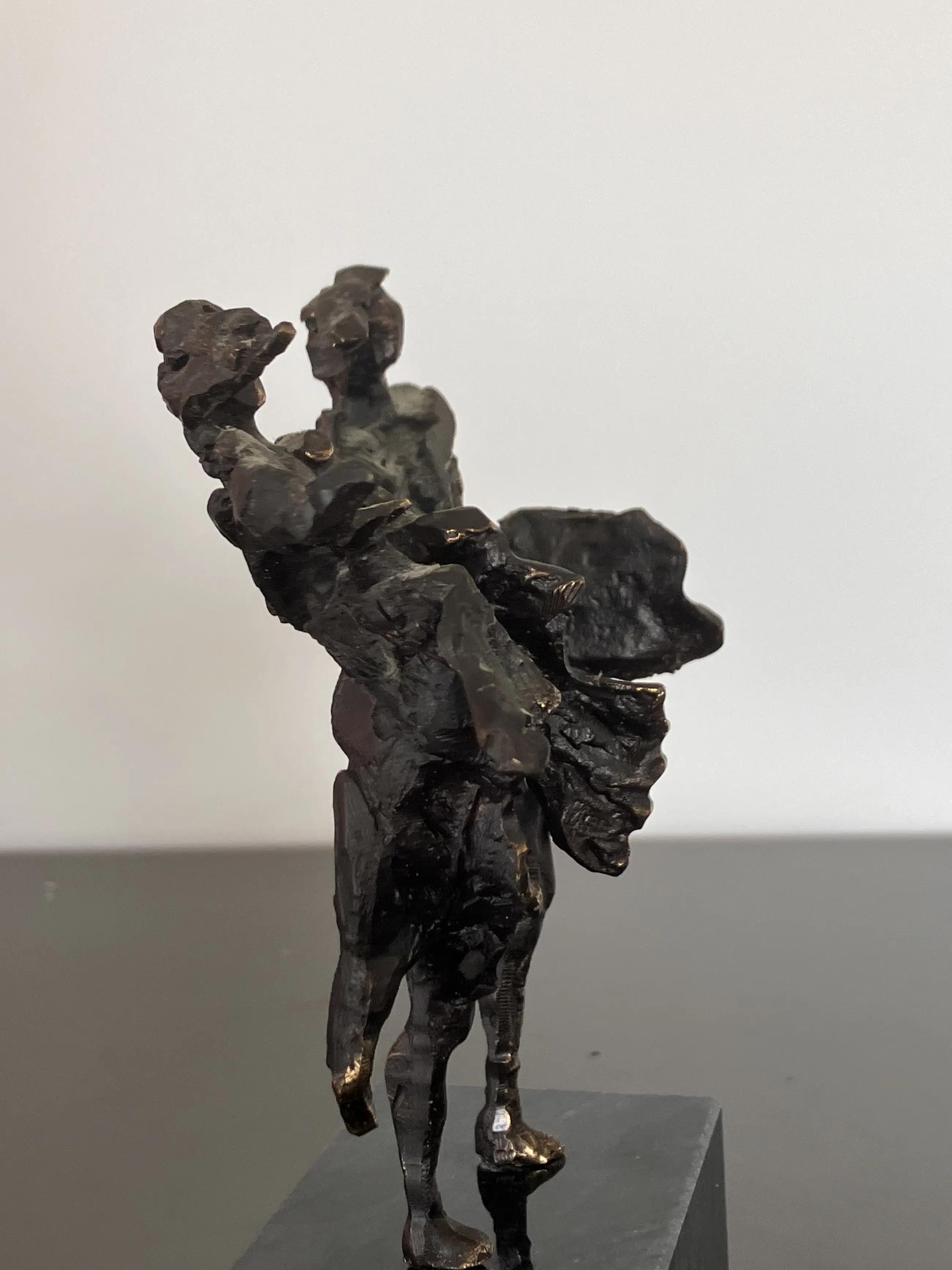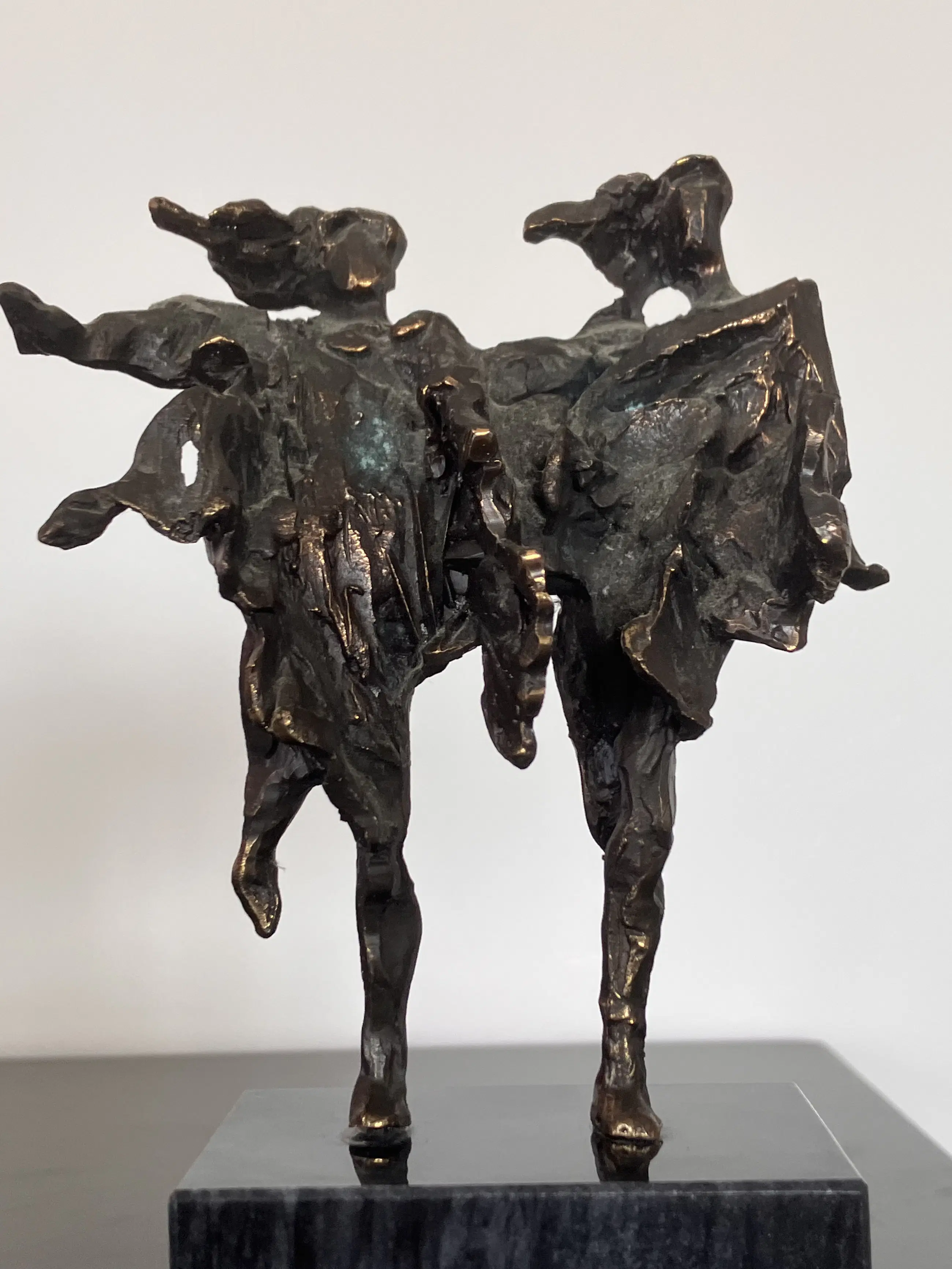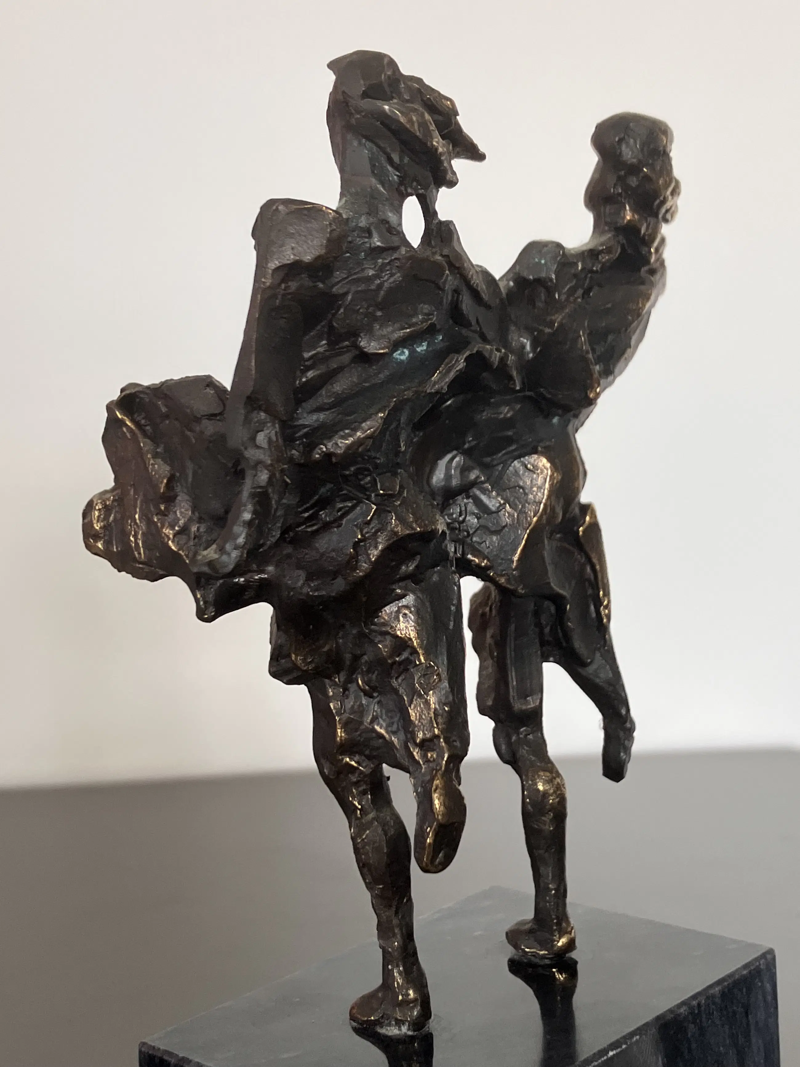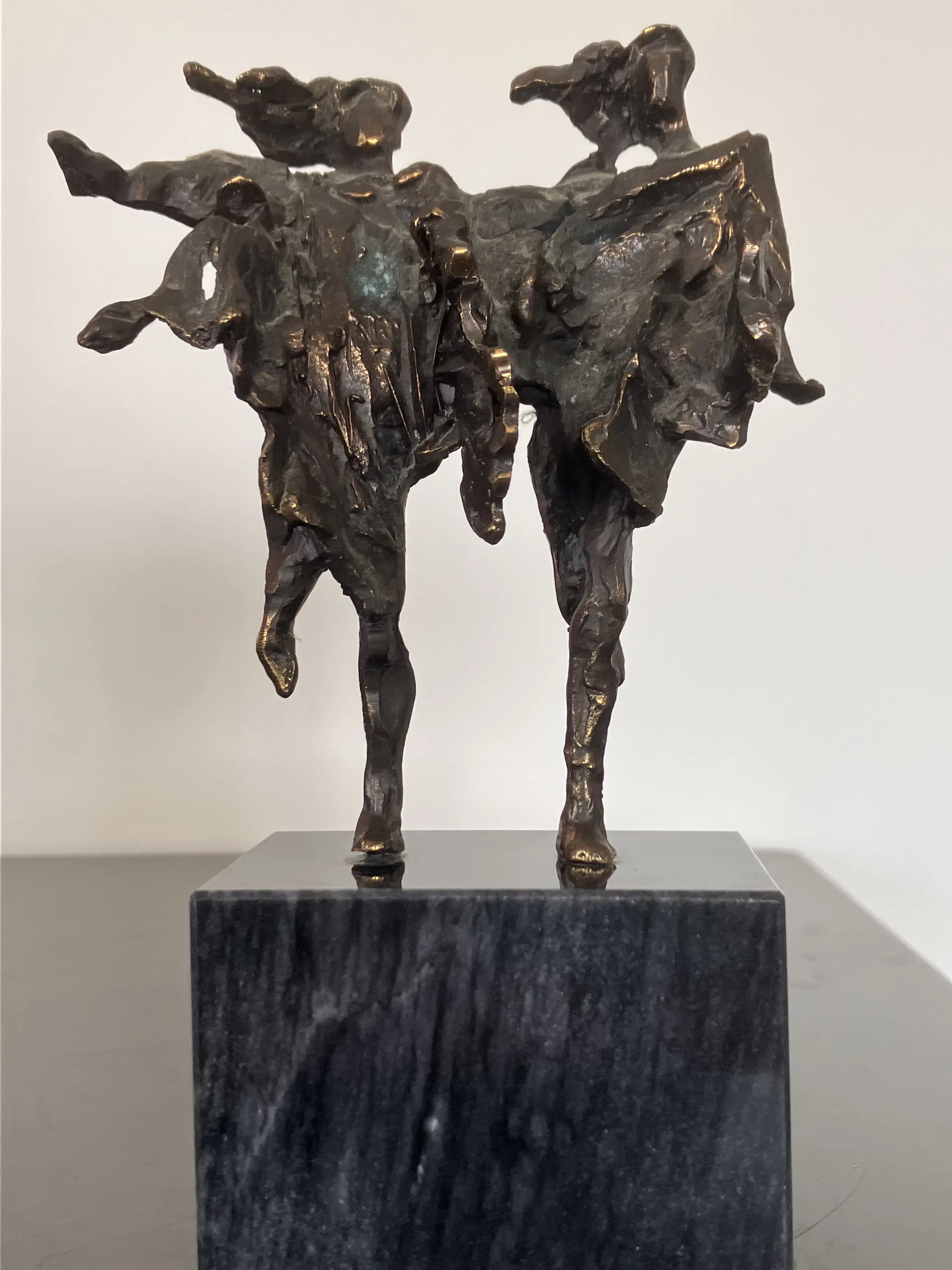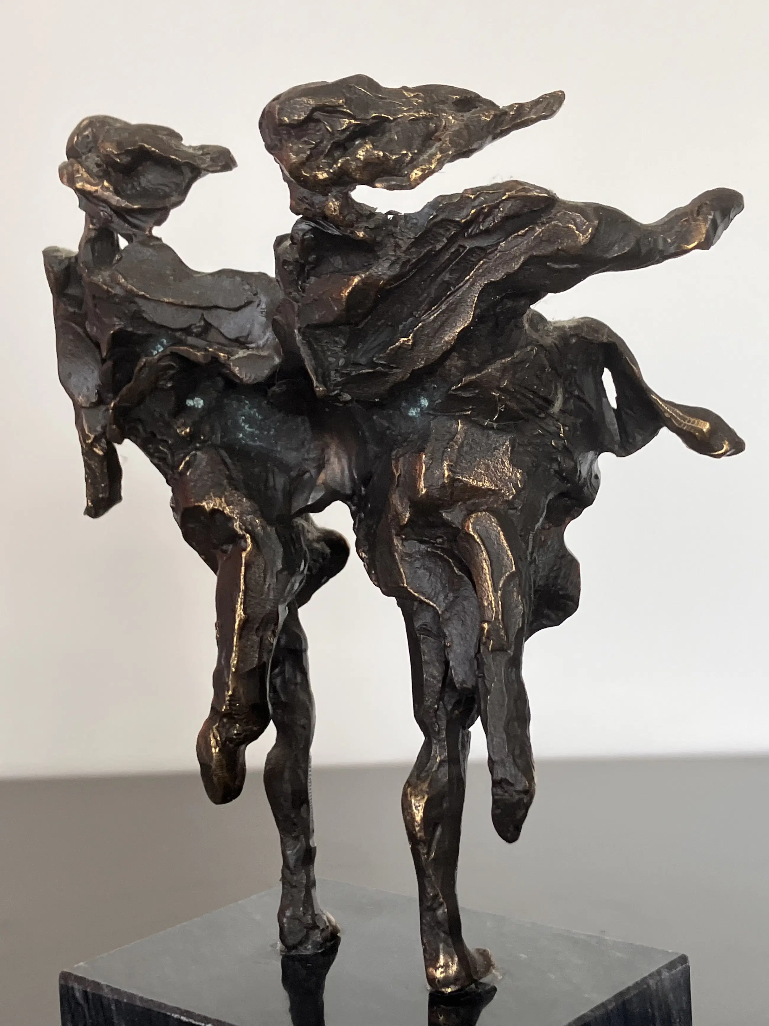 Vrolijk stappend met flinke wind. Plastisch gedetailleerd beeld op zwart natuurstenen sokkel