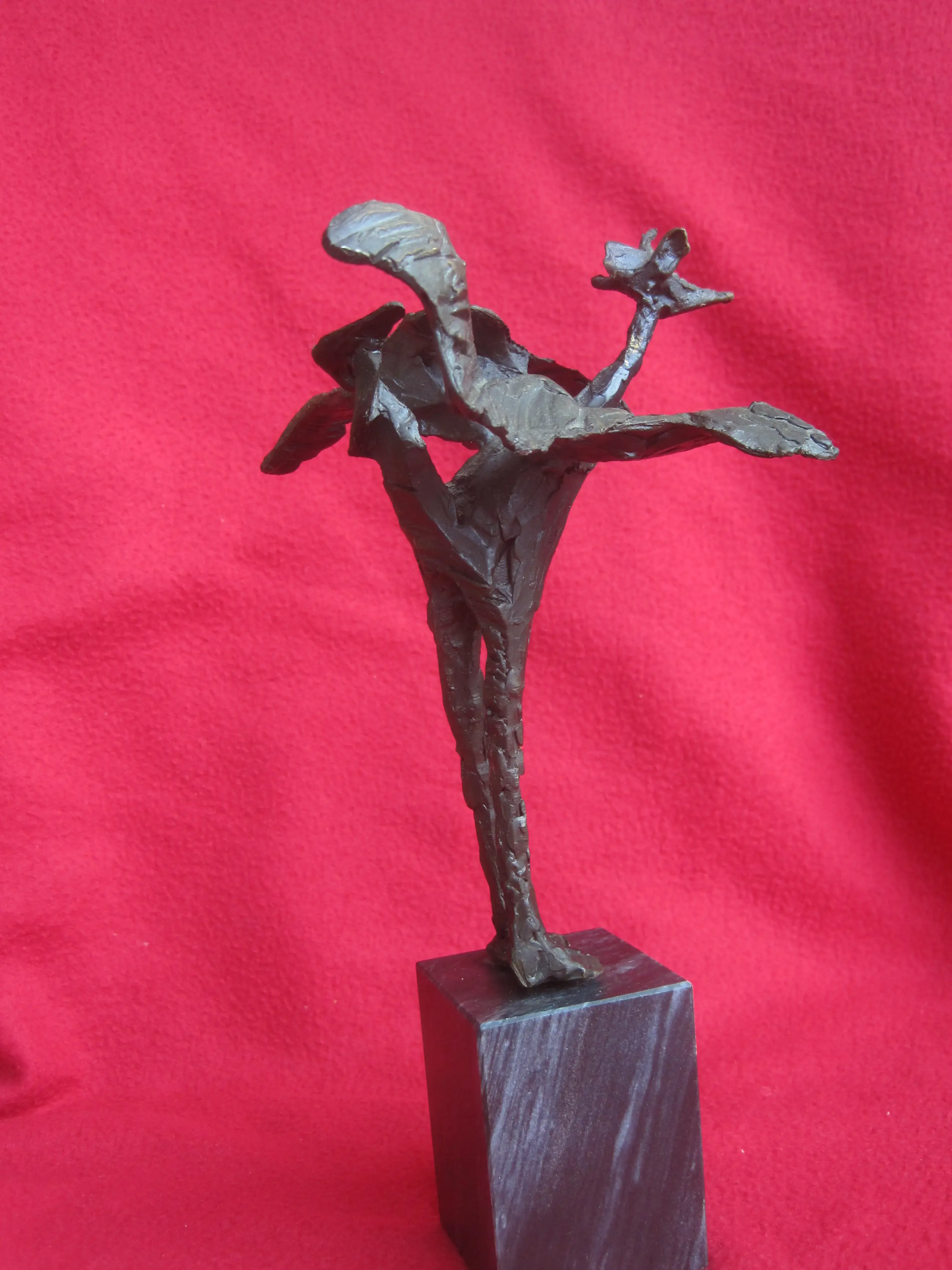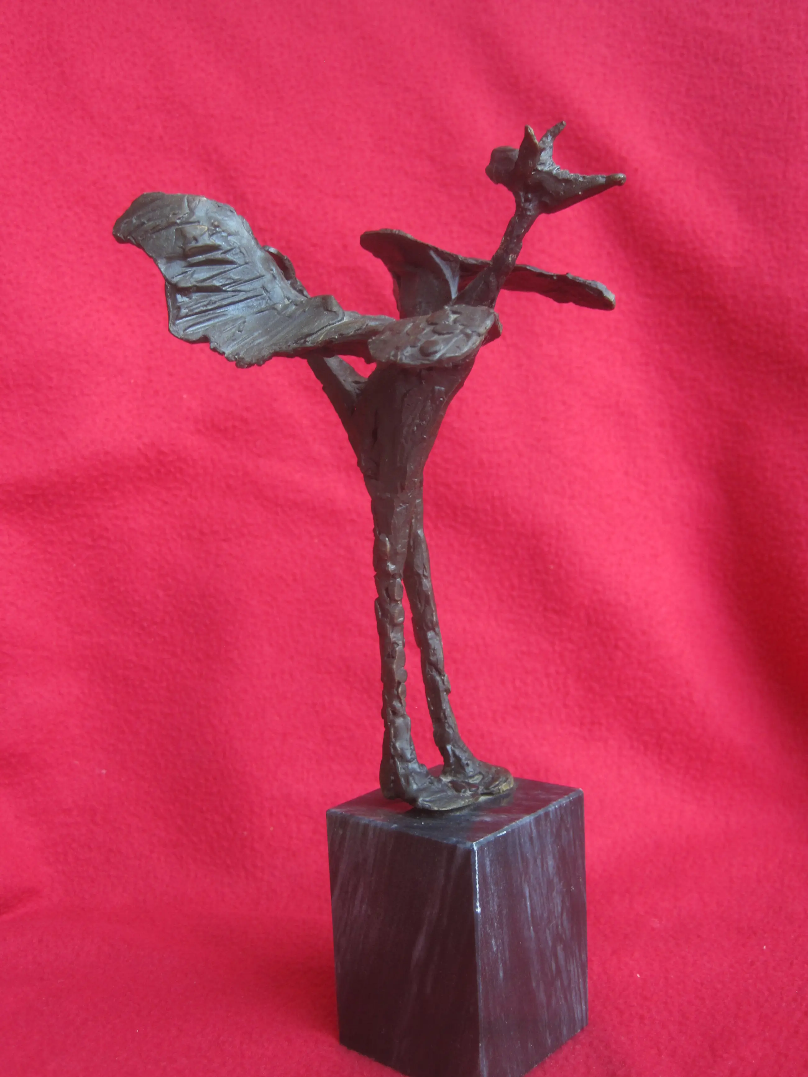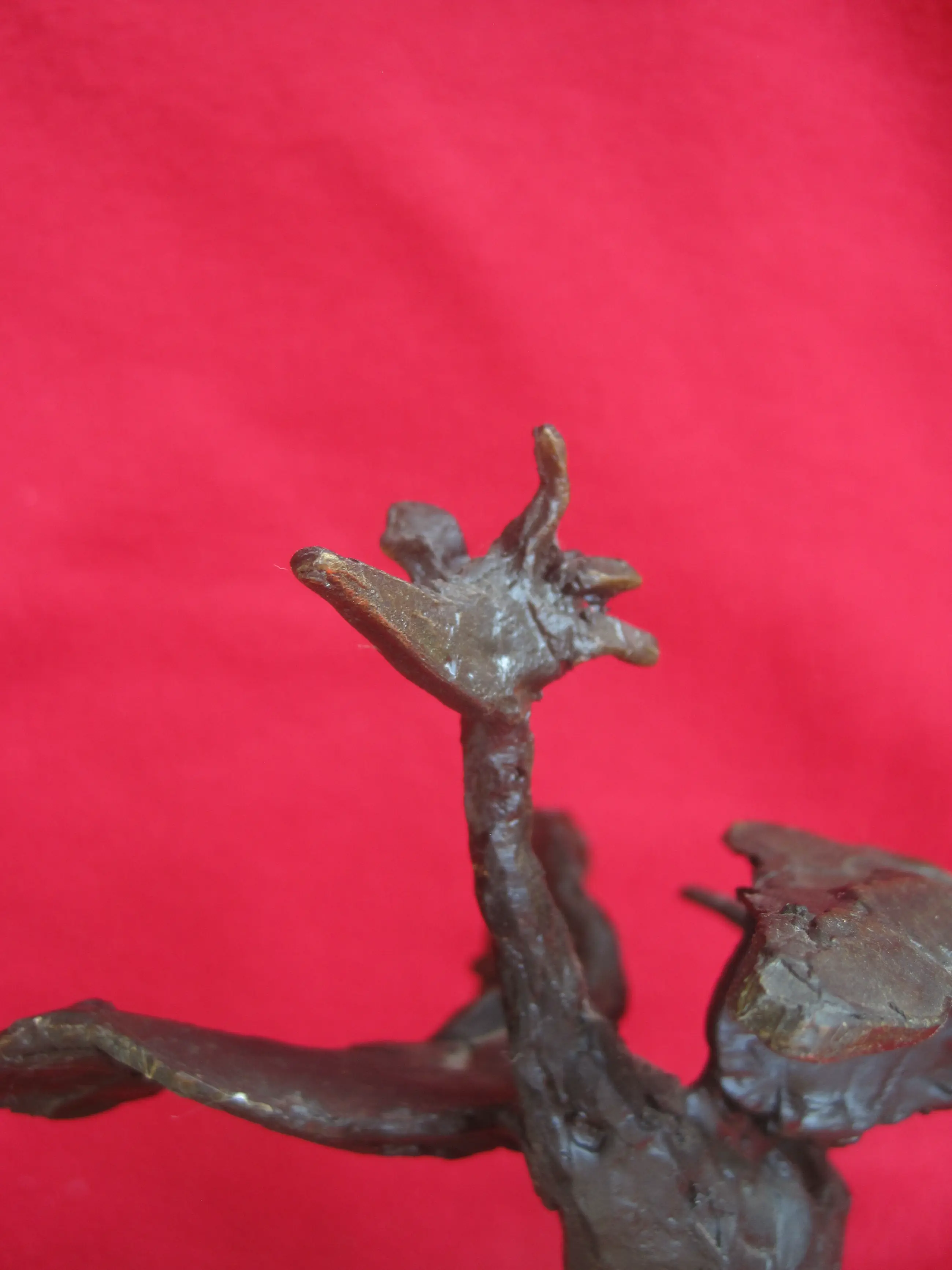 Abstract verbronsd metalen beeldje door Bernadette Leijdekkers. Een heel decoratief en toch ook humoristisch beeldje van een vreemde vogel. Op de sokkel staat de naam van een vorige eigenaar vermeld. Het beeldje is voorzien van het monogram van Bernadette Leijdekkers: BL.