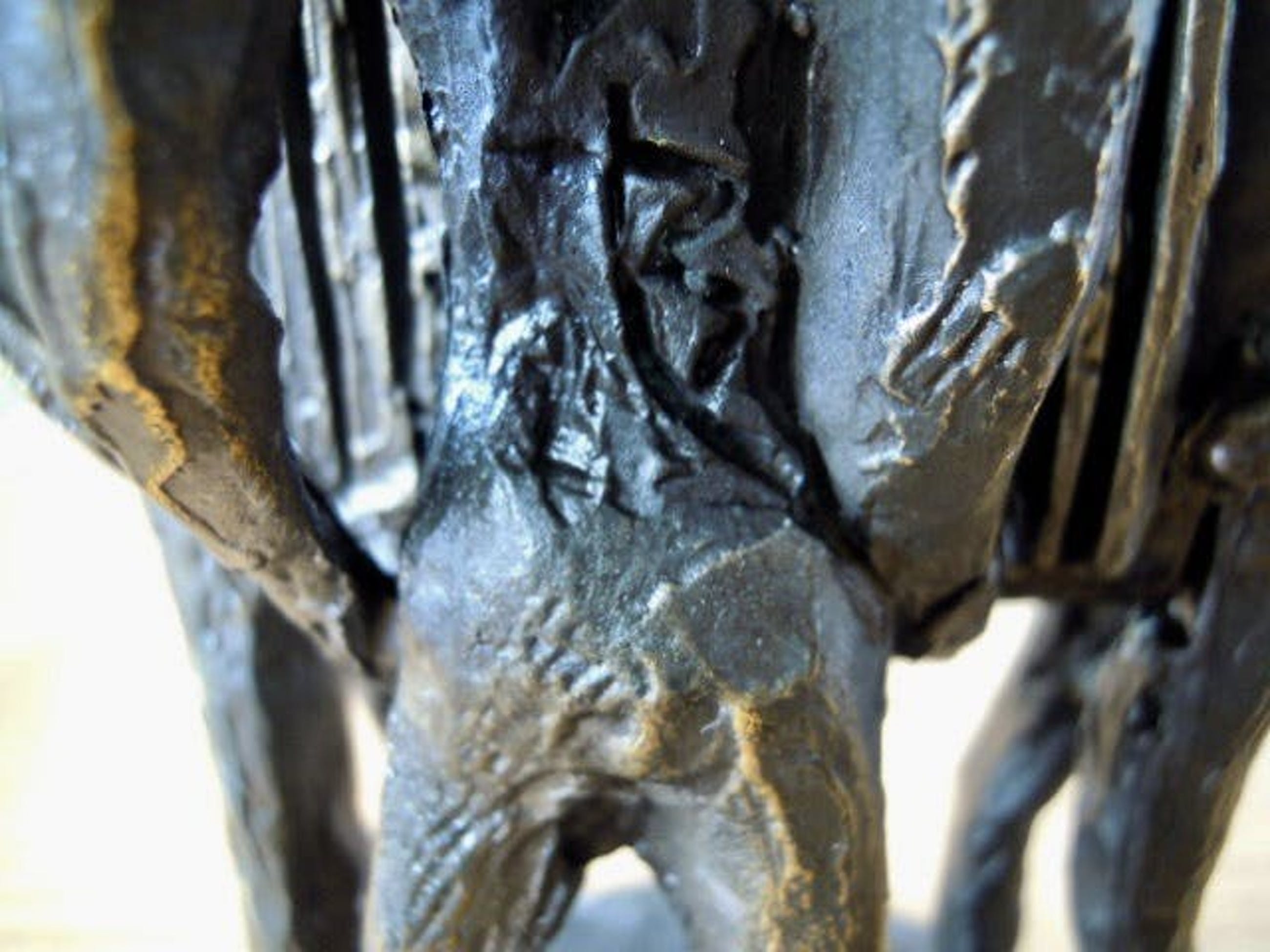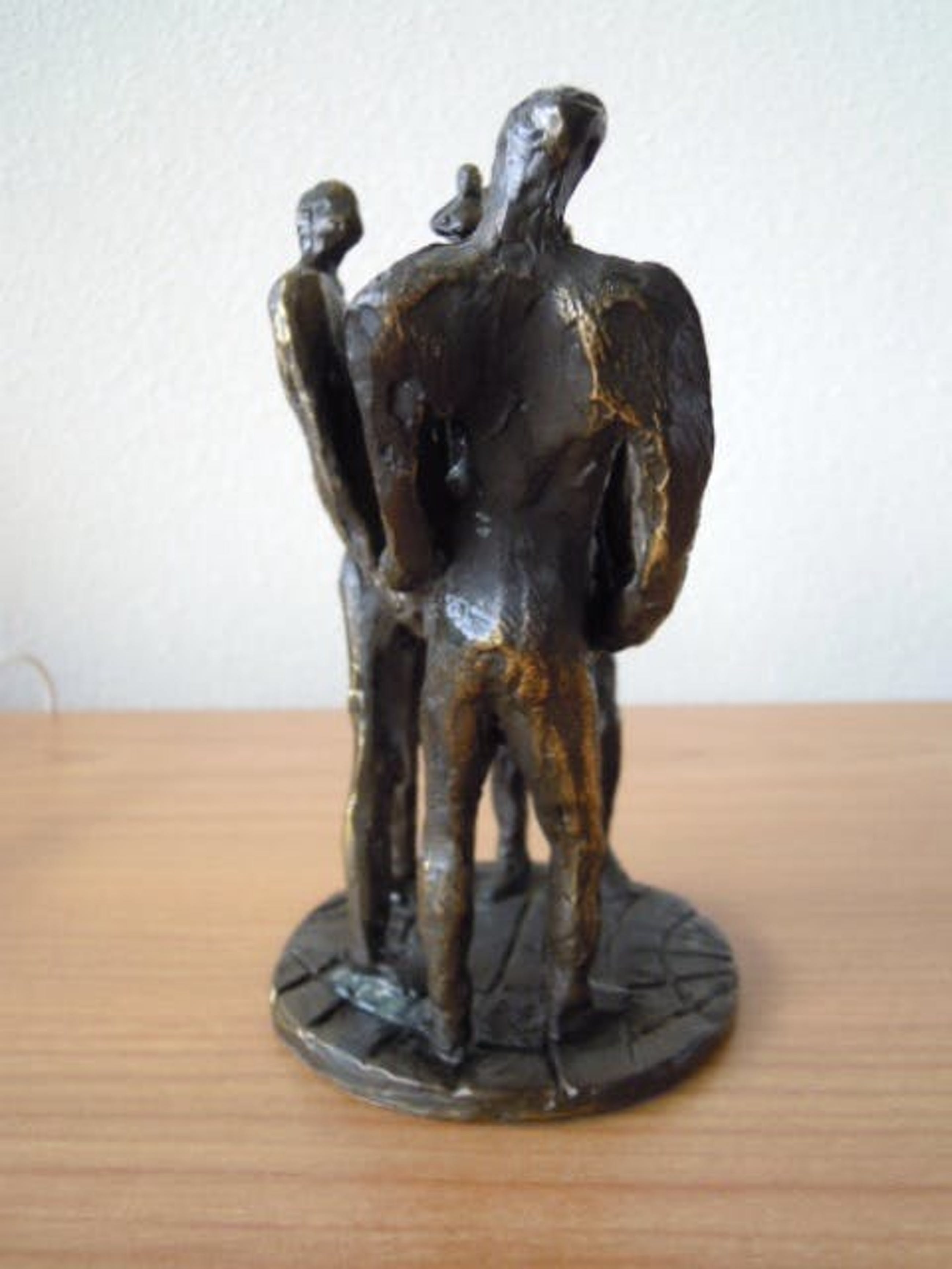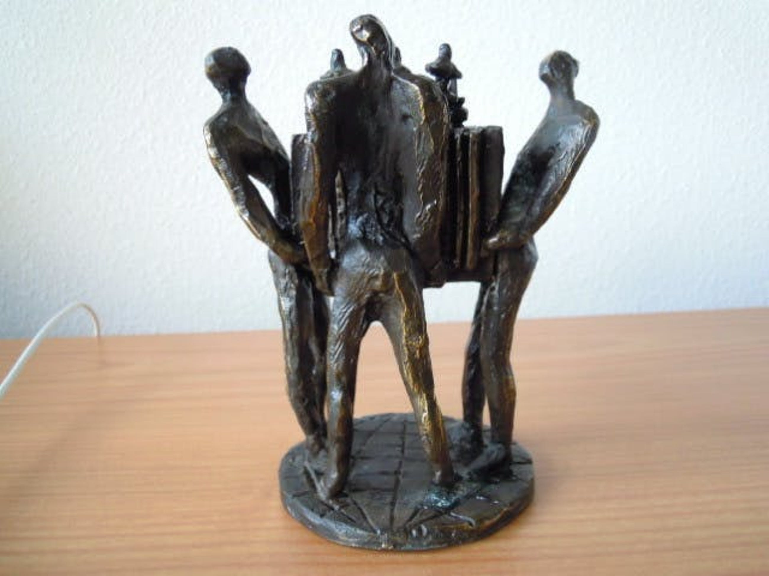 Het betreft een zwaar massief beeld dat in prachtige staat verkeert. Het bestaat uit drie mannen die gezamelijk iets optillen. Is gesigneerd op de achterkant van een van de mannen - zie foto.