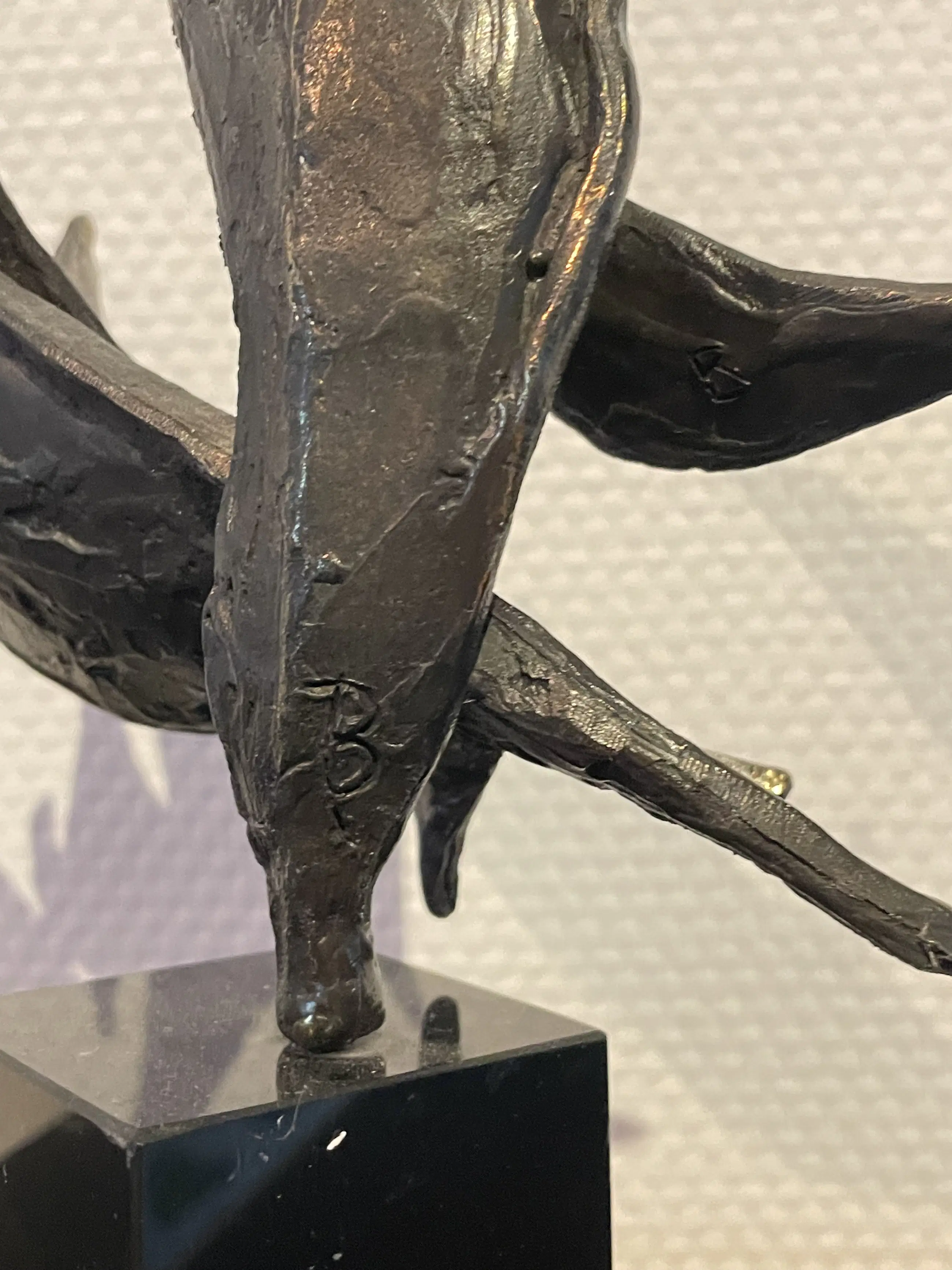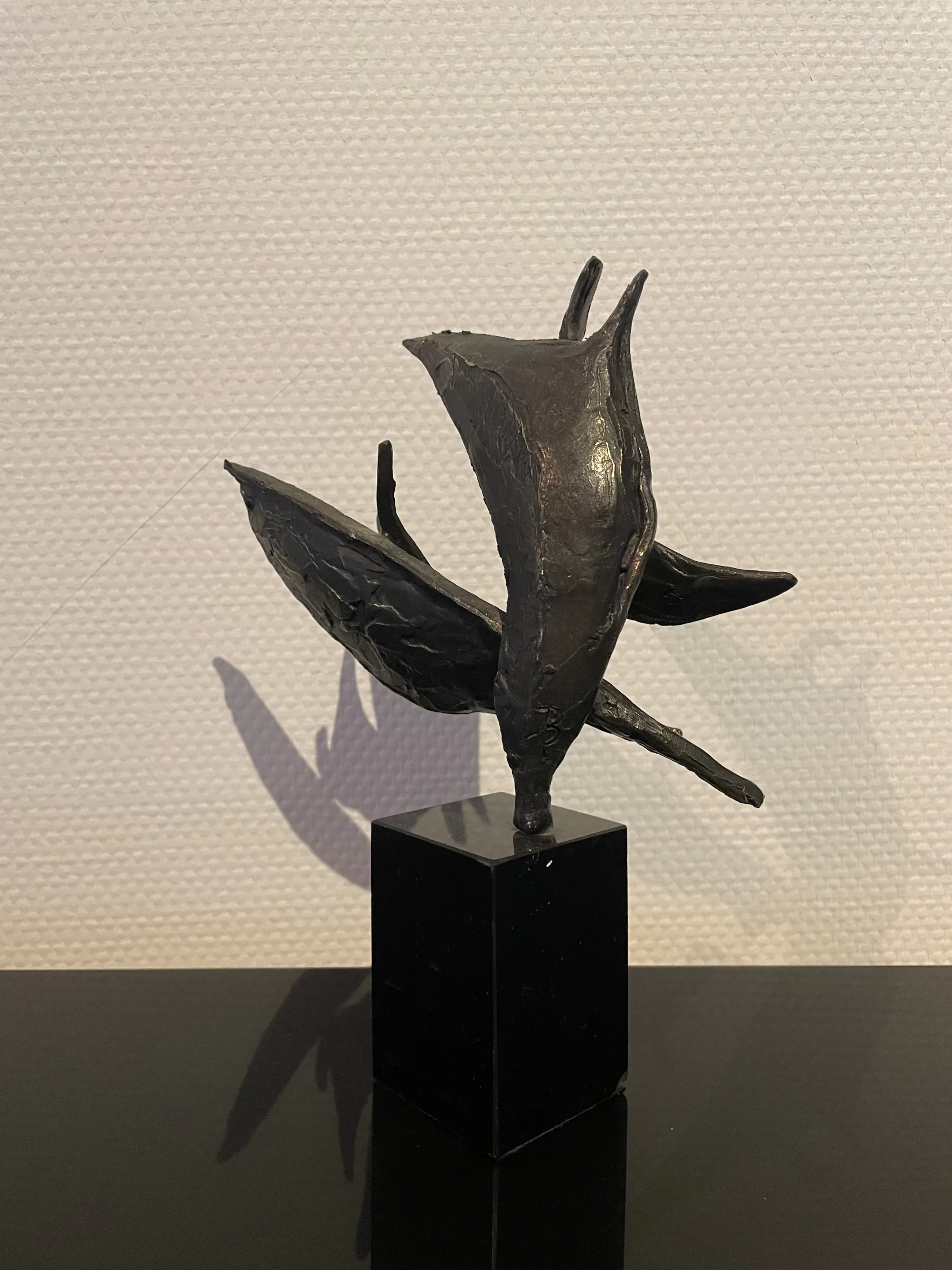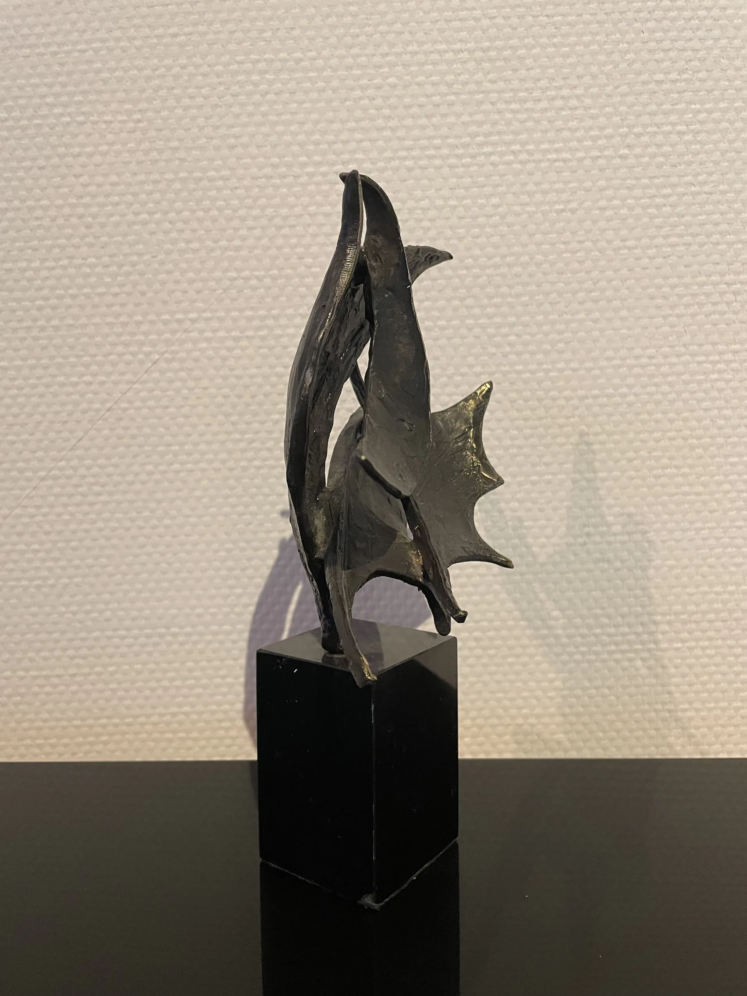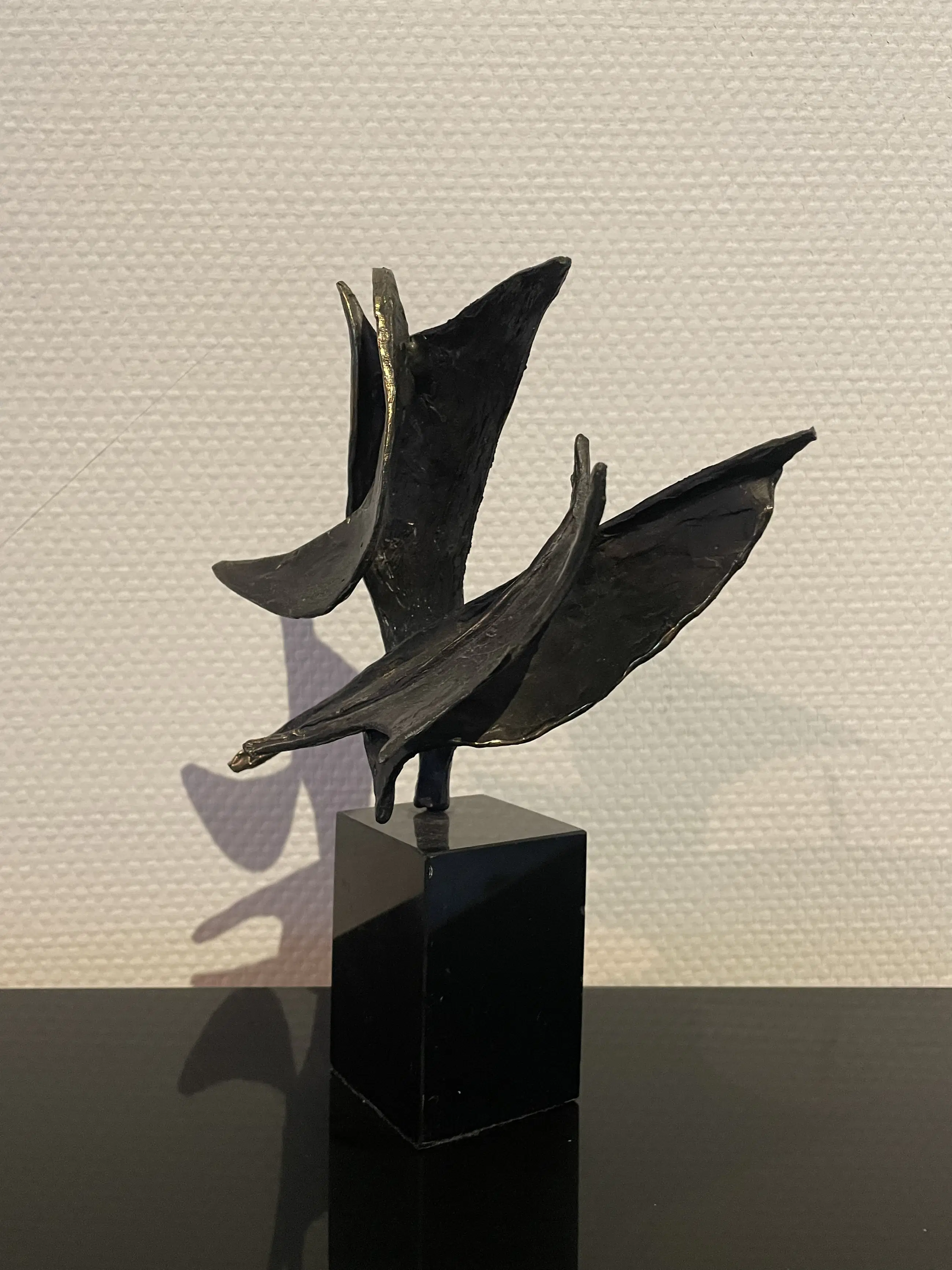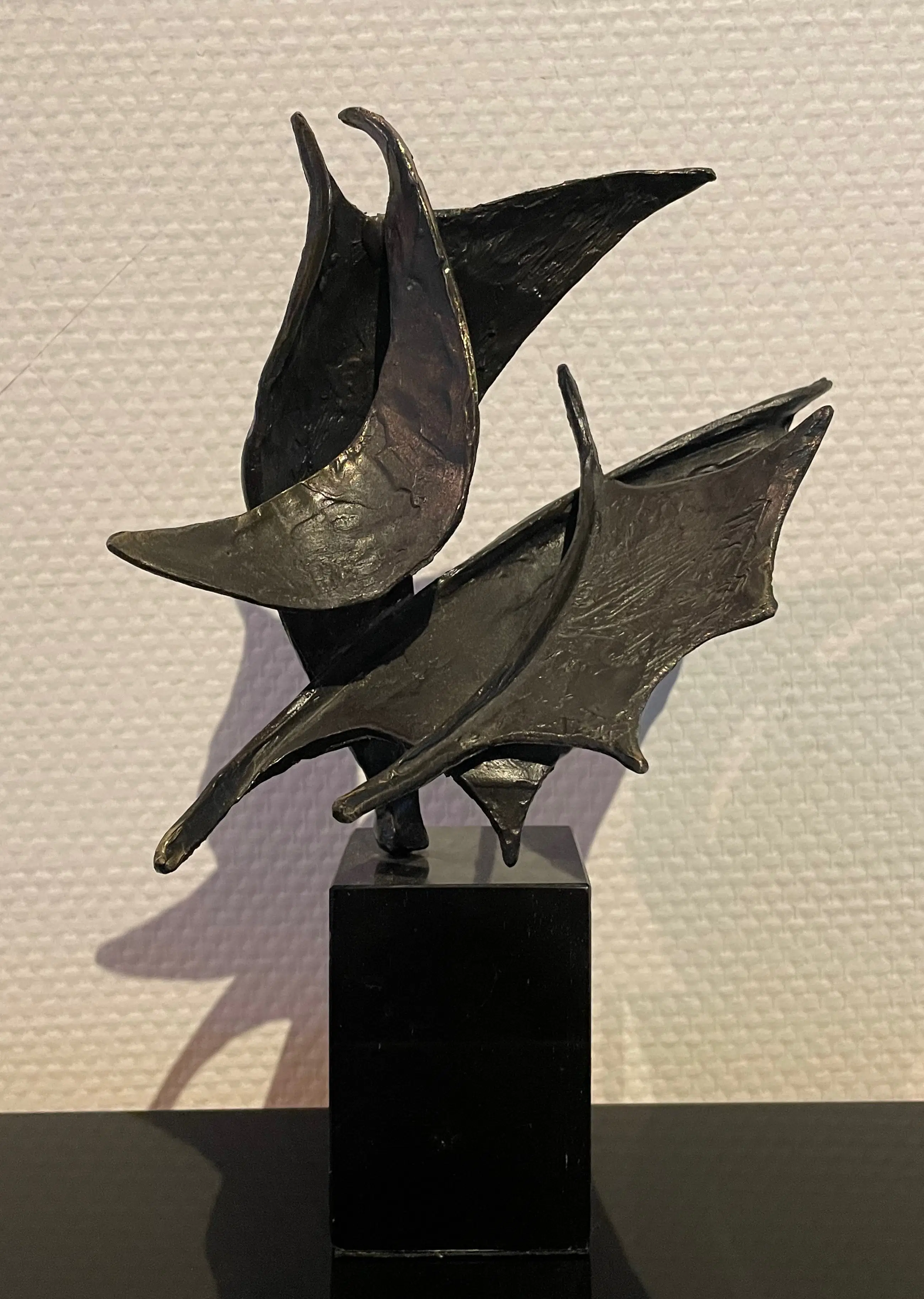 Bekend werk van Bernadette Leijdekkers, getiteld 'Wind in de zeilen'. Het werk is voorzien van monogram. Op hardstenen sokkel. Opgegeven afmetingen zijn inclusief deze sokkel.