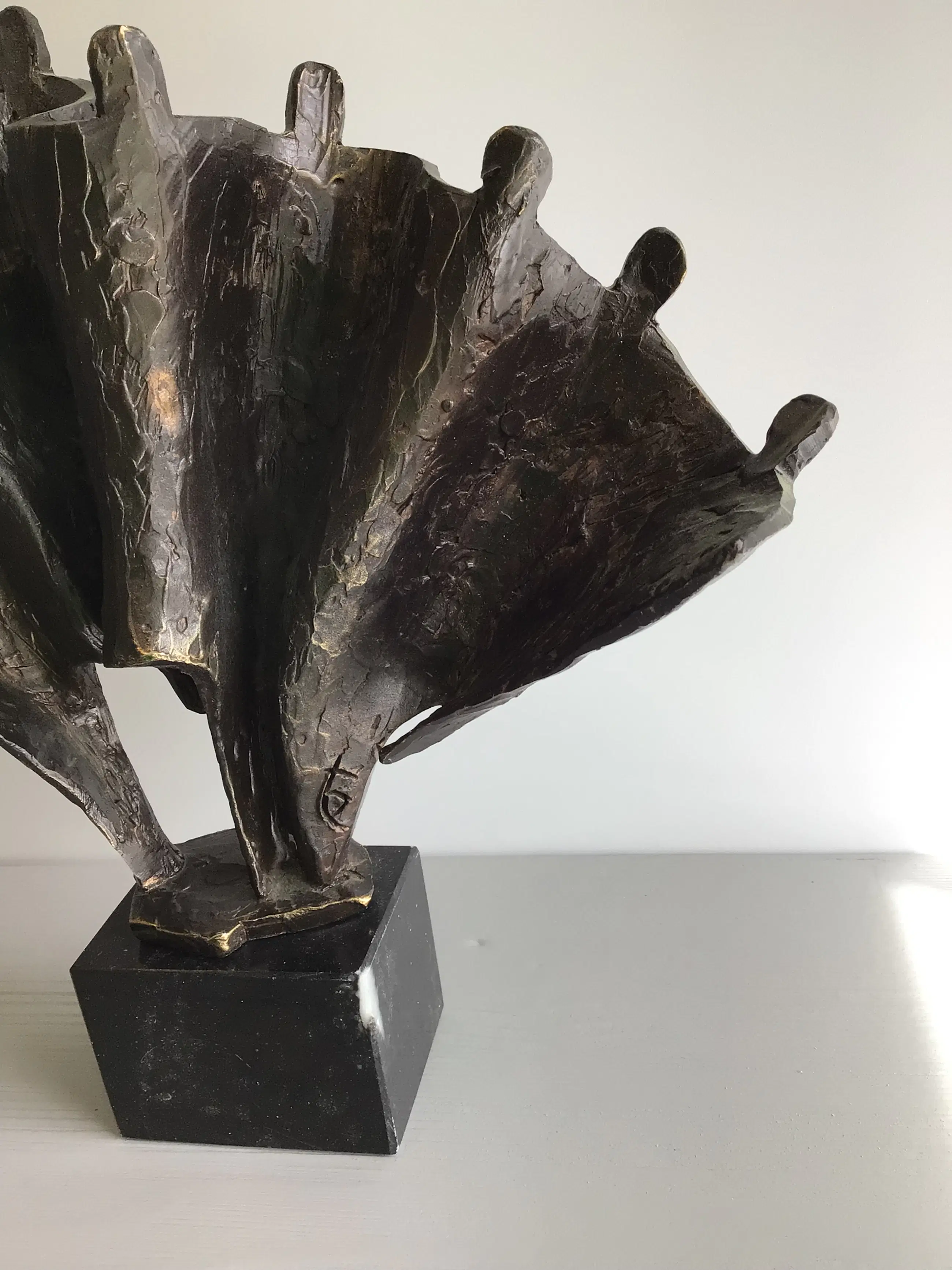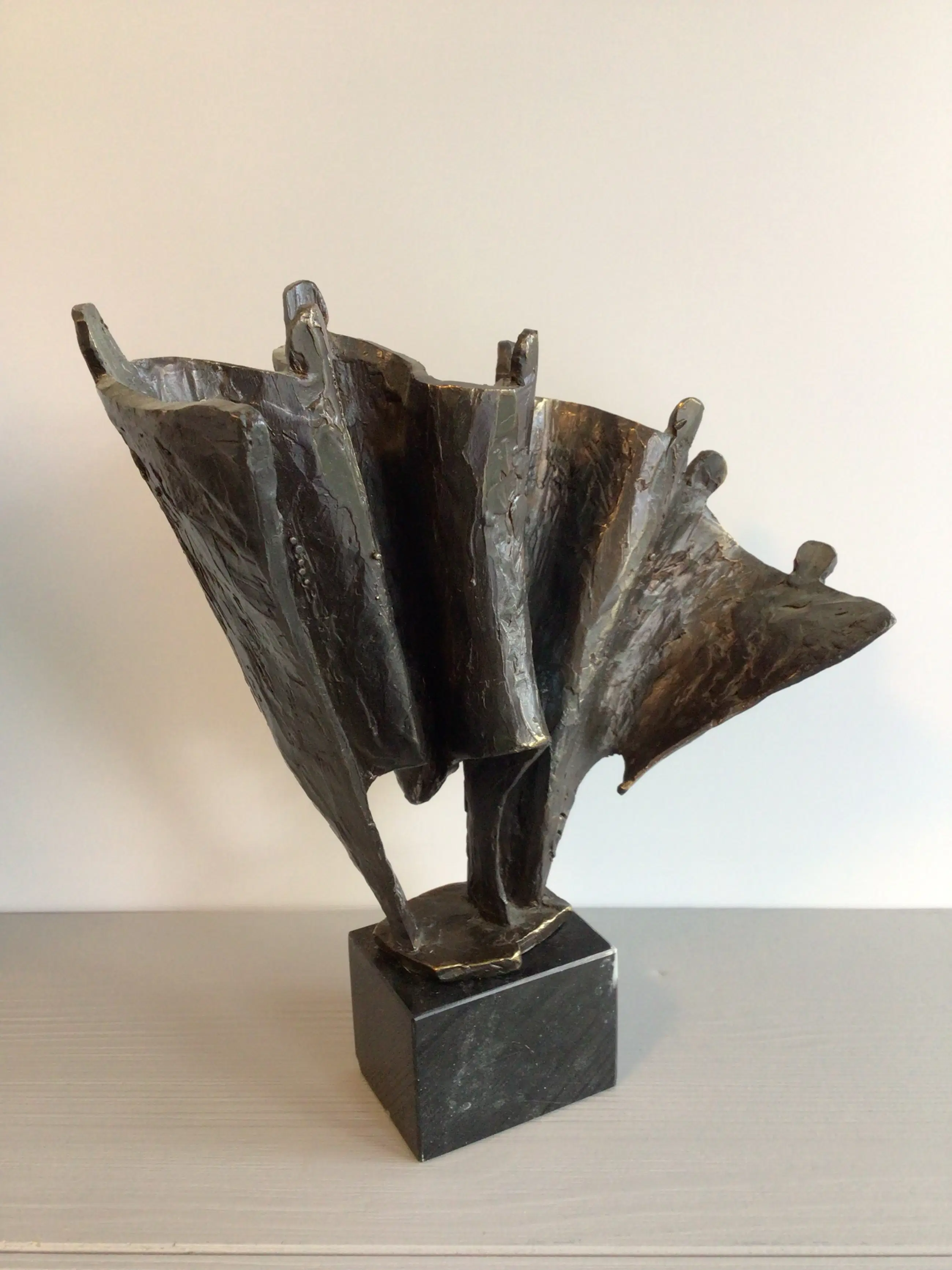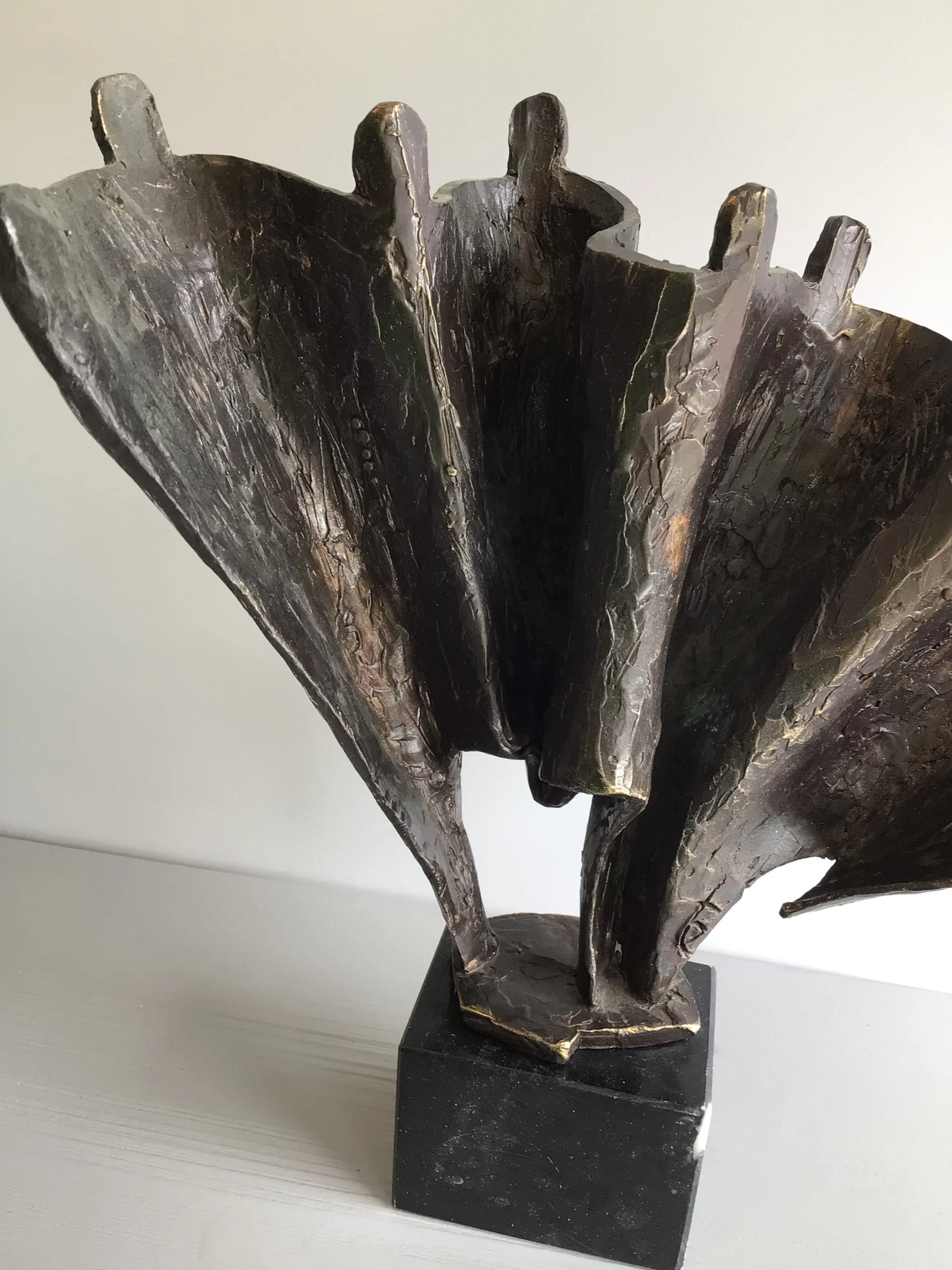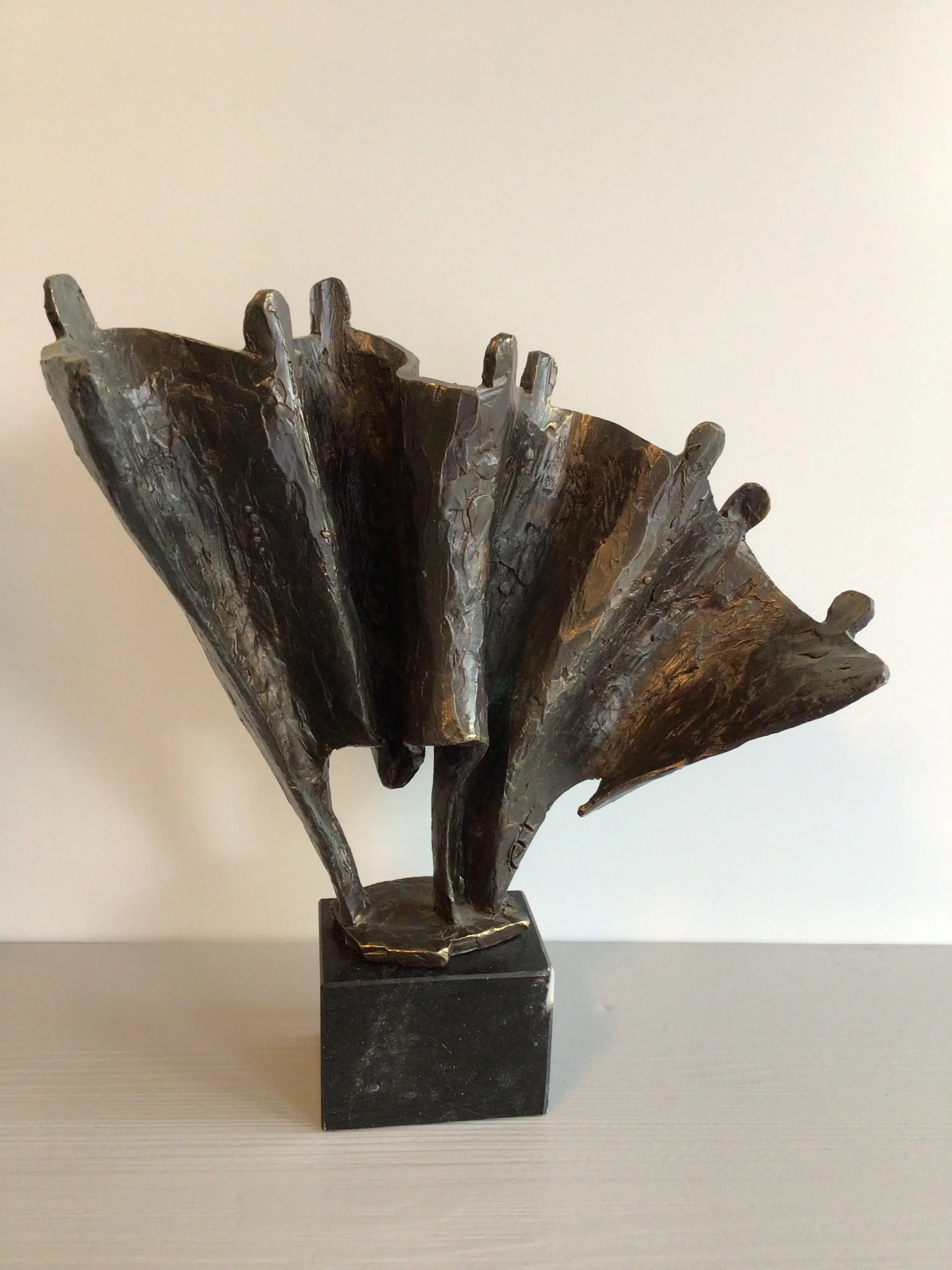 Zeer fraai vormgegeven en dynamisch sculptuur van acht mensfiguren die samen, zij aan zij , een sterke eenheid vormen, ze staan samen sterk ! Het betreft een vrij zeldzaam exemplaar, niet meer te verkrijgen in de vrije verkoop. Kunstenares: Bernadette Leijdekkers Het beeld is gesigneerd: BL Materiaal: brons op zwart marmeren sokkel Hoogte: 26 cm Breedte : 24 cm Het beeld verkeert in goede staat en wordt zorgvuldig verpakt verzonden.