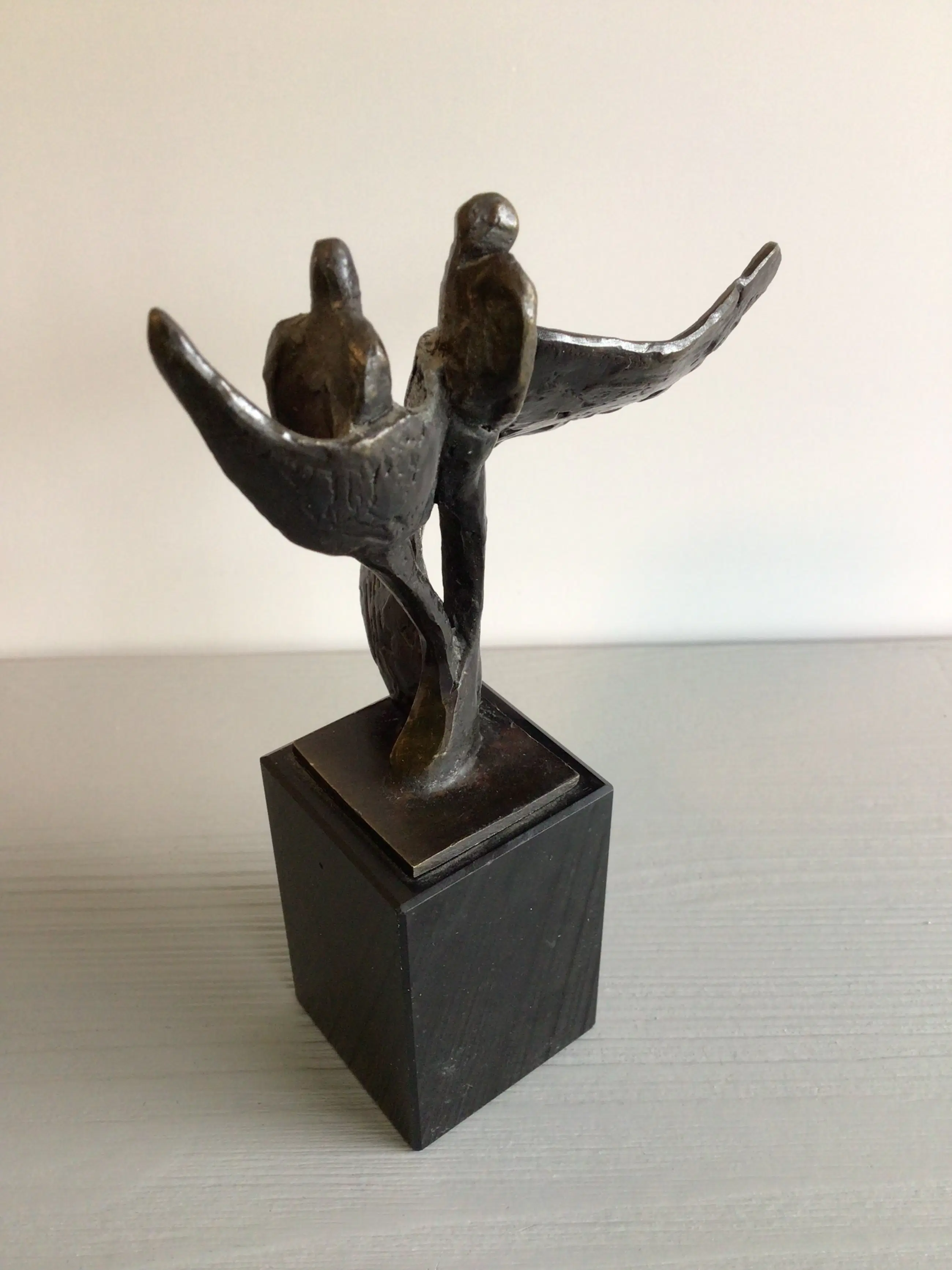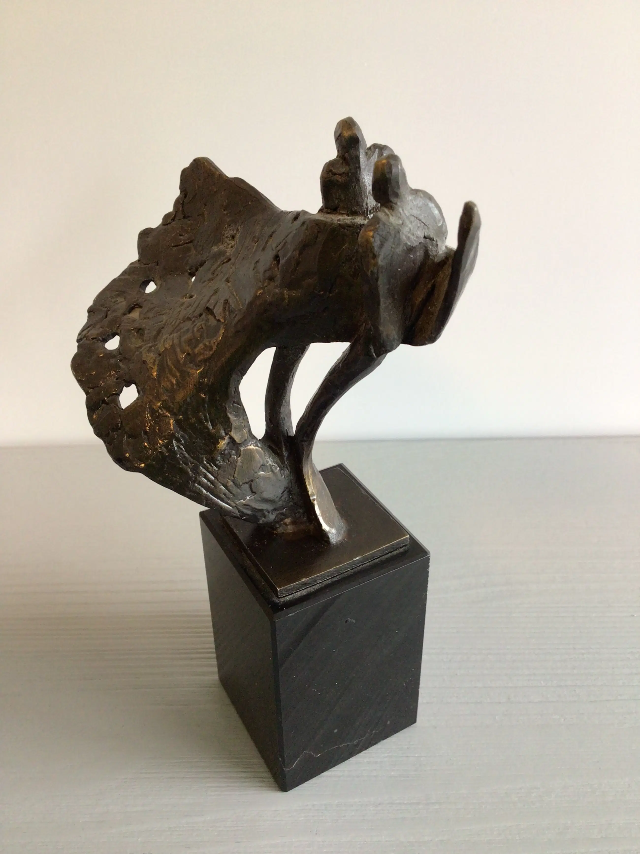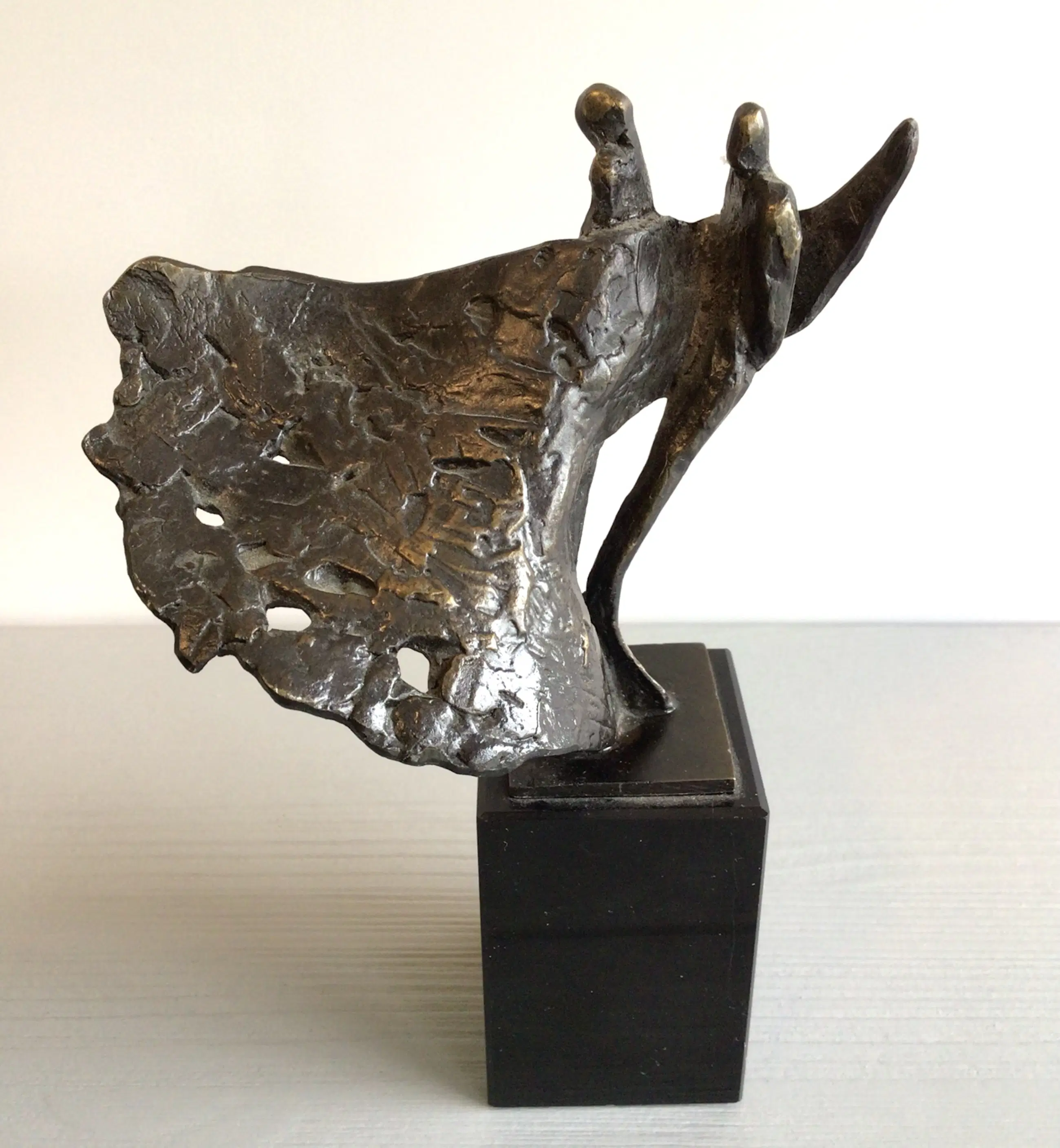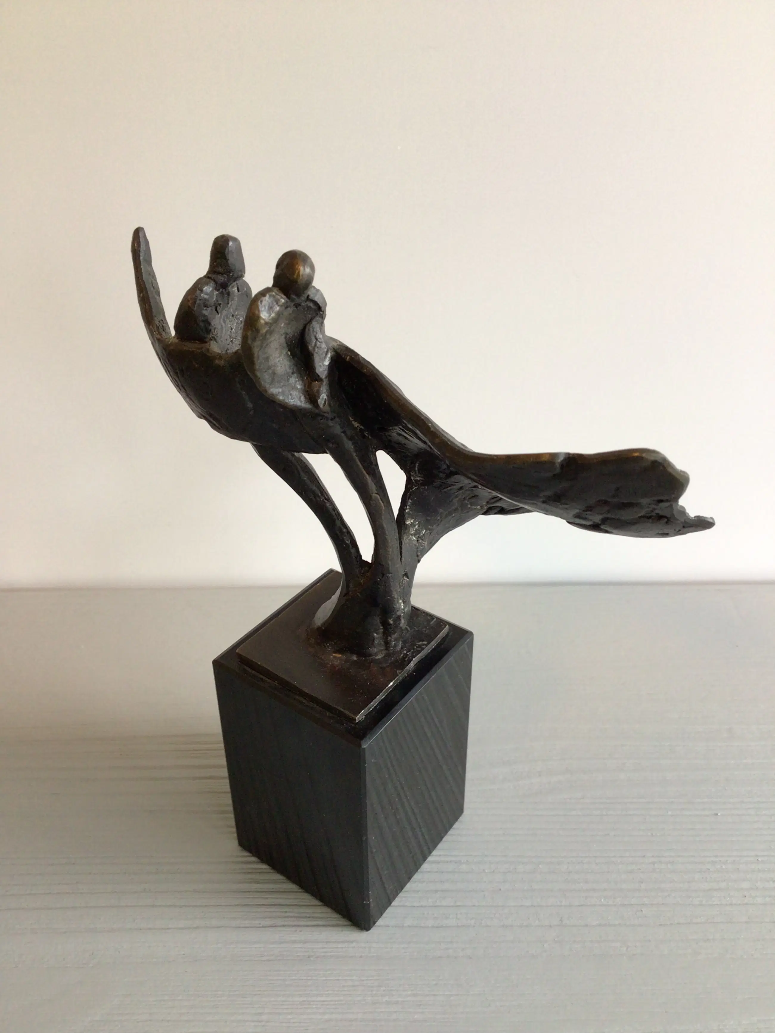Zeer fraai vormgegeven en dynamisch sculptuur van twee mensfiguren “ als door een wervelwind gedragen “ zij aan zij , openstaan voor nieuwe uitdagingen. Het betreft een vrij zeldzaam exemplaar, niet meer te verkrijgen in de vrije verkoop. Kunstenares: Bernadette Leijdekkers Het beeld is op de achterzijde gesigneerd: BL Materiaal: brons op fraaie marmeren sokkel Hoogte: 16 cm Het beeld verkeert in goede staat en wordt zorgvuldig verpakt verzonden.