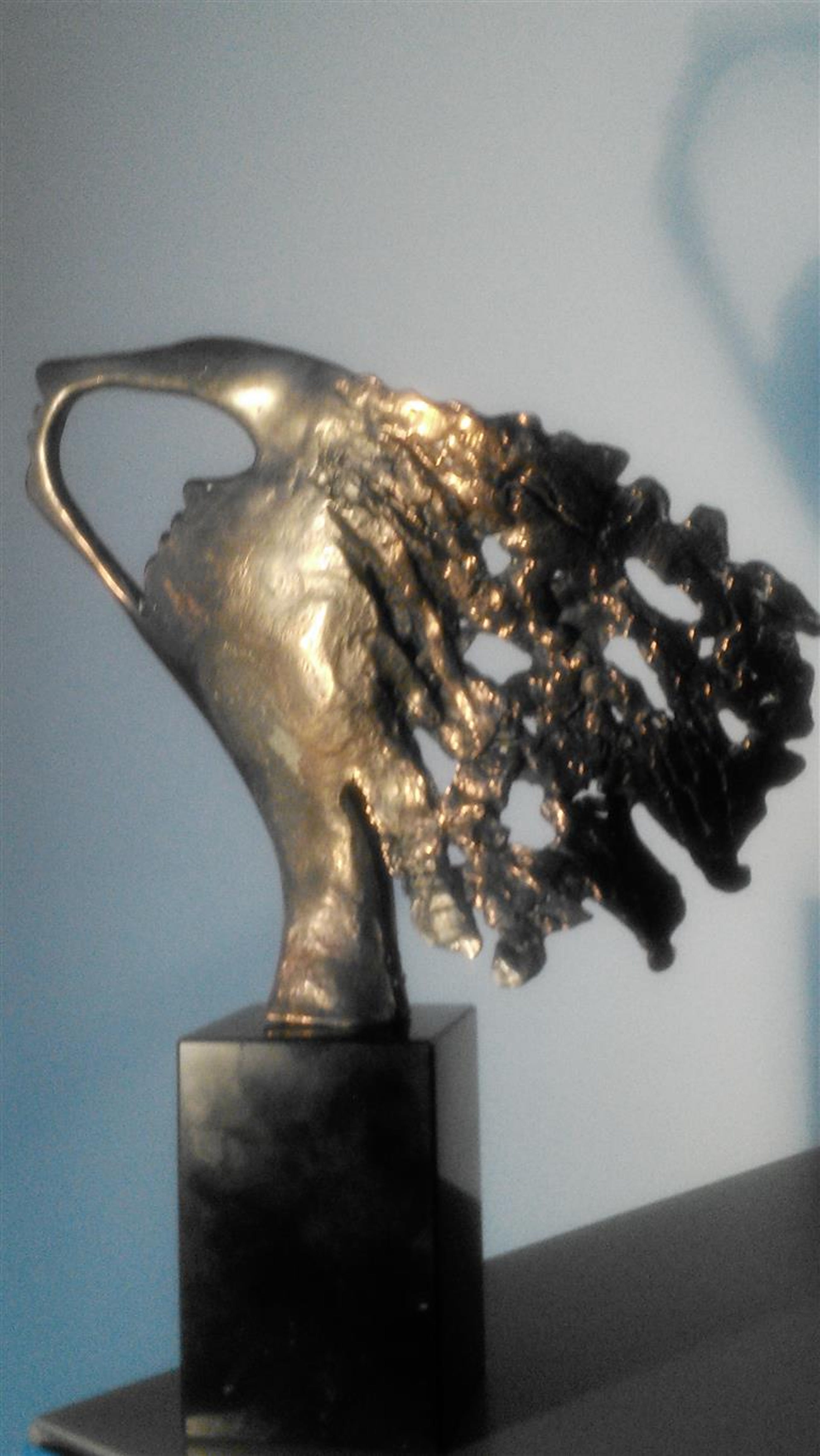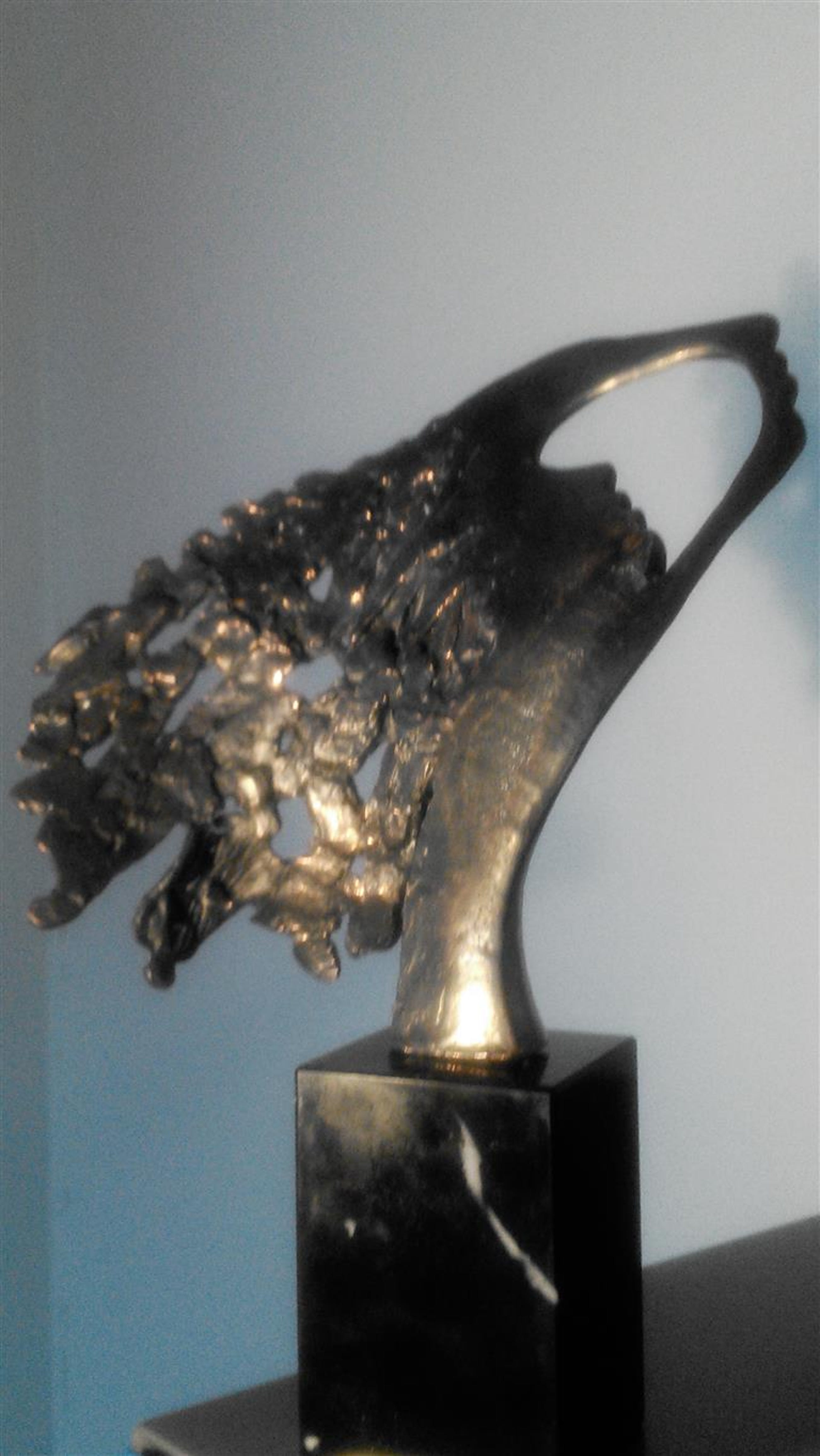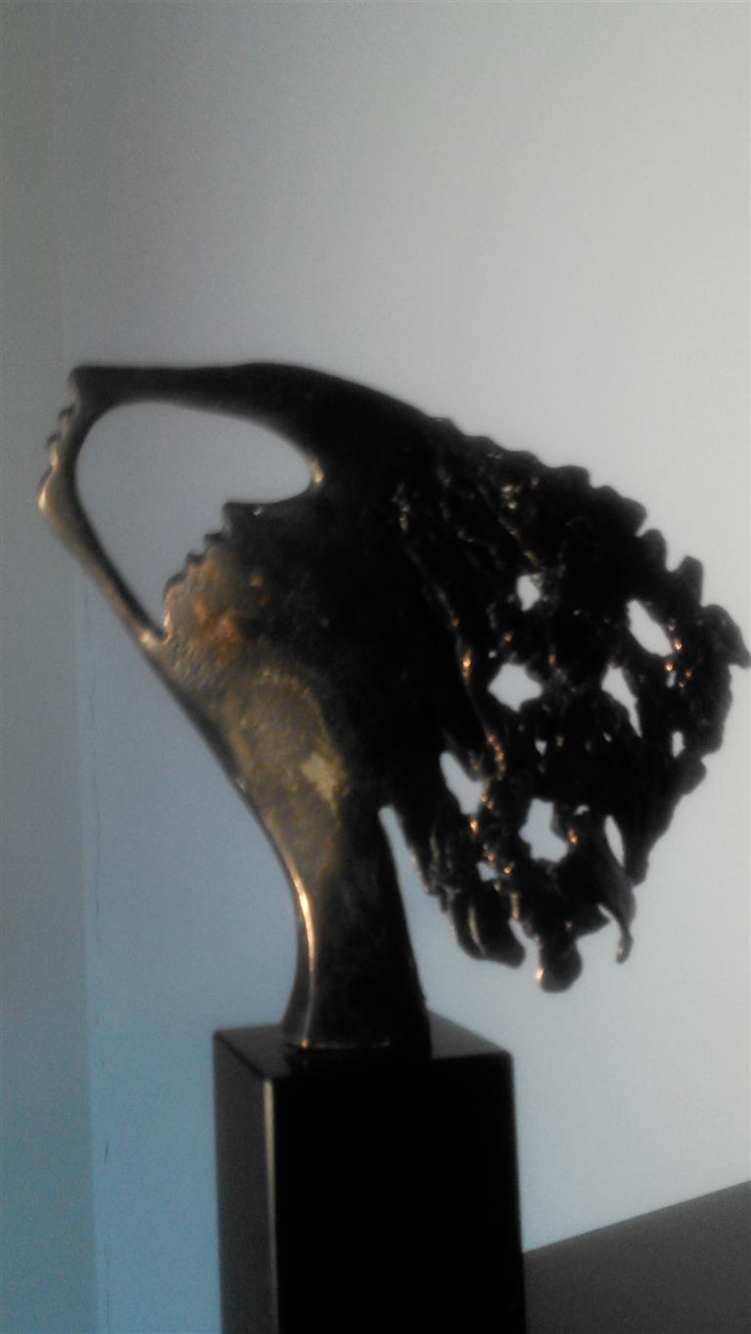 Op zwarte natuurstenen sokkel 9 x 6 x 6 cm een mooi gedetailleerd vrouwenhoofd en profil met de contouren van een tweede ik