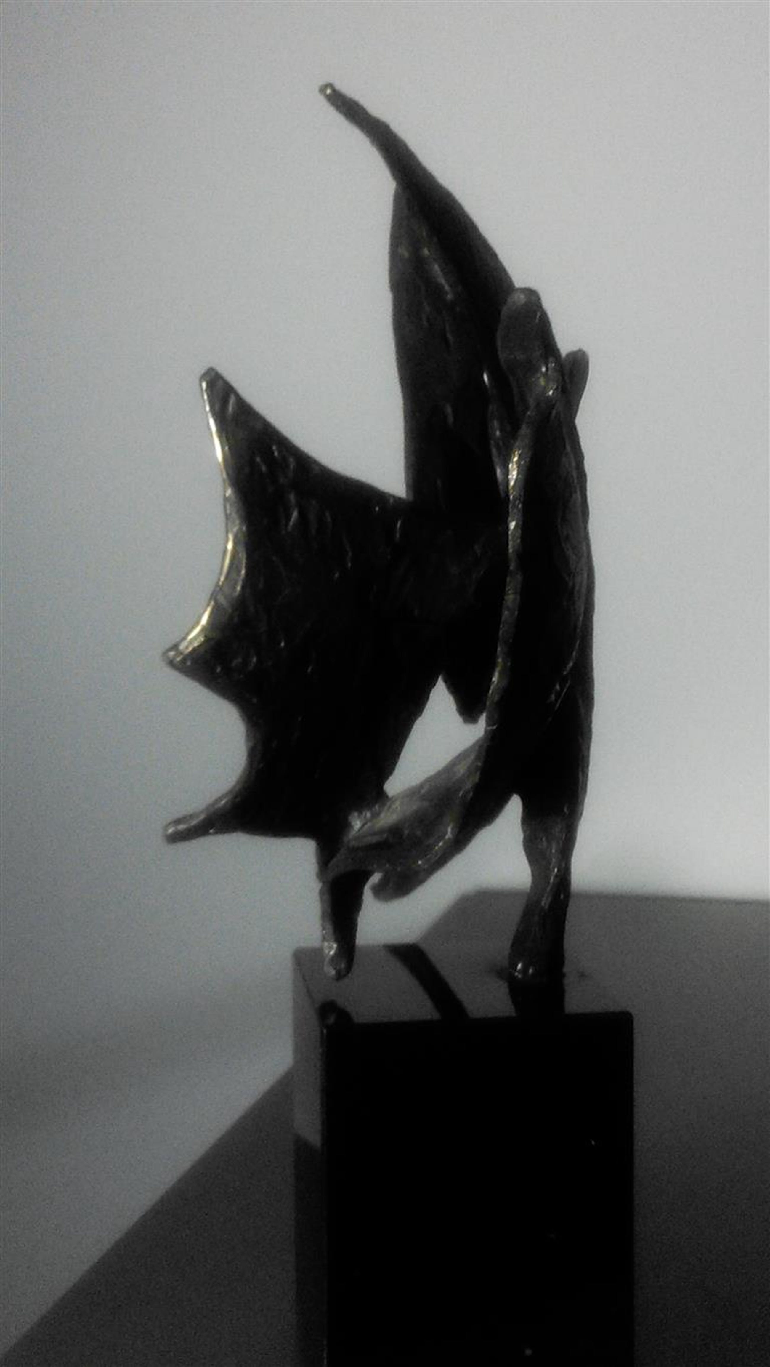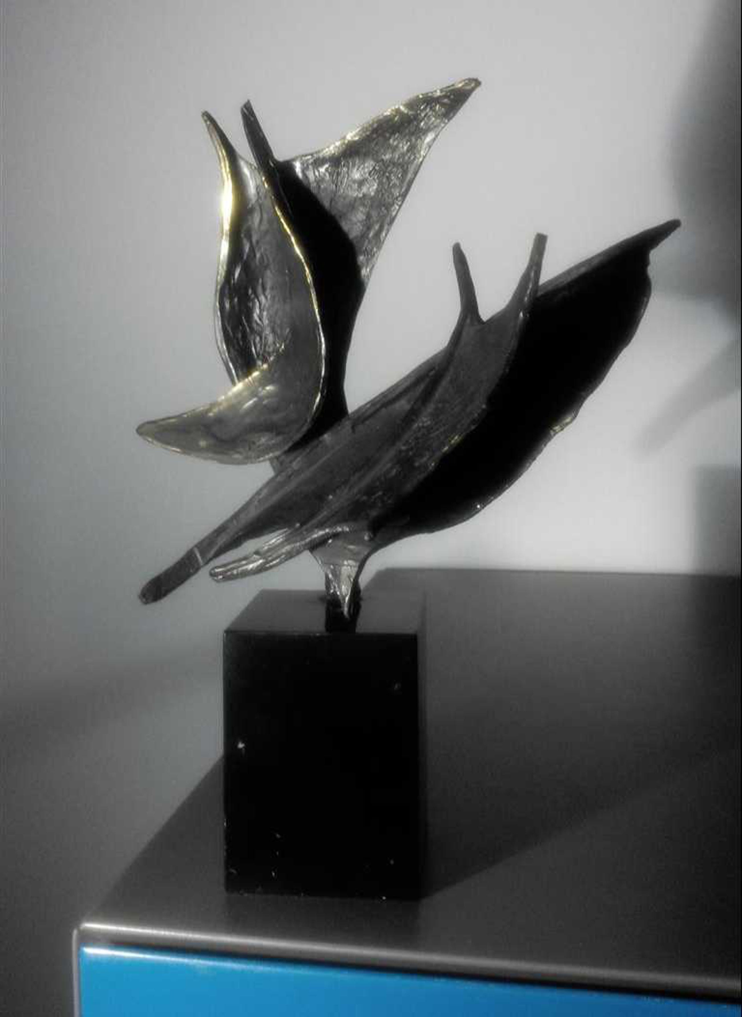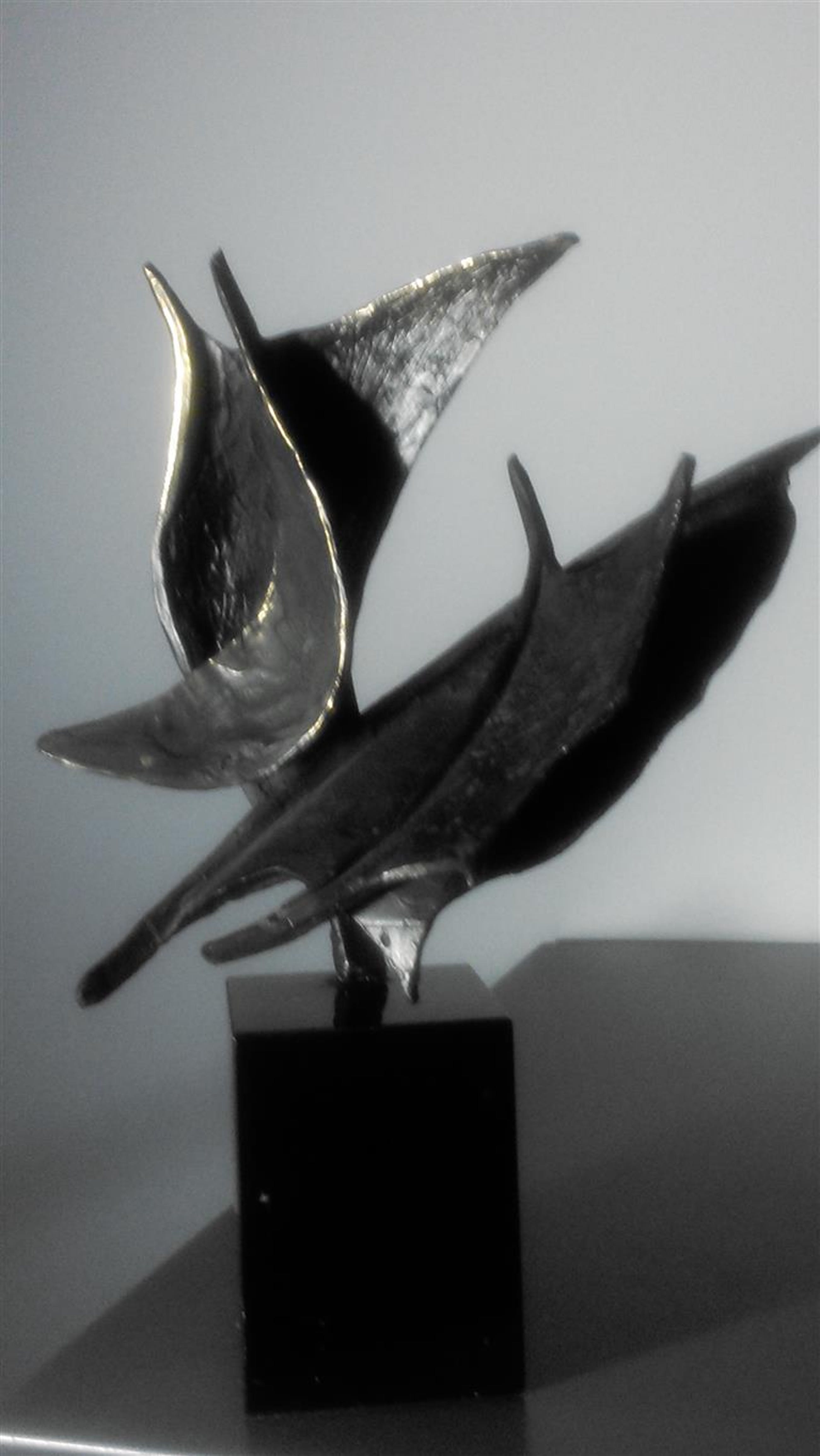Op zwarte natuurstenen sokkel 7 cm hoog dit plastische beeld Wind in de zeilen Gesigneerd BL Motivatie kunstenares : Onze samenwerking is als de wind in de zeilen we varen koers op succes. "Bij mijn beelden ligt de uiteindelijke concentratie en aandacht in de vorm, maar ook hier spelen energie en levenslust een grote rol in beweging en dynamiek. Ik werk voornamelijk in brons."