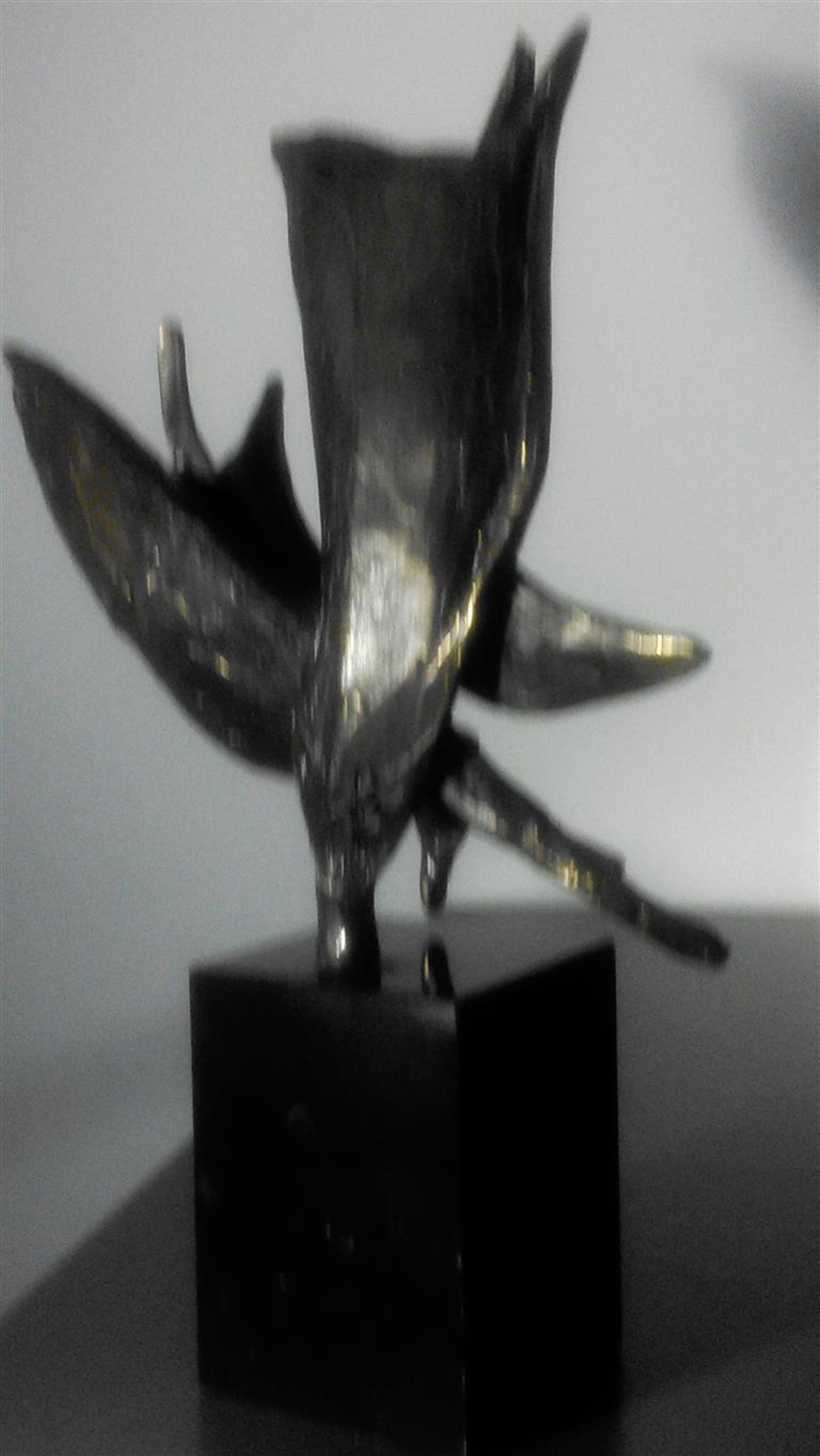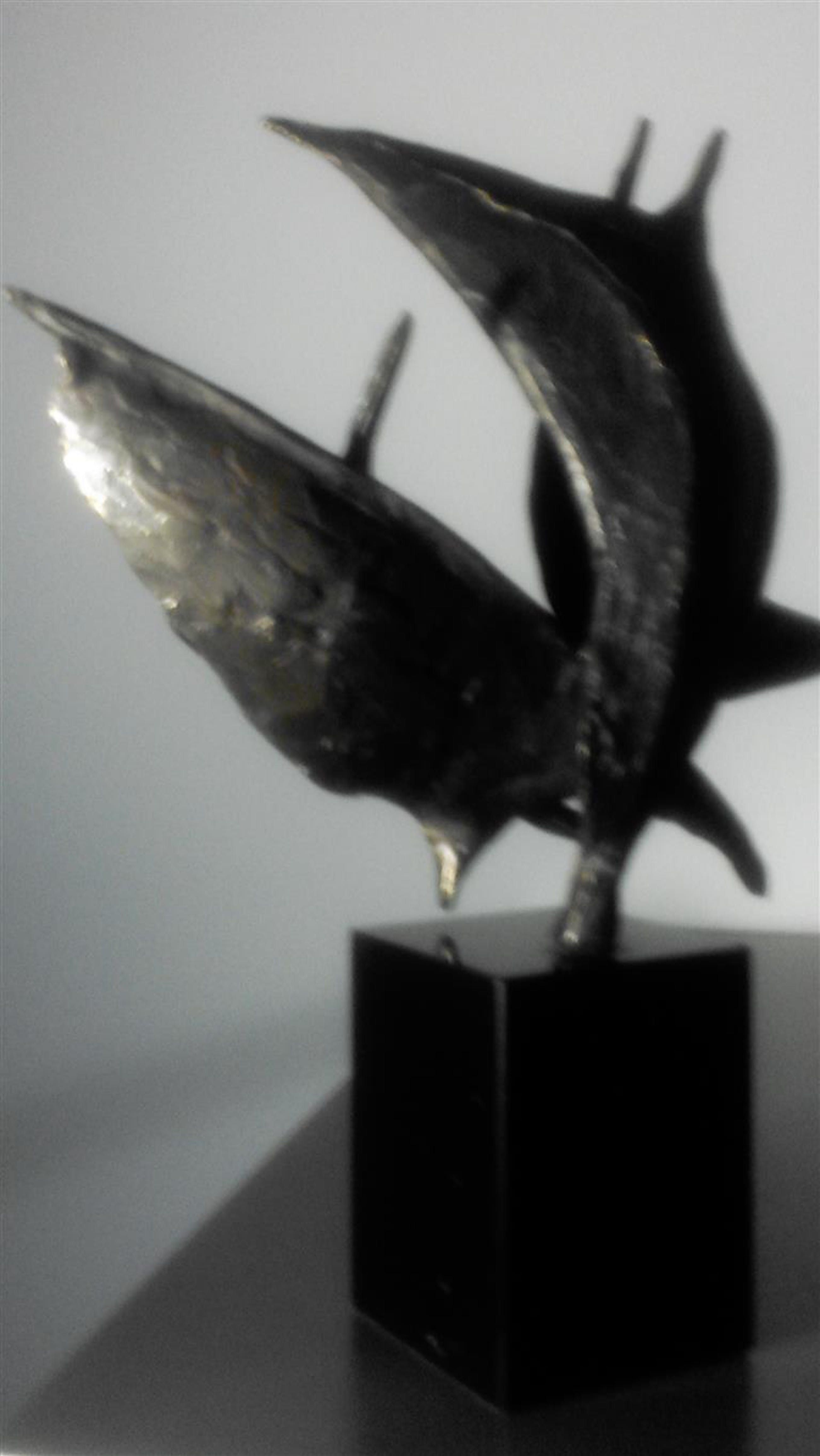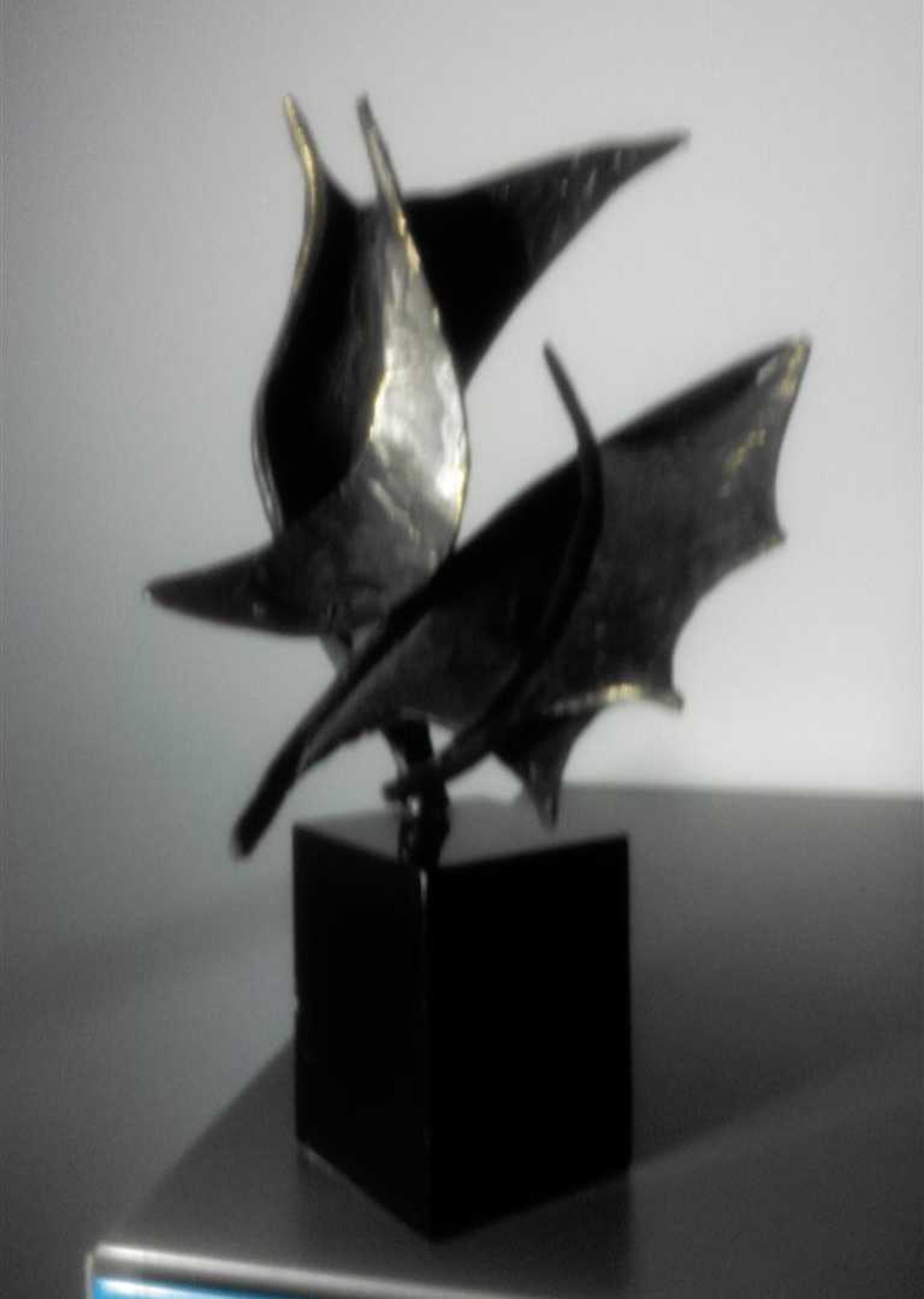 Op zwarte natuurstenen sokkel 7 cm hoog dit plastische beeld Wind in de zeilen Gesigneerd BL Motivatie kunstenares : Onze samenwerking is als de wind in de zeilen we varen koers op succes. "Bij mijn beelden ligt de uiteindelijke concentratie en aandacht in de vorm, maar ook hier spelen energie en levenslust een grote rol in beweging en dynamiek. Ik werk voornamelijk in brons."