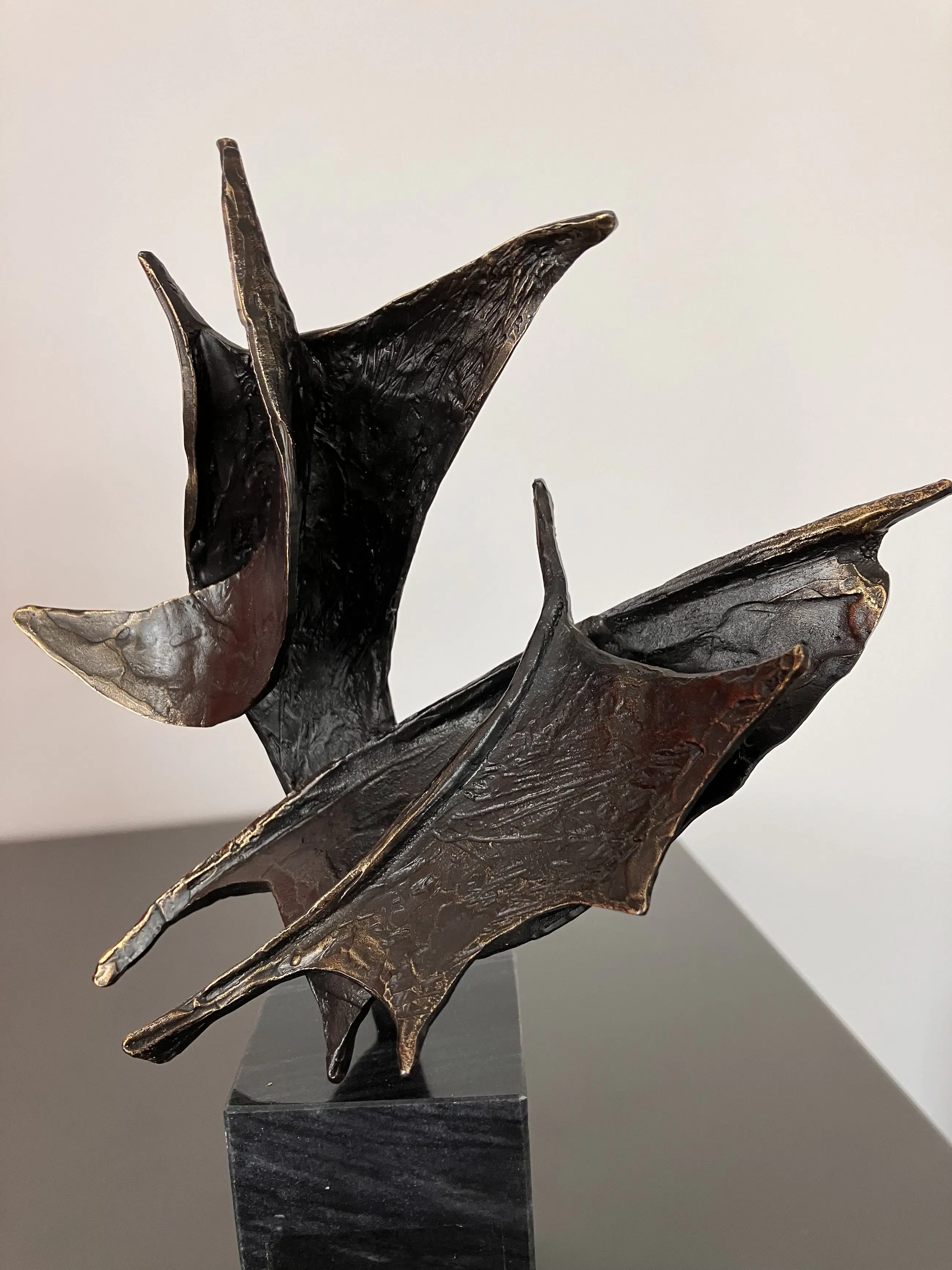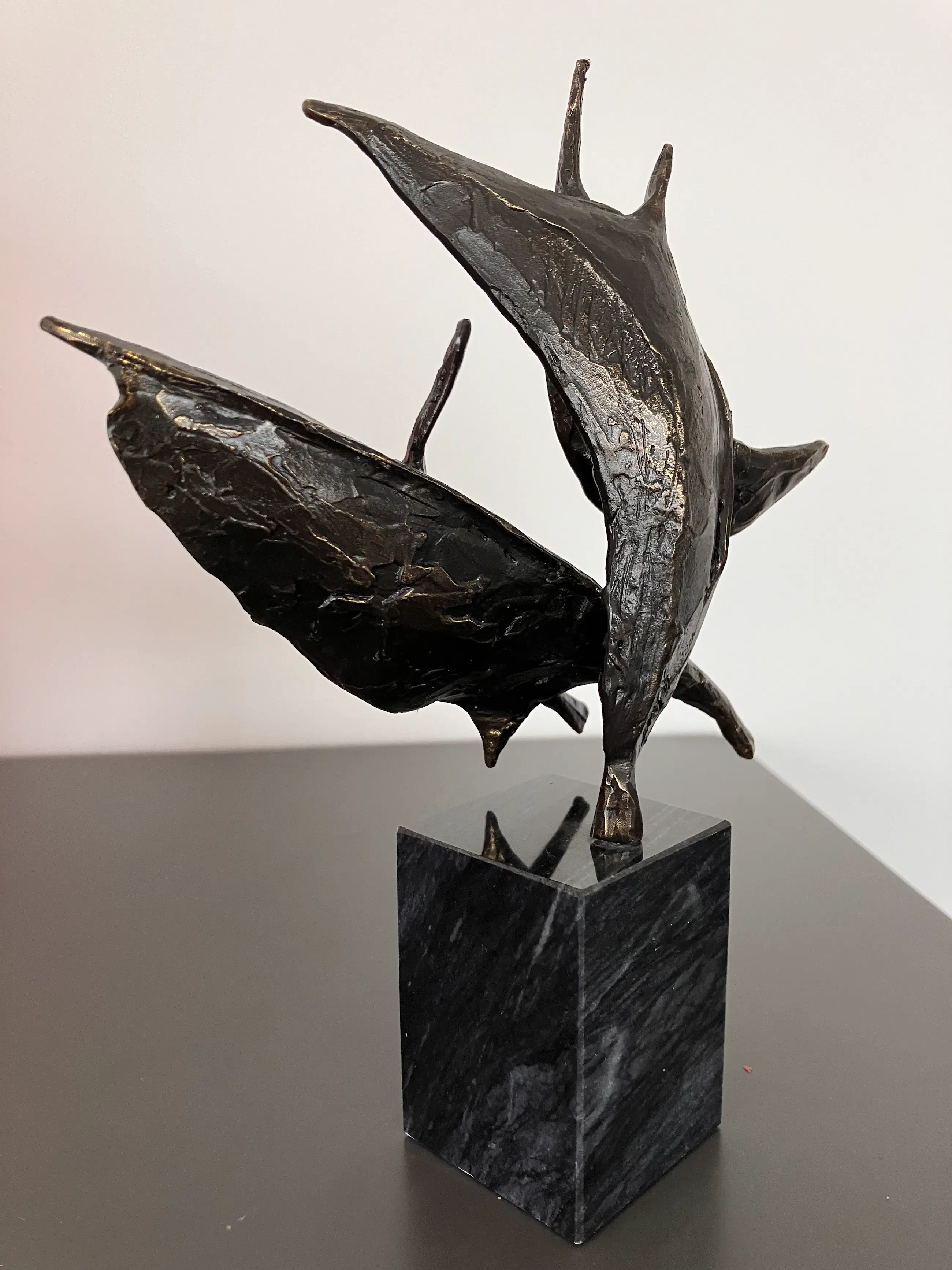 Op zwarte natuurstenen sokkel 7 cm hoog dit plastische beeld Wind in de zeilen Gesigneerd BL Motivatie kunstenares : Onze samenwerking is als de wind in de zeilen we varen koers op succes. "Bij mijn beelden ligt de uiteindelijke concentratie en aandacht in de vorm, maar ook hier spelen energie en levenslust een grote rol in beweging en dynamiek. Ik werk voornamelijk in brons."