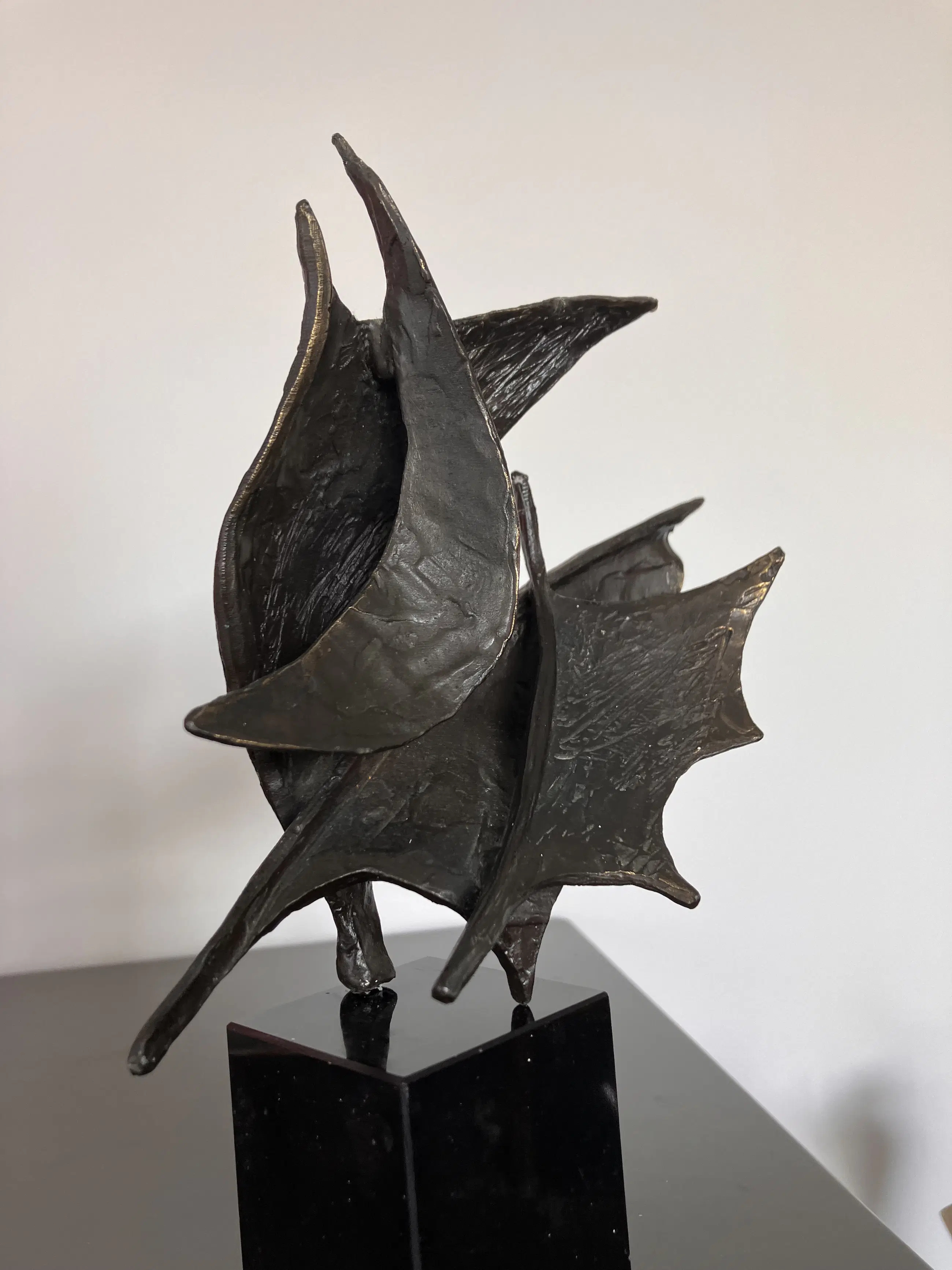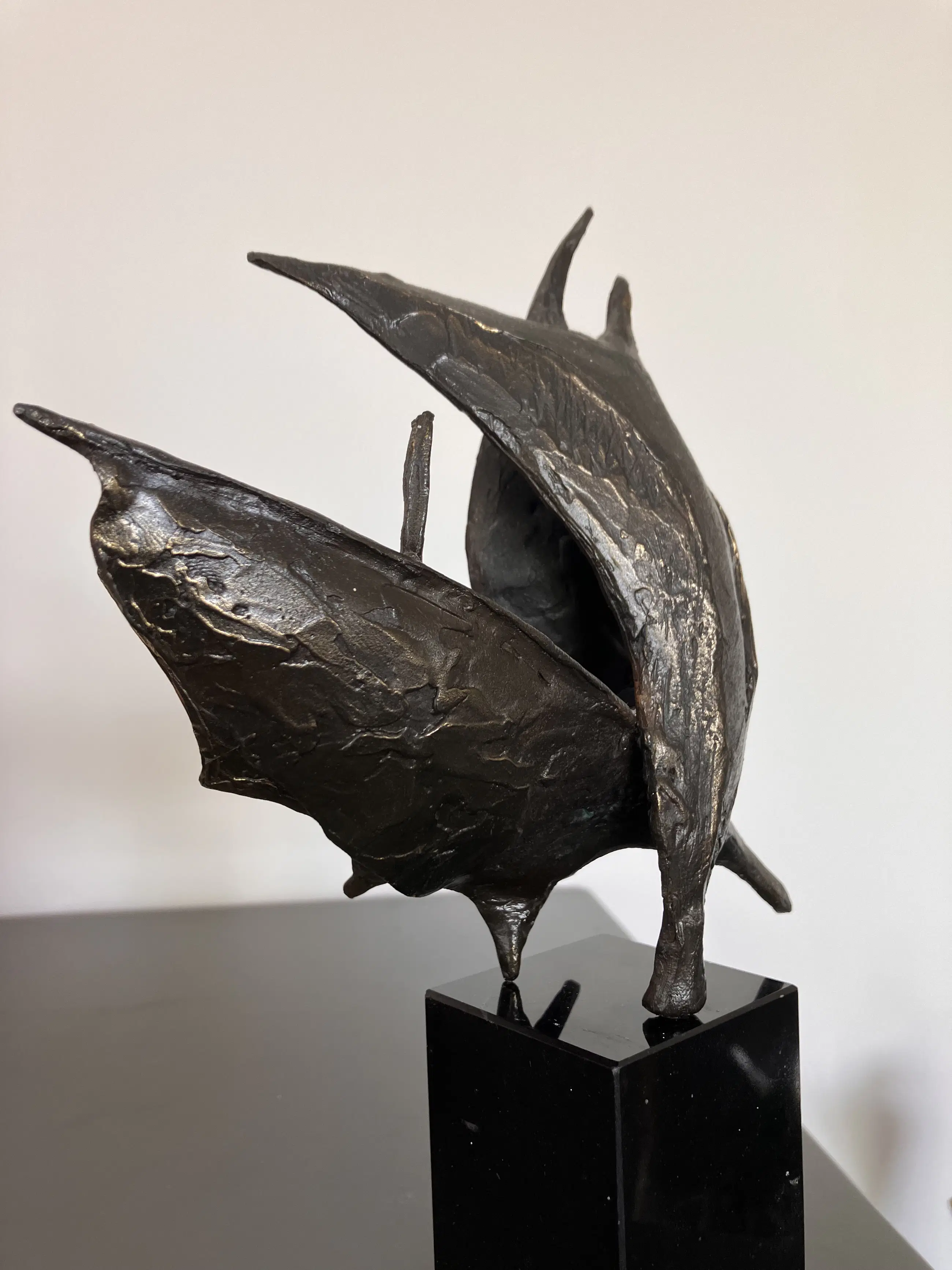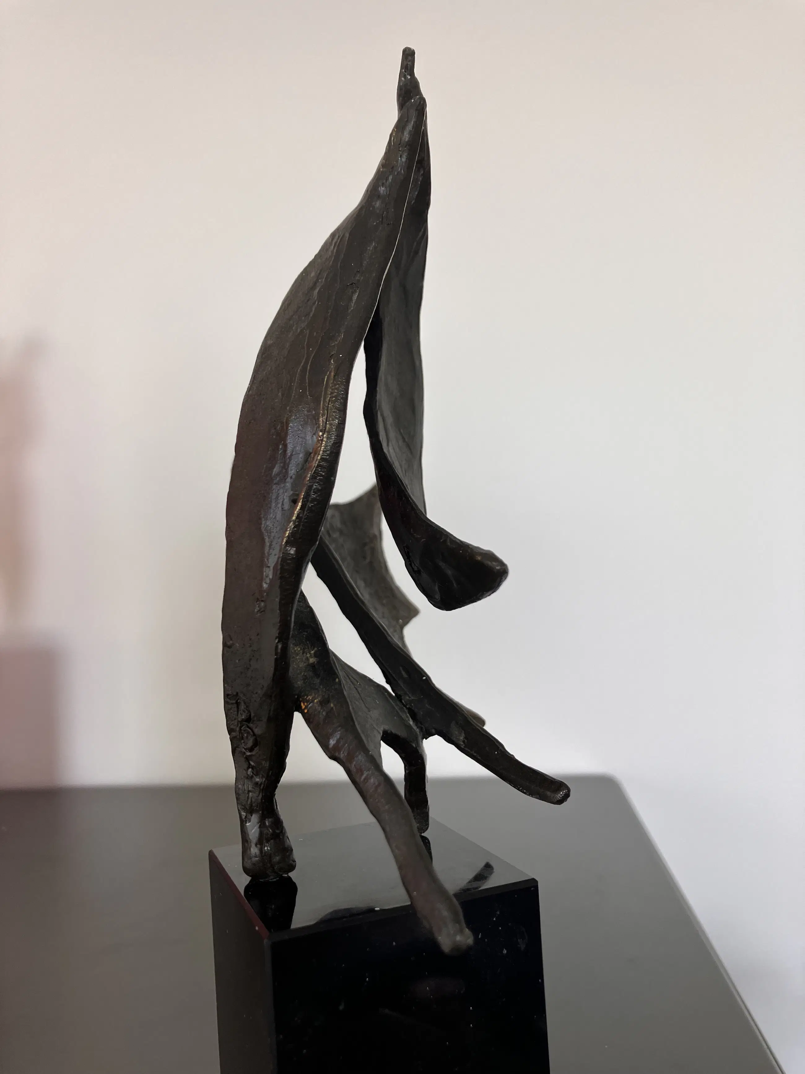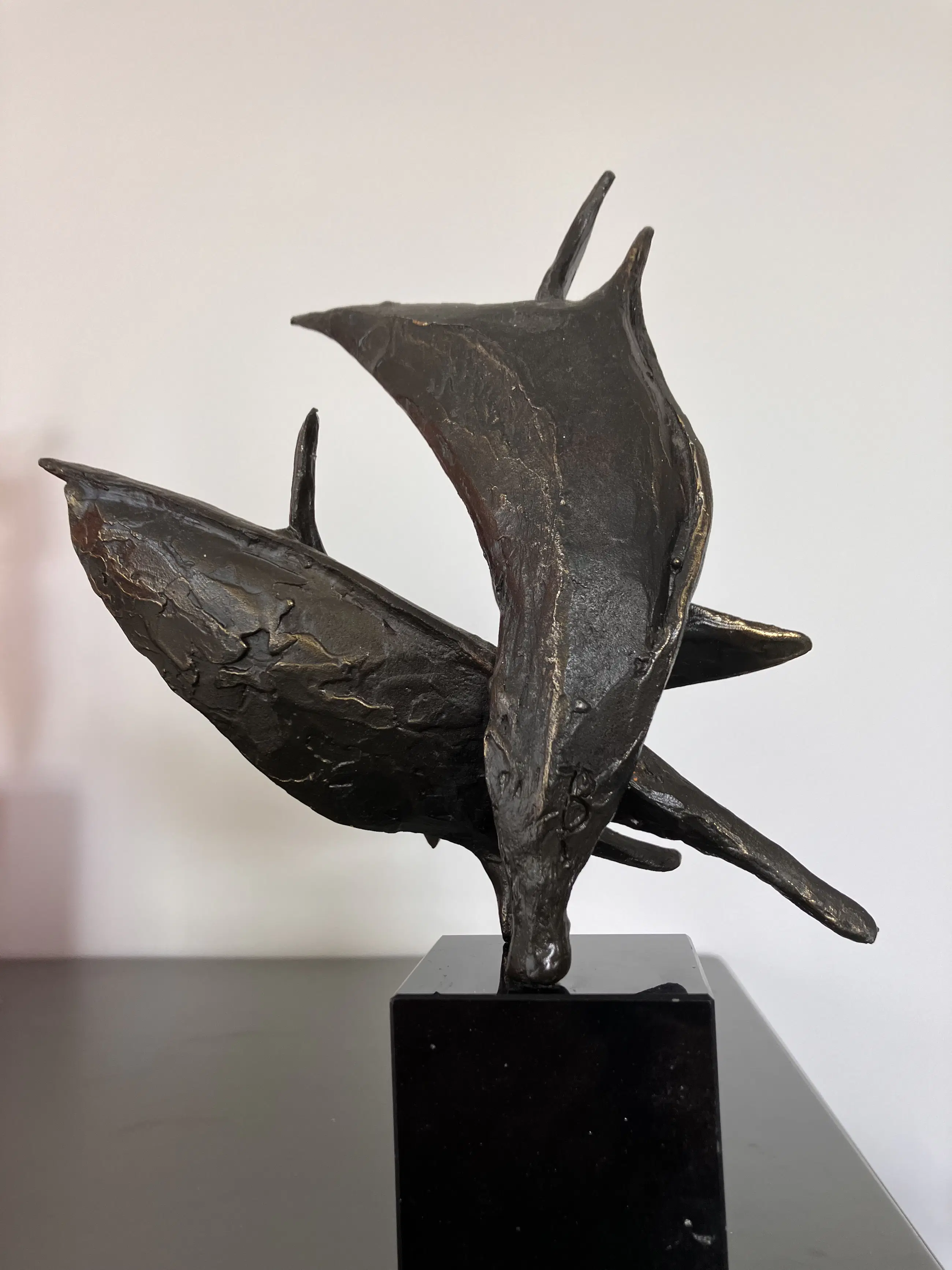 Op zwarte natuurstenen sokkel dit plastisch beeld. Motivatie kunstenares : Onze samenwerking is als de wind in de zeilen we varen koers op succes. "Bij mijn beelden ligt de uiteindelijke concentratie en aandacht in de vorm, maar ook hier spelen energie en levenslust een grote rol in beweging en dynamiek. Ik werk voornamelijk in brons."