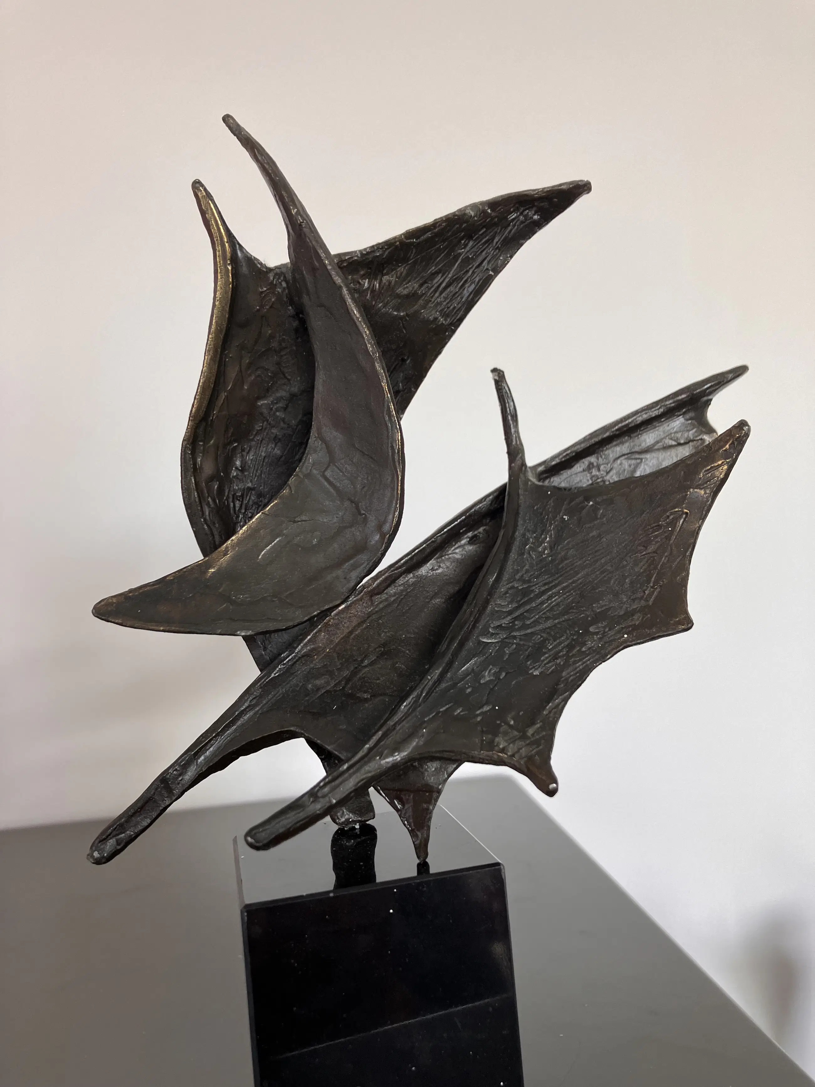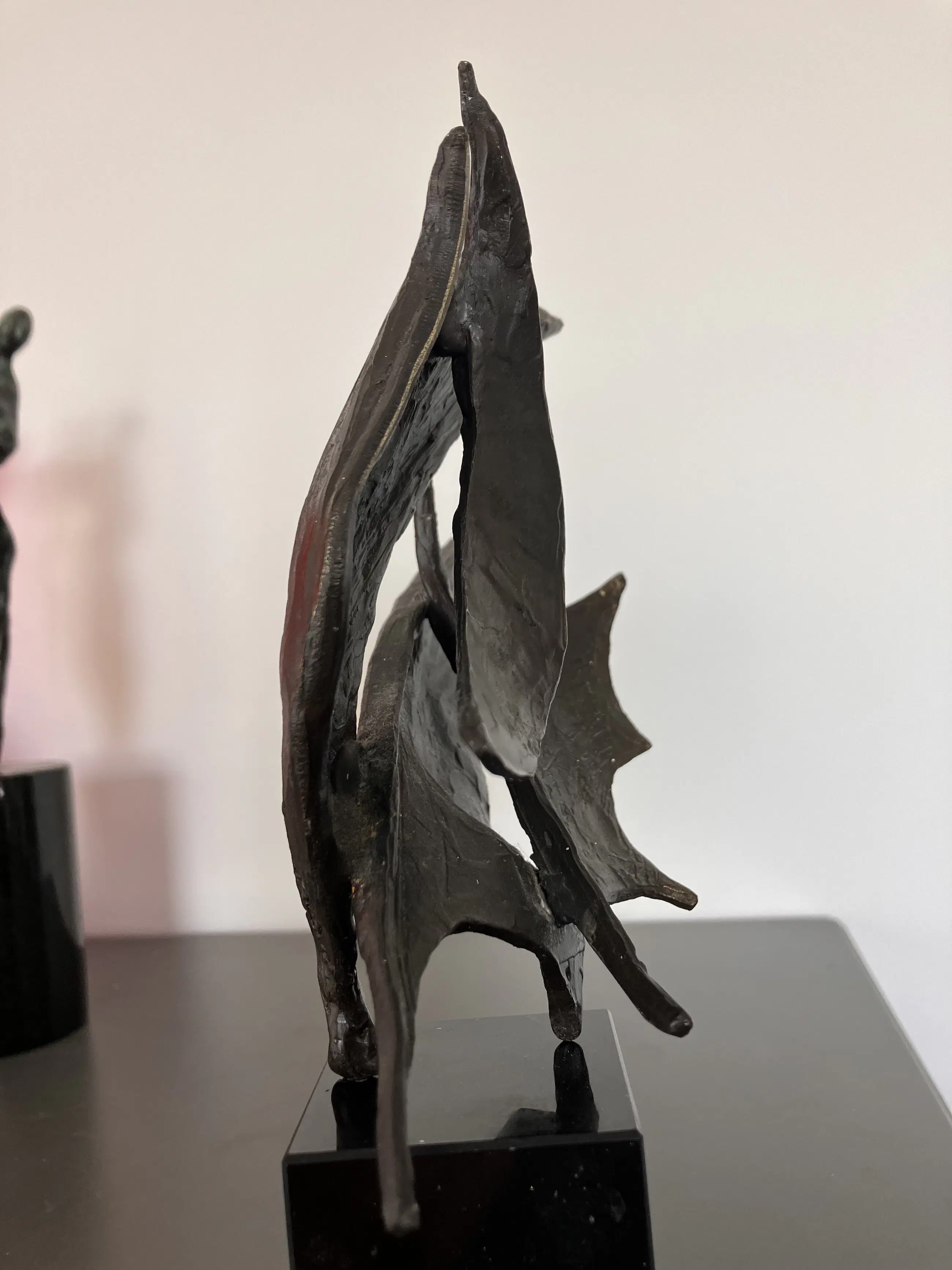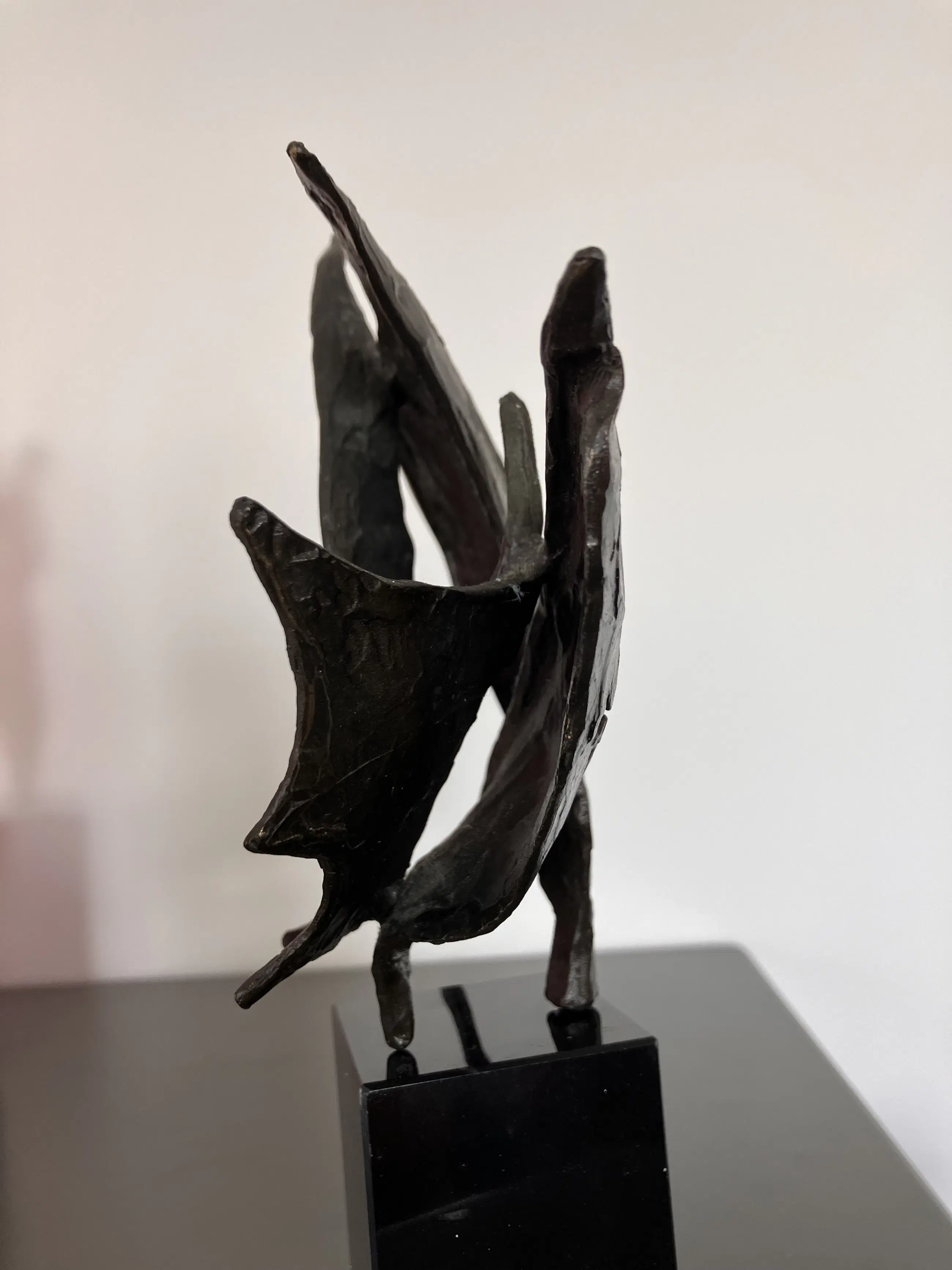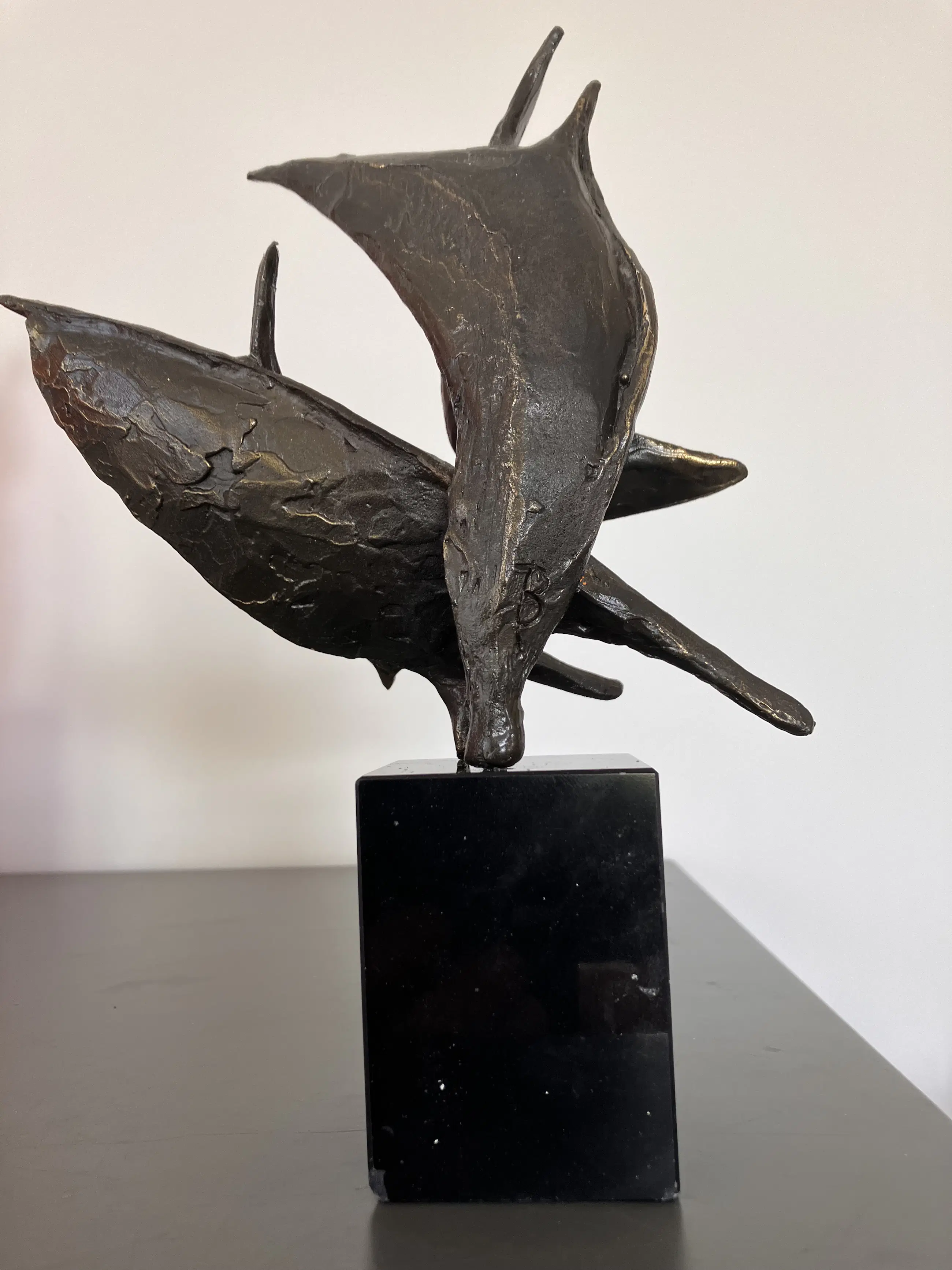 Op zwarte natuurstenen sokkel dit plastisch beeld. Motivatie kunstenares : Onze samenwerking is als de wind in de zeilen we varen koers op succes. "Bij mijn beelden ligt de uiteindelijke concentratie en aandacht in de vorm, maar ook hier spelen energie en levenslust een grote rol in beweging en dynamiek. Ik werk voornamelijk in brons."