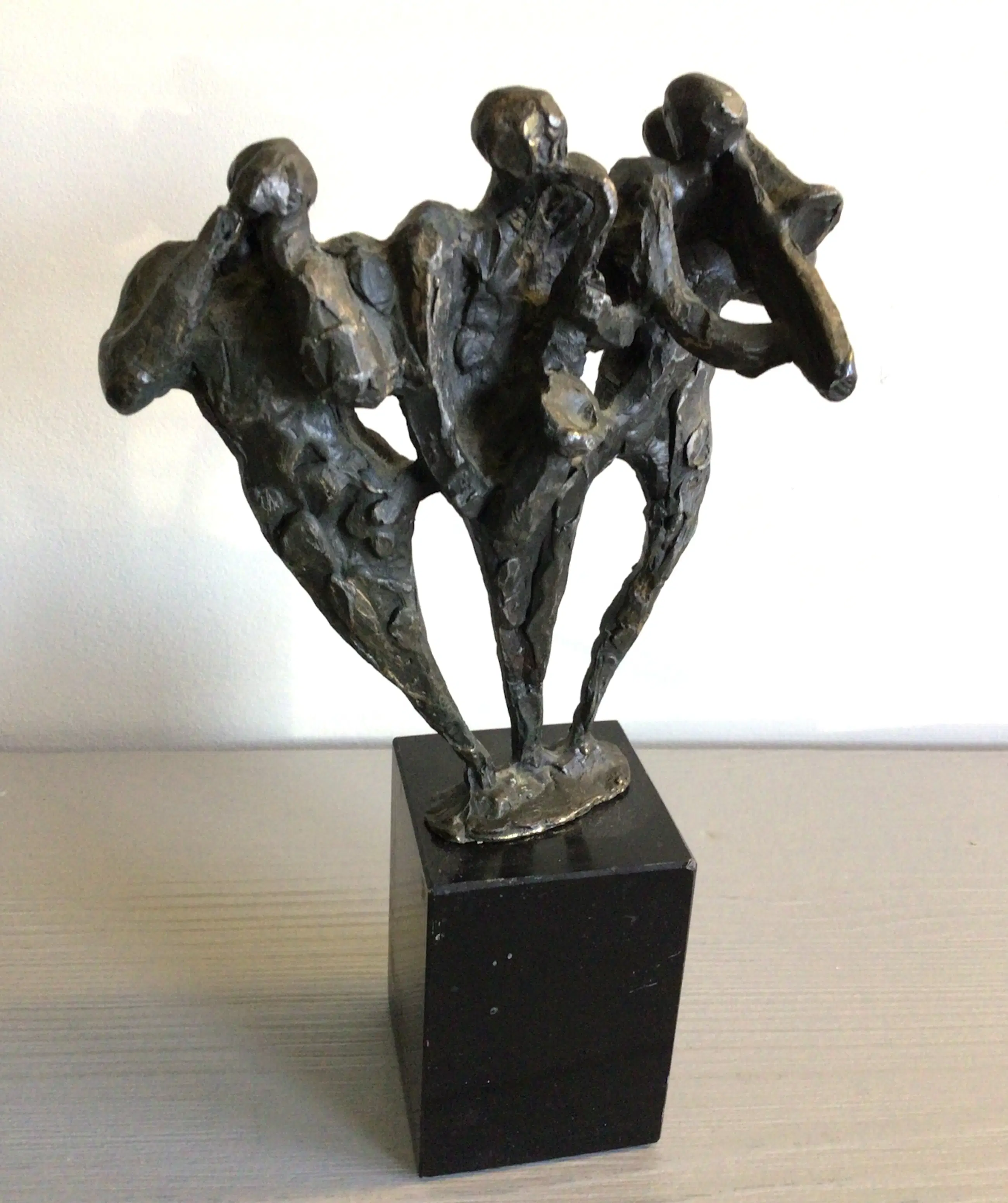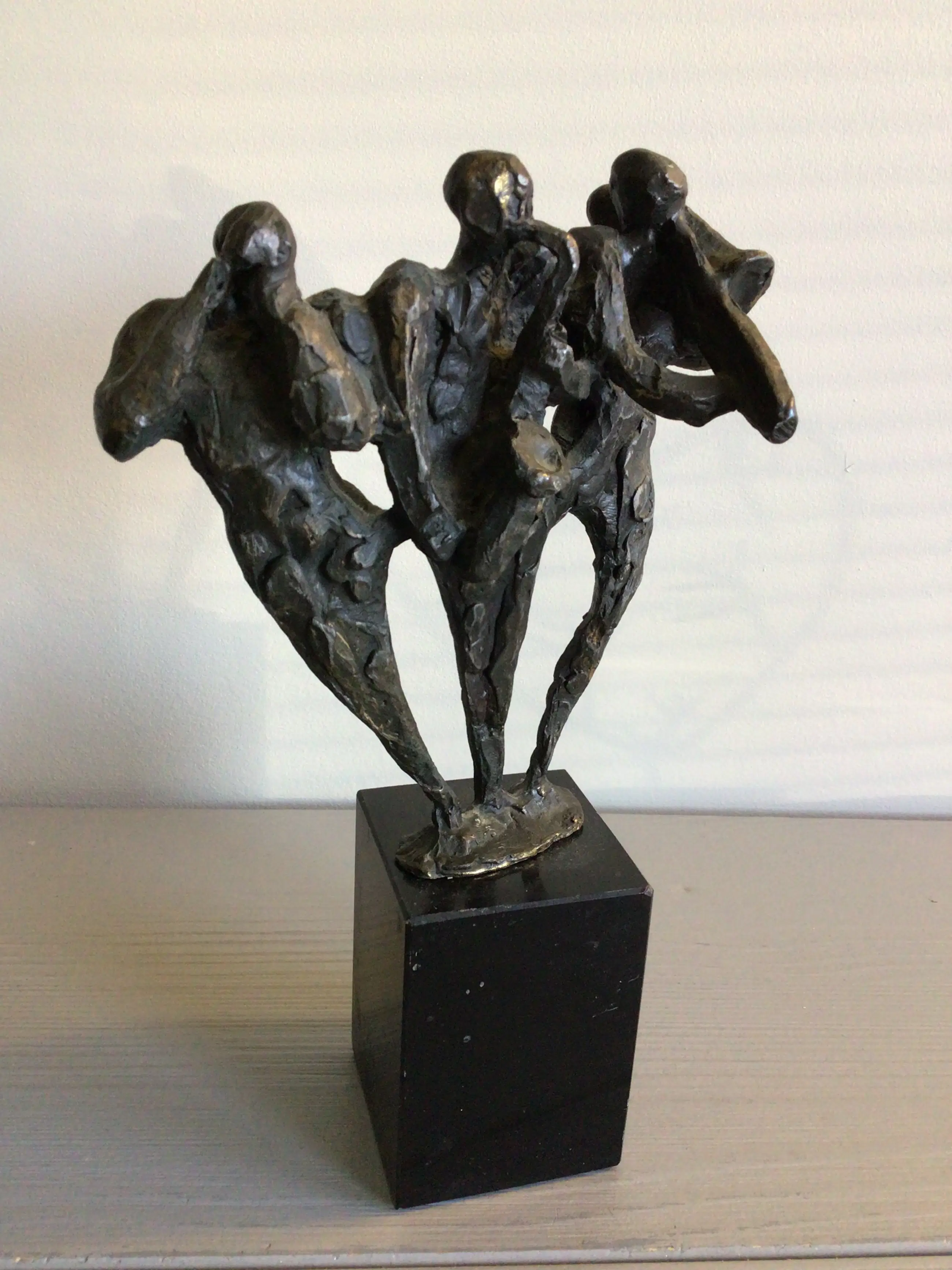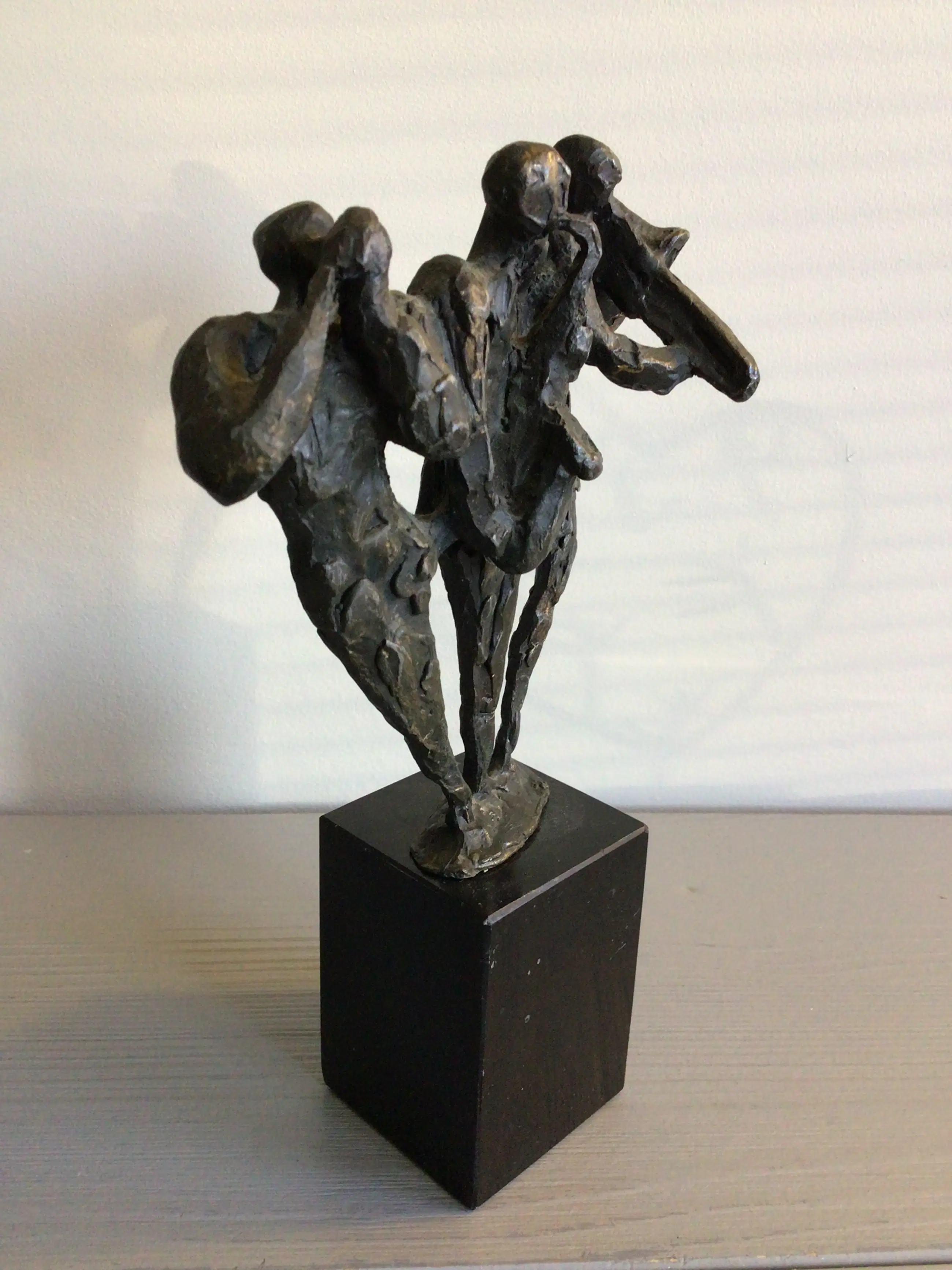 Zeer fraai vormgegeven en muzikaal sculptuur van drie muzikanten, vrolijk spelend op hun blaasinstrumenten . Kunstenares: Bernadette Leijdekkers Het beeld is op de achterzijde gesigneerd: BL Materiaal: brons op fraaie zwart marmeren sokkel Hoogte: 20 cm. NB er mist een stuk van de trompet bij de linker muzikant en een minuscuul chipje van de sokkel. Het beeld verkeert in goede staat en wordt zorgvuldig verpakt verzonden.