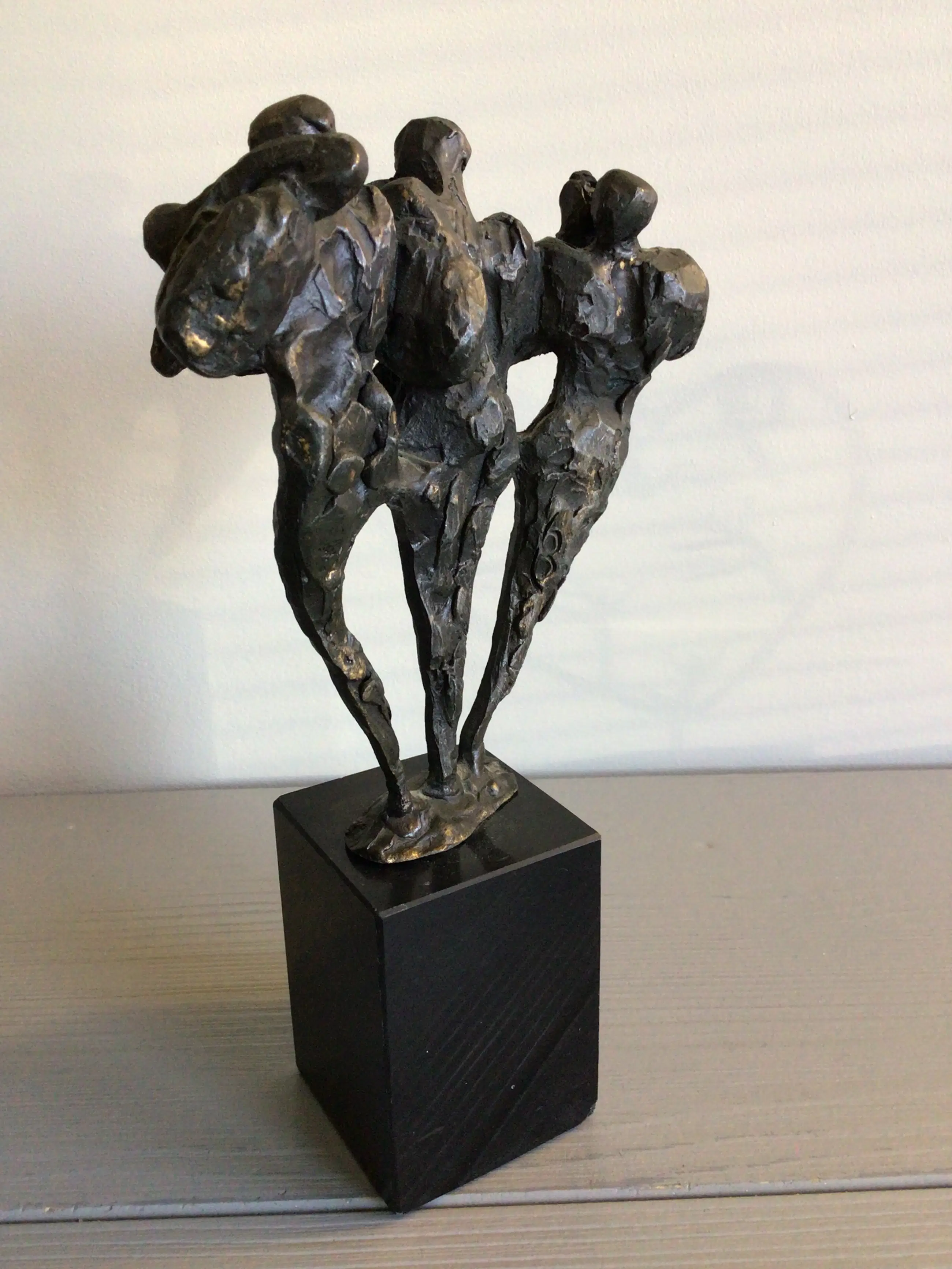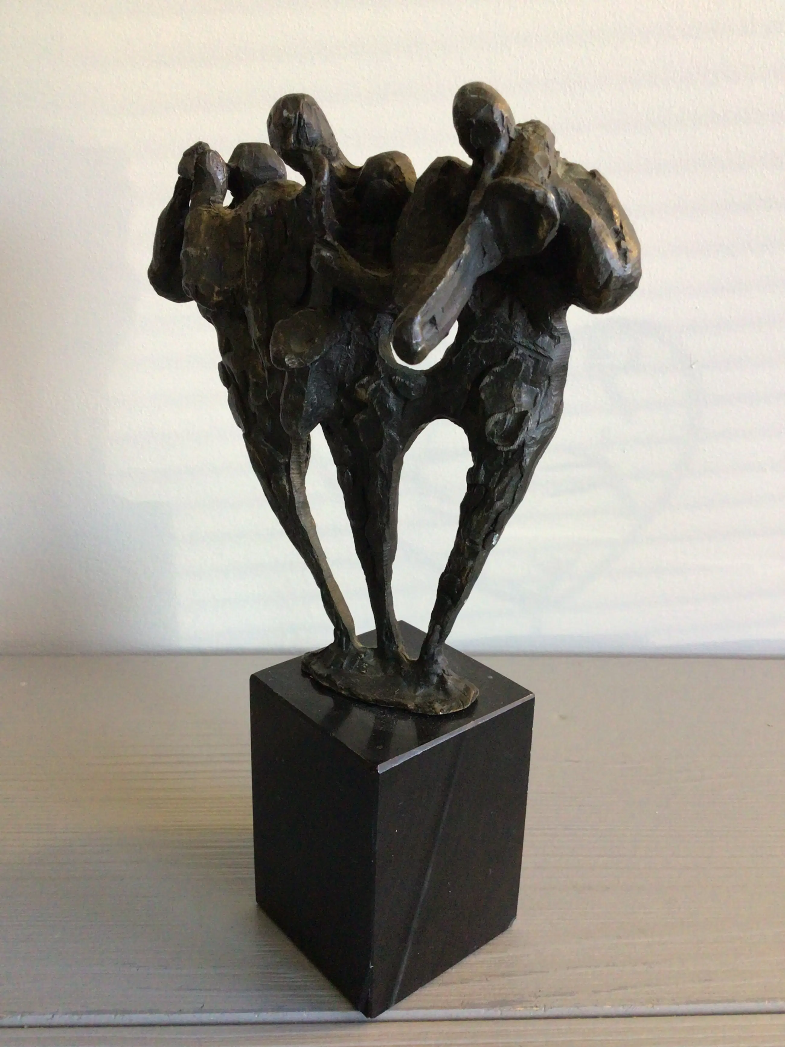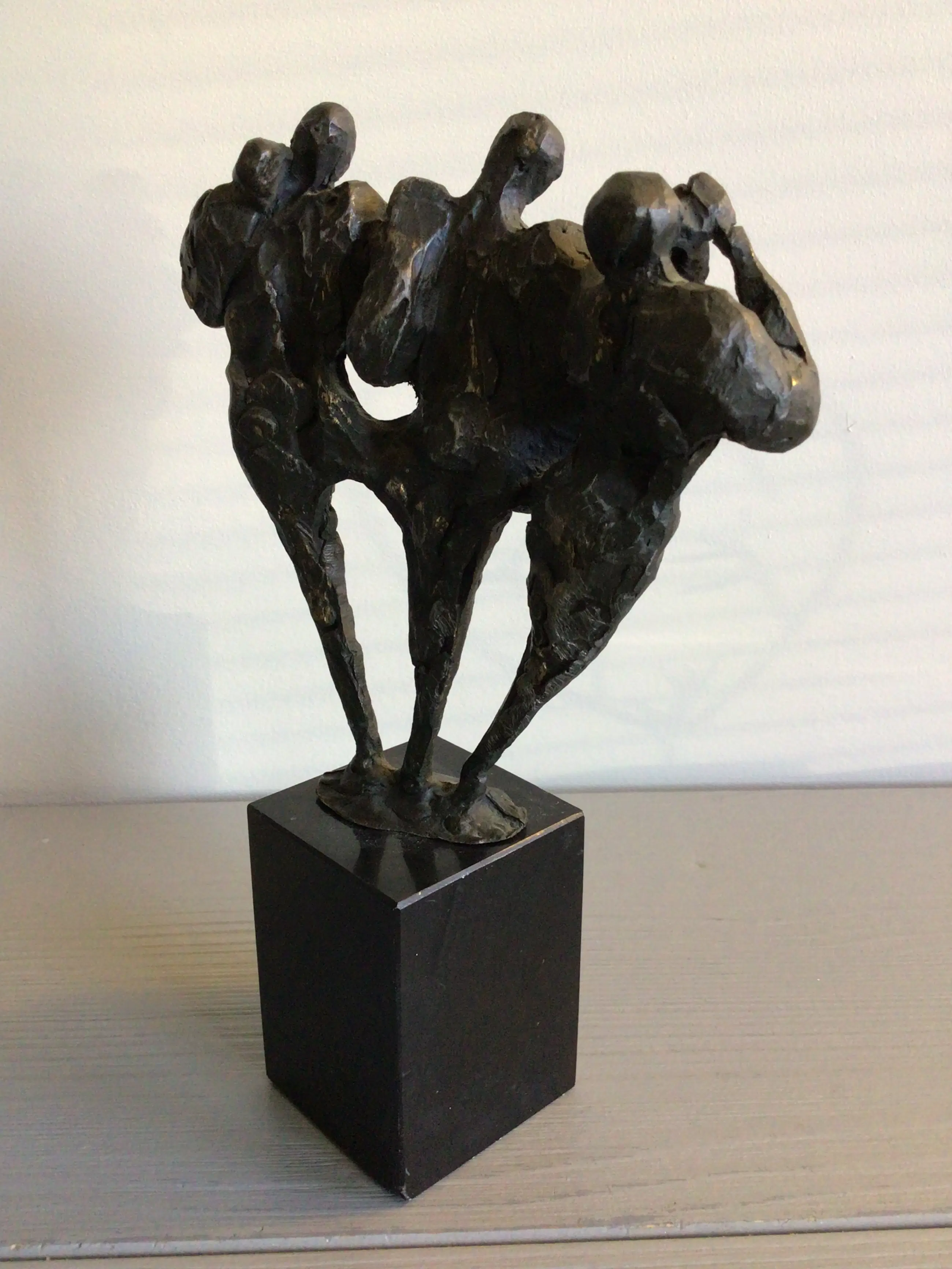 Zeer fraai vormgegeven en muzikaal sculptuur van drie muzikanten, vrolijk spelend op hun blaasinstrumenten . Kunstenares: Bernadette Leijdekkers Het beeld is op de achterzijde gesigneerd: BL Materiaal: brons op fraaie zwart marmeren sokkel Hoogte: 20 cm. NB er mist een stuk van de trompet bij de linker muzikant en een minuscuul chipje van de sokkel. Het beeld verkeert in goede staat en wordt zorgvuldig verpakt verzonden.