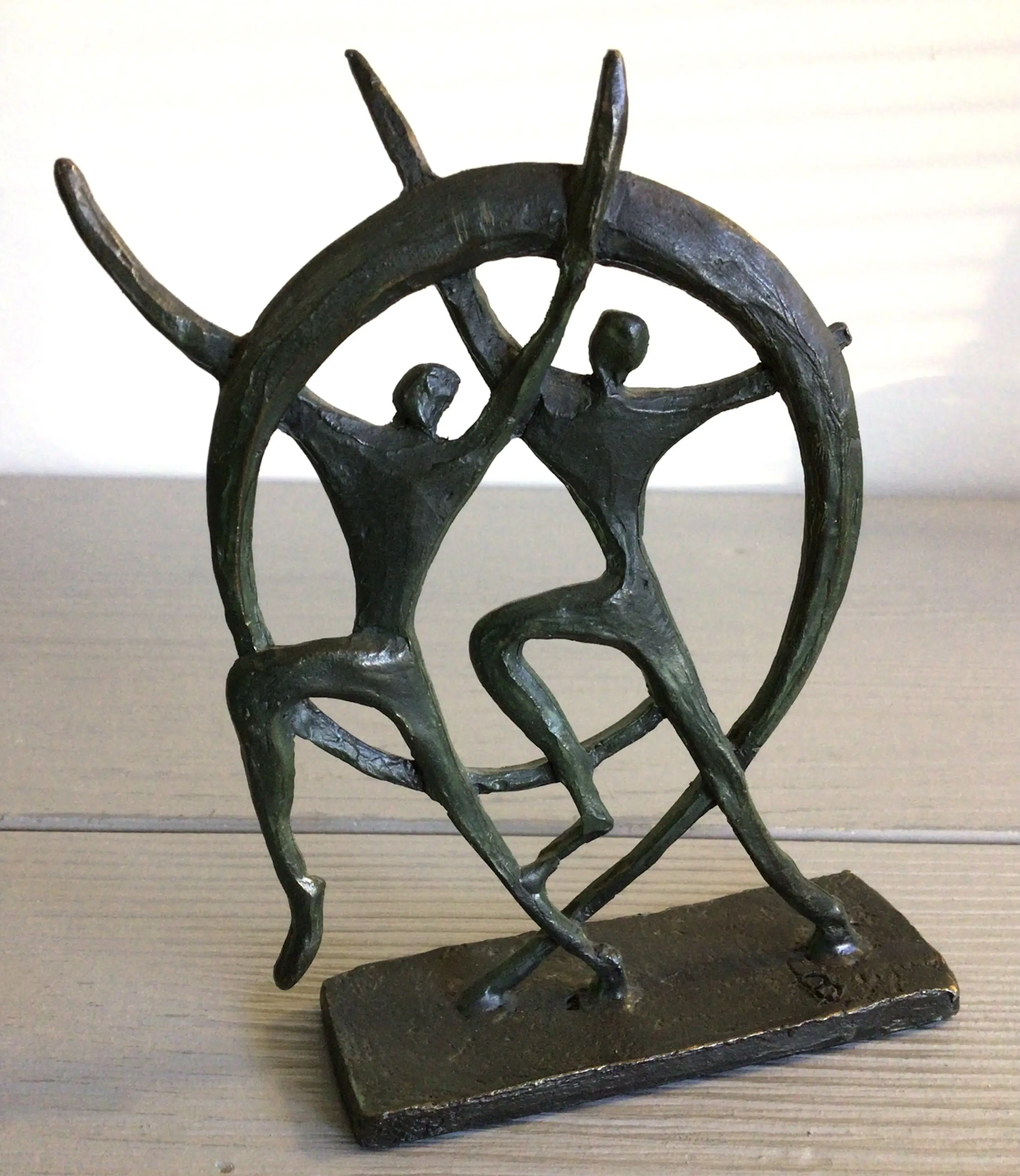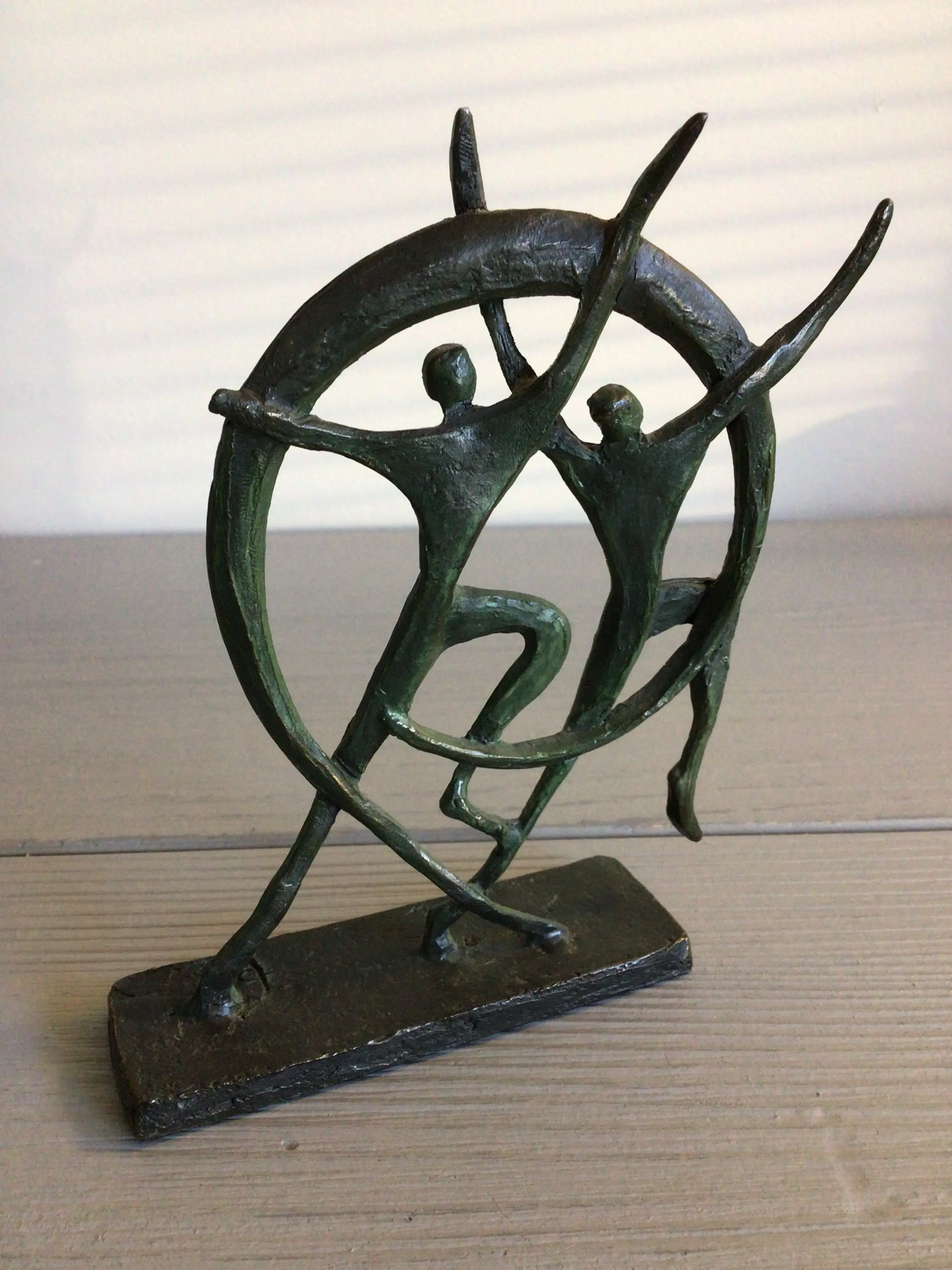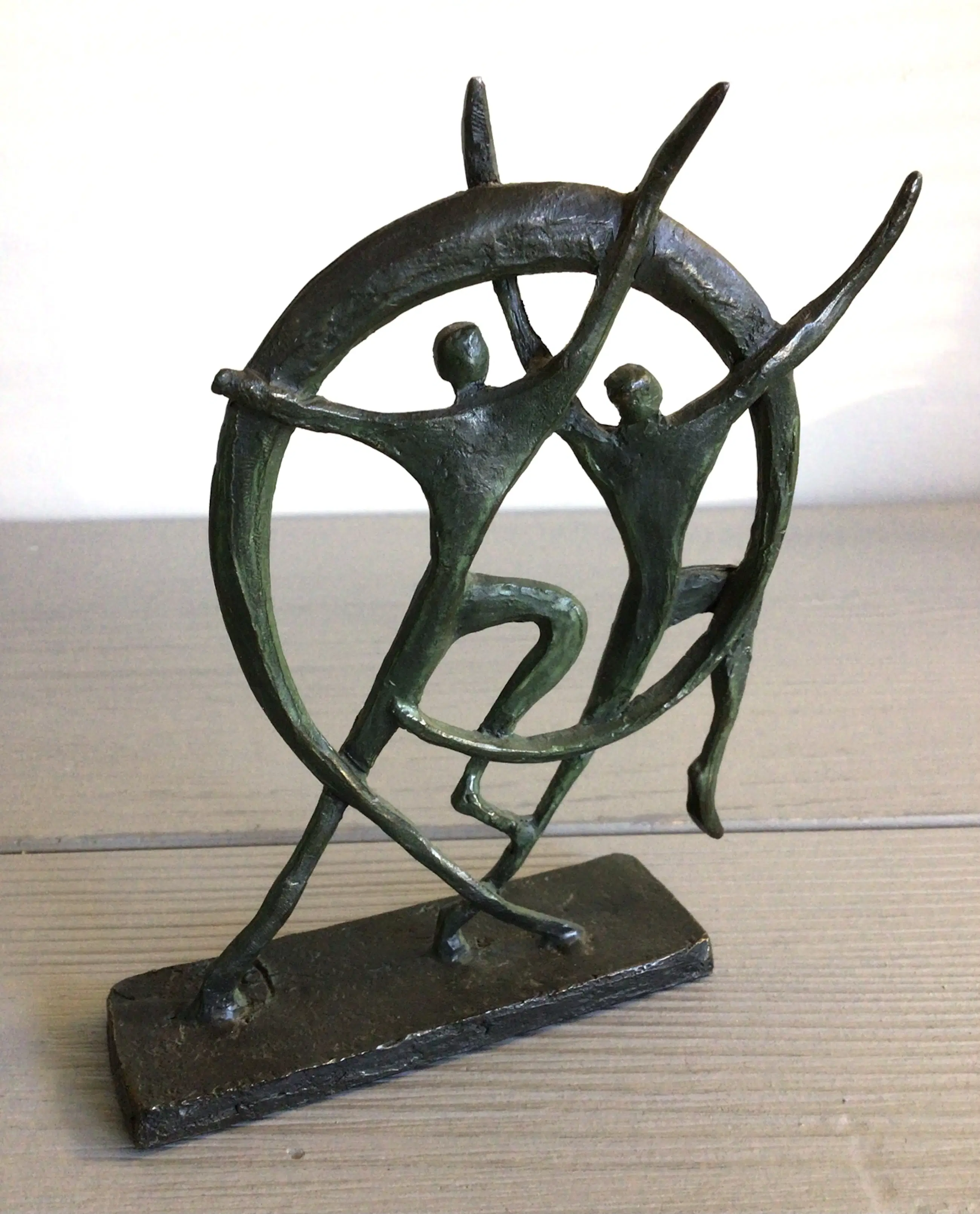 Zeer fraai dynamisch sculptuur met de toepasselijke titel “ In beweging “ Kunstenares: Bernadette Leijdekkers Het beeld is op de achterzijde gesigneerd: BL Materiaal: brons Het beeld verkeert in goede staat en wordt zorgvuldig verpakt verzonden.