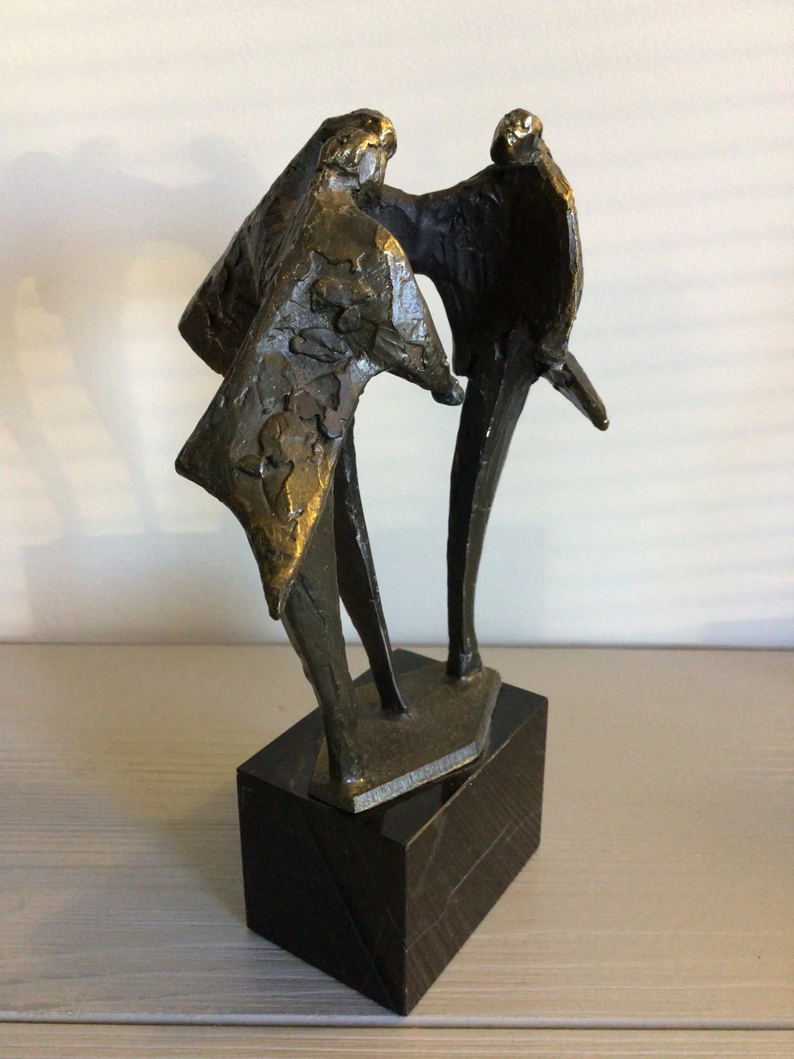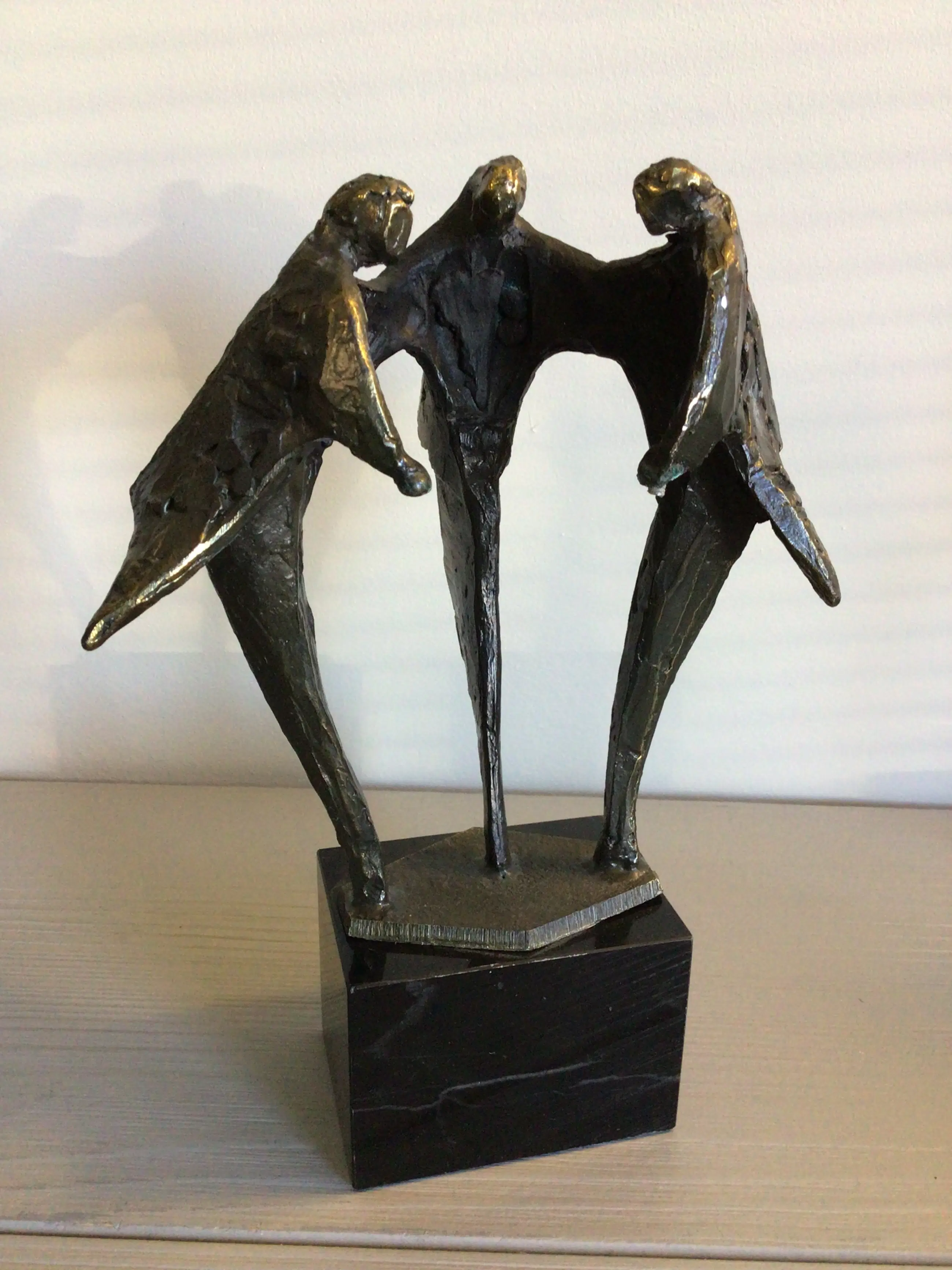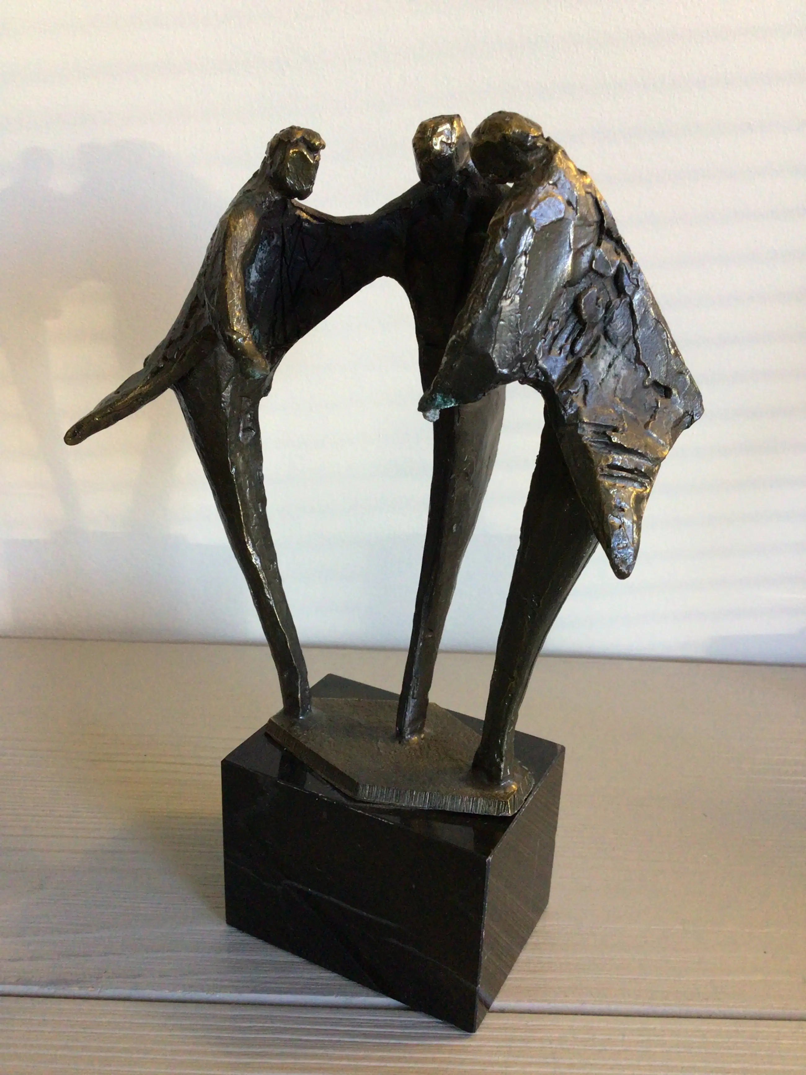 Zeer fraai vormgegeven sculptuur van drie mensfiguren samen in overleg. Kunstenares: Bernadette Leijdekkers Het beeld is gesigneerd: BL Materiaal: brons op marmeren sokkel. Hoogte: 19 cm Het bijbehorende zilveren plateau mist bij dit sculptuur maar het is daardoor niet minder fraai ! Het beeld verkeert in goede staat en wordt zorgvuldig verpakt verzonden.