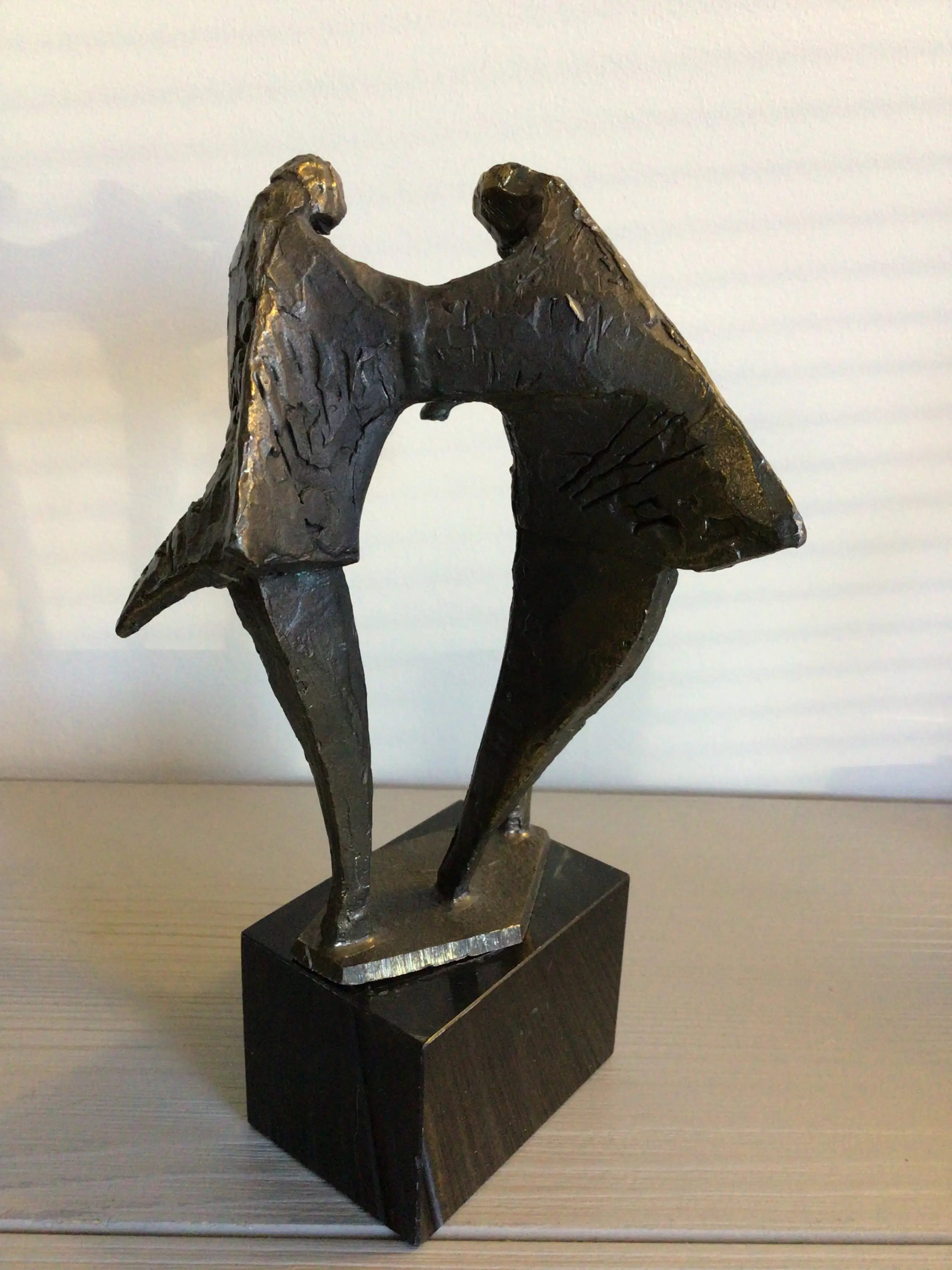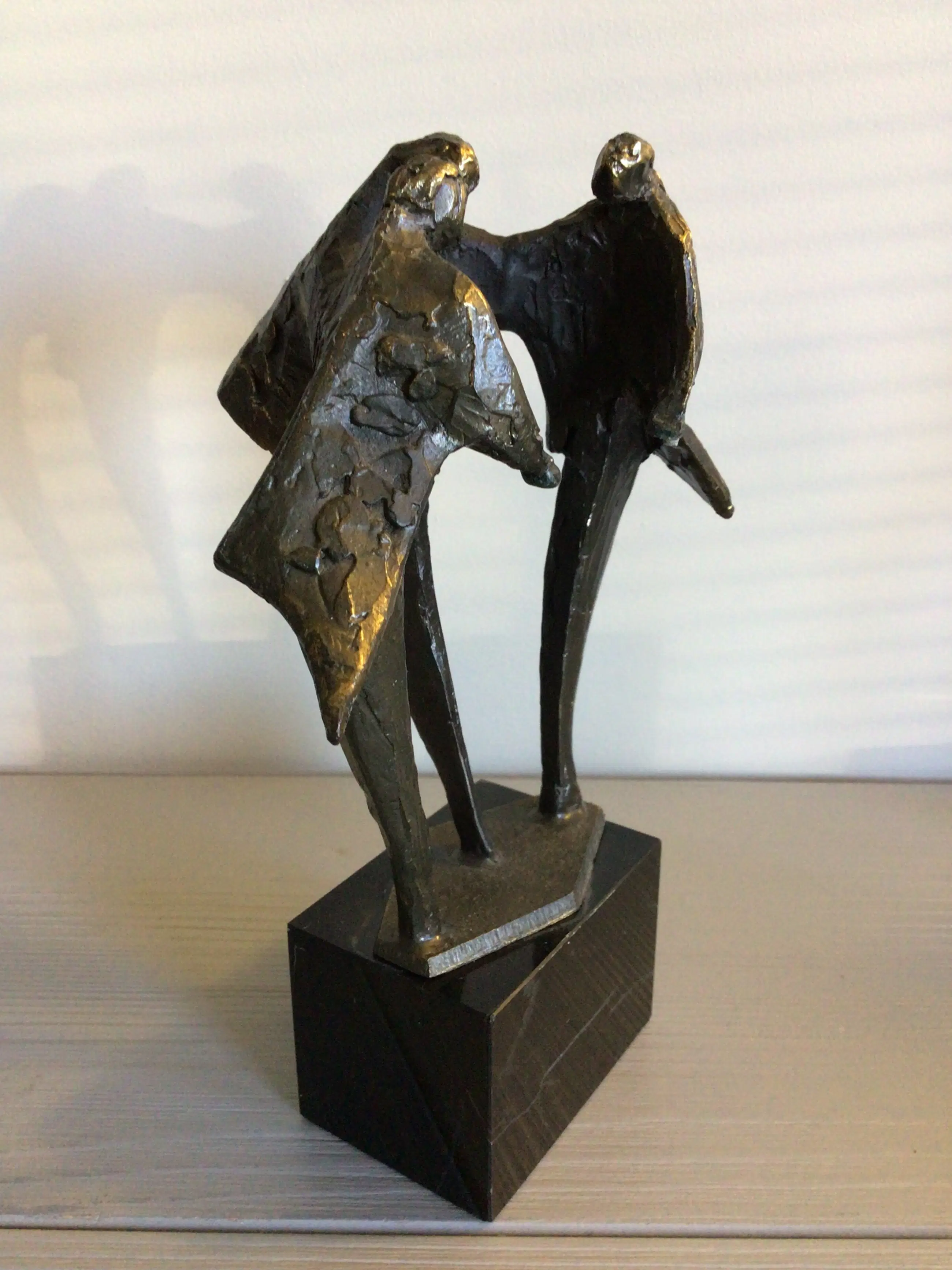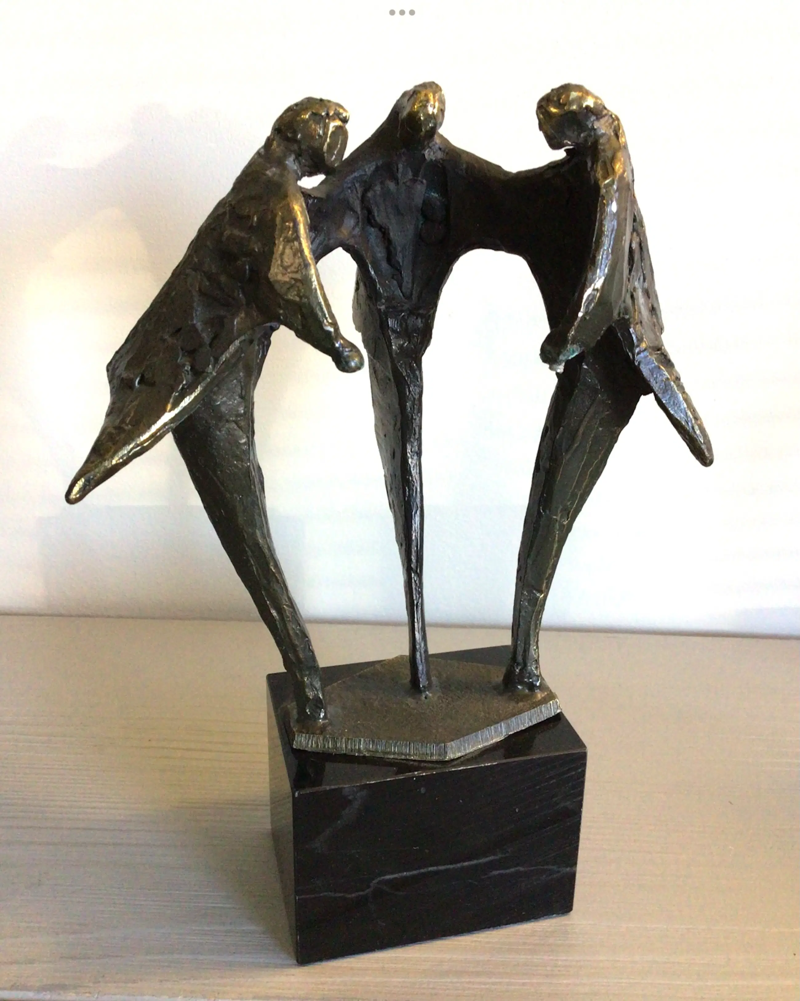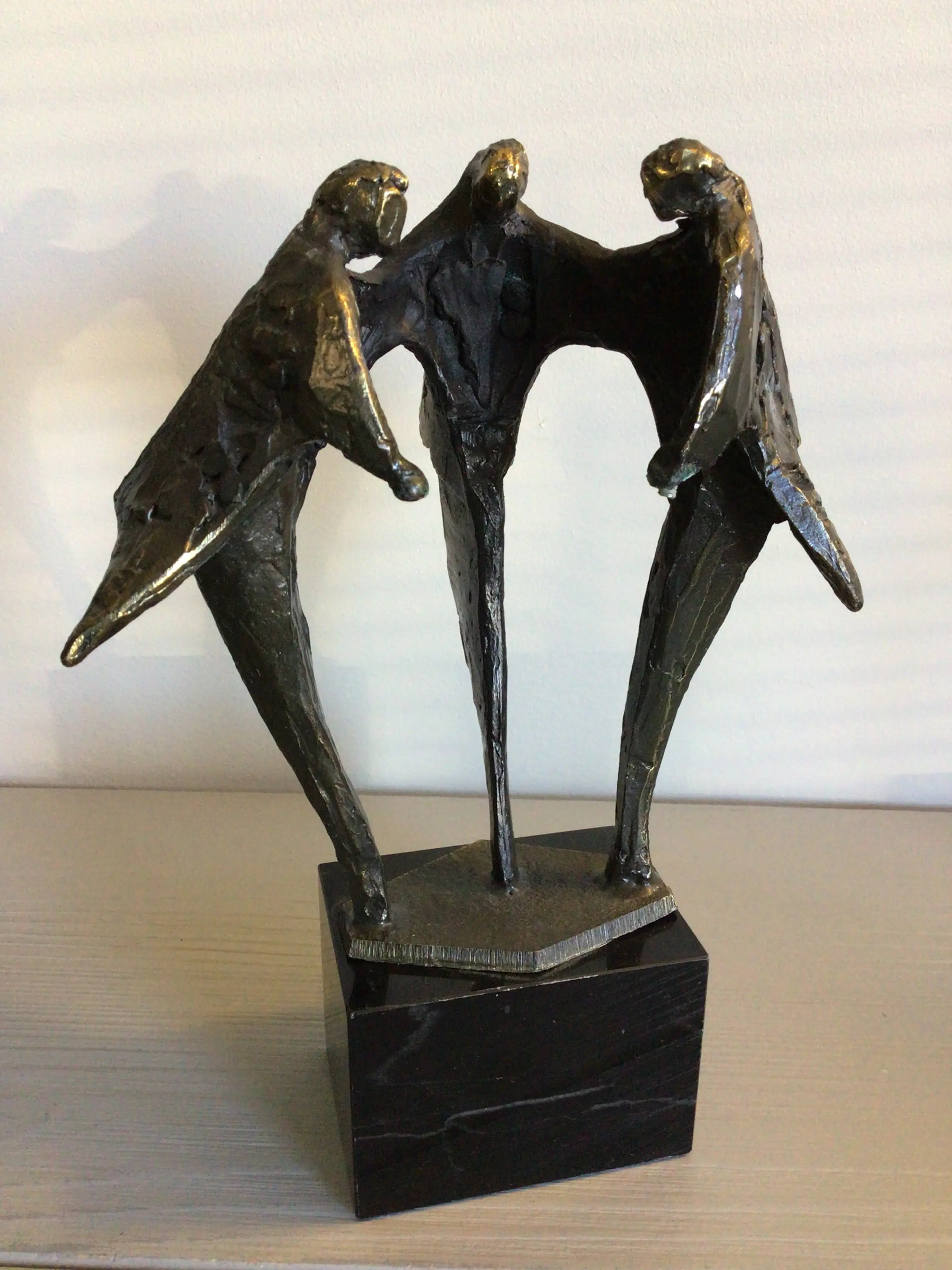 Zeer fraai vormgegeven sculptuur van drie mensfiguren samen in overleg. Kunstenares: Bernadette Leijdekkers Het beeld is gesigneerd: BL Materiaal: brons op marmeren sokkel. Hoogte: 19 cm Het bijbehorende zilveren plateau mist bij dit sculptuur maar het is daardoor niet minder fraai ! Het beeld verkeert in goede staat en wordt zorgvuldig verpakt verzonden.