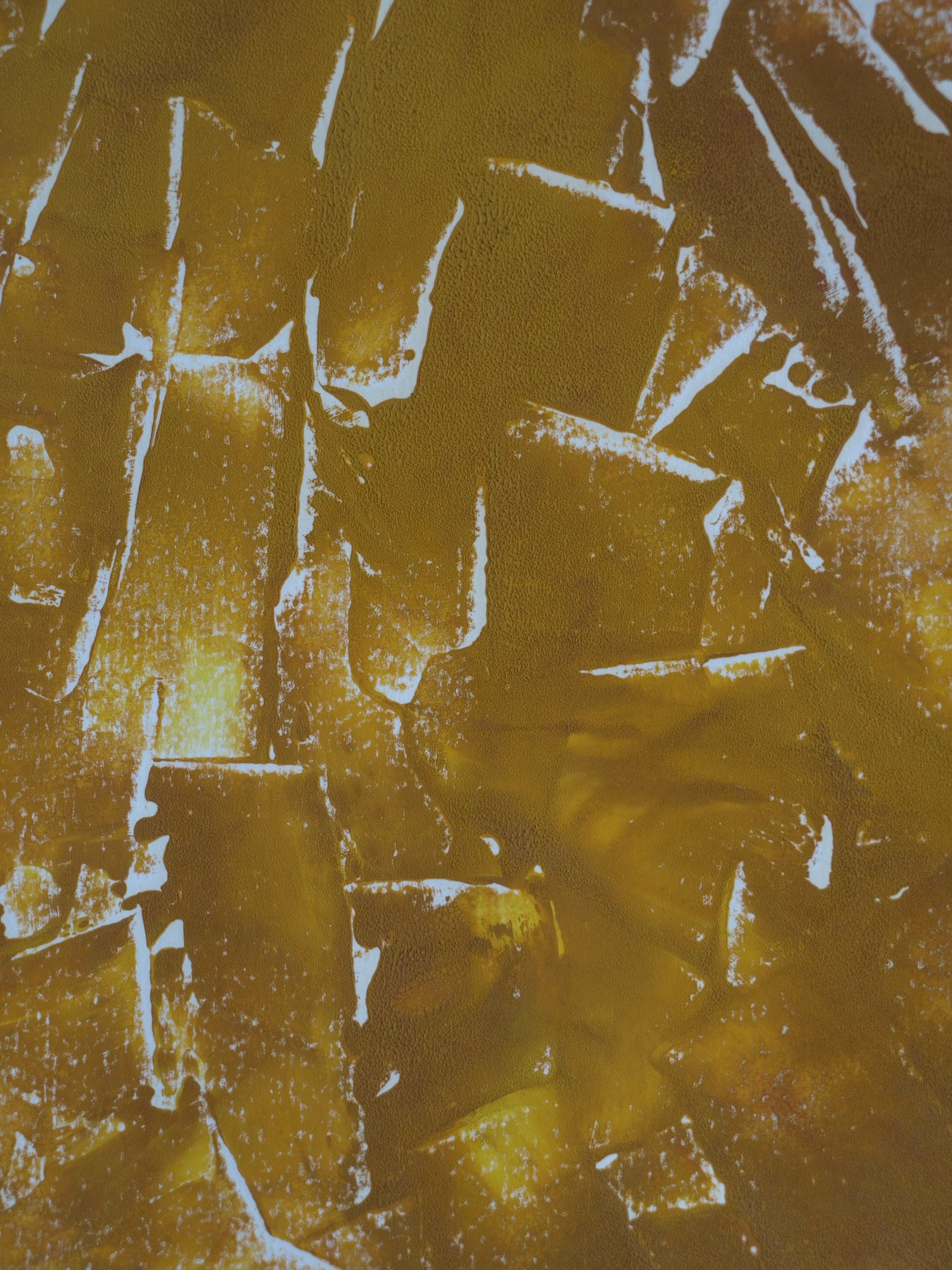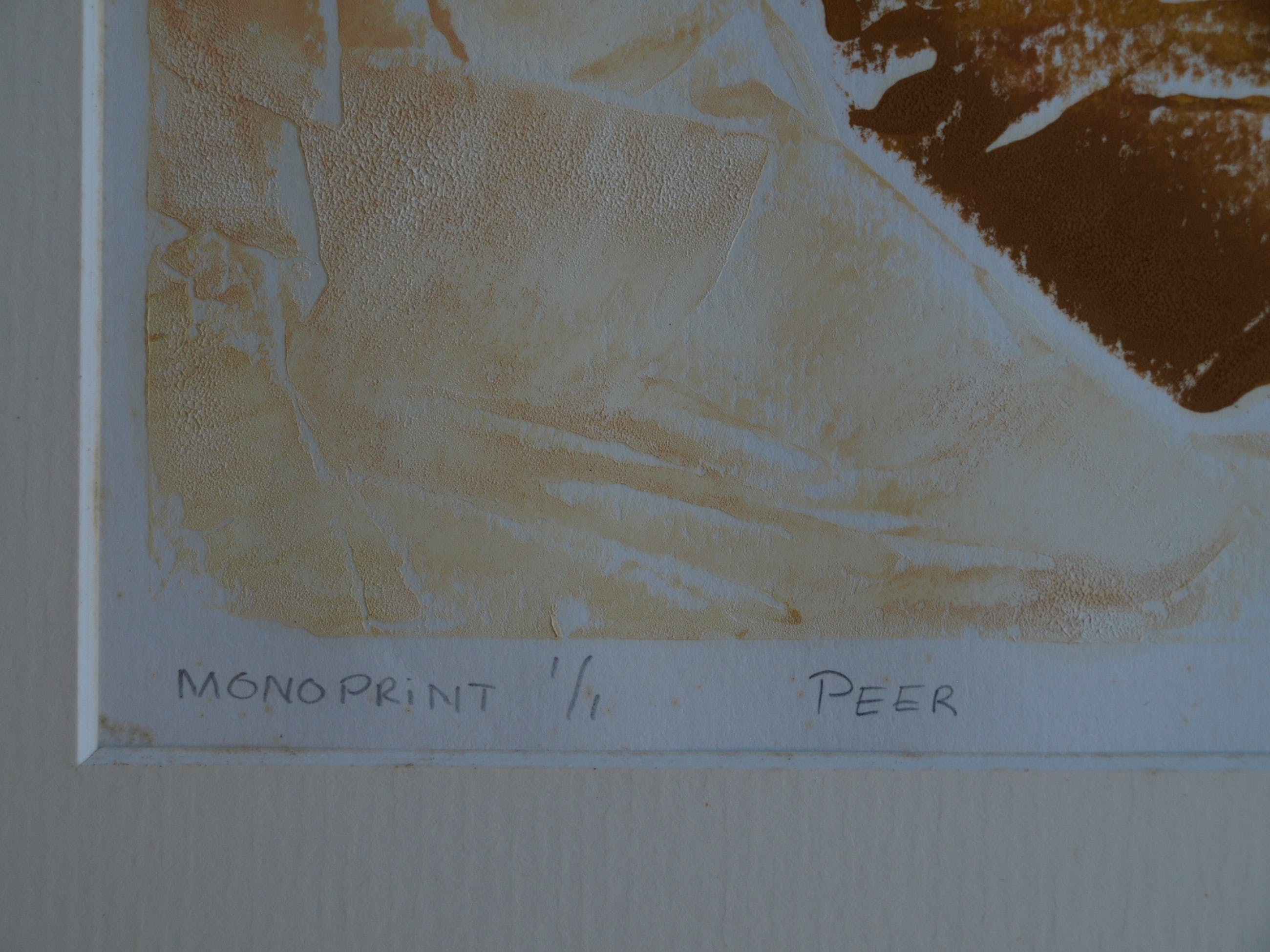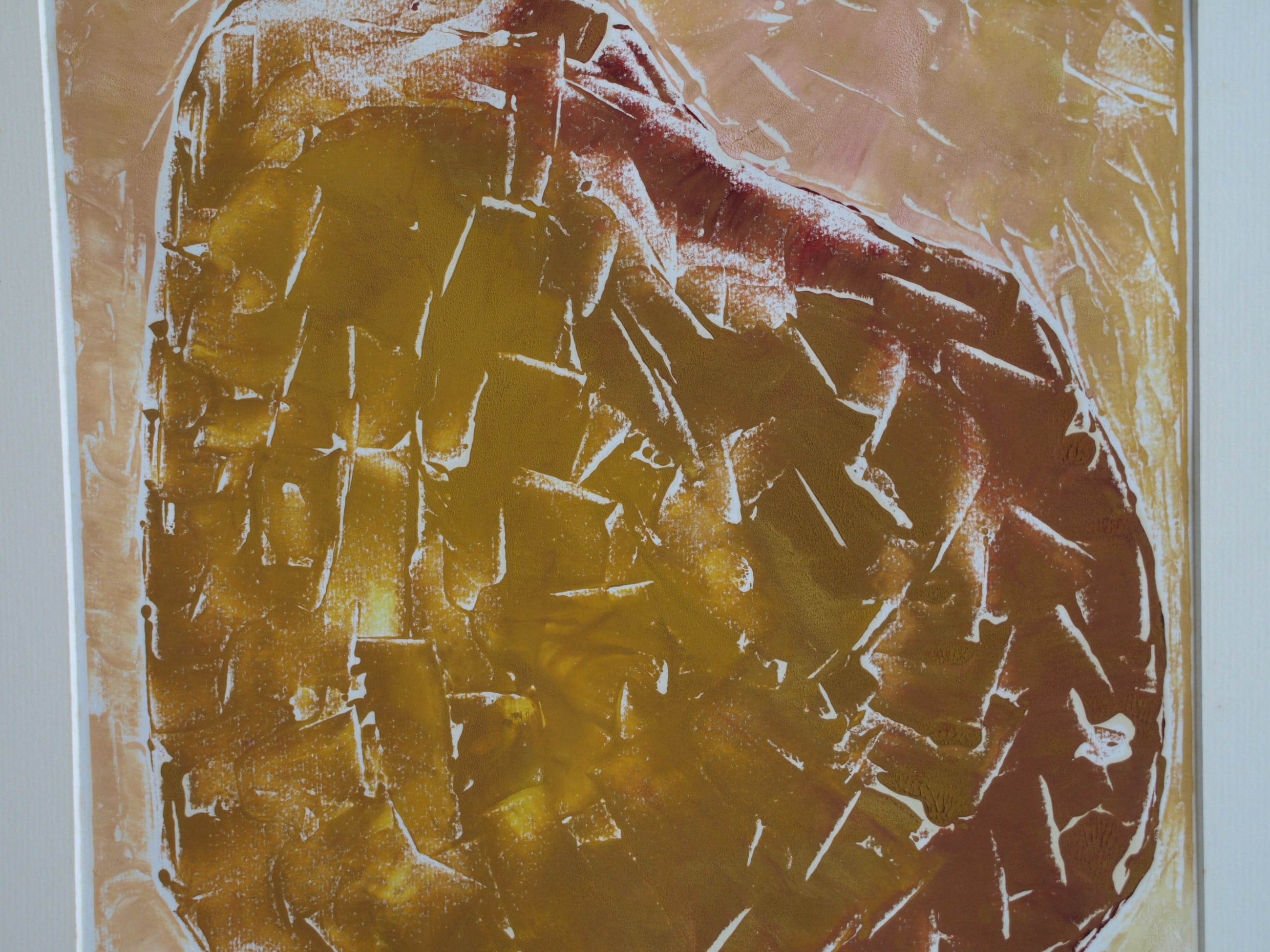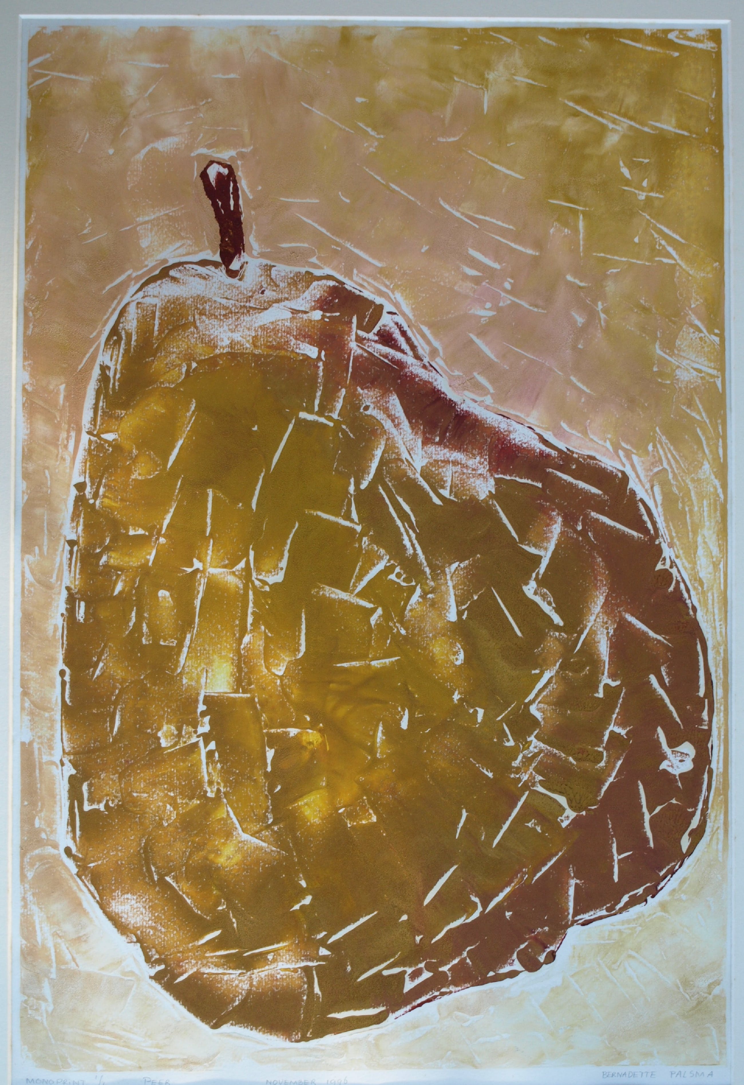 Een grote monoprint van de Nederlandse kunstenares Bernadette Palsma (1963), met een voorstelling van een peer.