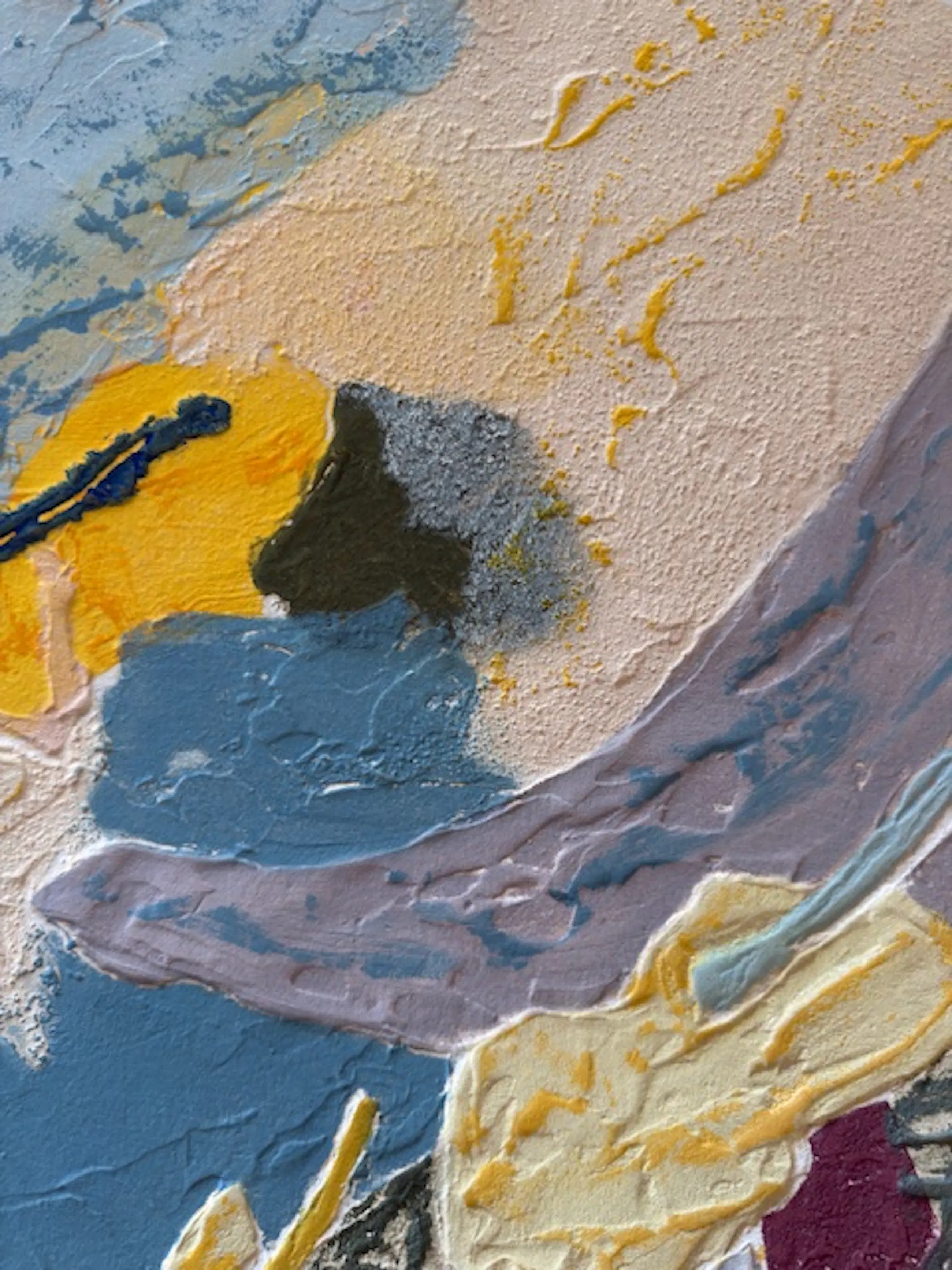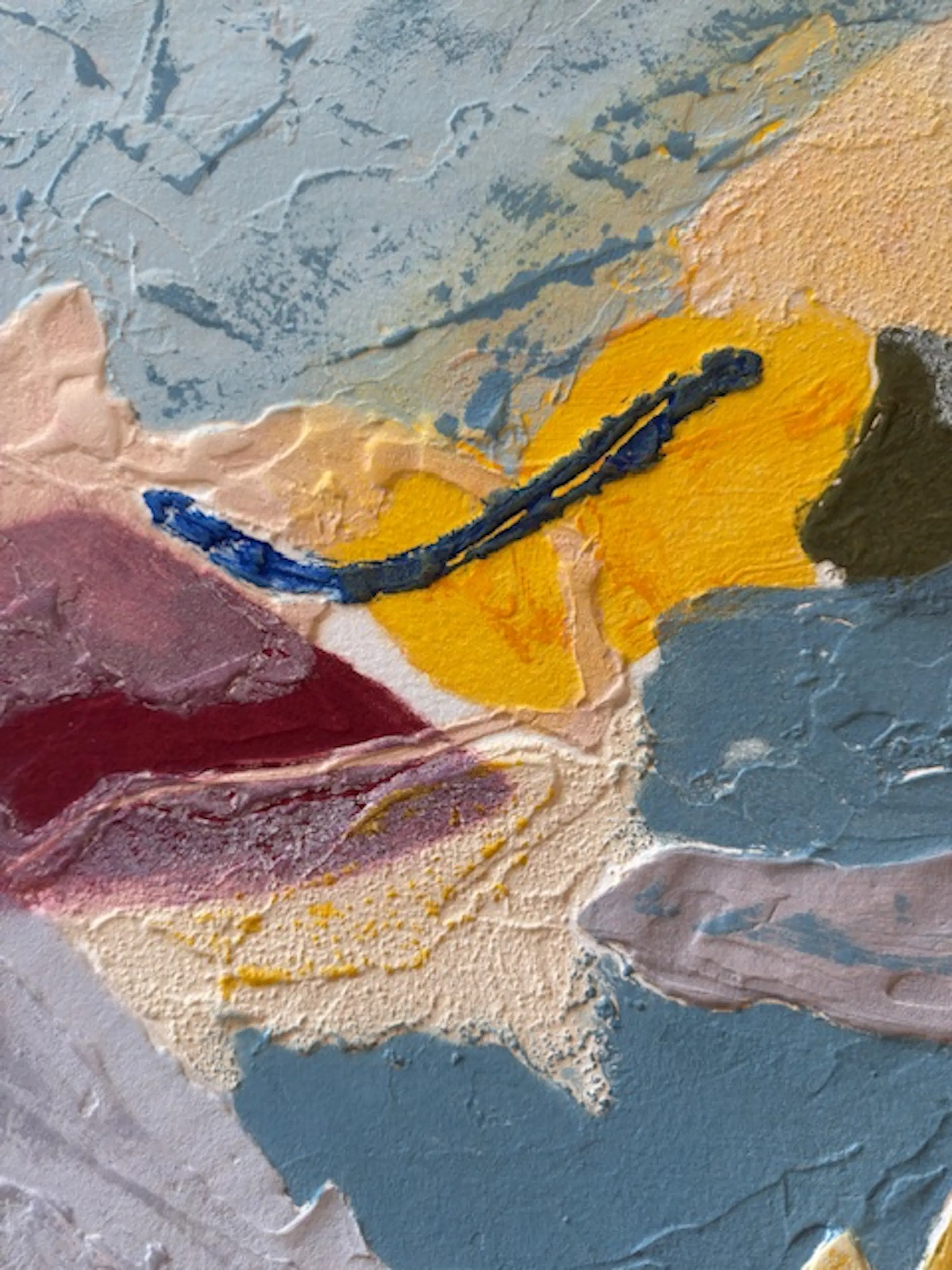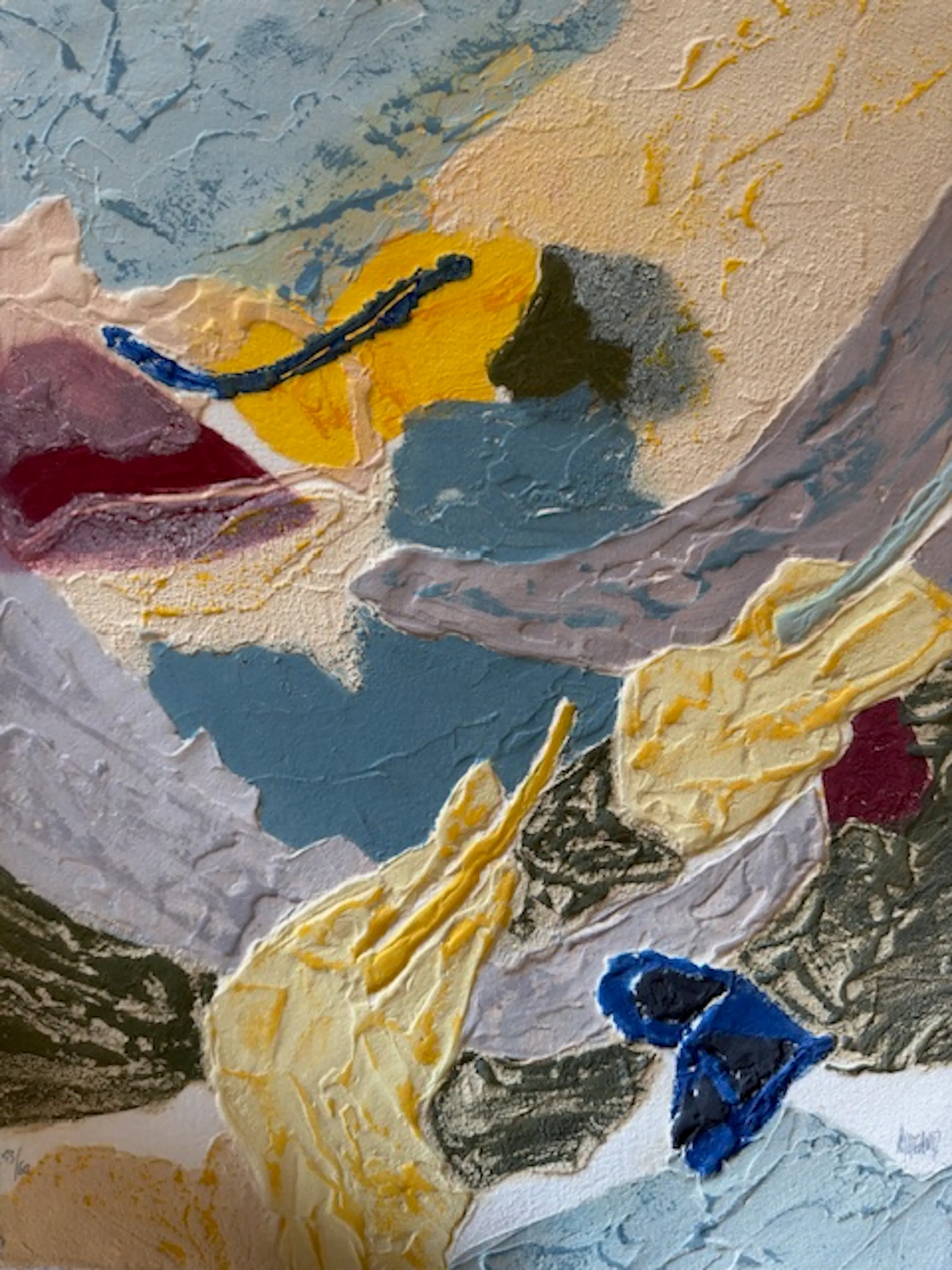 Groot abstract werk, rijk aan texturen en materialen, met zachte tinten oker, blauw, grijs en roze. Carborundum (siliciumcarbide) is een schuurpoeder dat met lijm op een metalen plaat is aangebracht, waardoor een korrelig en onregelmatig oppervlak ontstaat.