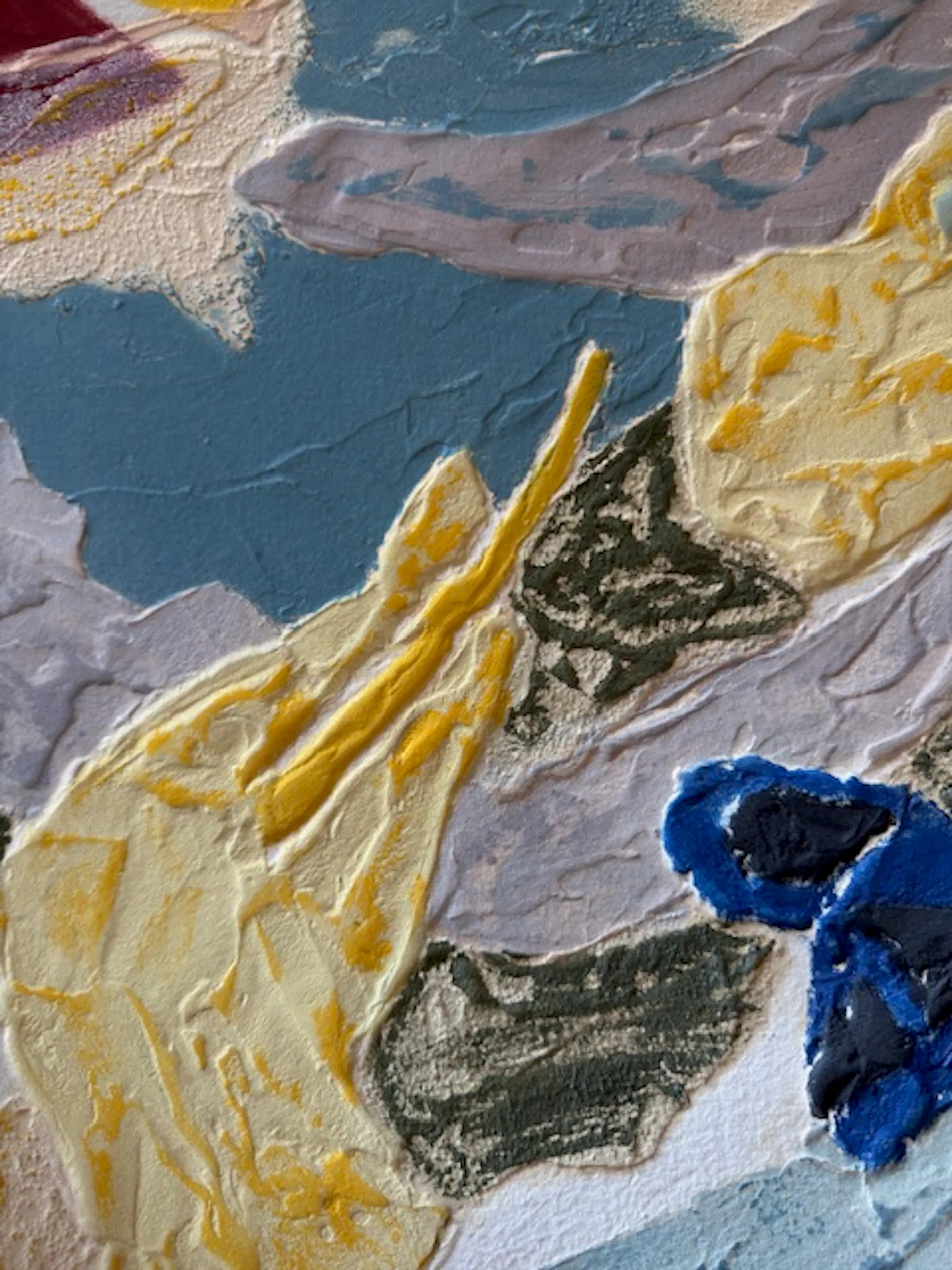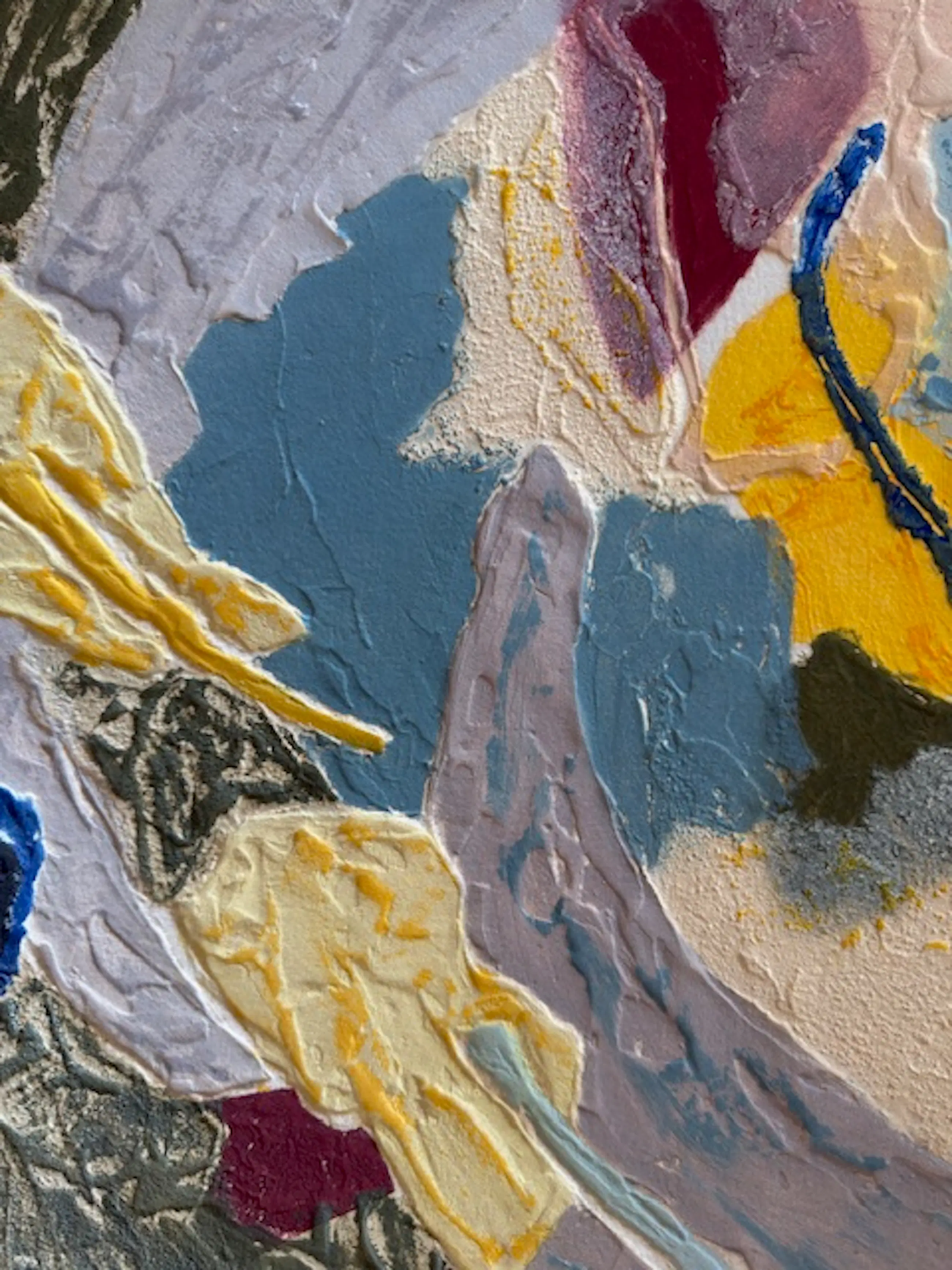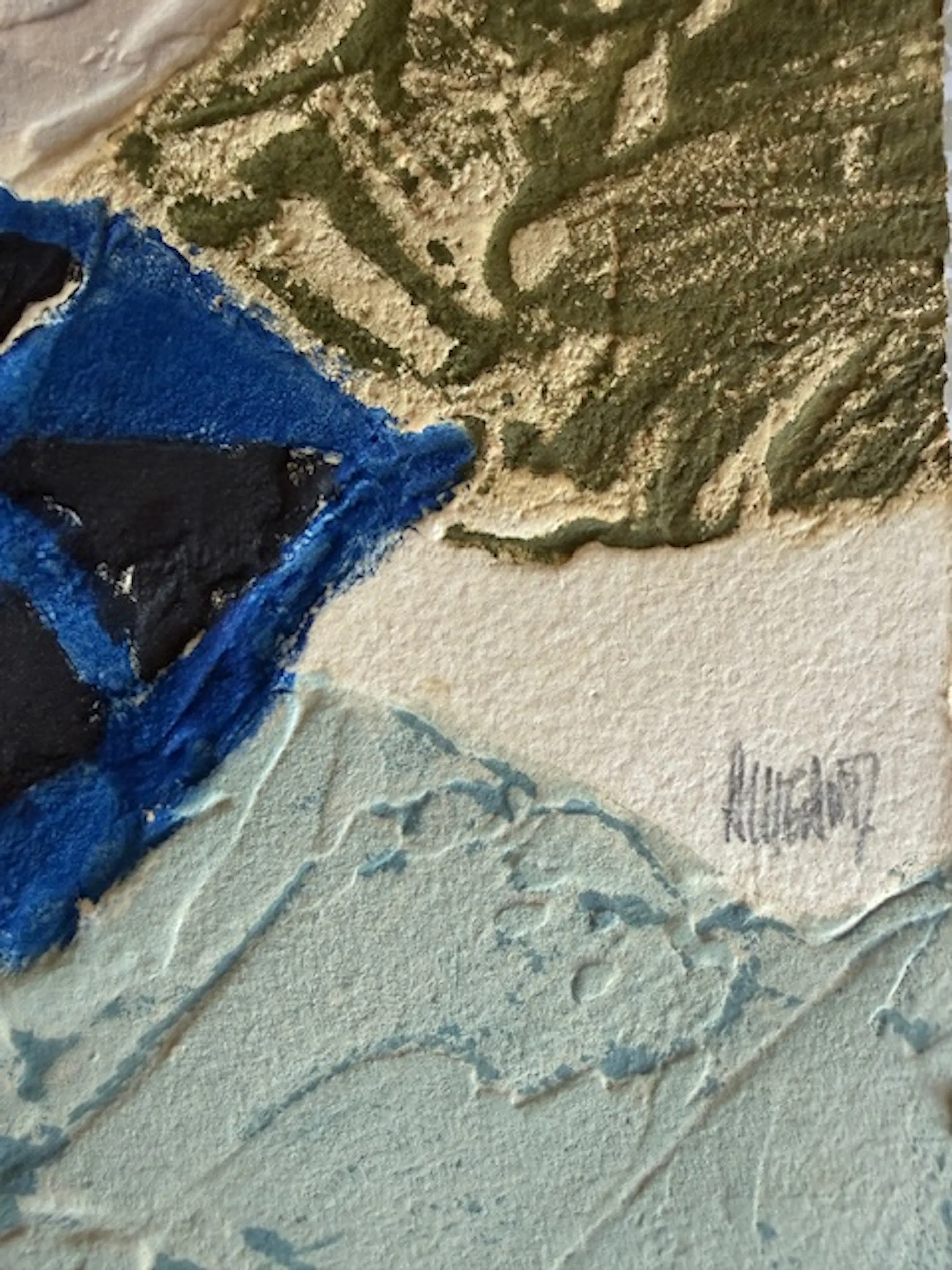 Groot abstract werk, rijk aan texturen en materialen, met zachte tinten oker, blauw, grijs en roze. Carborundum (siliciumcarbide) is een schuurpoeder dat met lijm op een metalen plaat is aangebracht, waardoor een korrelig en onregelmatig oppervlak ontstaat.