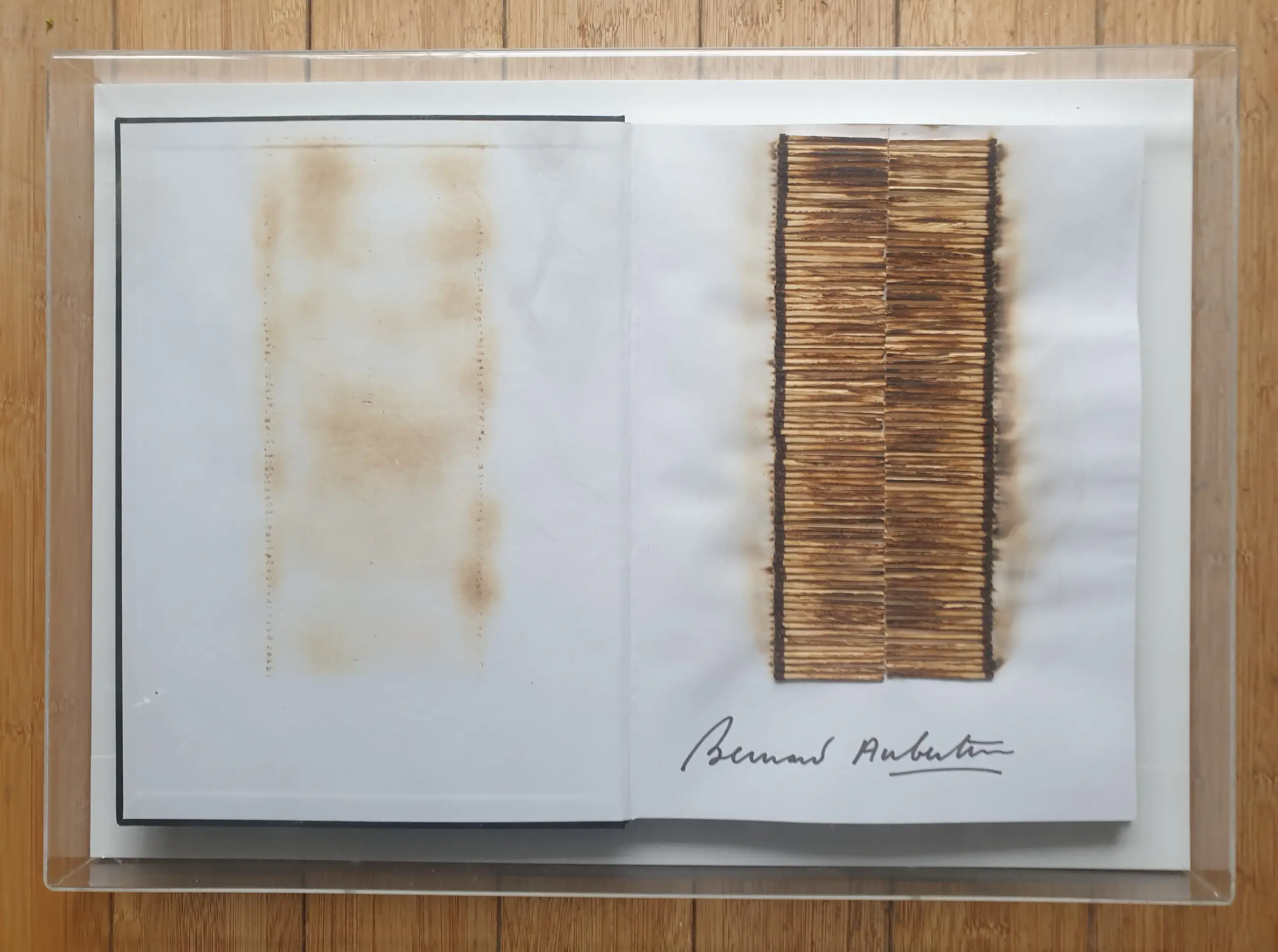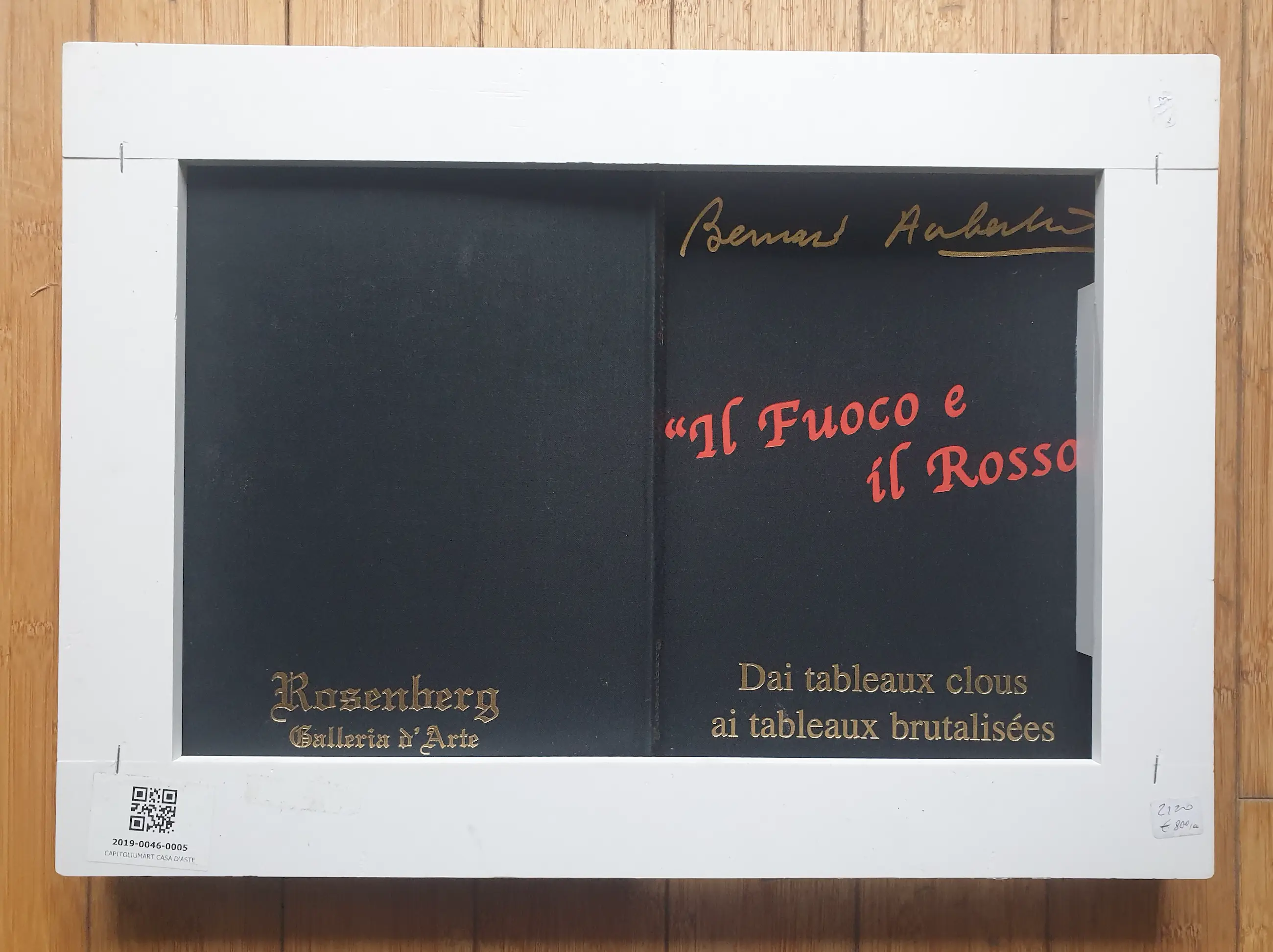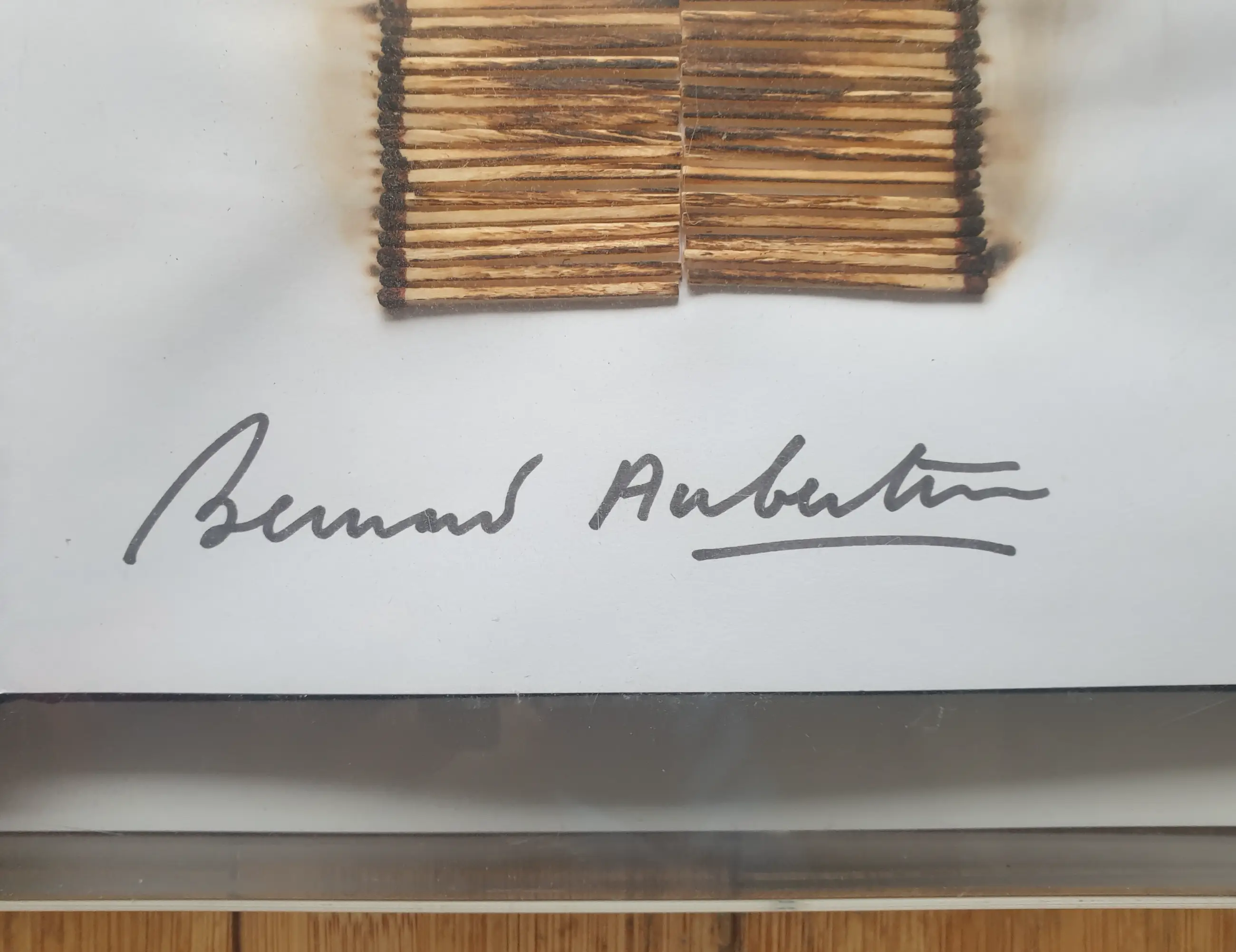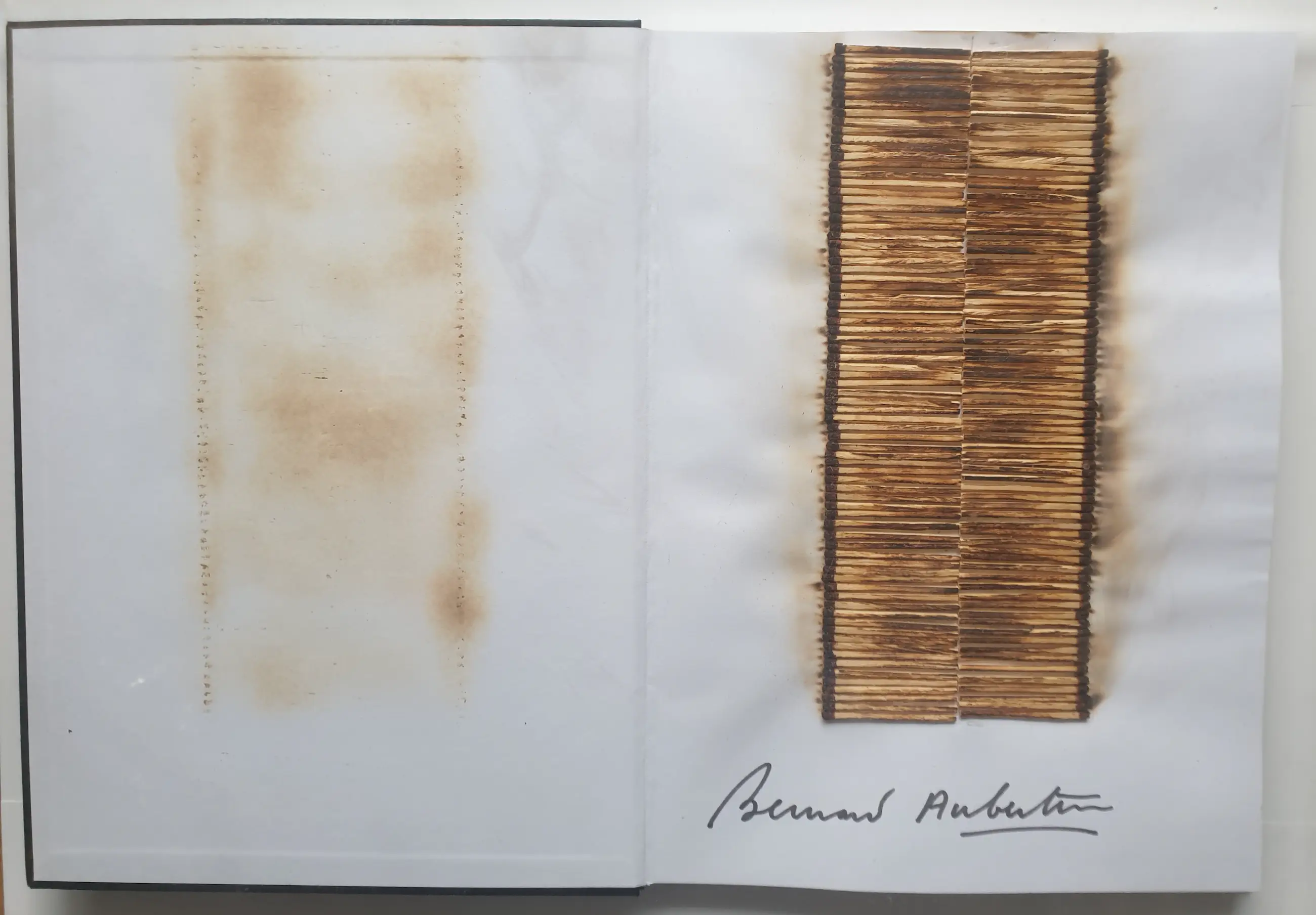 Typisch werk van Zero en "Vuur" Kunstenaar Bernard Aubertin. Het werk is gemaakt in een catalogus van de huisgalerie; "Galleria d' Arte Rosenberg". Deze galerie uit Rome beheert en archiveert al het werk van Aubertin. Dit werk is uitgevoerd met 2 rijen lucifers in een rechte lijn, die zijn ontstoken. Het boek is in een plexiglazen bak (met wat lichte gebruikssporen) ingelijst. Formaat inclusief lijst is 36 x 51 x 4 cm. Het opengeslagen boek meet 31 x 44 cm. Het werk kan worden opgehaald (voorkeur) , gebracht of worden verzonden.