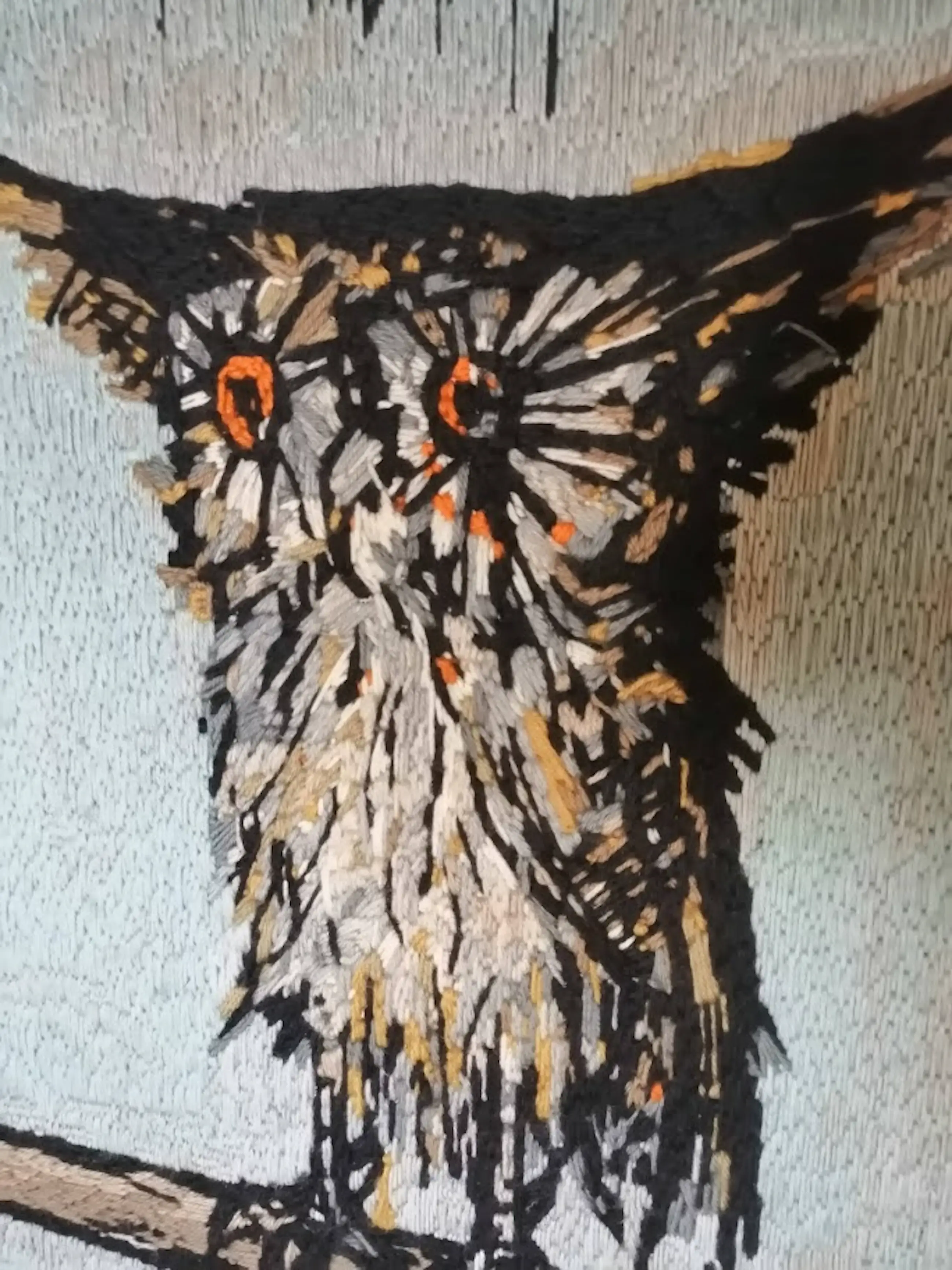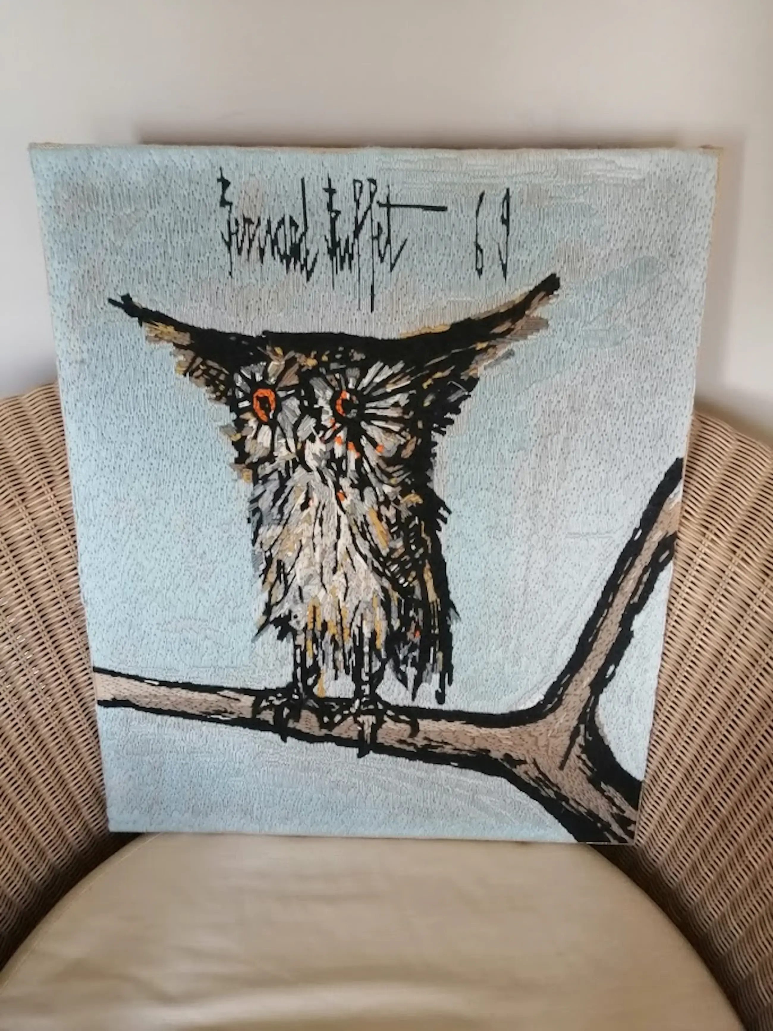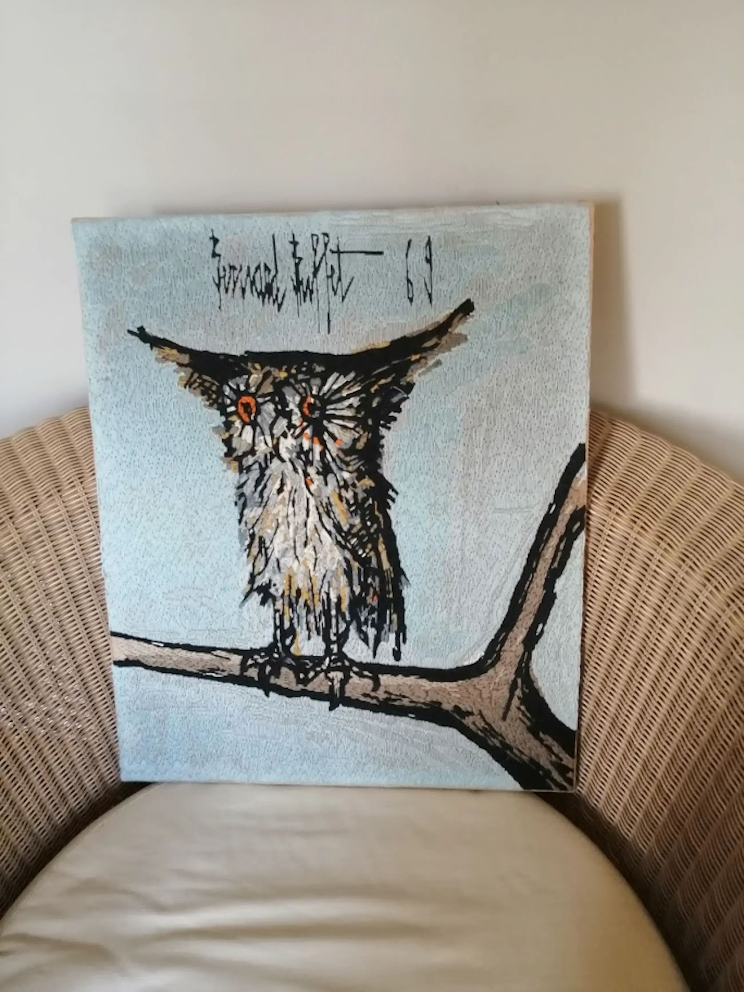 "Le Hibou" Wollen tapisserie/handwerk naar Bernard Buffet uit 1969. Uitgevoerd door Colette Morin. Afmetingen: 58 cm x 55 cm (Zonder lijst, alleen canvas). In zeer mooie staat.