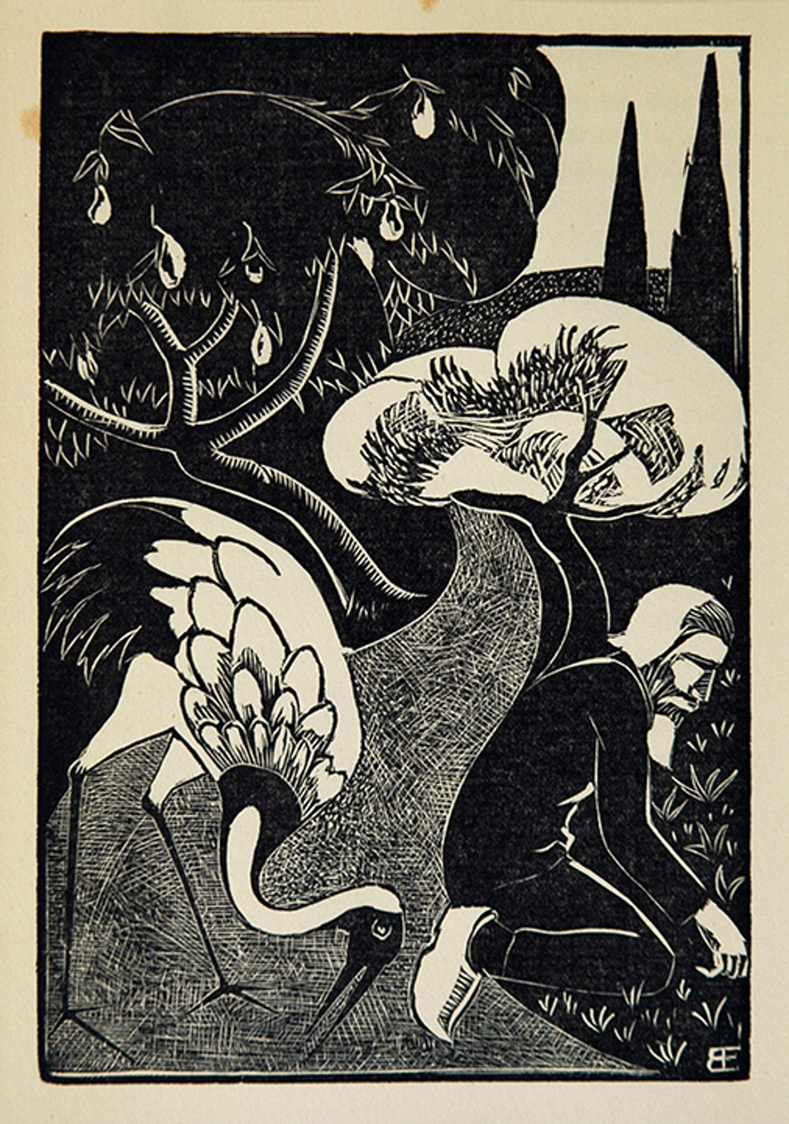 Bernard Essers was een Nederlands grafisch kunstenaar die bekend is geworden met houtsneden en penseeltekeningen in inkt; hij was ook aquarellist, etser, illustrator, glasschilder, kunstschilder en boekbandontwerper. Hij illustreerde het tijdschrift Wendingen en werken van bekende auteurs: de 'zwerver-boeken' van Arthur van Schendel en Deirdre en de zonen van Usnach van Adriaan Roland Holst en een boek van P.C. Boutens. Deze houtsnede is een van de vier boekillustraties uit: "Bloemen en legenden" door Tine Cool uit 1928. Essers' werk is figuratief; het geeft herkenbare voorstellingen. Tegelijkertijd heeft zijn werk ook abstracte en decoratieve kwaliteiten. Het kenmerkt zich door een grote expressiviteit die bereikt wordt met een strakke stilering. In sommige opzichten doet het aan Art Nouveau denken; in andere opzichten aan expressionistisch werk.