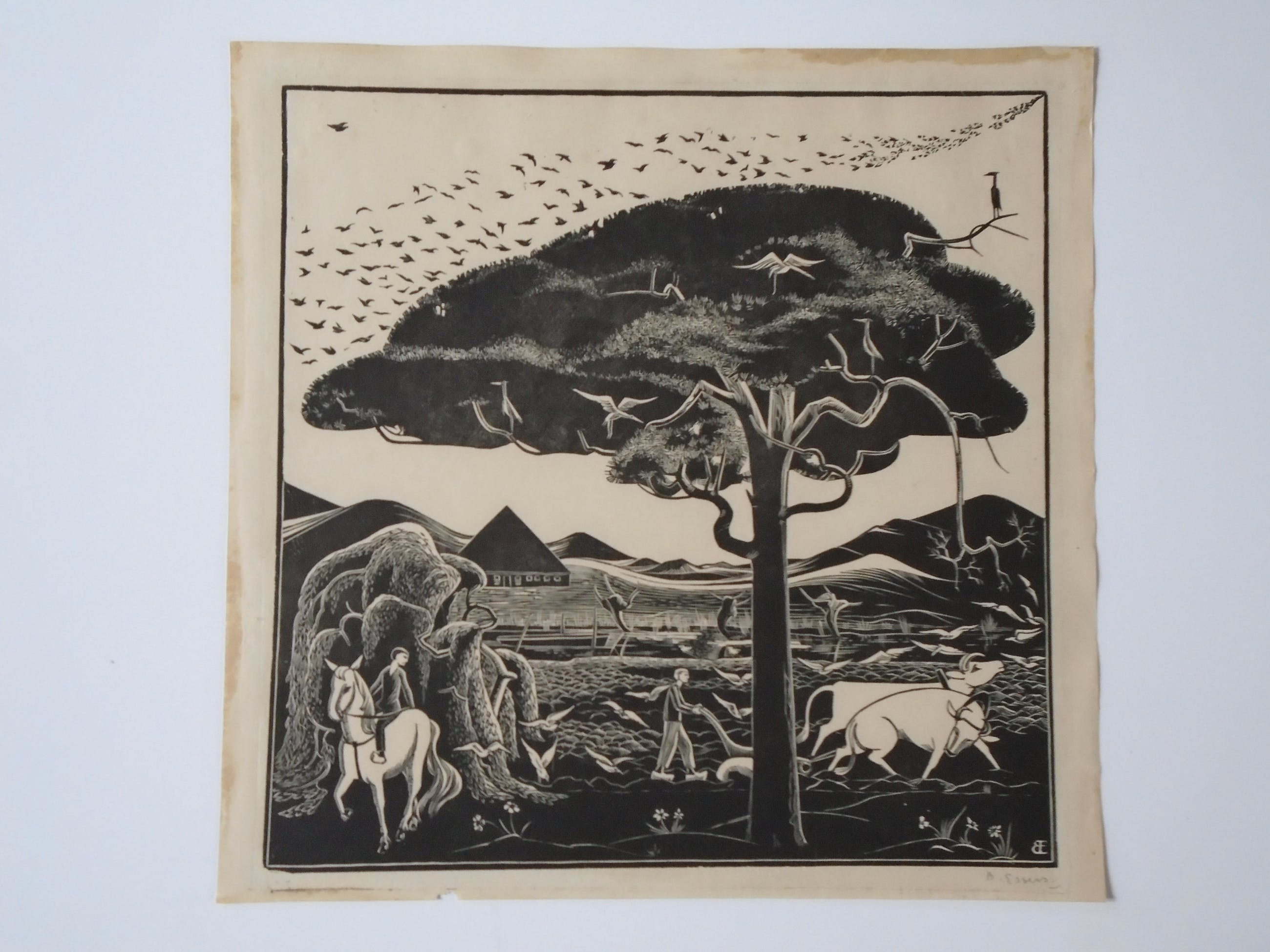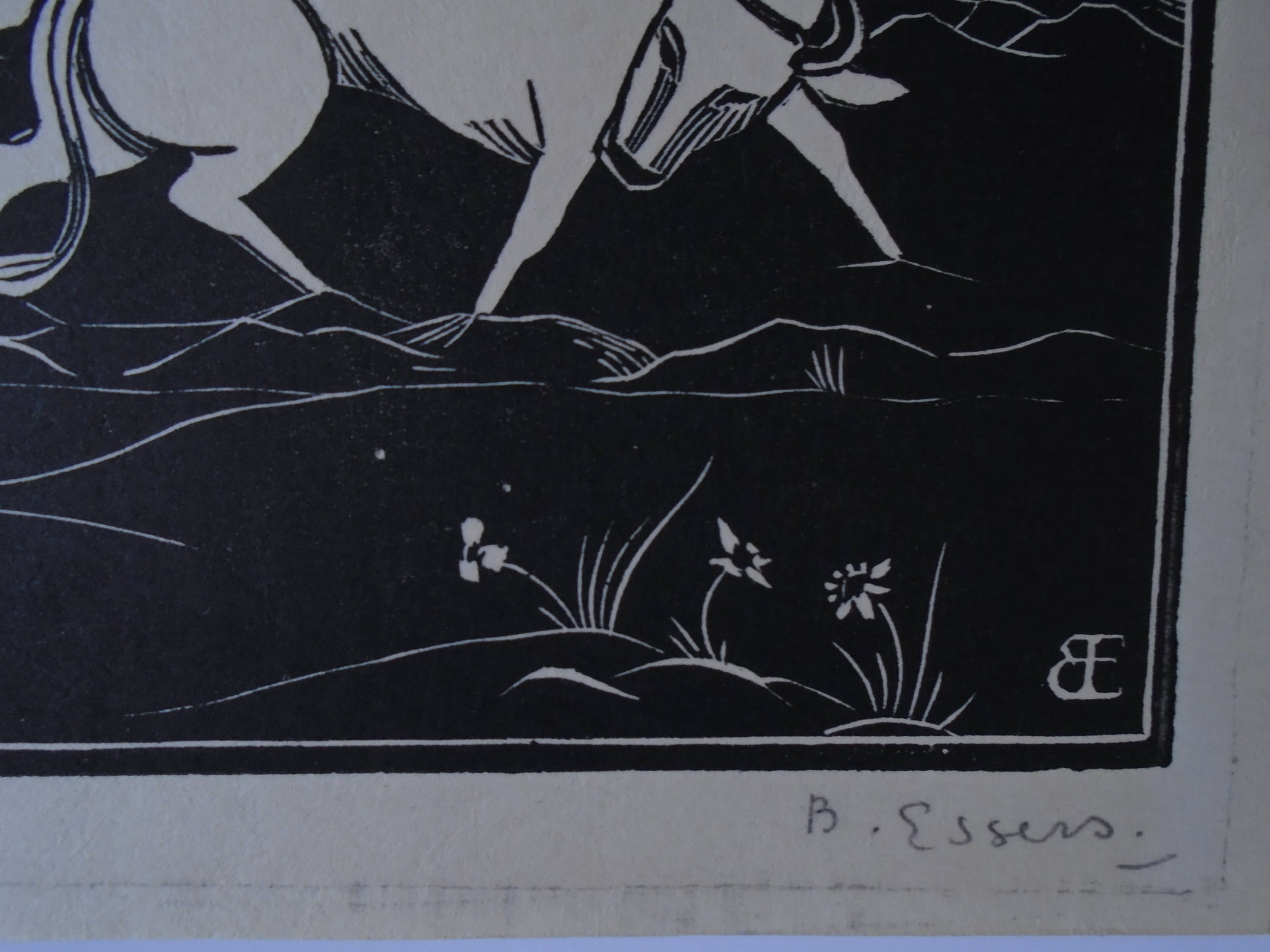 Typische houtsnede van Ben Essers.Potlood gesigneerd rechtsonder.Monogram in het blok rechtsonder.Beeldmaat 33,5 x 33,5 cm.Bladmaat 37 x 37,5 cm.Losbladig.Literatuur: Catalogus Spijk no. G 32.
