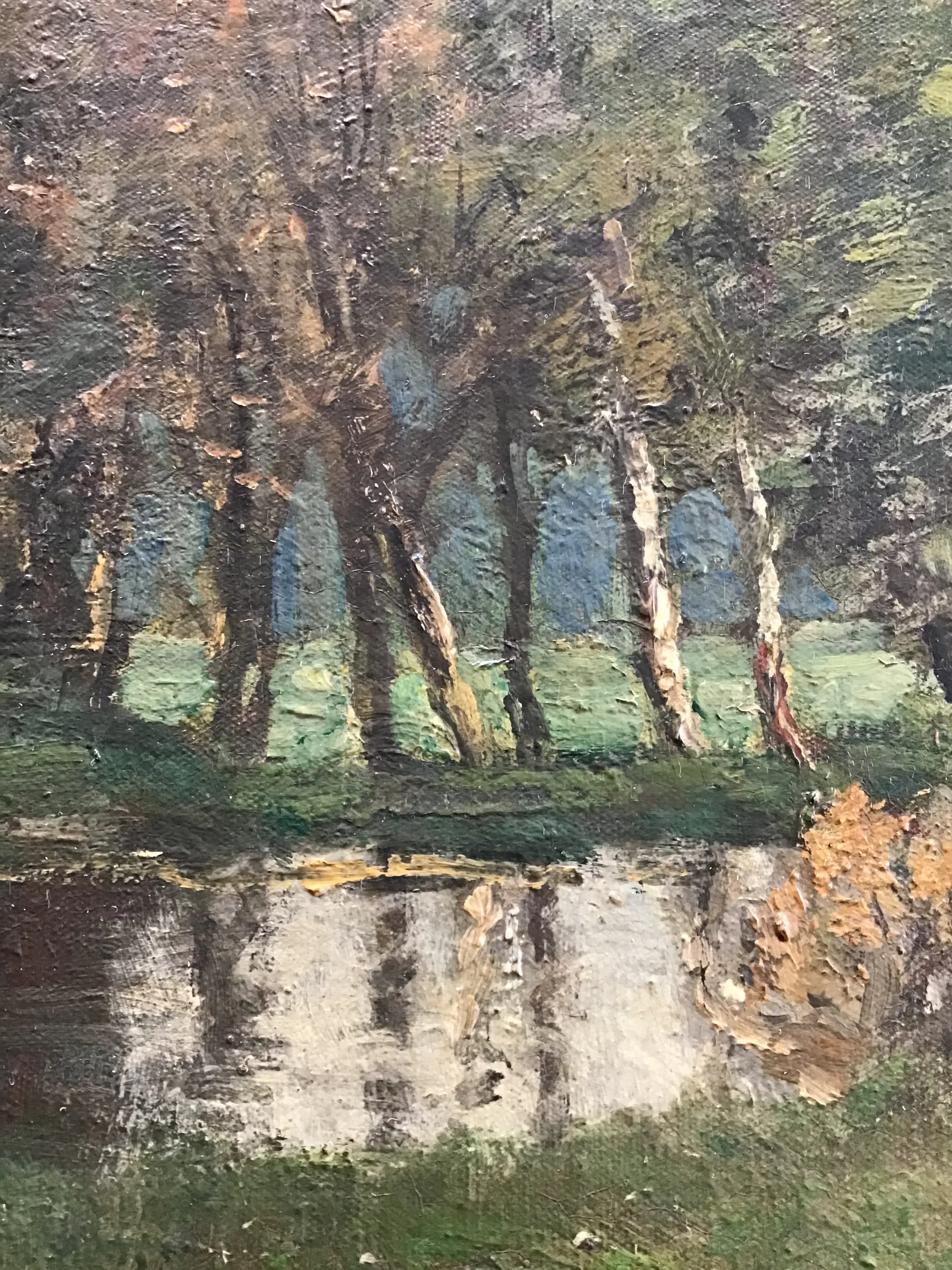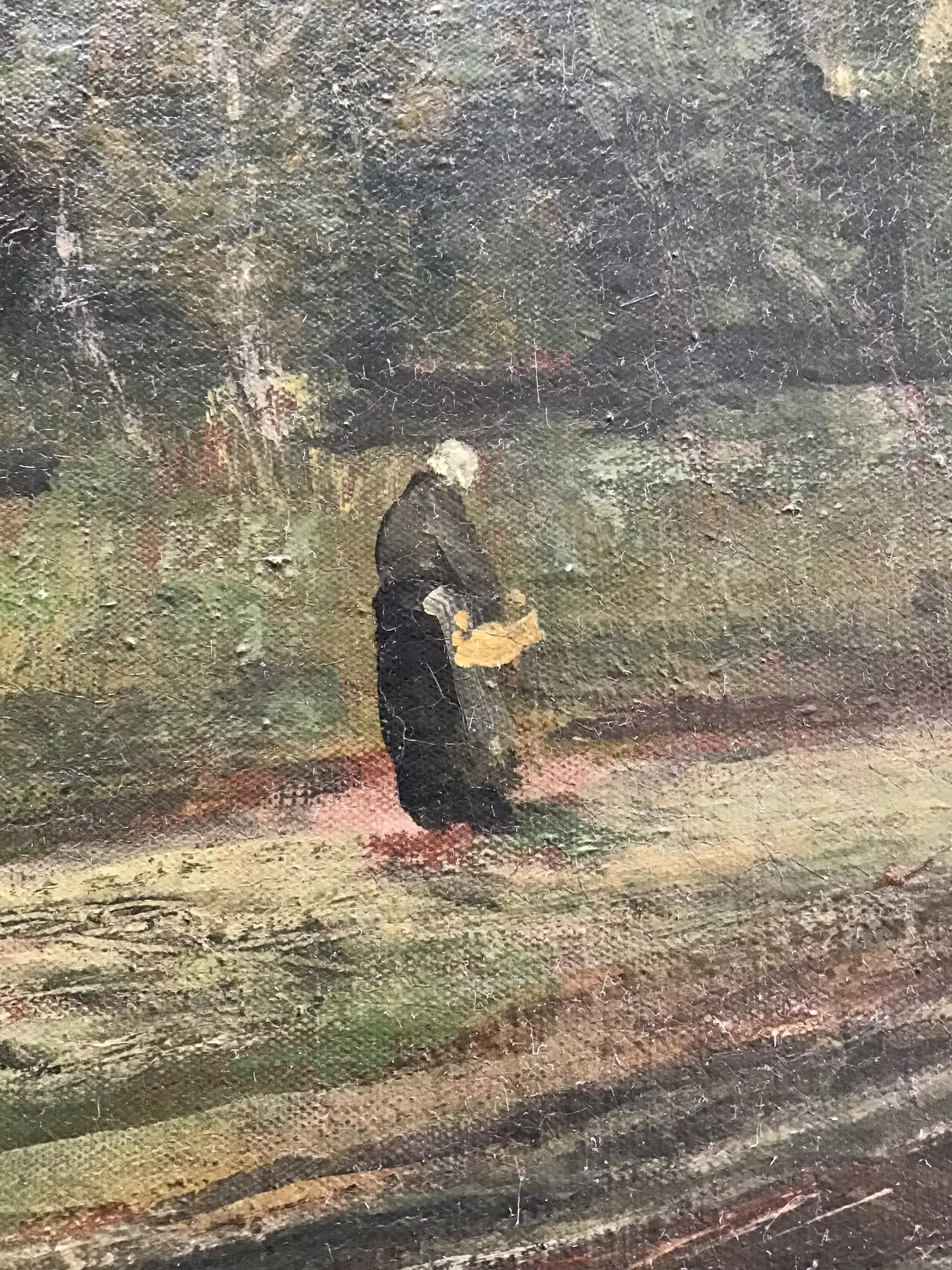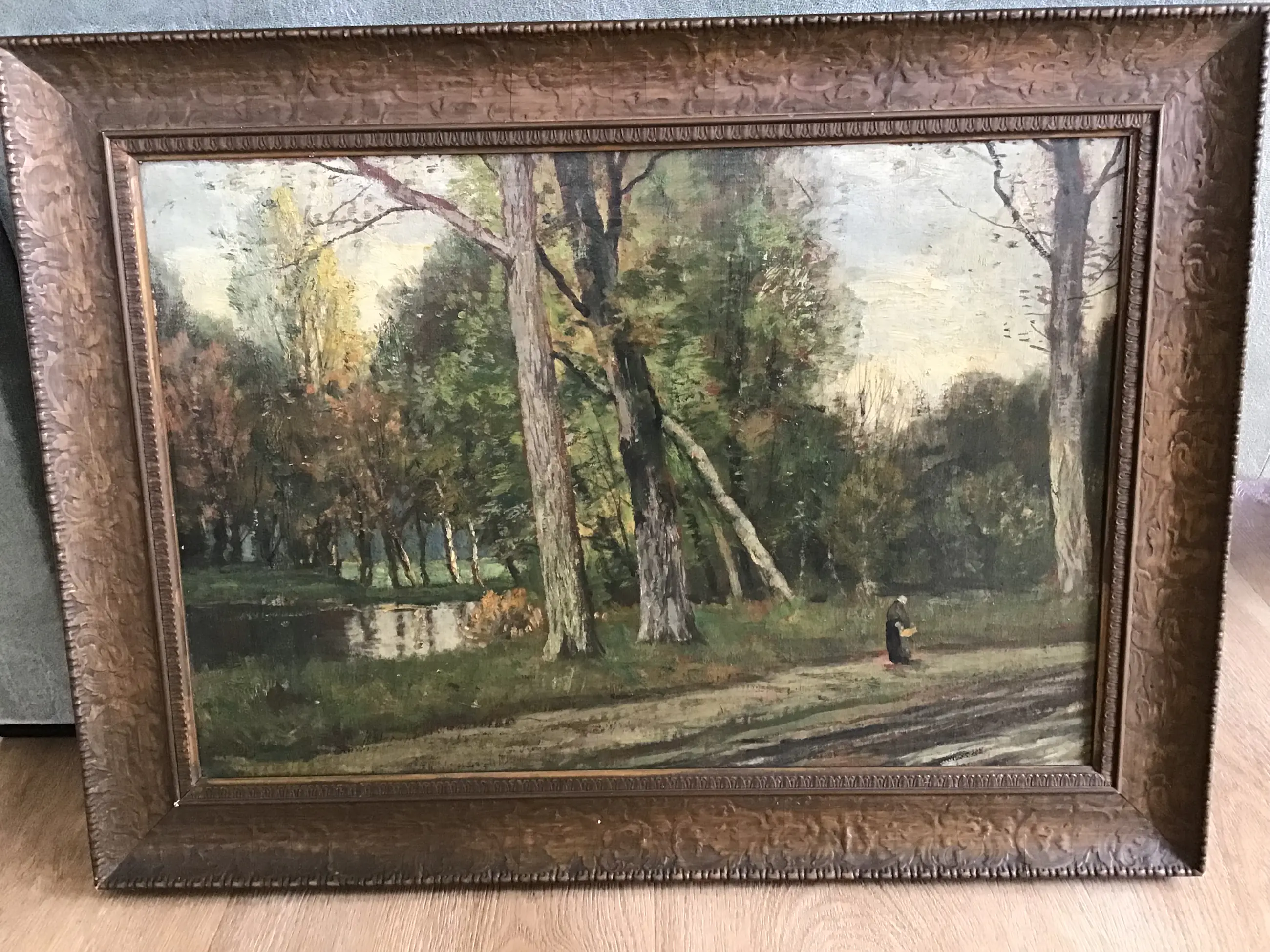 Landschap met verschillende bomen en een waterpartij. Op de voorgrond loopt een vrouw. Mooi sfeervol schilderij.