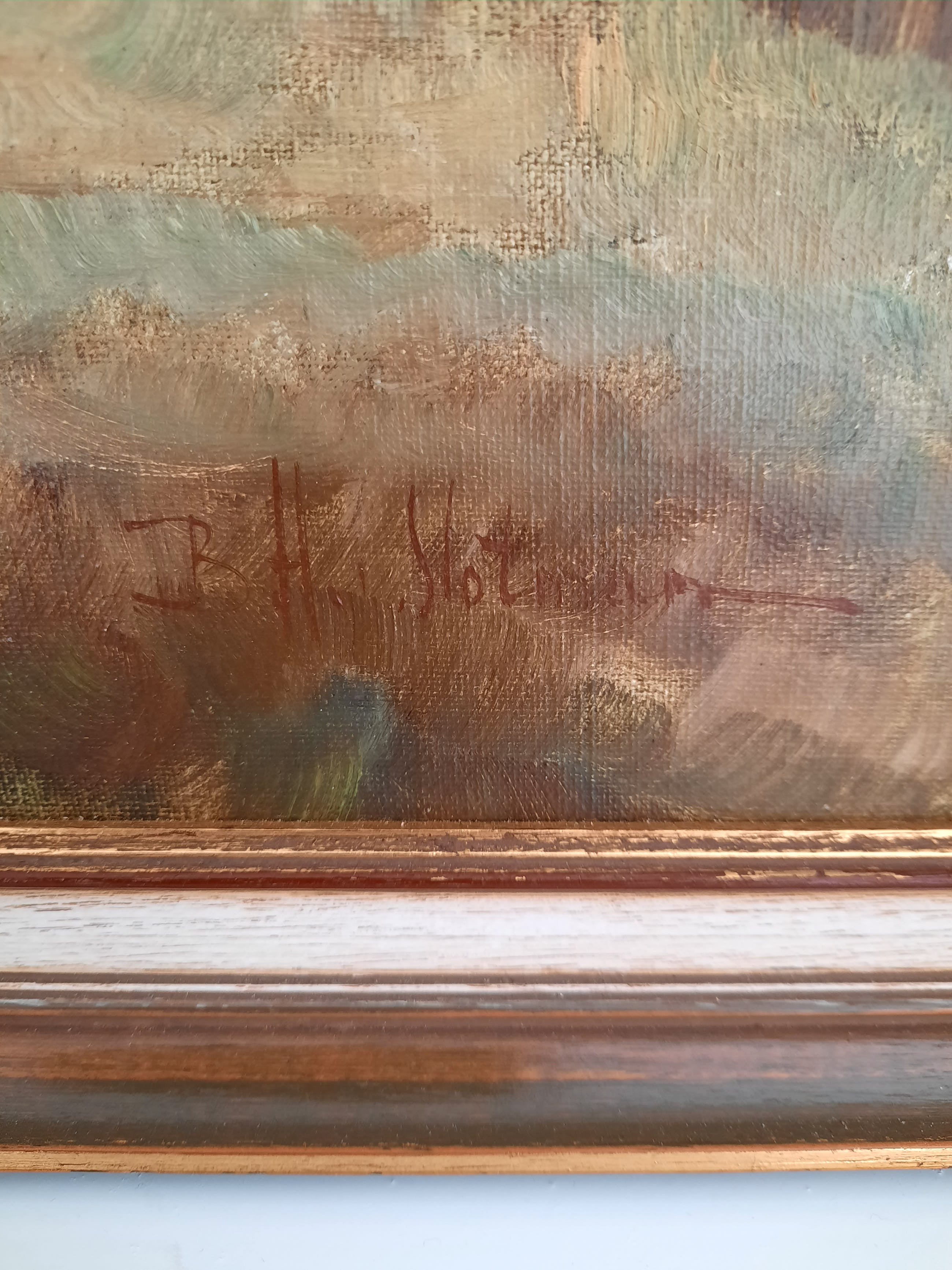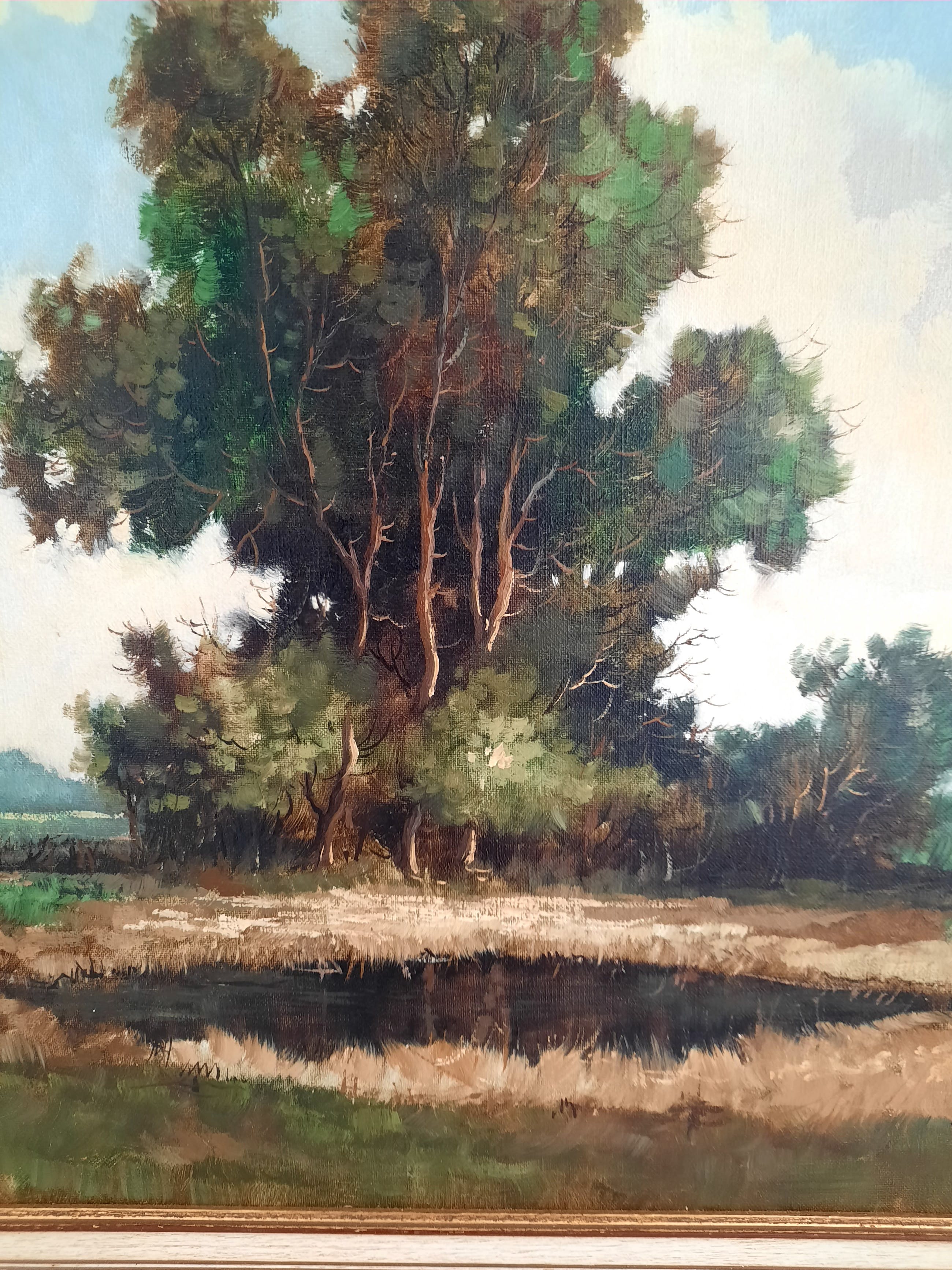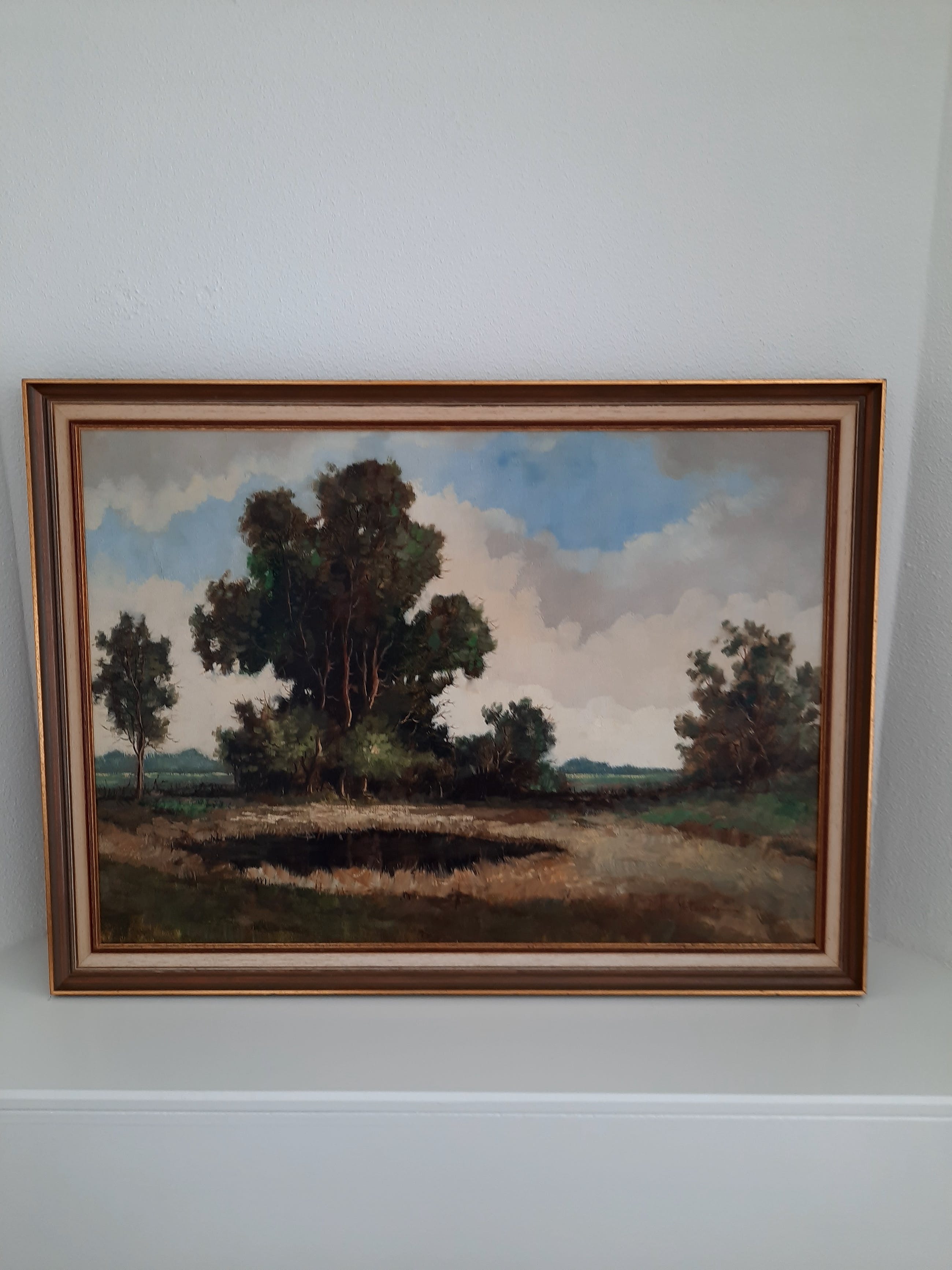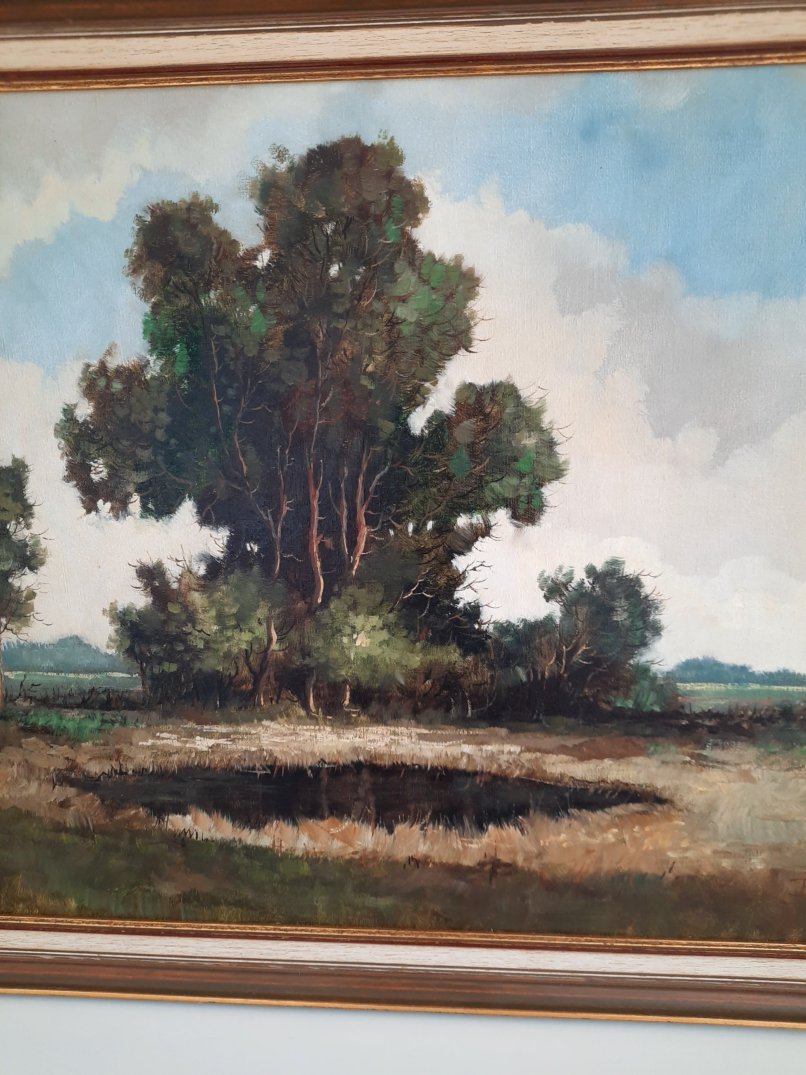 Schilderij van een dobbe in het landschap. Een dobbe is een drinkplaats voor vee dieren. Deze worden nog steeds in op het platte landschap gevonden, al zijn er ook veel gedempt.