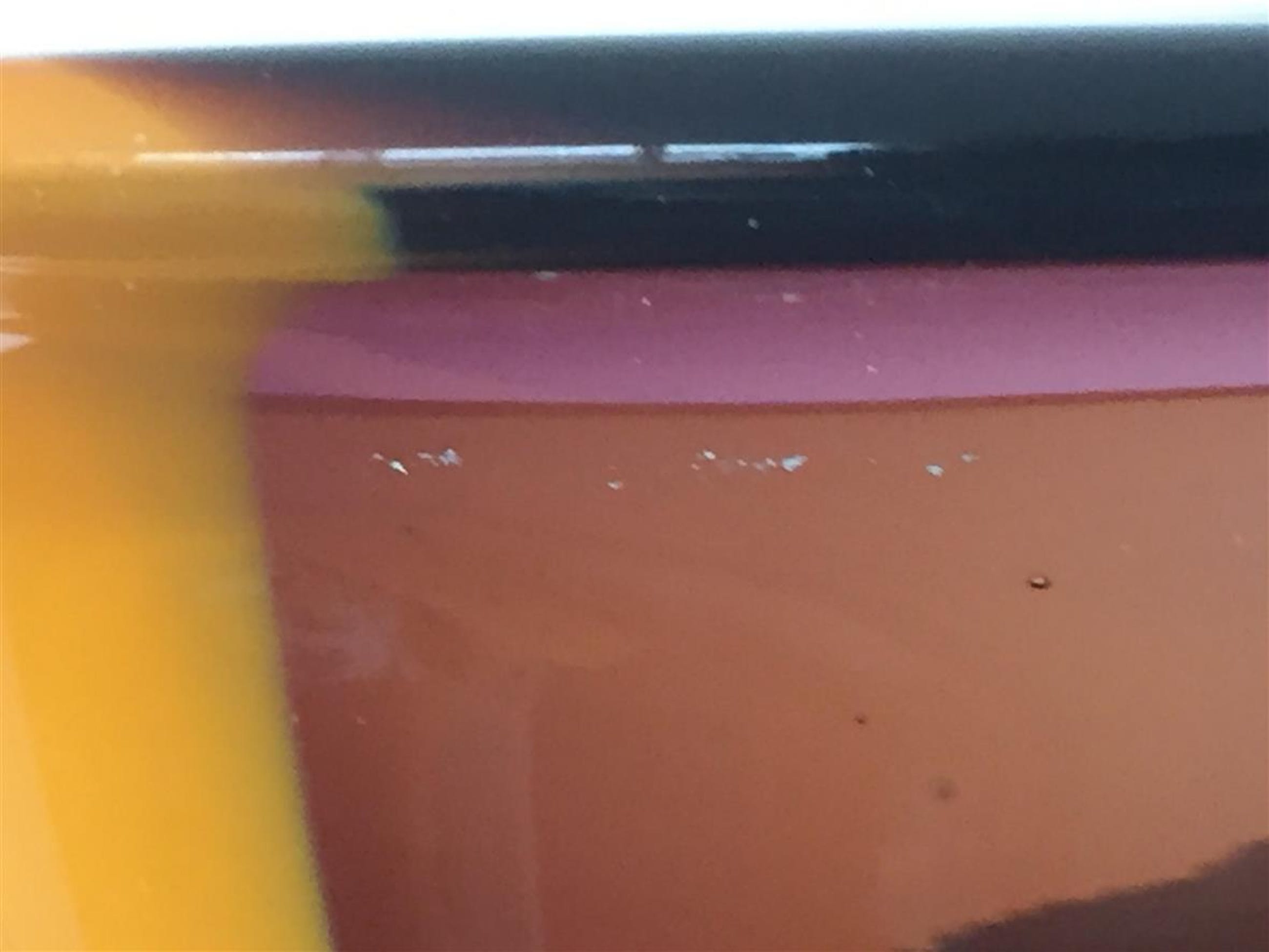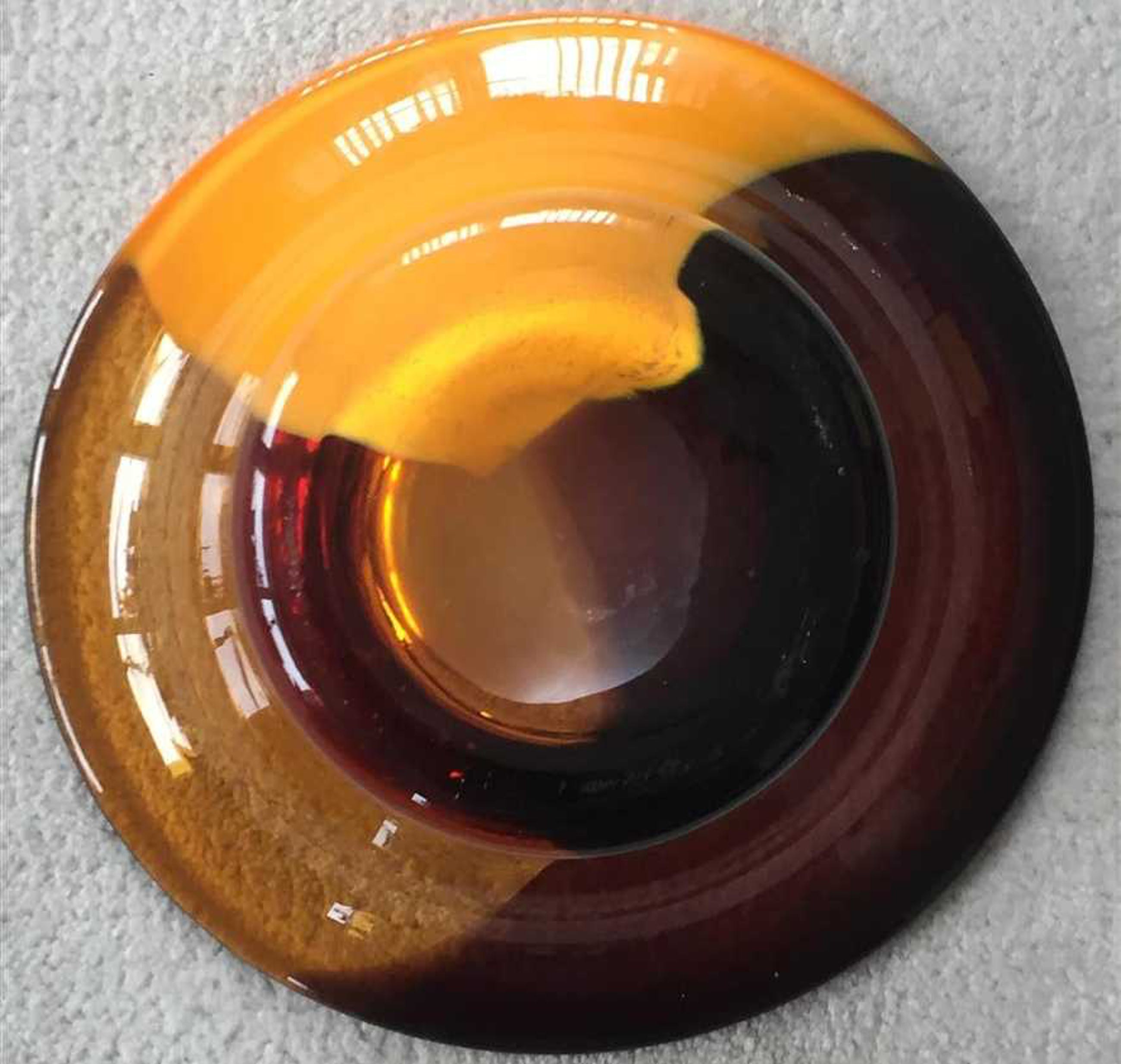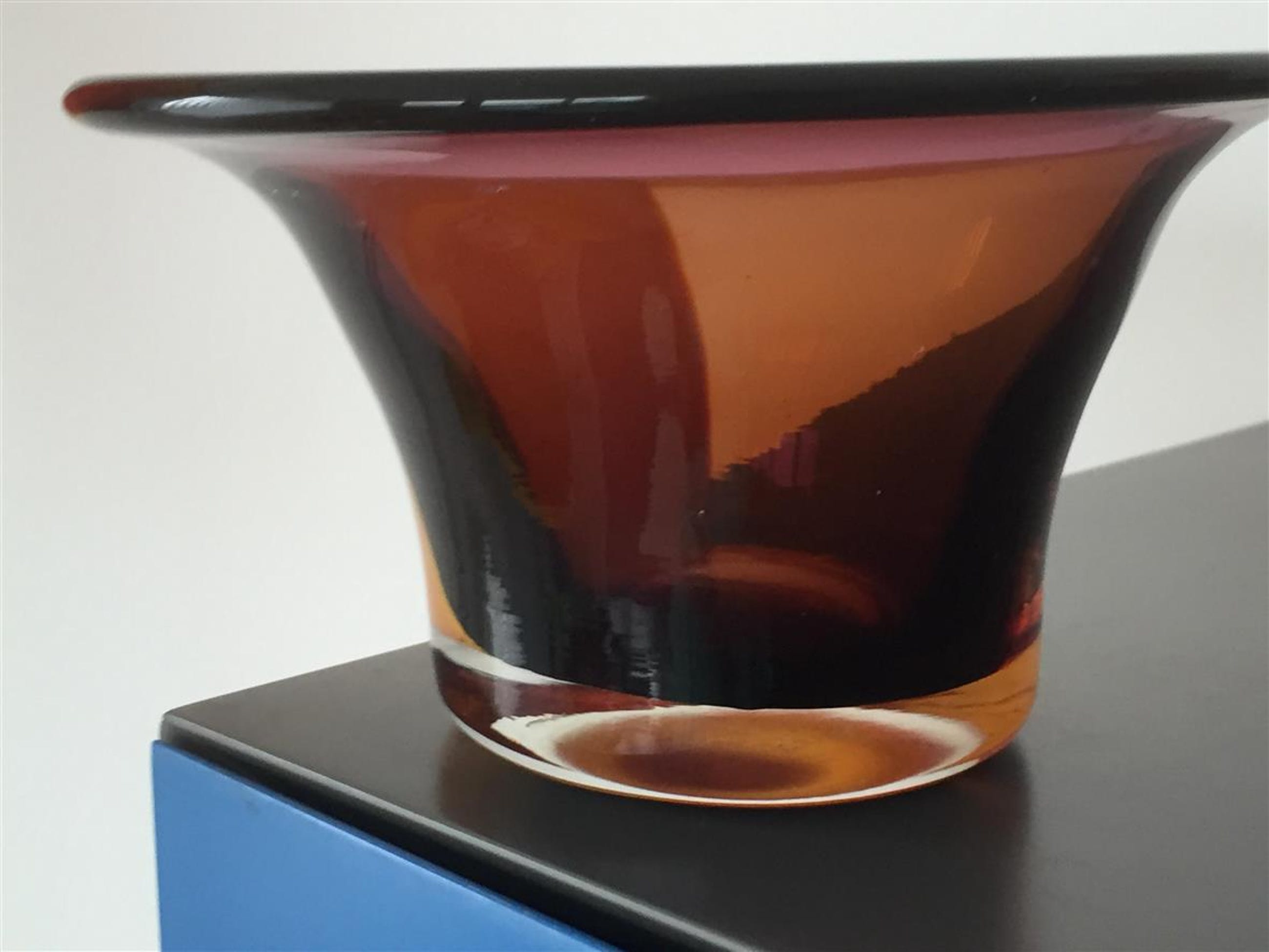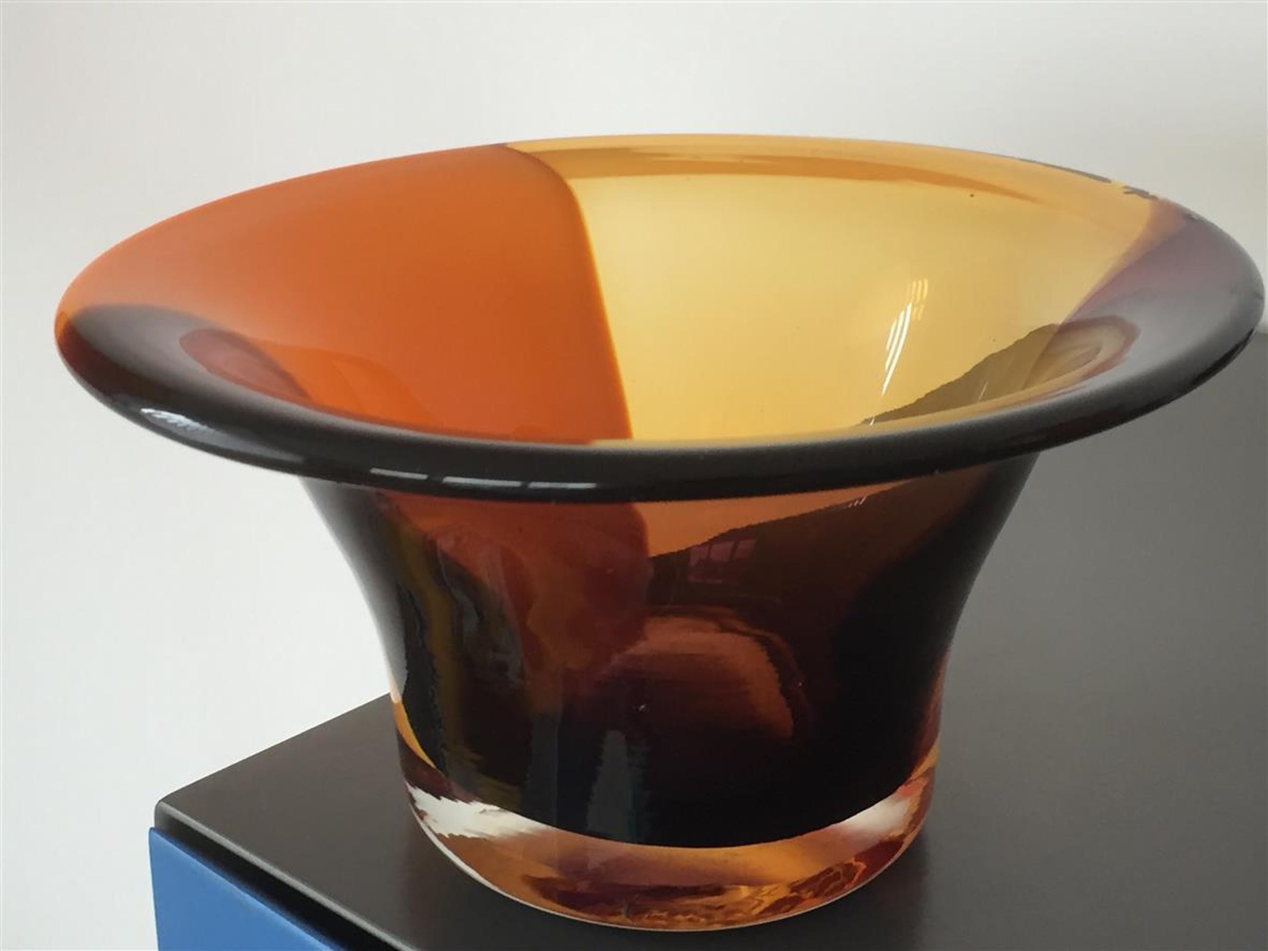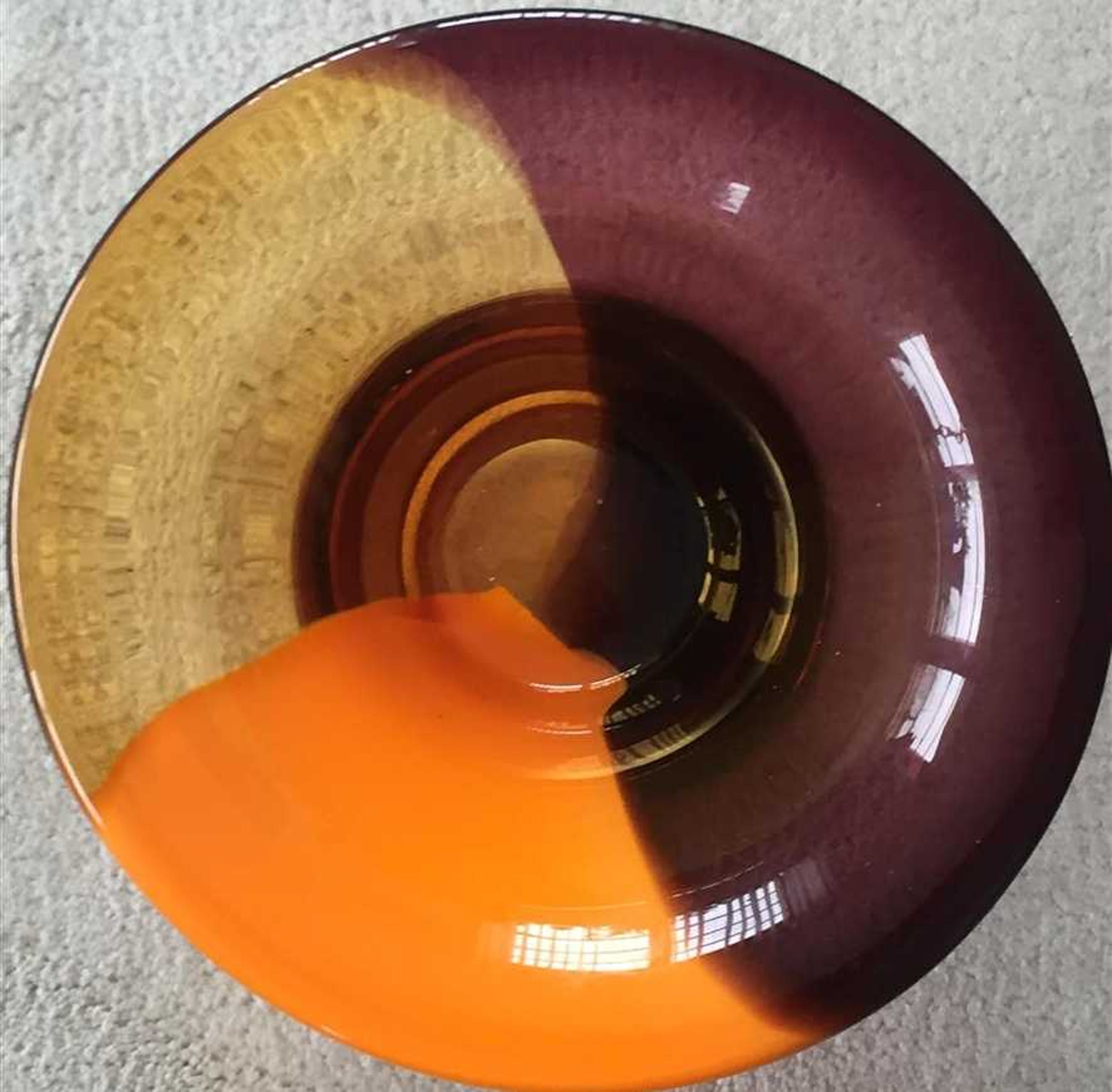 Een prachtig ontwerp van de glaskunstenaar Bernard Heesen. Kleuren: oranje, paars, transparant amber. Vervaardigd in glasblazerij “De Oude Horn Acquoy”.