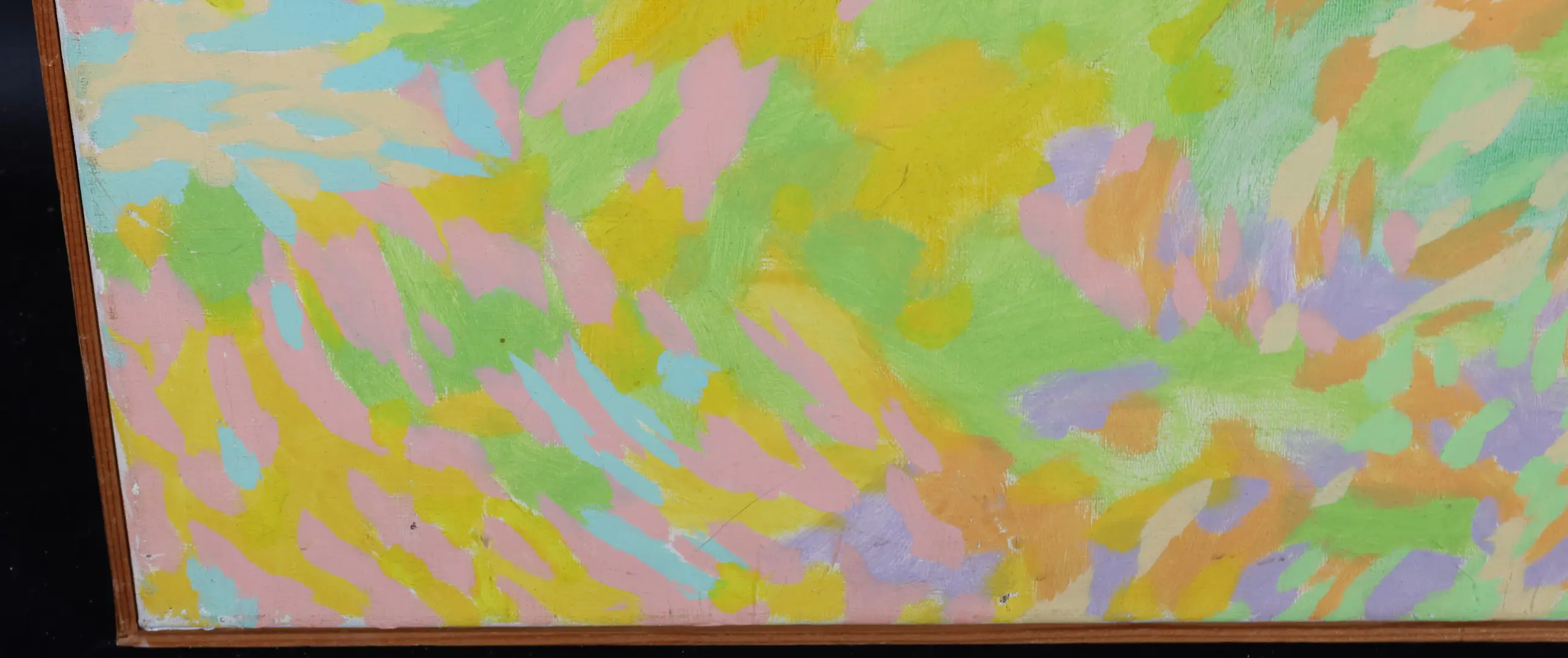 | Langs de randen wat slijtage. Verder langs de rand onder een paar gaatjes in het doek. Wat lichte vegen en krasjes. Verfbeschadiging midden-links. | |