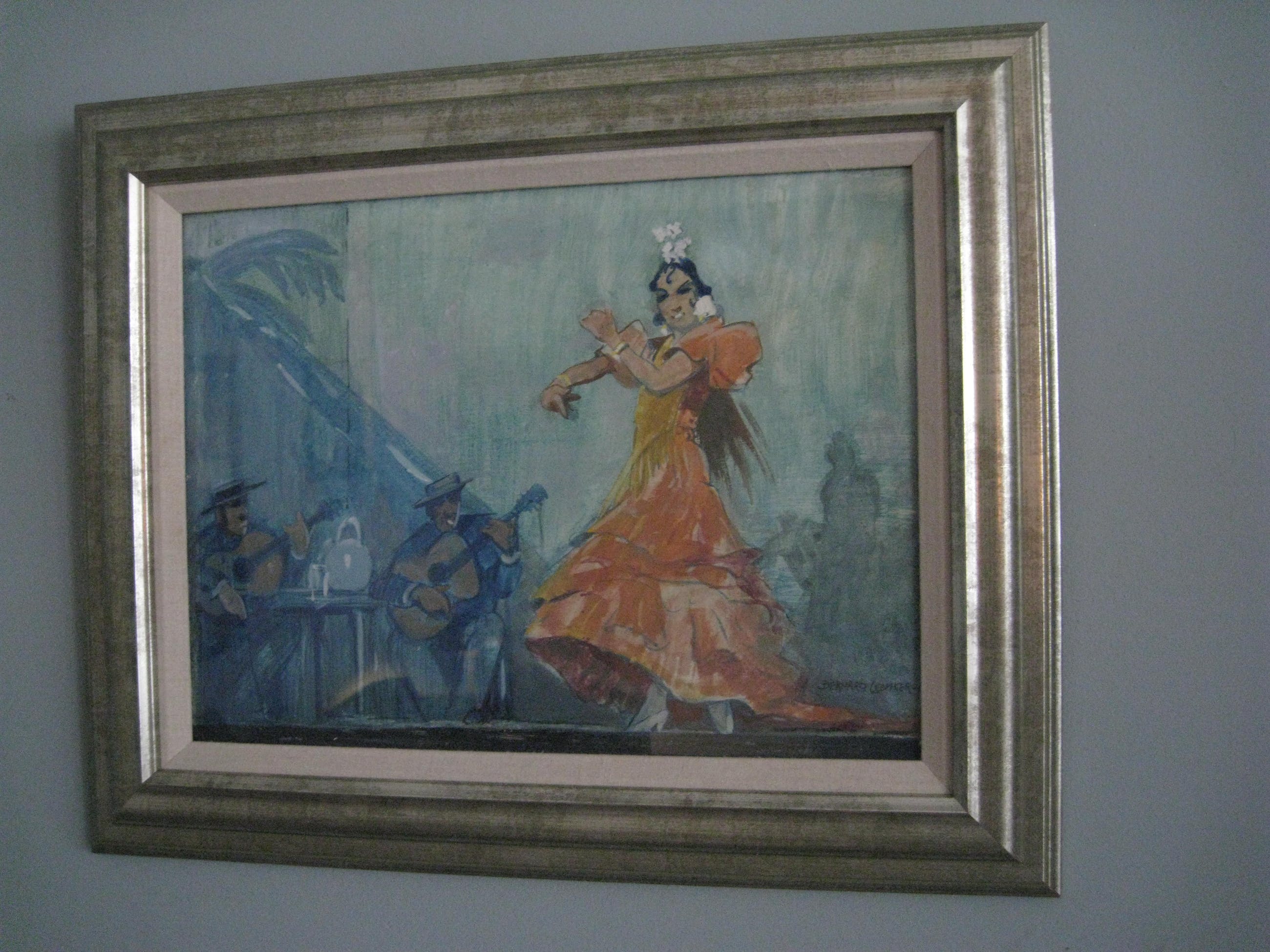 Flamencogroep in actie treffend neergezet door Bernard Leemker in zijn bijna karikaturale stijl. Aquarel op papier op paneel gezet in fraaie verzilverde kwaliteitslijst achter glas. Het geheel is in prima staat. ophalen in Amsterdam eventueel opsturen (K.K.) met eigen risico i.v.m. het glas.