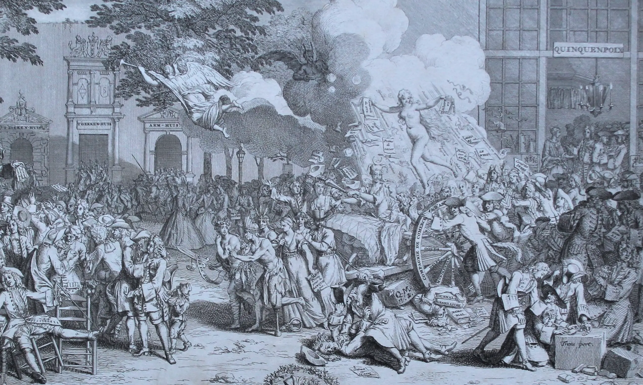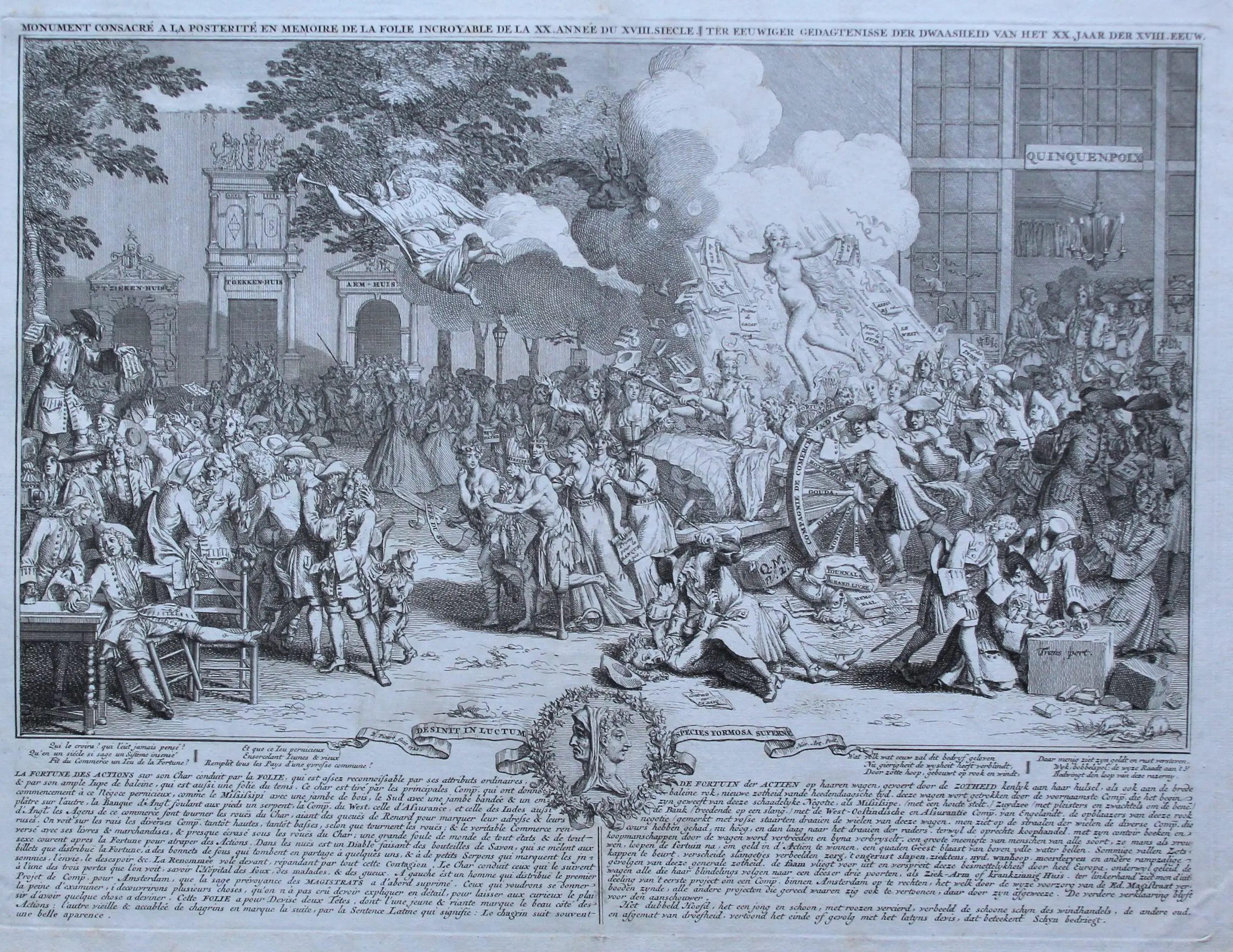 Uit: Het groote tafereel der dwaasheid, vertoonende de opkomst, voortgang en ondergang der actie, bubbel en windnegotie, in Vrankryk, Engeland, en de Nederlanden, gepleegt in den jaare 1720. [Amsterdam] 1720.