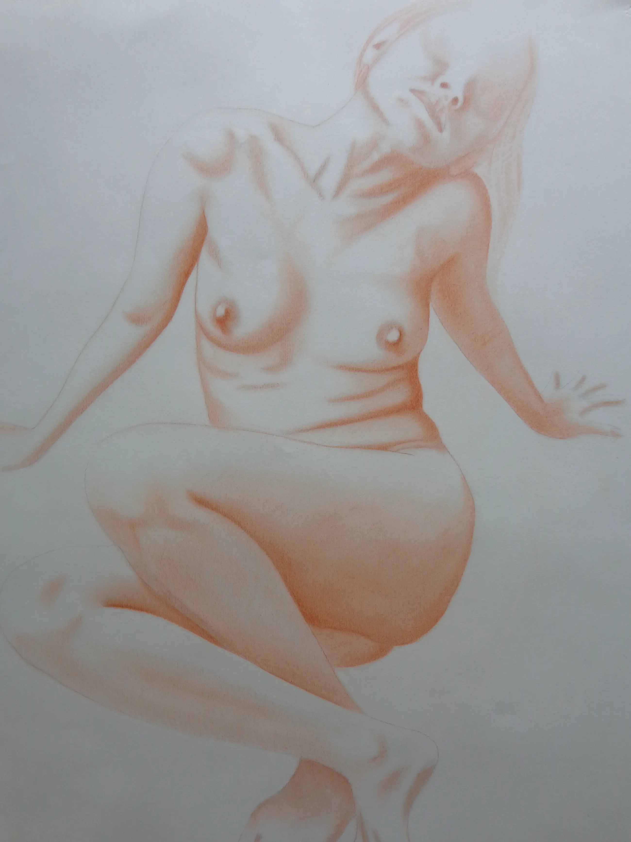 Bernard-Stephan Moldawan (°1948). Naakte vrouw. Origineel werk van rood krijt op papier. Gesigneerd met rood krijt. 1978. Goede staat. Verso minieme papierschade. Werk: 65x50cm.