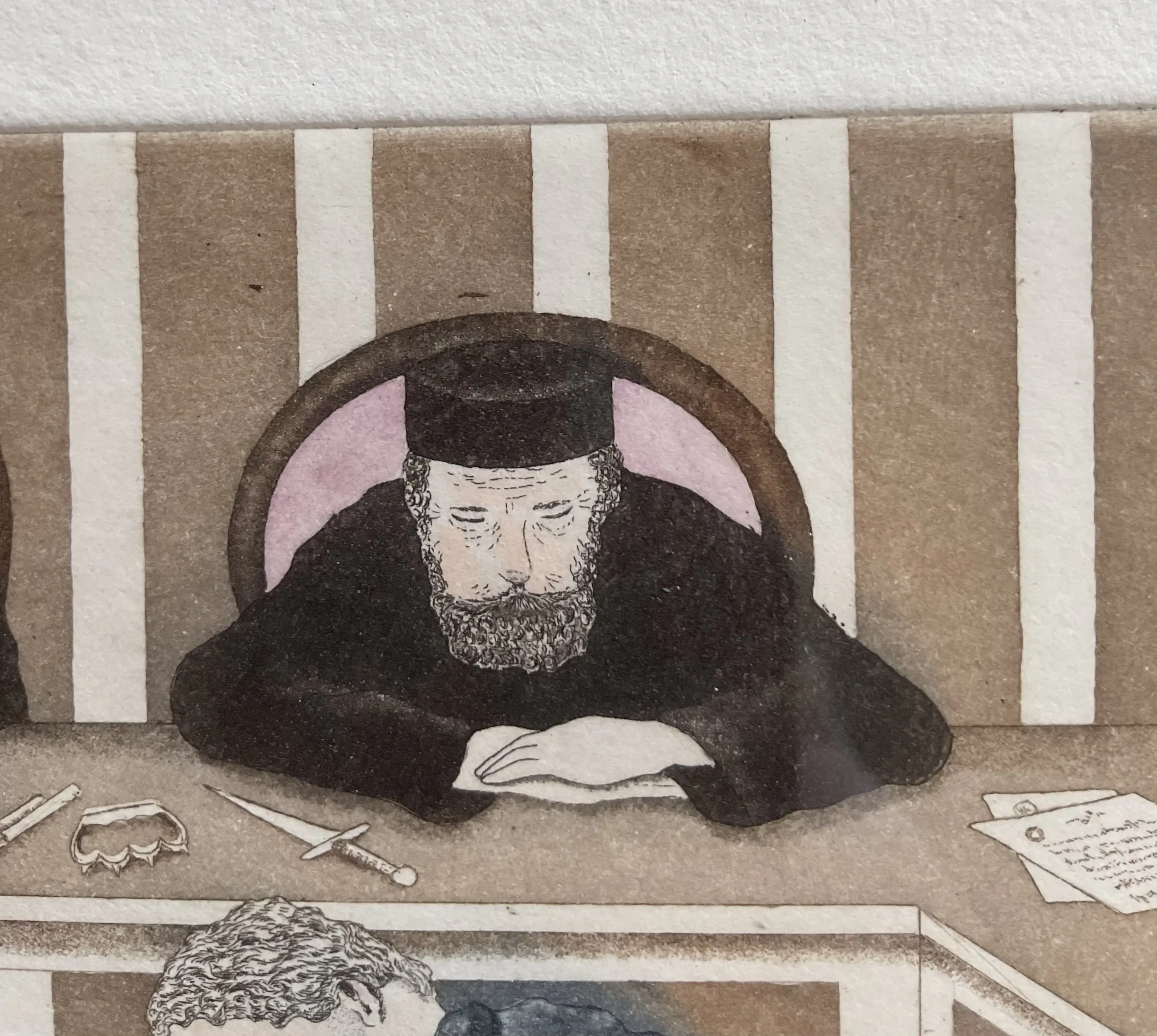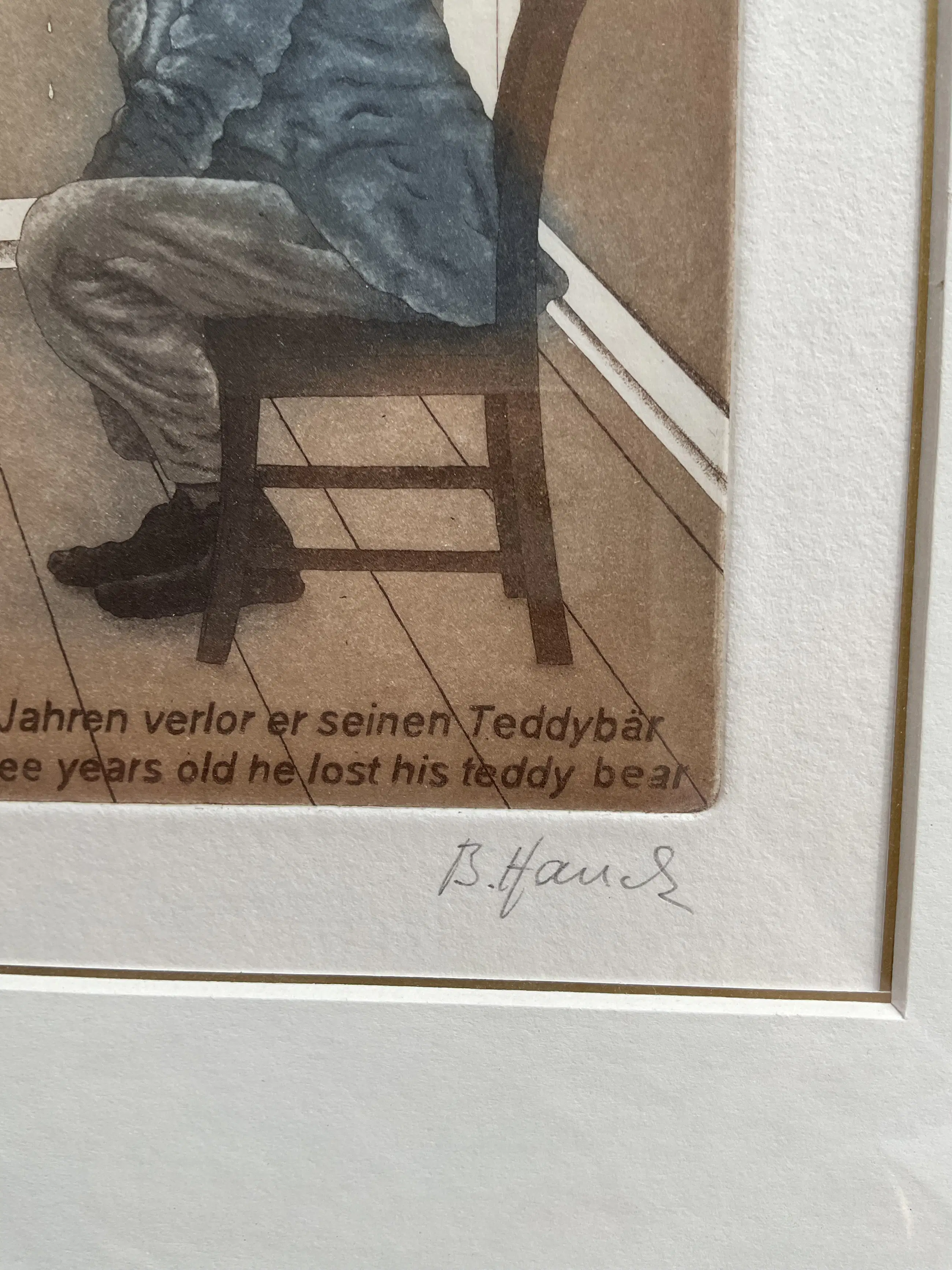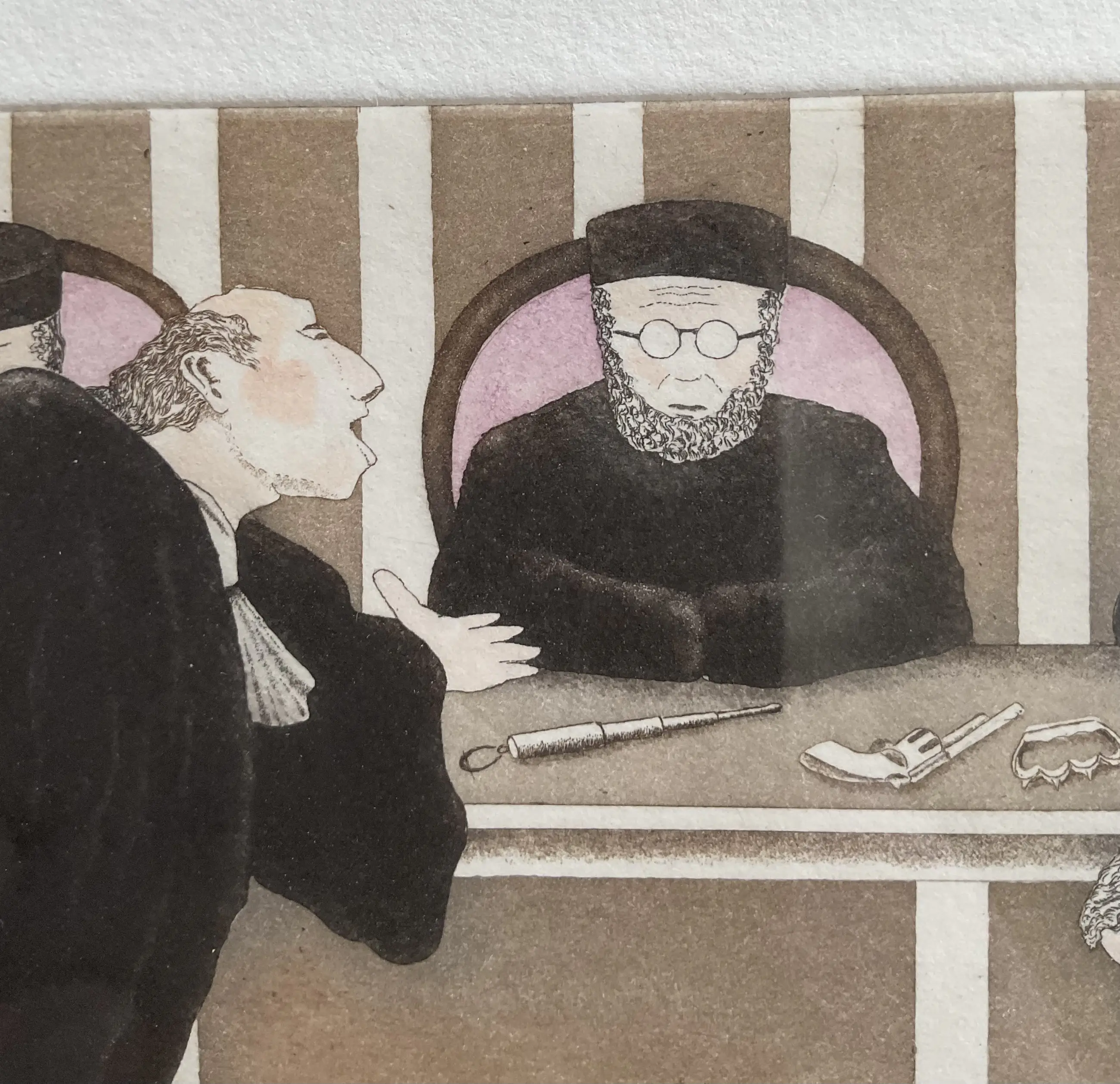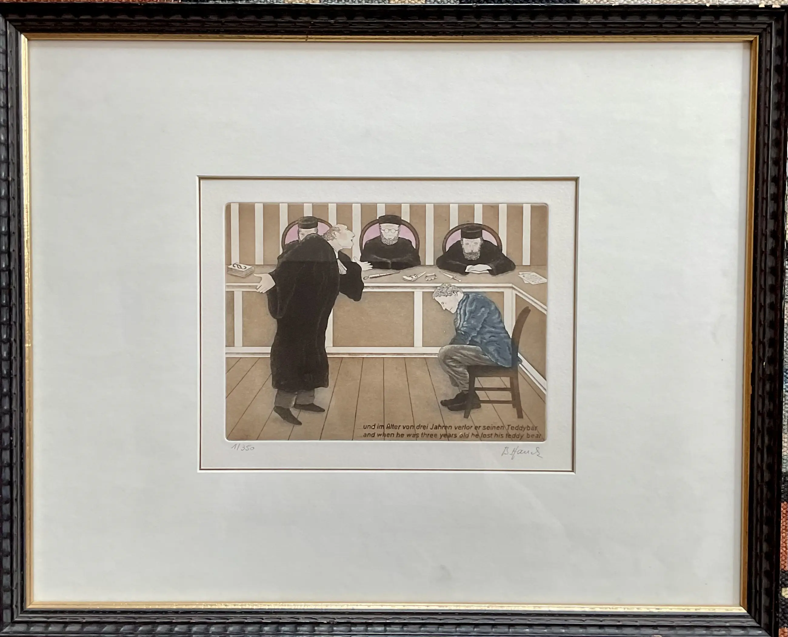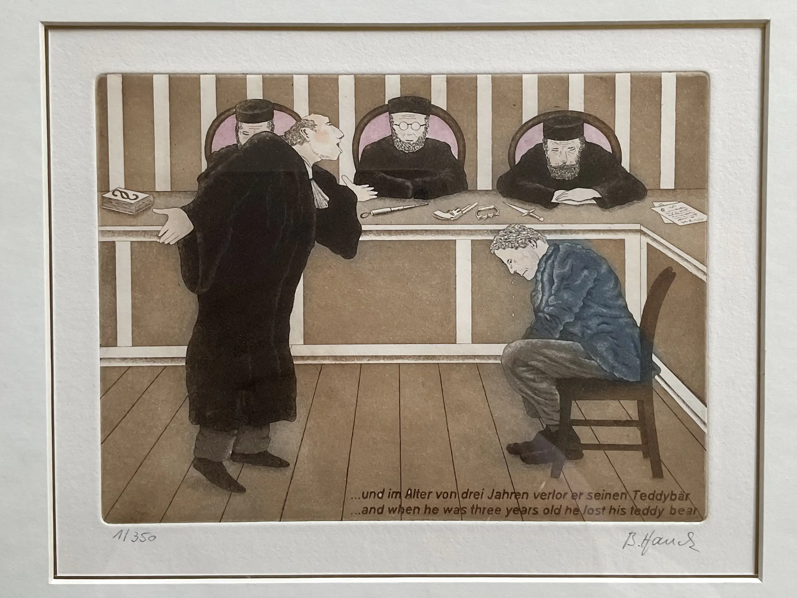 Bernd Hauck - Ingekleurde grappige ets, man voor rechter, gesigneerd, gelijst