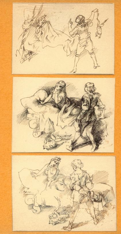 28 Kleine Federzeichnungen . Konvolut zu Grimms Märchen. Auf zeichenkarton, davon die meisten mit zwei Papierstreifen rückseitig auf Untersatzkarton montiert. O.O. und Jahr. Um 1925.Sehr fein ausgeführte Zeichnungen z.T. mit Deckweiß gehöht, zu den Märchen Frau Holle etc. Gebrauchsspuren, z. T. zwei Zeichnungen auf einem Blättchen. Wegen weiterer Details bitte unbedingt mailen. Bei Bassenge ersteigert. Privatverkauf. Versand 10?.