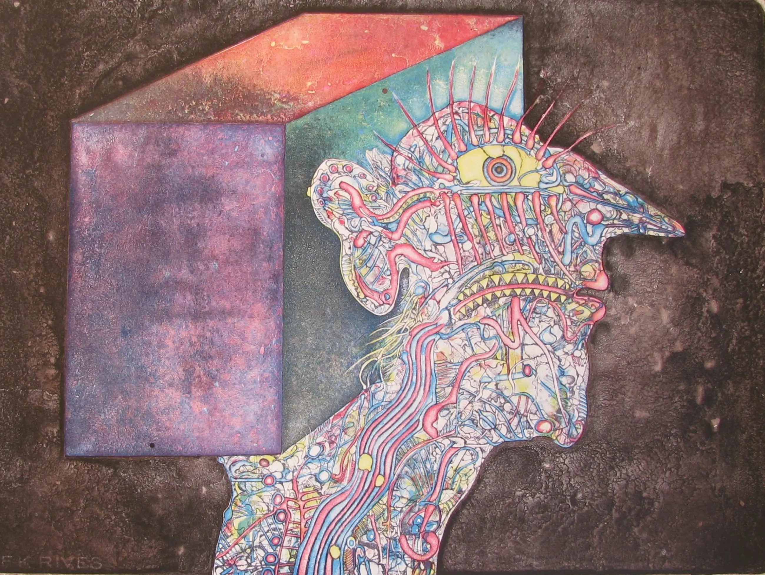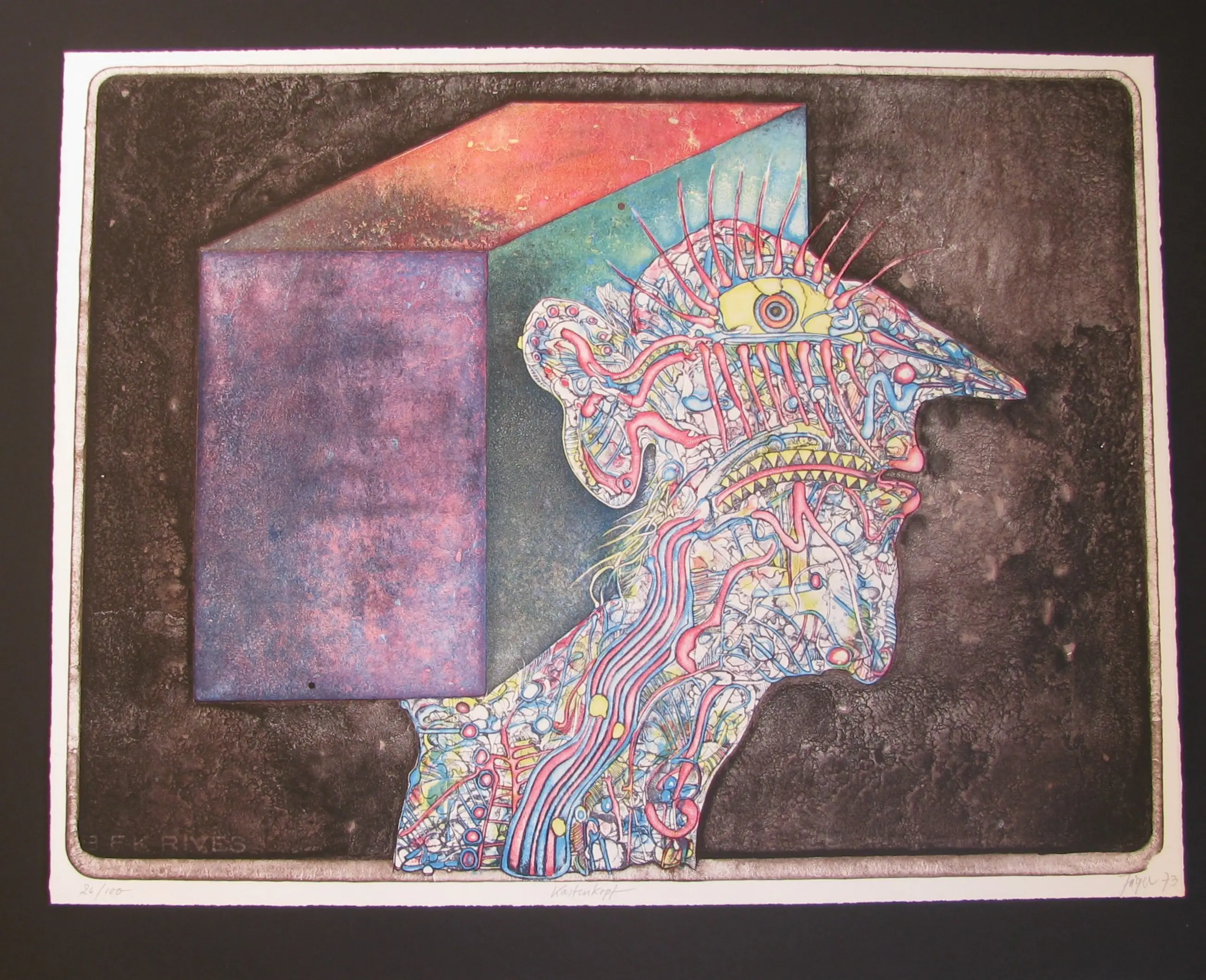 'Kastenkopf', alweer één van die mysterieuze, zeer kleurrijke litho's van Bernard Jaeger, in 1973 uitgegeven door de beroemde Berlijnse galerij Art Brusberg. Het werk werd in potlood door de kunstenaar gesigneerd, genummerd op 100 exemplaren, en betiteld ('Kastenkopf'). Het blad is 50 cm hoog en 65 cm breed, in perfecte staat, nooit ingelijst geweest, steeds liggend in de lade bewaard.