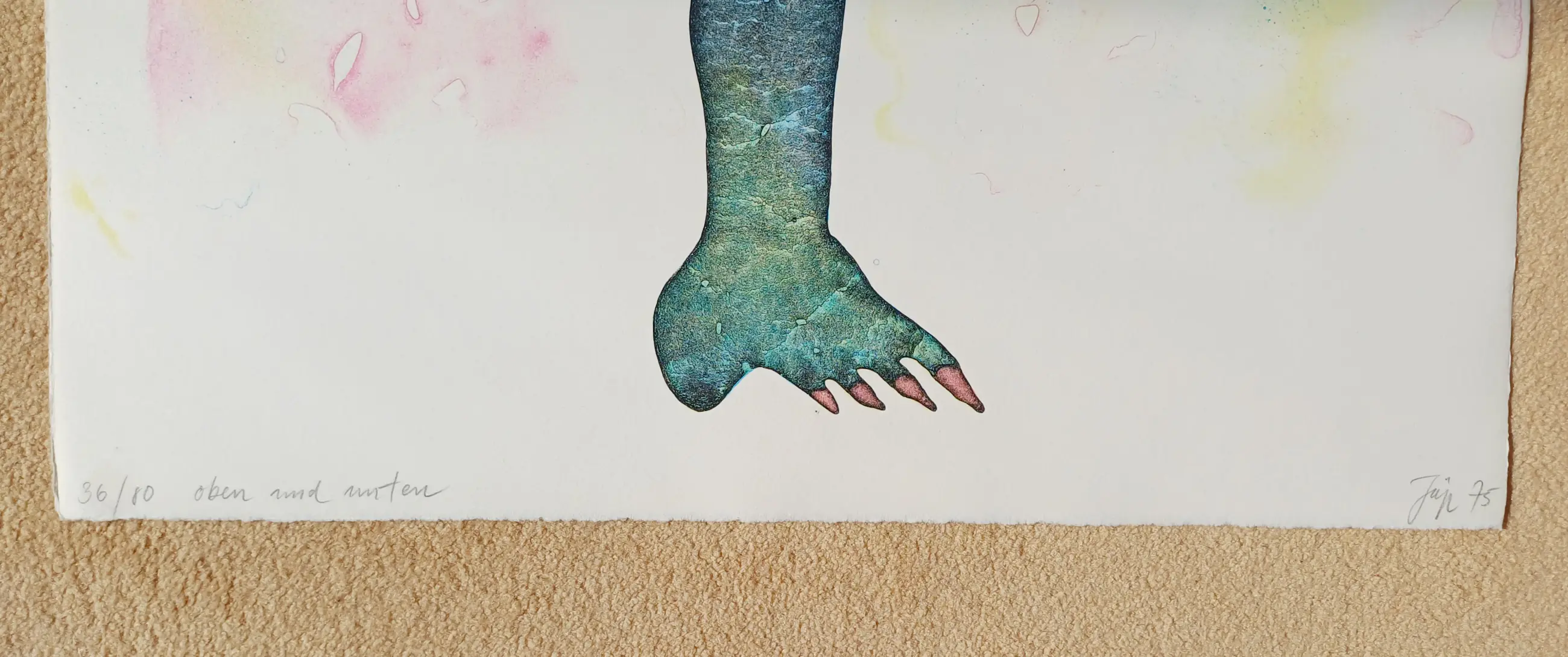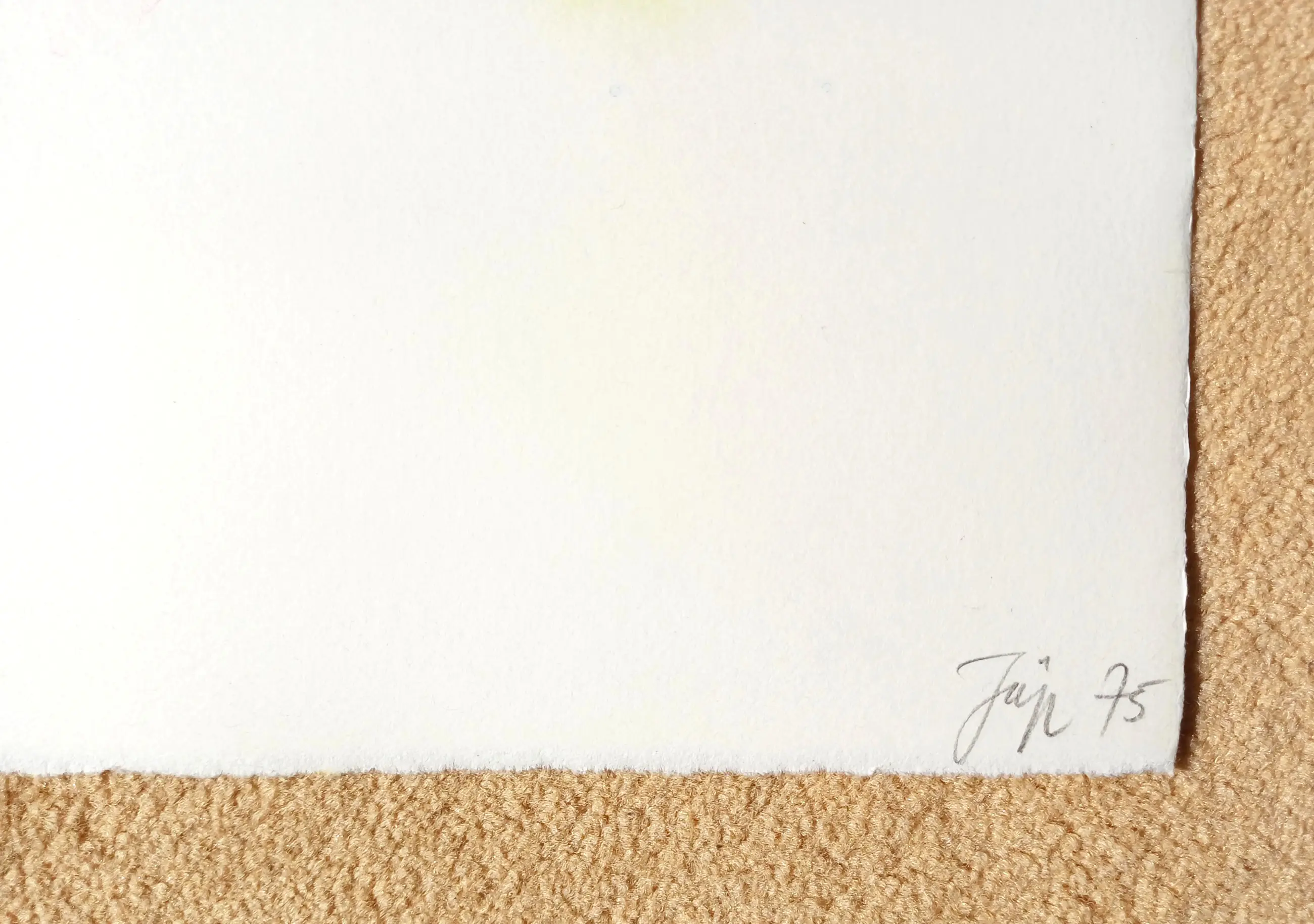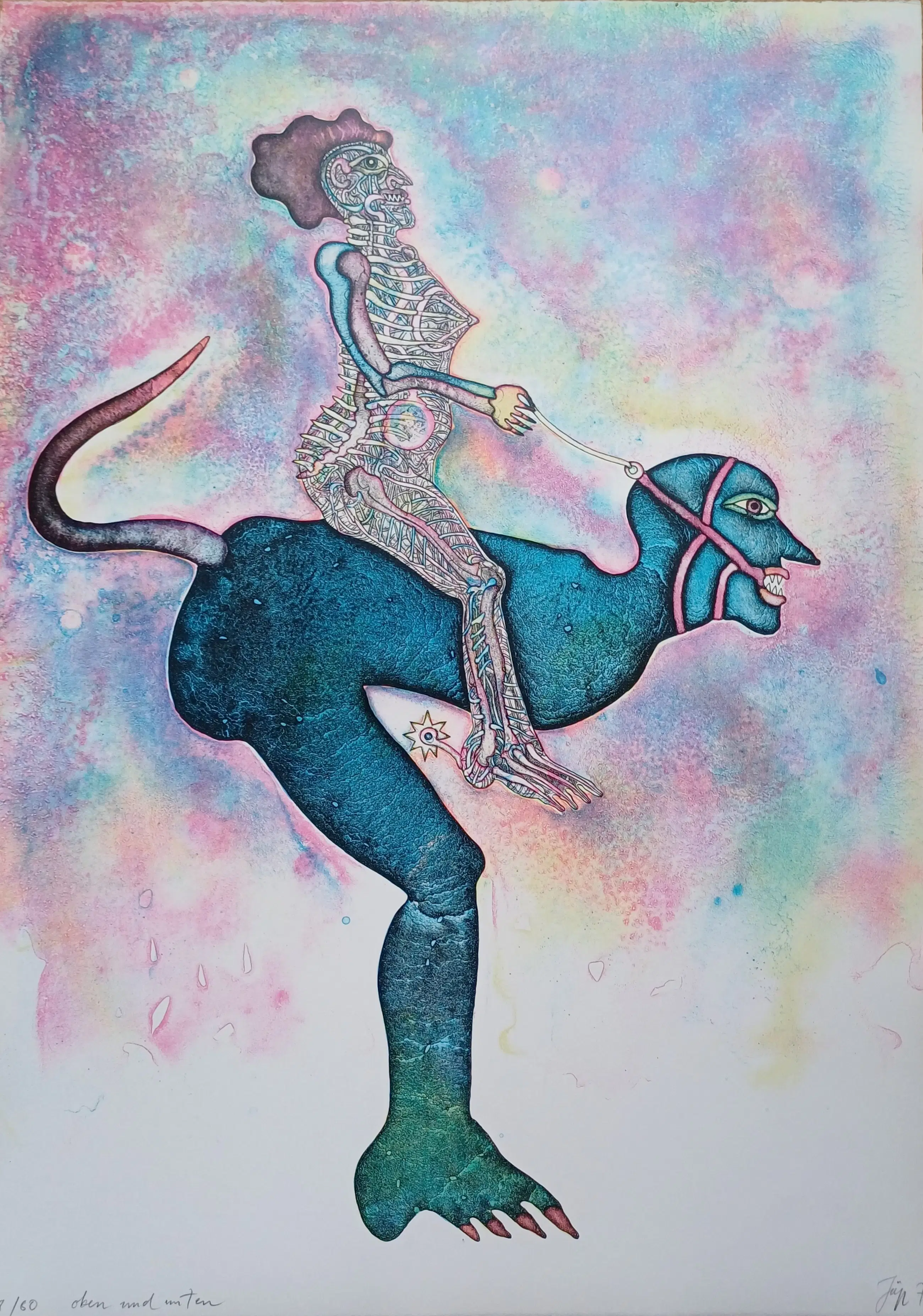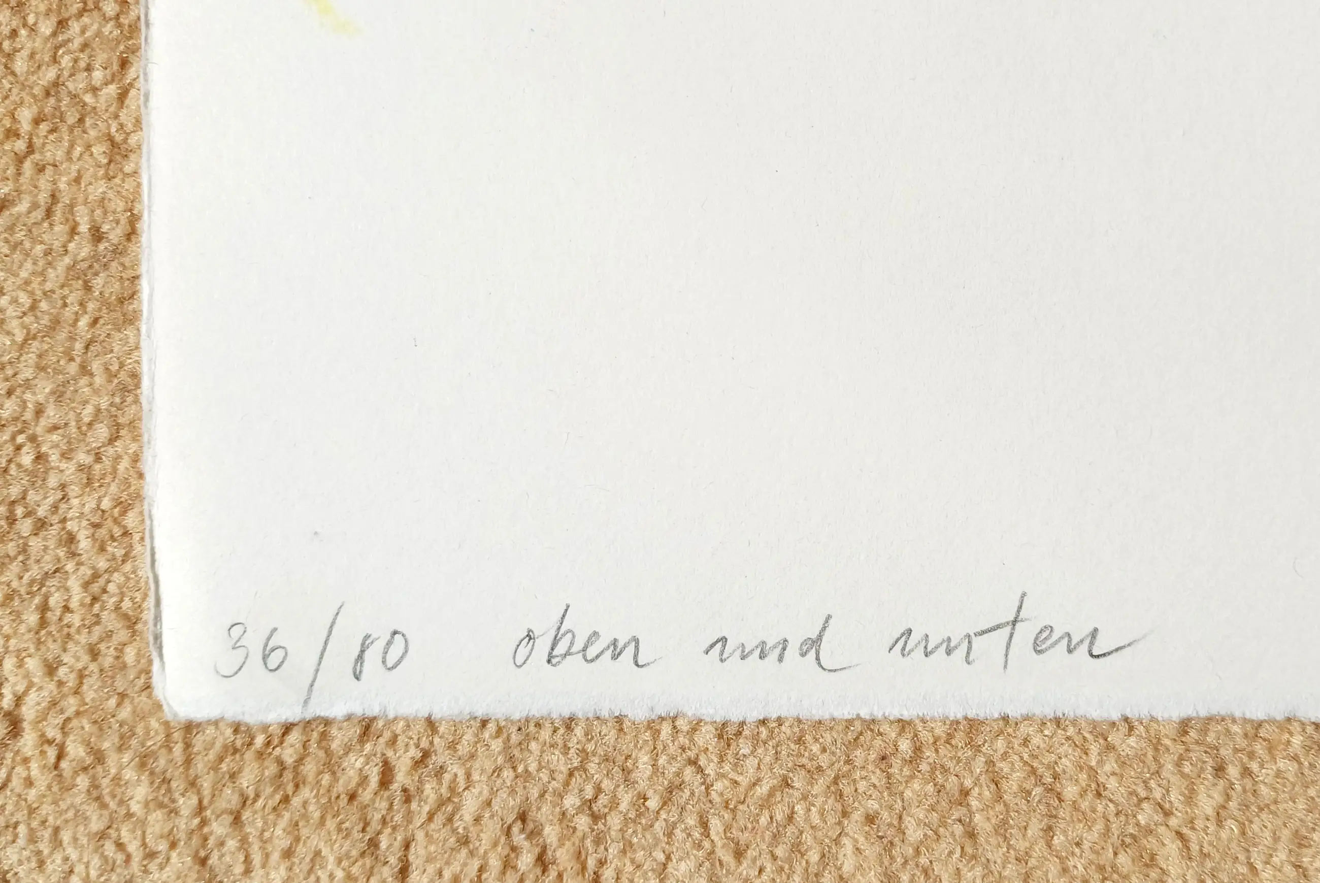'Boven en onder', alweer één van de kleurrijke litho's van Bernard Jaeger, in 1975 uitgegeven door de beroemde Berlijnse galerij Art Brusberg. Het werk werd in potlood door de kunstenaar gesigneerd, genummerd (36/80) en betiteld ('Oben und Unten'). Het blad is 65 cm hoog en 50 cm breed, in perfecte staat, nooit ingelijst geweest, steeds liggend in de lade bewaard.