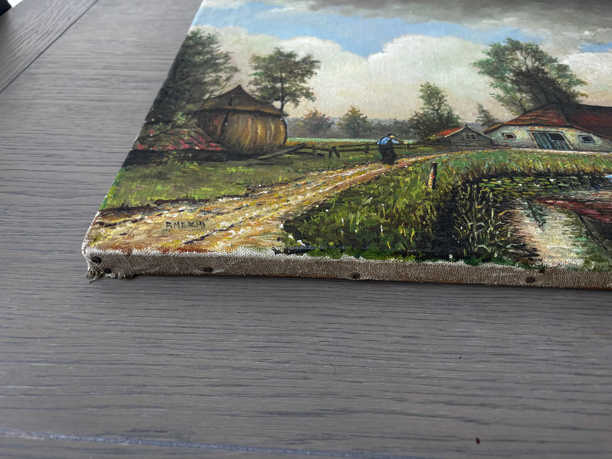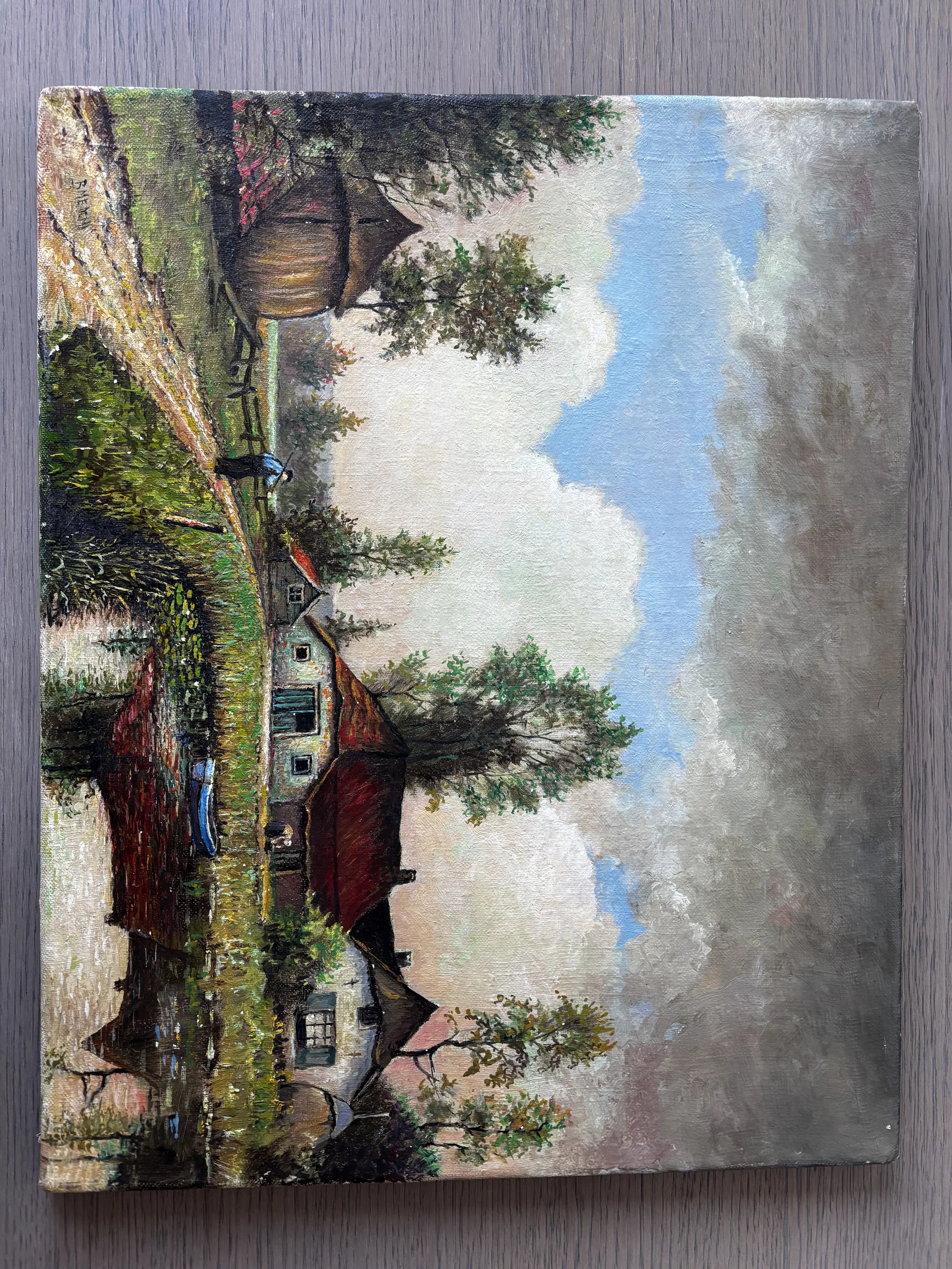 Het schilderij toont een huisje met een rood dak, een klein blauw bootje op het water en een persoon die over een pad loopt. De scène vertoont stilistische overeenkomsten met traditionele Nederlandse landschapsschilderijen uit de 17e eeuw, die vaak gekenmerkt worden door uitgestrekte luchten en landelijke taferelen.