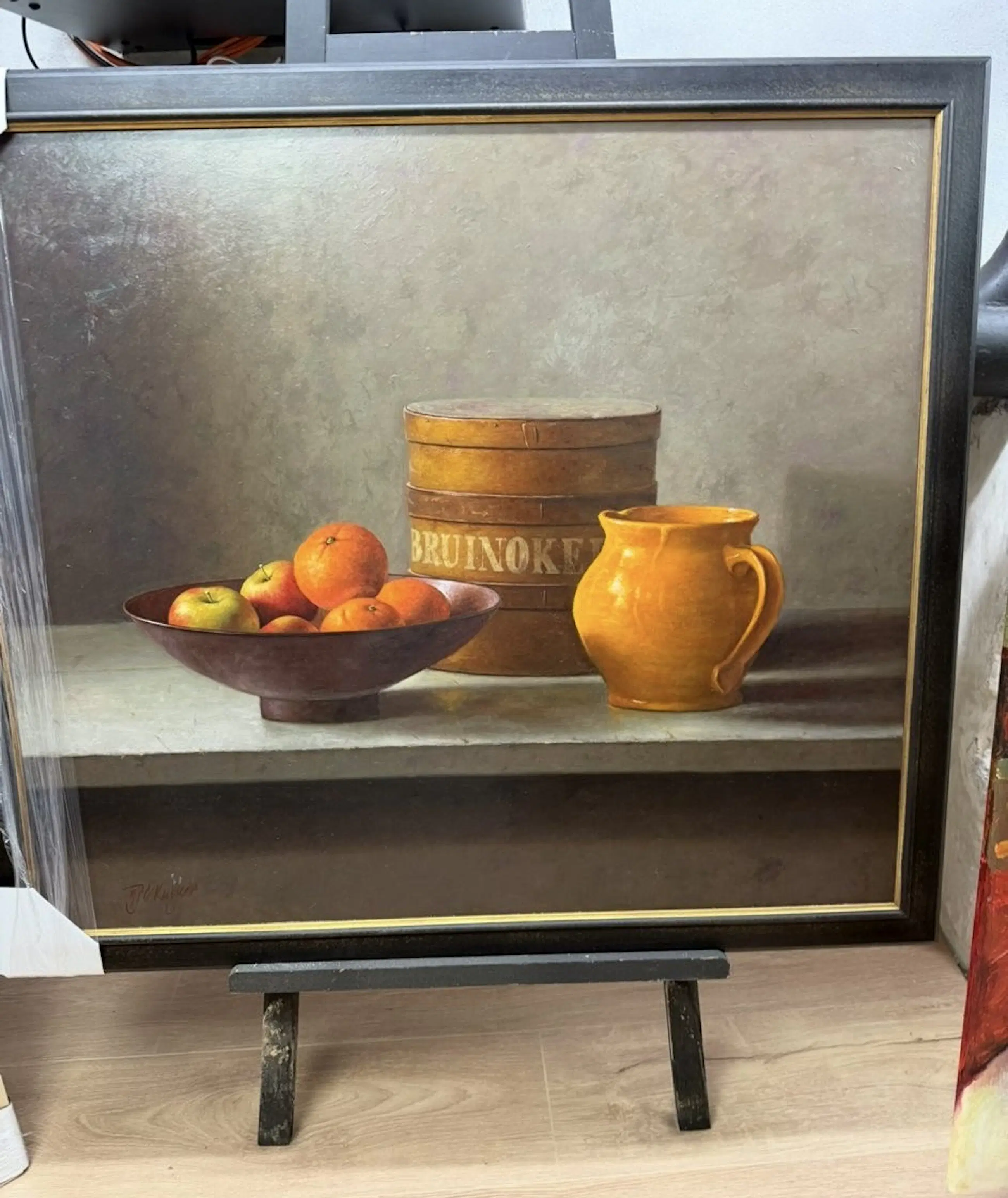 Prachtig verfijnd stilleven met fruit van de kunstschilder Berry Kuiper (1958 te Hoorn), geschilderd met een fotografische precisie. Zijn beheersing van lichtinval en stofuitdrukking maakt dit schilderij bijzonder levendig en tastbaar.