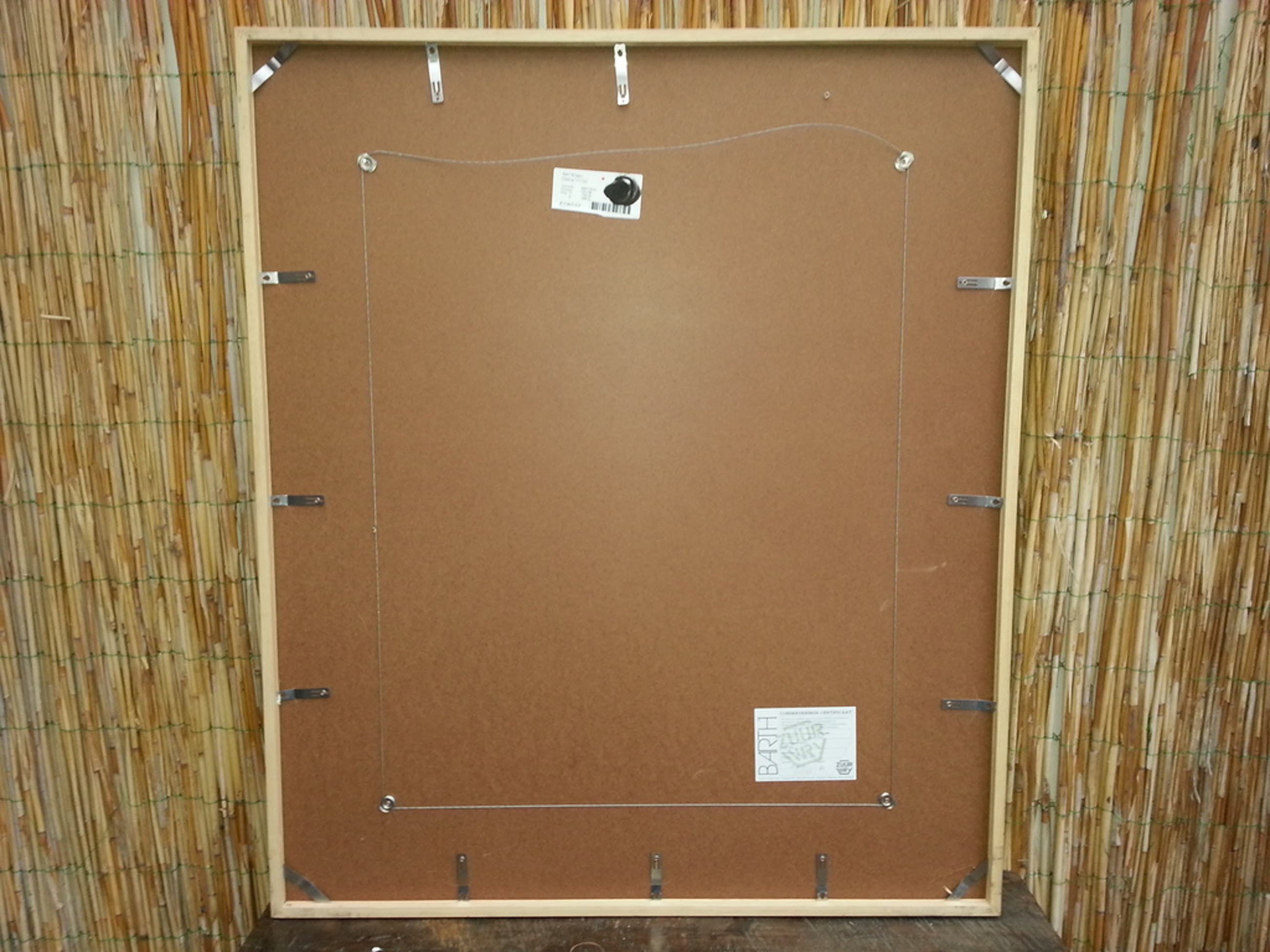 Lijst, ontspiegeld glas en ophangwerk. Kan zo aan de muur.