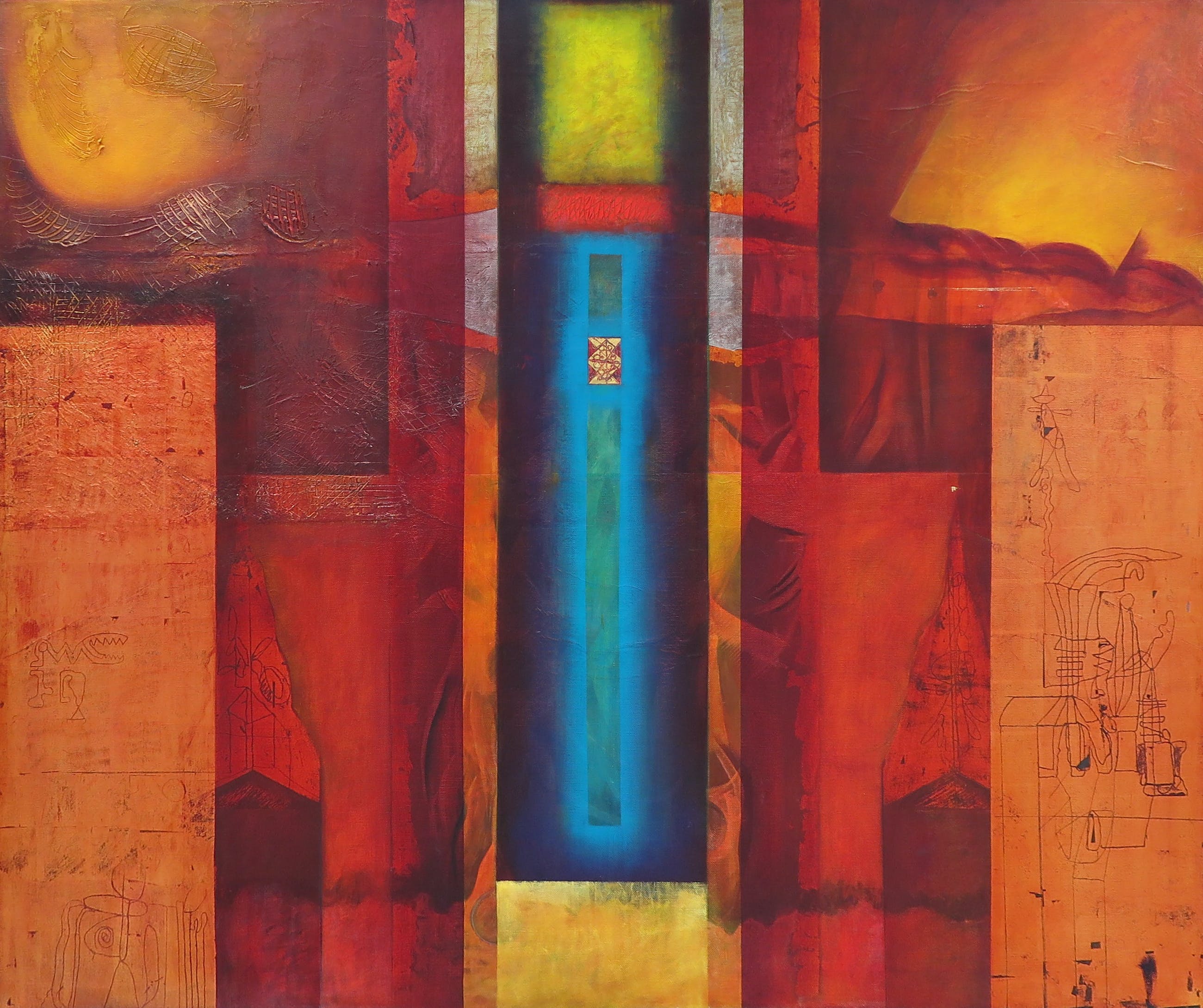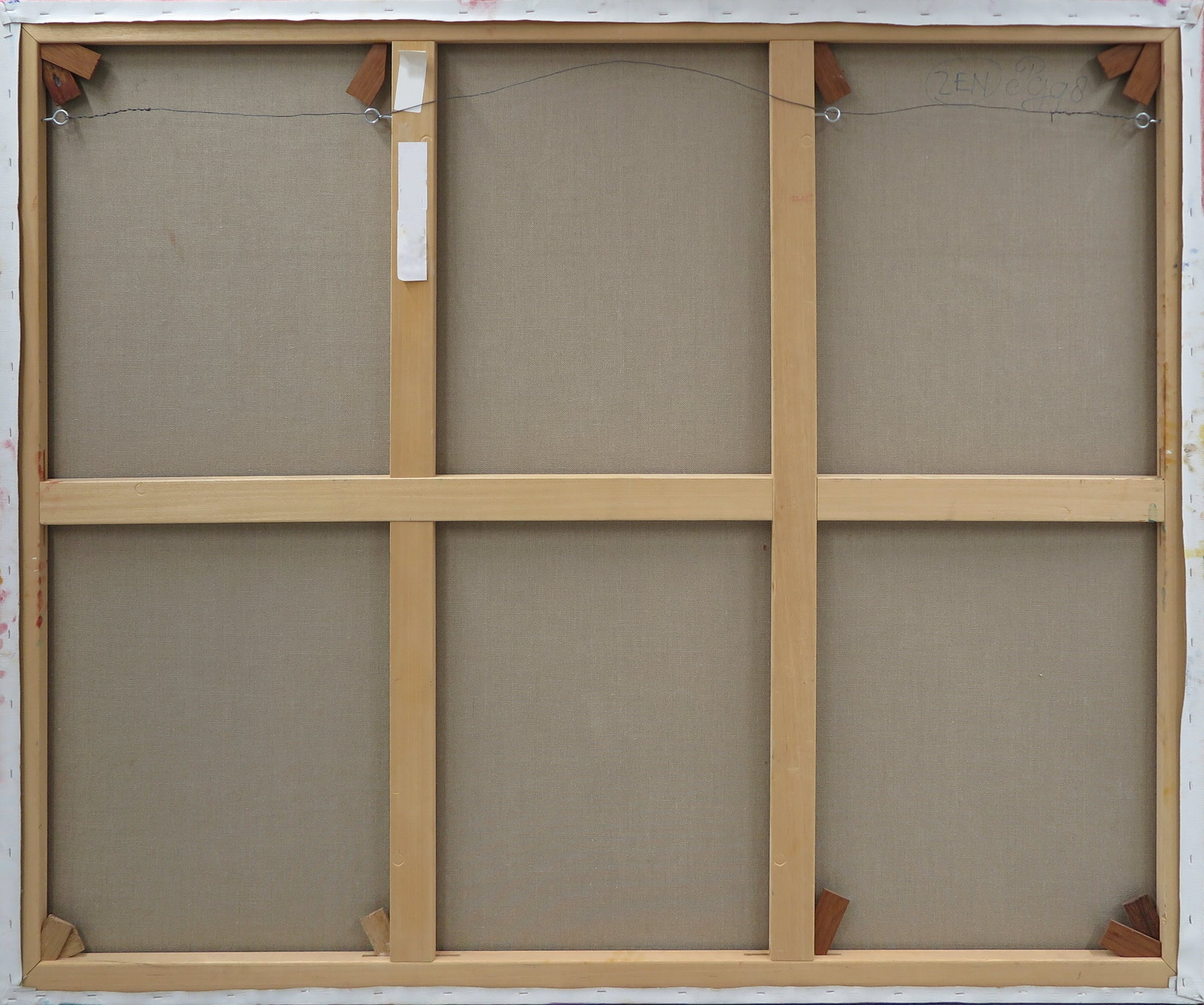 Monumentaal schilderij van Bert Grotjohann. Grotjohann zocht in zijn schilderijen naar een wisselwerking tussen oppervlak en lijn in al zijn facetten. Grotjohann werkte ook als graficus, iets wat ook in dit werk tot uiting komt met de dunne 'geëtste' lijnen die een belangrijk onderdeel vormen van de voorstelling.