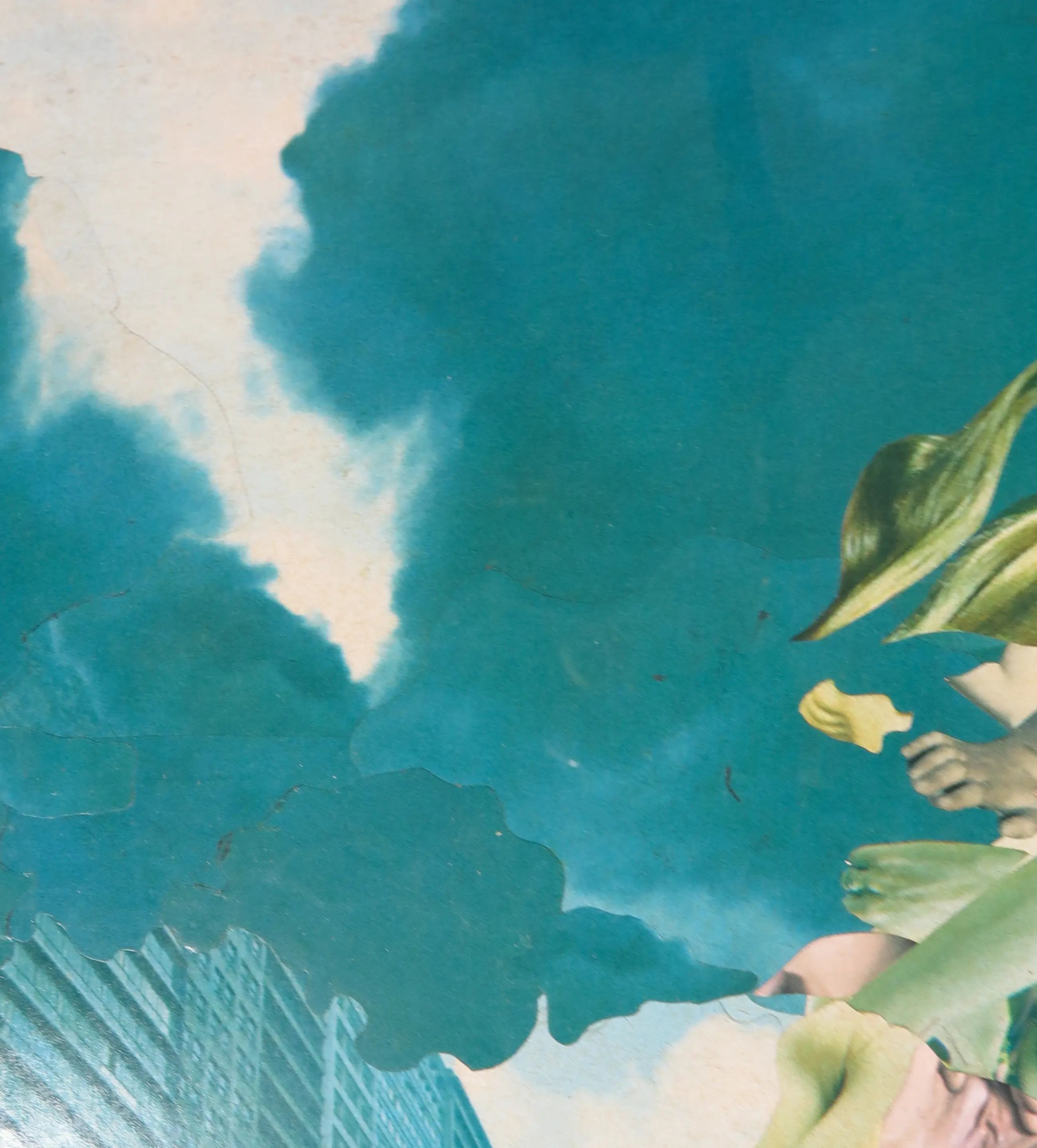 De foto's zijn wat licht verschoten, maar de compositie is in goede staat. Enkel wat viezigheid in de wolkenpartij te zien. :et op: Het werk dient opnieuw ingelijst te worden. | |