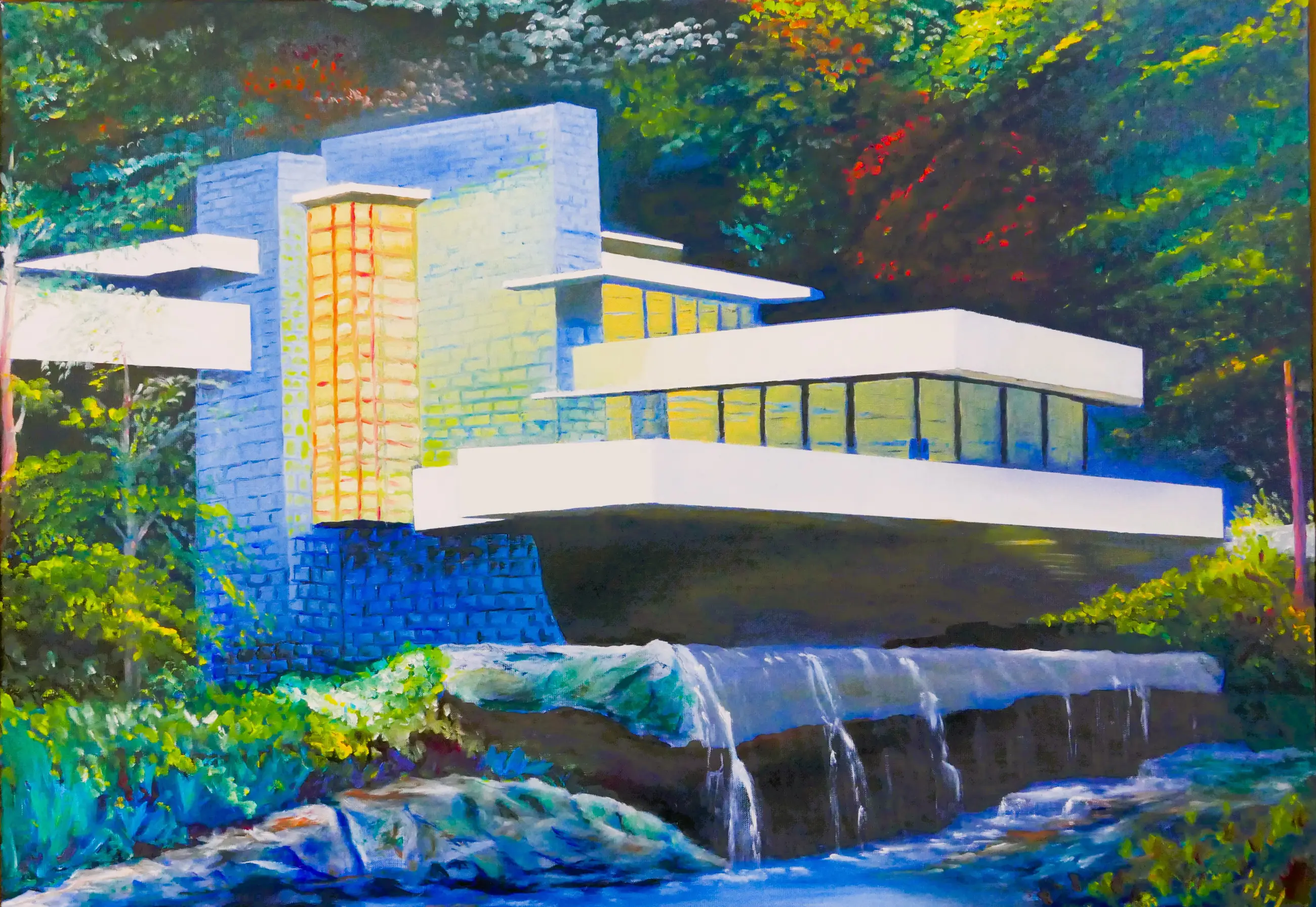 Dit olieverfschilderij is een interpretatie van de beroemde villa van de Amerikaanse architect Frank Lloyd Wright. Het huis uit 1935 staat in de Laurel Highlands in het zuidwesten van de staat Pennsylvania. Het is gedeeltelijk gebouwd boven een waterval. Het huis is ontworpen als weekendverblijf voor Liliane en Edgar J. Kaufmann, de eigenaar van het warenhuis Kaufmann in Pittsburgh. Na de voltooiing noemde Time Fallingwater Wright's ‘mooiste werk’ en het is opgenomen in Smithsonian's ‘Life List of 28 Places to See Before You Die’. Het huis werd op 11 mei 1976 aangewezen als nationaal historisch monument. In 1991 noemden leden van het American Institute of Architects Fallingwater het ‘beste werk aller tijden van de Amerikaanse architectuur’. Het huis en zeven andere Wright-constructies werden in 2019 ingeschreven als Werelderfgoed.