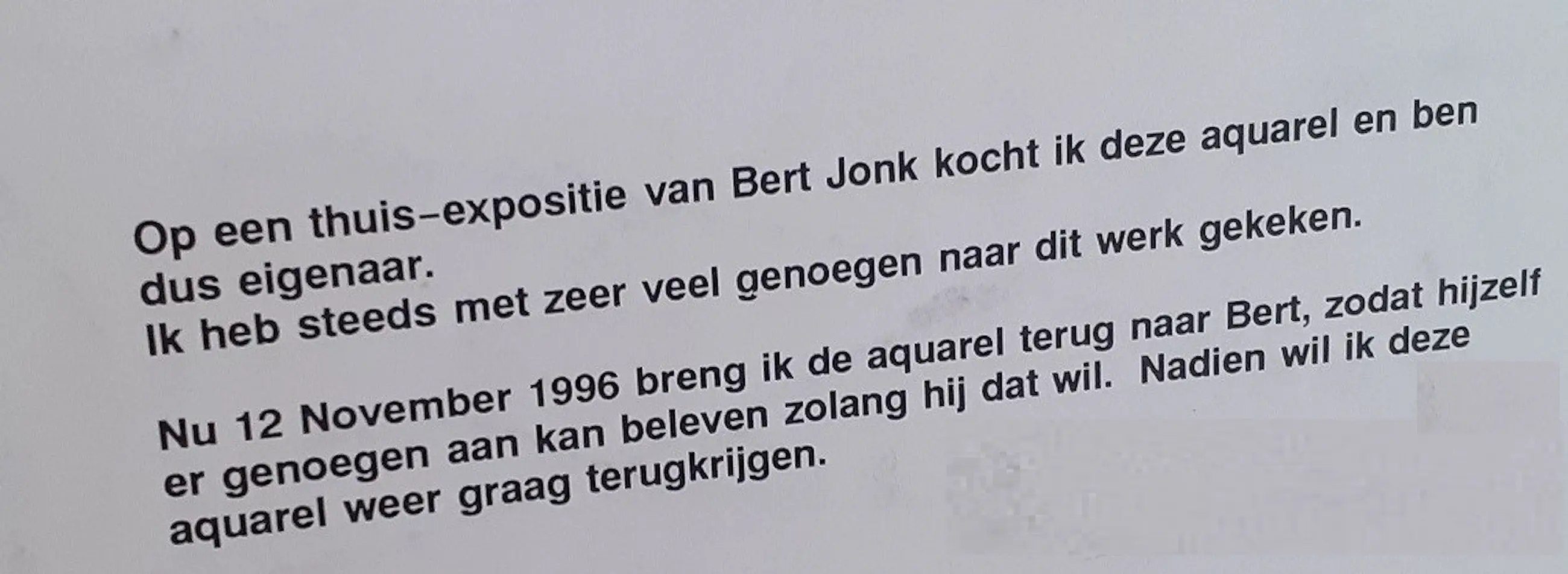 Dit unieke werk van Bert Jonk is afkomstig uit een thuis-expositie van Bert Jonk. Bert Jonk was naast kunstenaar ook creatief therapeut op psychiatrische kliniek De Oosthoek in Limmen. De eigenaar was een collega en vriend van Bert, zij gaf hem dit aquarel op 12 november 1996 weer bij hem terug om Bert daar de laatste jaren van zijn leven van te laten genieten.