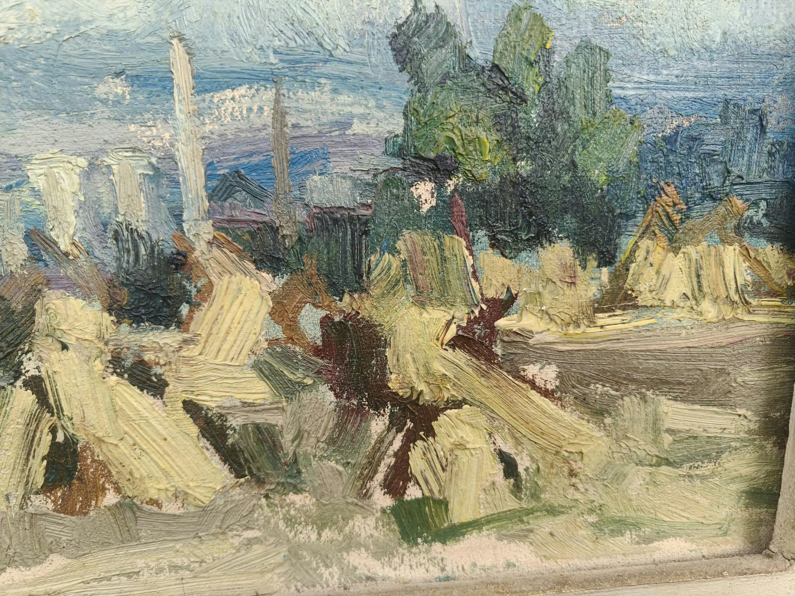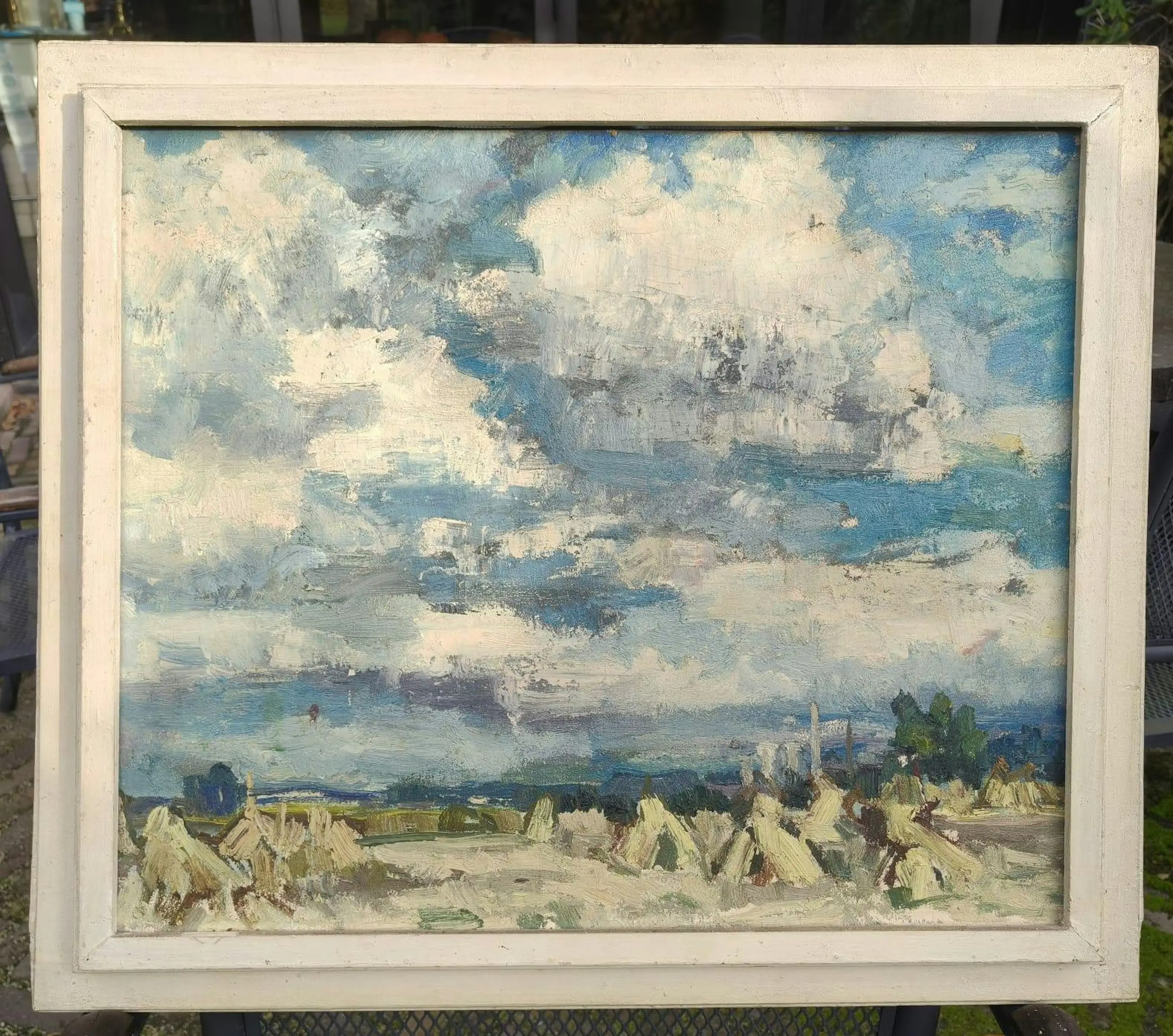 Origineel werk van Bert Jonkers. Landschap met wolkenlucht. Door Bert Jonkers aan mijn familie gegeven