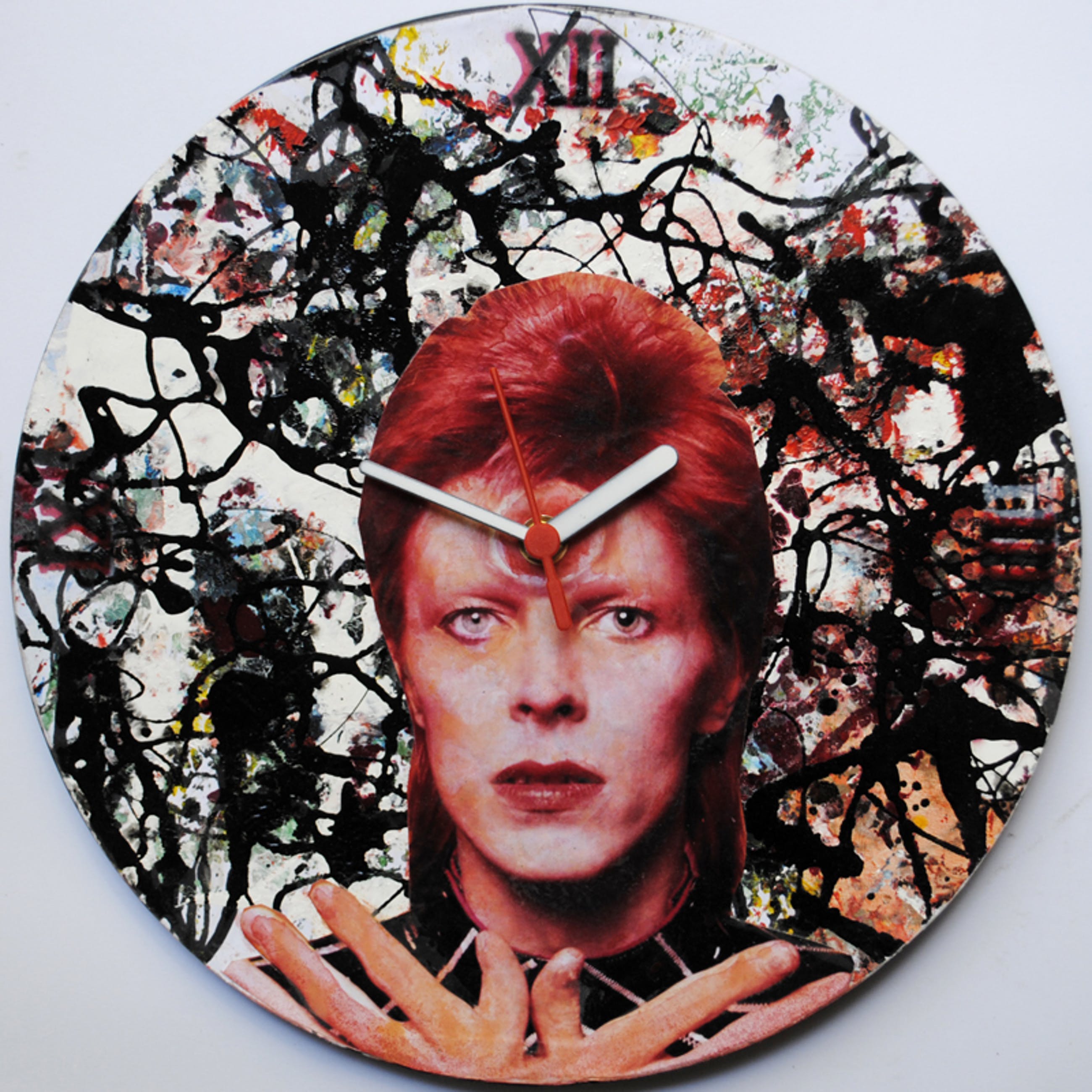 Bowie ArtClock 7, is een voorbeeld van een nieuw kunst project van de Haarlemse kunstschilder Bert Maurits. Van oude vinyl Lp's, maakt hij handgemaakte ArtClocks. In dit geval heeft hij 1 van zijn favoriete popsterren David Bowie, tijdens zijn Ziggy Stardust periode, vastgelegd. Maurits maakt, net als in zijn gewone kunstwerken gebruik van diverse technieken. Hij voegt een bewerkte foto toe aan een beschilderde LP, waar hij een werkende klok aan toevoegt. Het is dus POP art avant la lettre met een functie en een 'must have' voor iedere Bowie fan. Maurits werkt vaak in serie maar elke ArtClock is handgemaakt en dus uniek. Deze Bowie ArtClock, diameter 30 cm, kan eventueel tegen meerprijs worden verzonden in een passende pizzadoos.