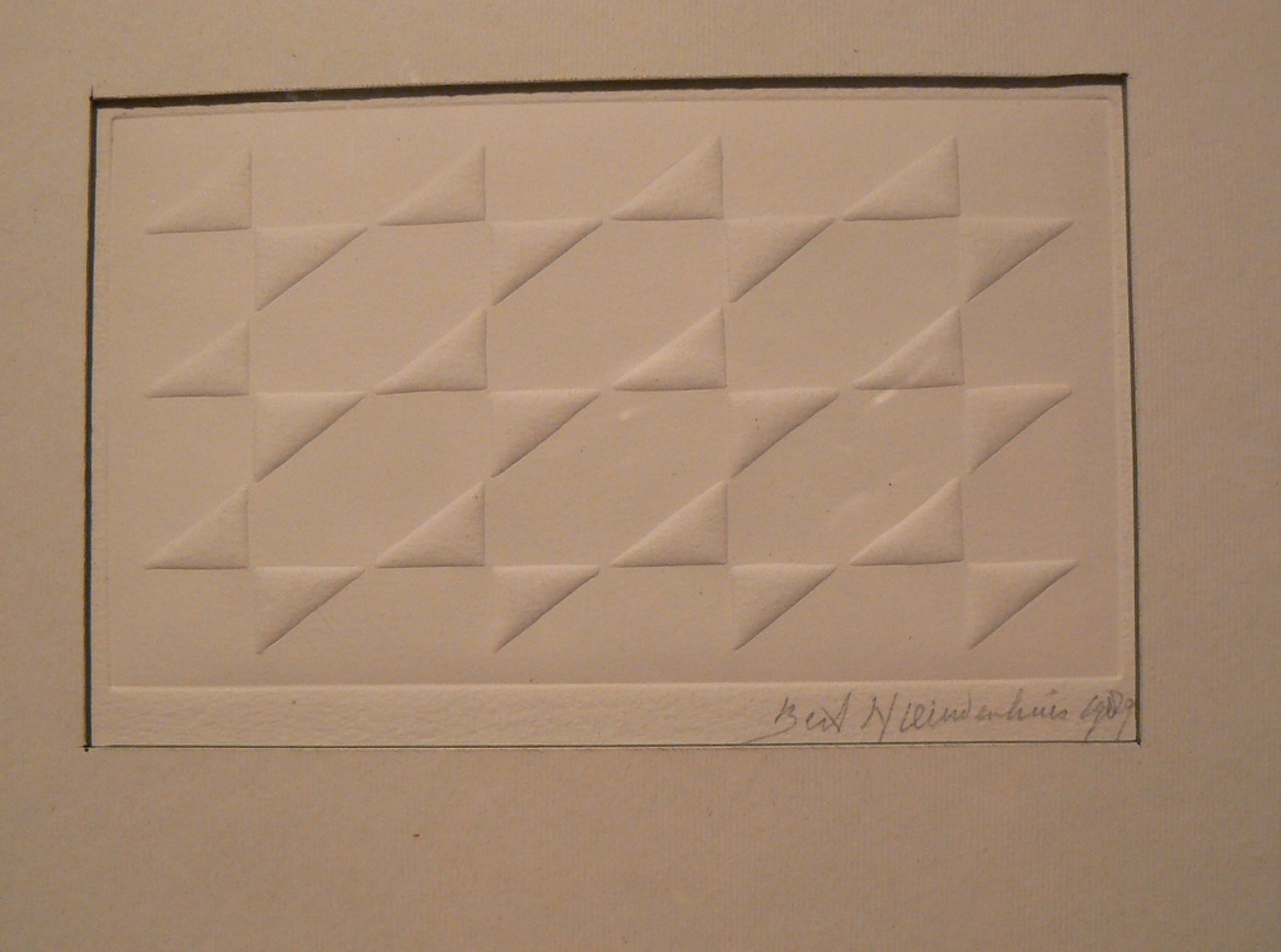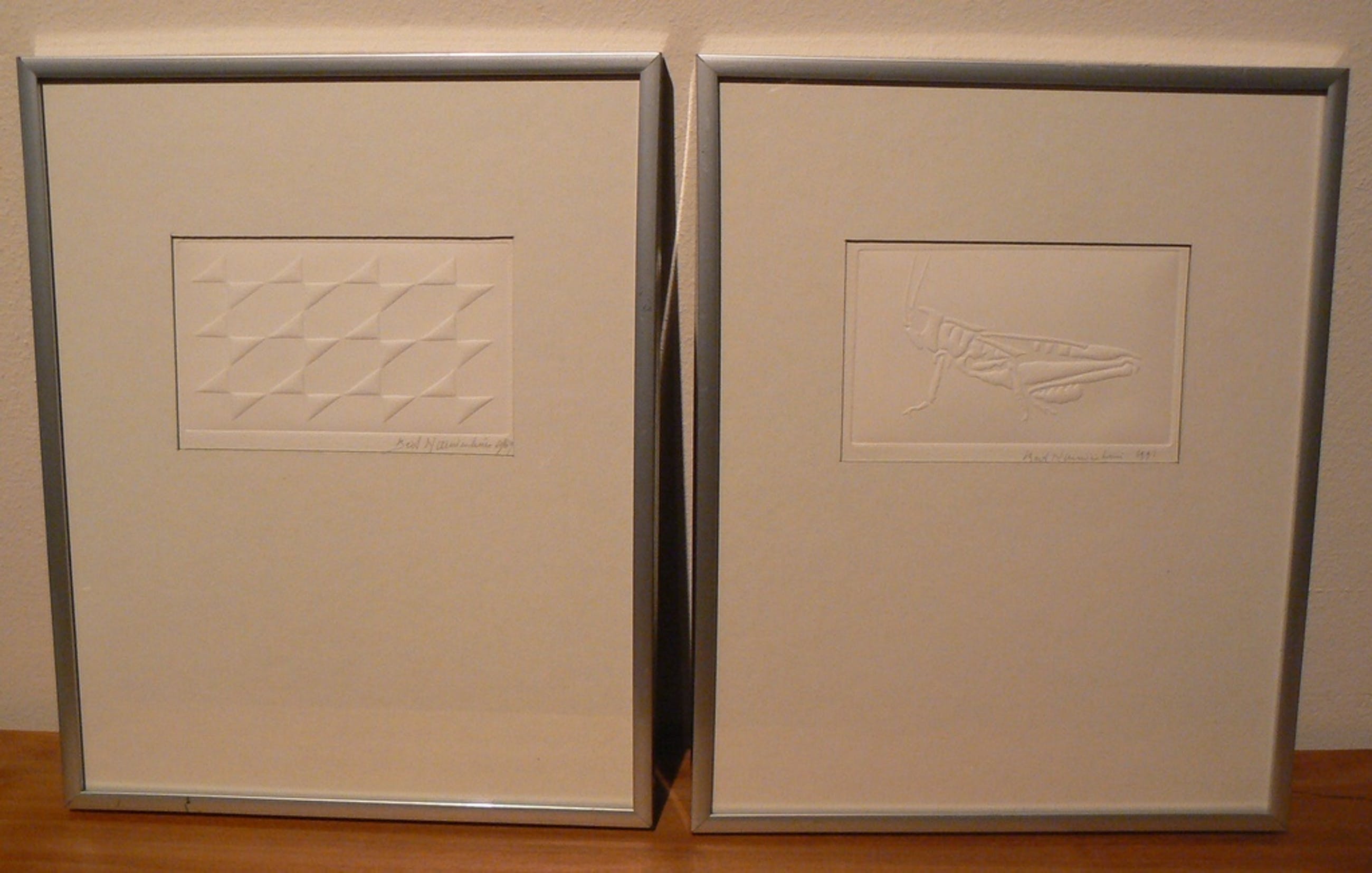 Twee achter glas ingelijste en met potlood gesigneerde blinddrukken van Bert Nieuwenhuis. Omvang afbeeldingen: 12,5 x 7,5 cm. Omvang lijsten (met een paar krasjes): 30,5 x 24,5 cm.