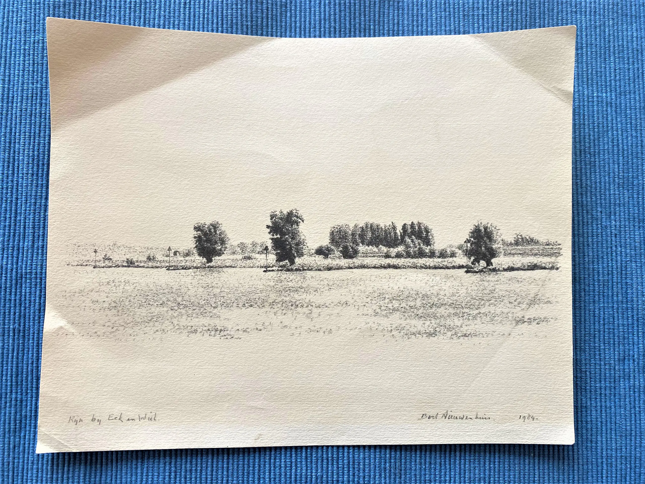 Tekening van Bert Nieuwenhuis 1984 'Rijn bij Eck en Wiel. De Rijn op de voorgrond met uiterwaarden en weilanden op de achtergrond.