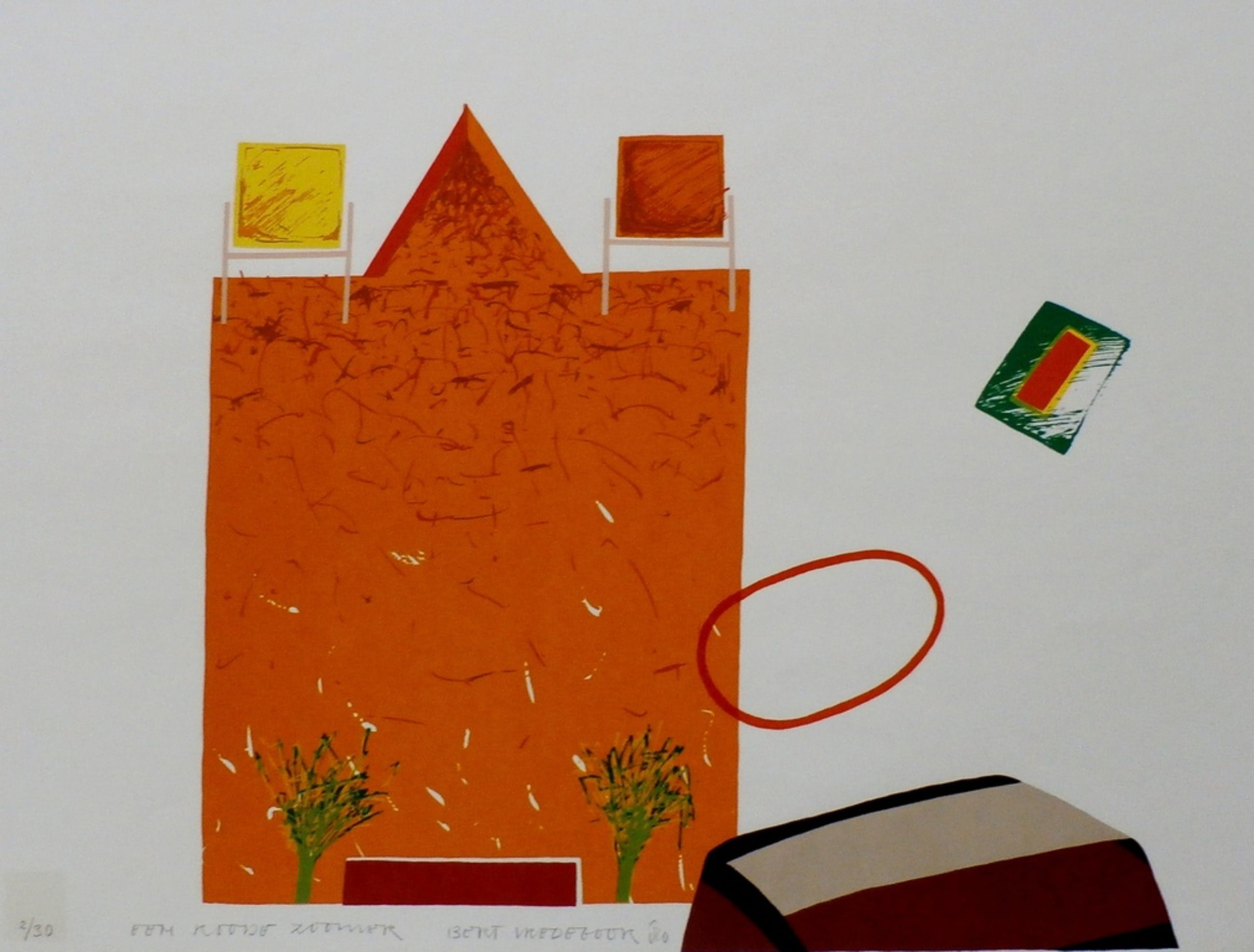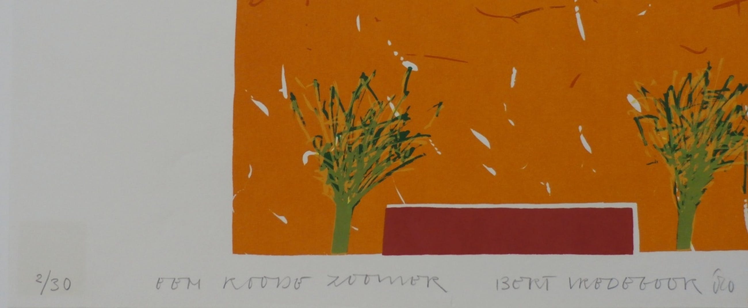 Zeefdruk van Hans Vredegoor uit 1980. Nummer 2/30. Titel: Een roode zoomer. Afmetingen blad H 60 x b80. Afmetingen voorstelling H50 x b64.5. Het werk is middenonder gesigneerd door de kunstenaar. De authenciteit van het aangeboden werk kan voor 100% worden gegarandeerd. Een certificaat van echtheid kan, op aanvraag worden meegestuurd. Herkomst: Collectie ABN AMRO. Conditie: in goede staat. Linksonder staat het nr in een verkleurd hokje, zie laatste foto