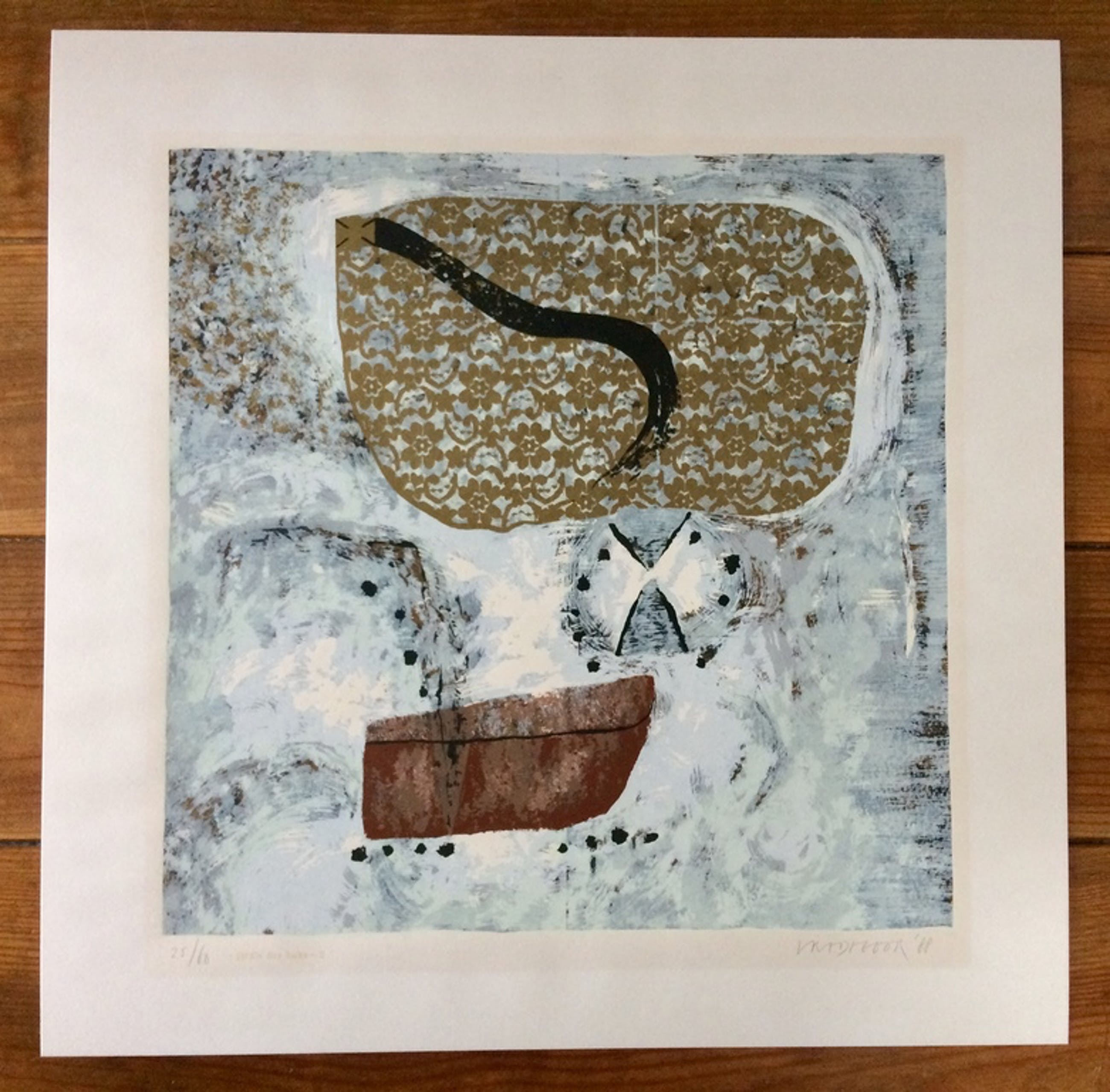 Prachtige meerkleurenzeefdruk met goudtinten in zeer goede staat