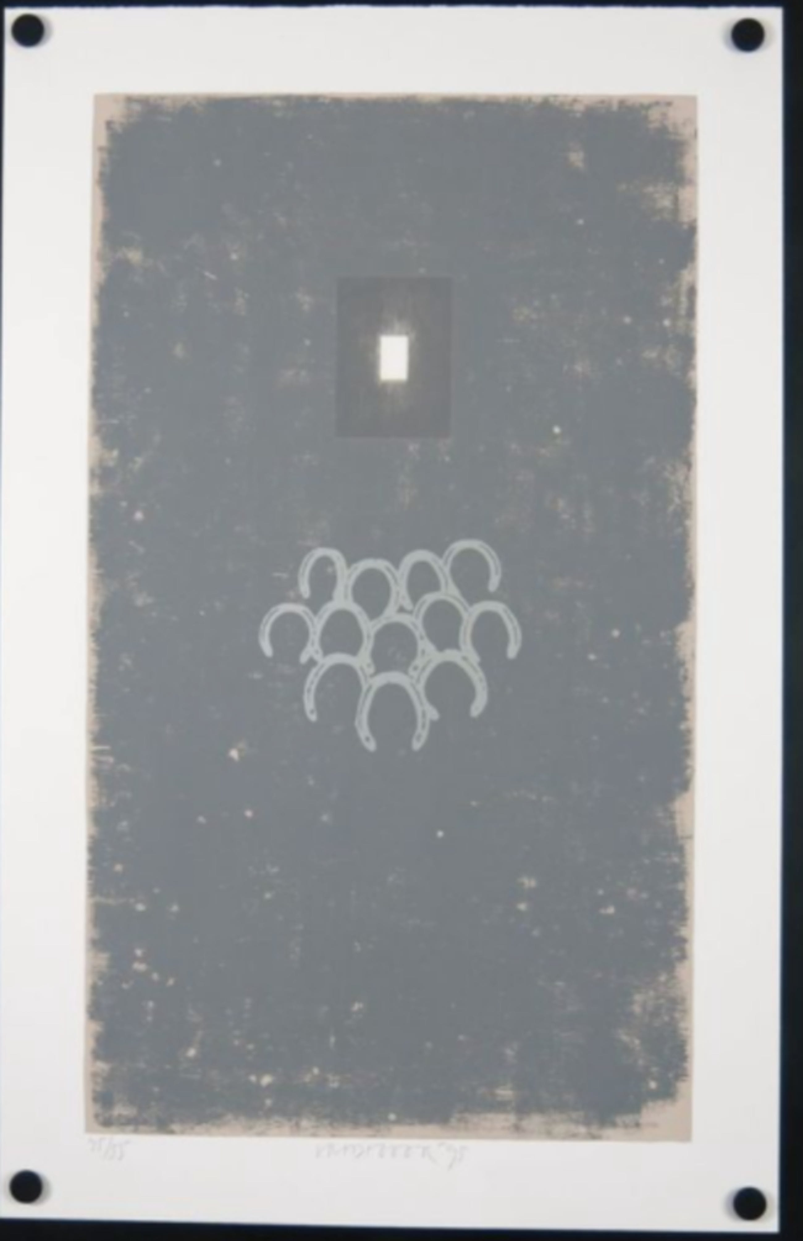 Materiaal: Zeefdruk op geschept papier, bevestigd achter passe-partout